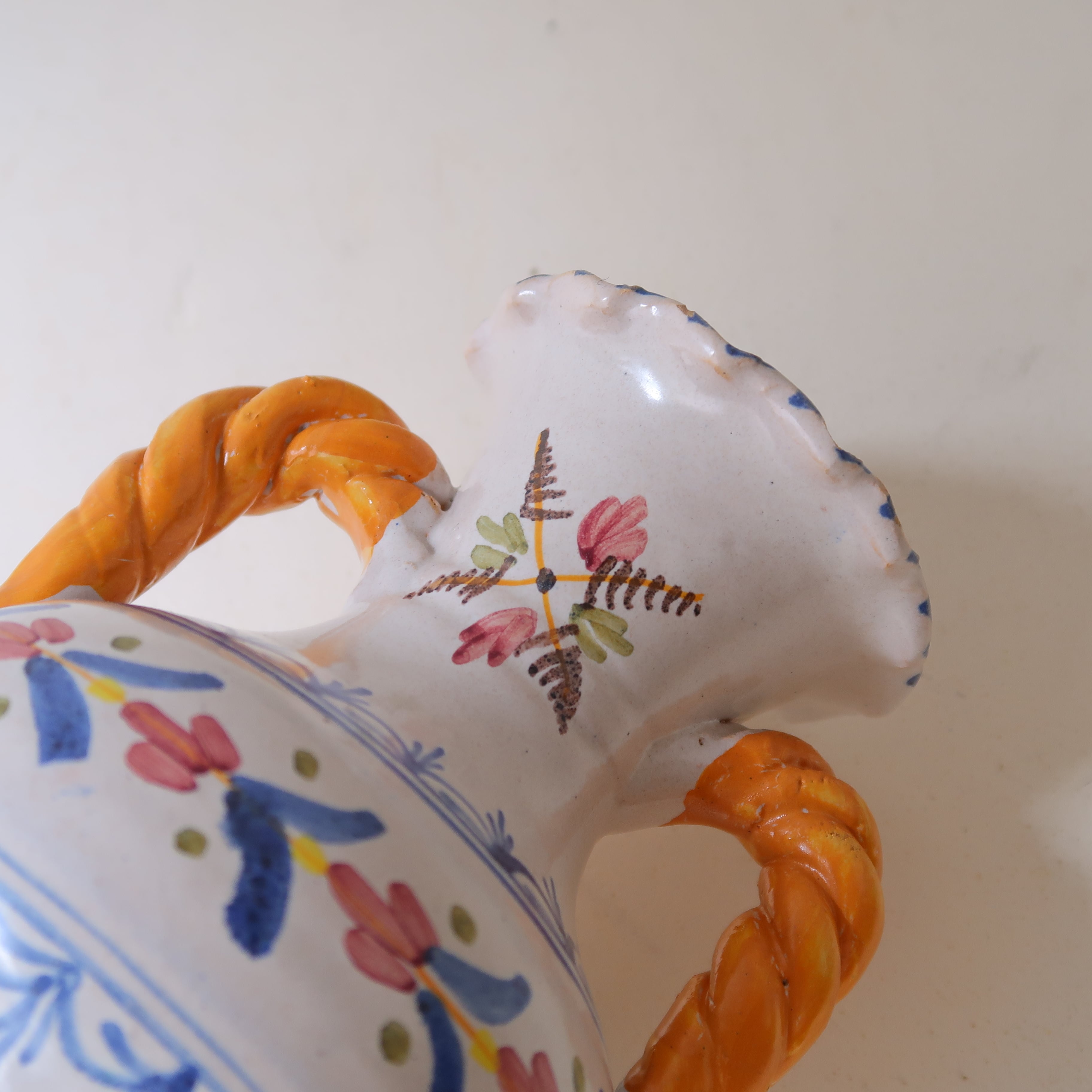 クロワッサンのような、ねじねじとした耳の花瓶。首や胴には、ピンクのお花や青いレースのような模様。ふちはひらひら、テンテンテン...。