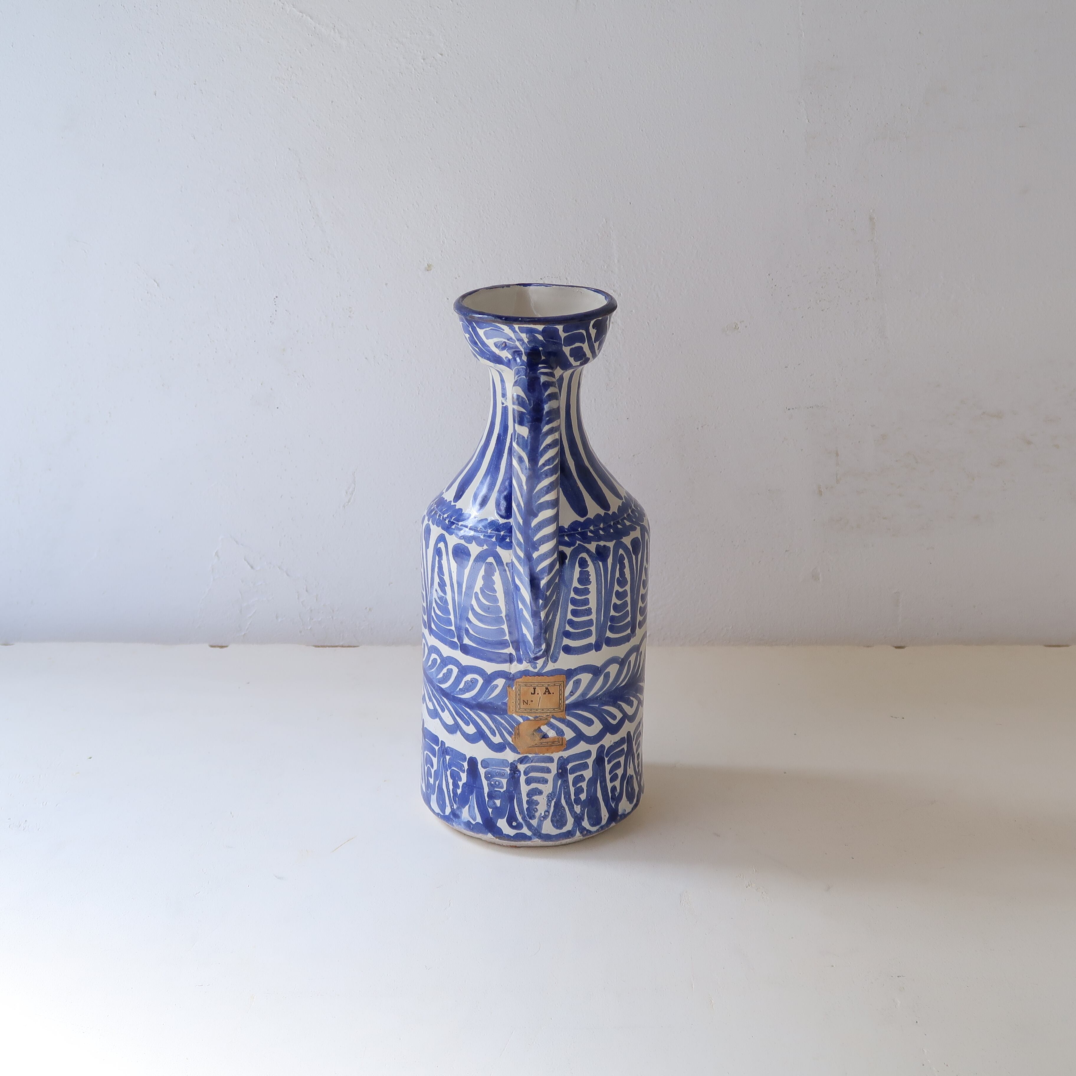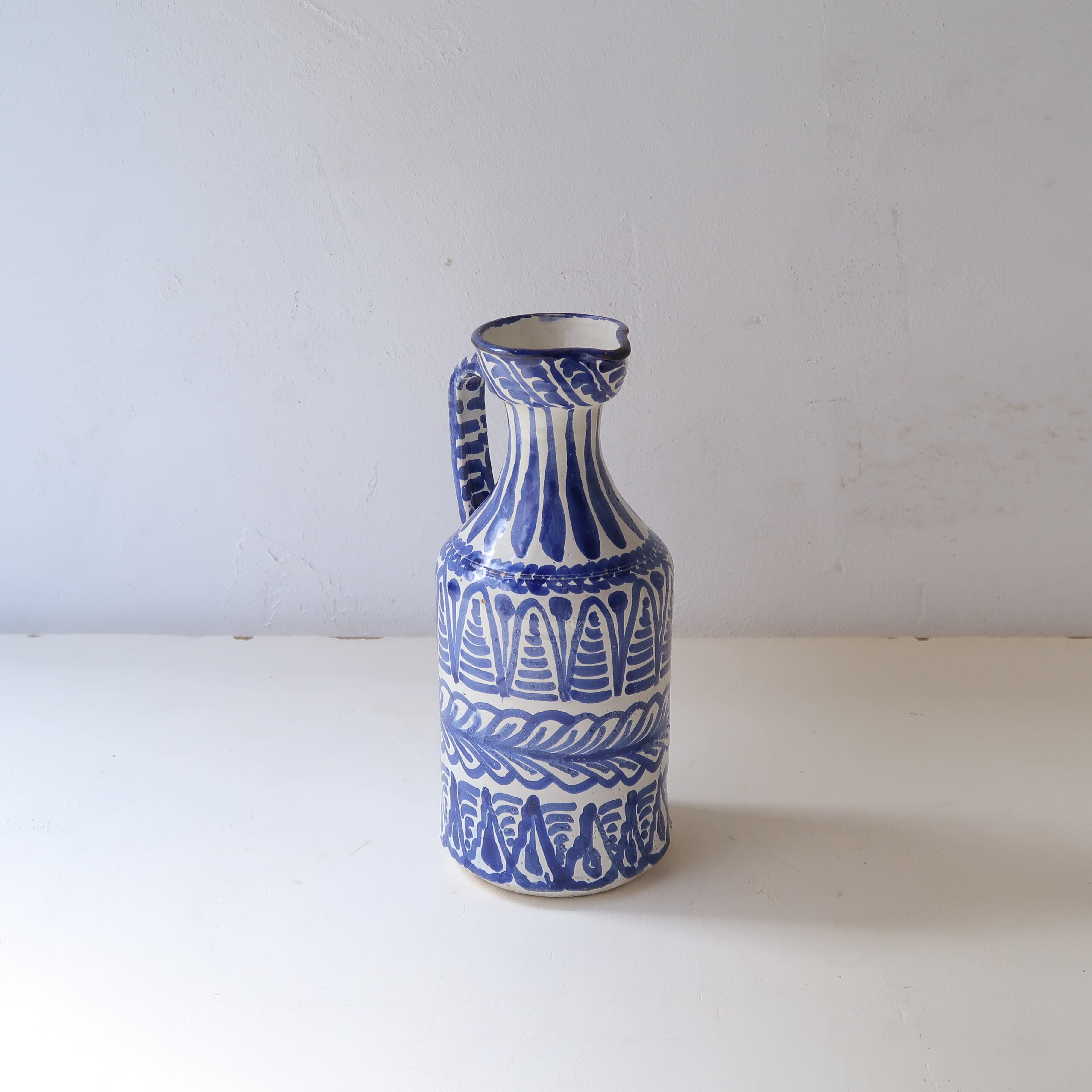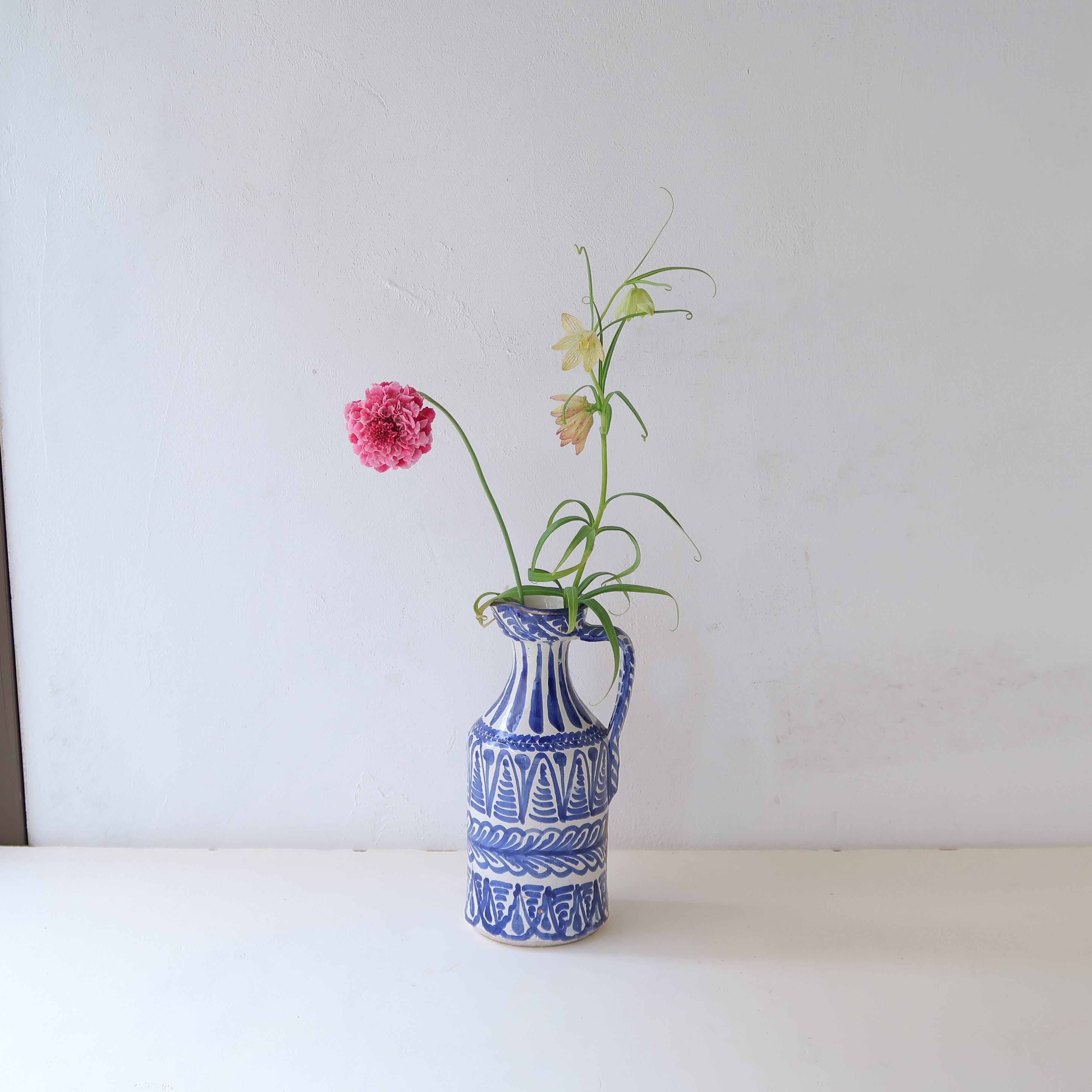 底を見ると、「GRANADA ESPANA」の文字。スペインで作られた陶器の水差しのようです。手作りなのか、表面にはふつふつとした気泡があります。異国情緒を感じつつも、日本の染付のような印象もある花瓶です。