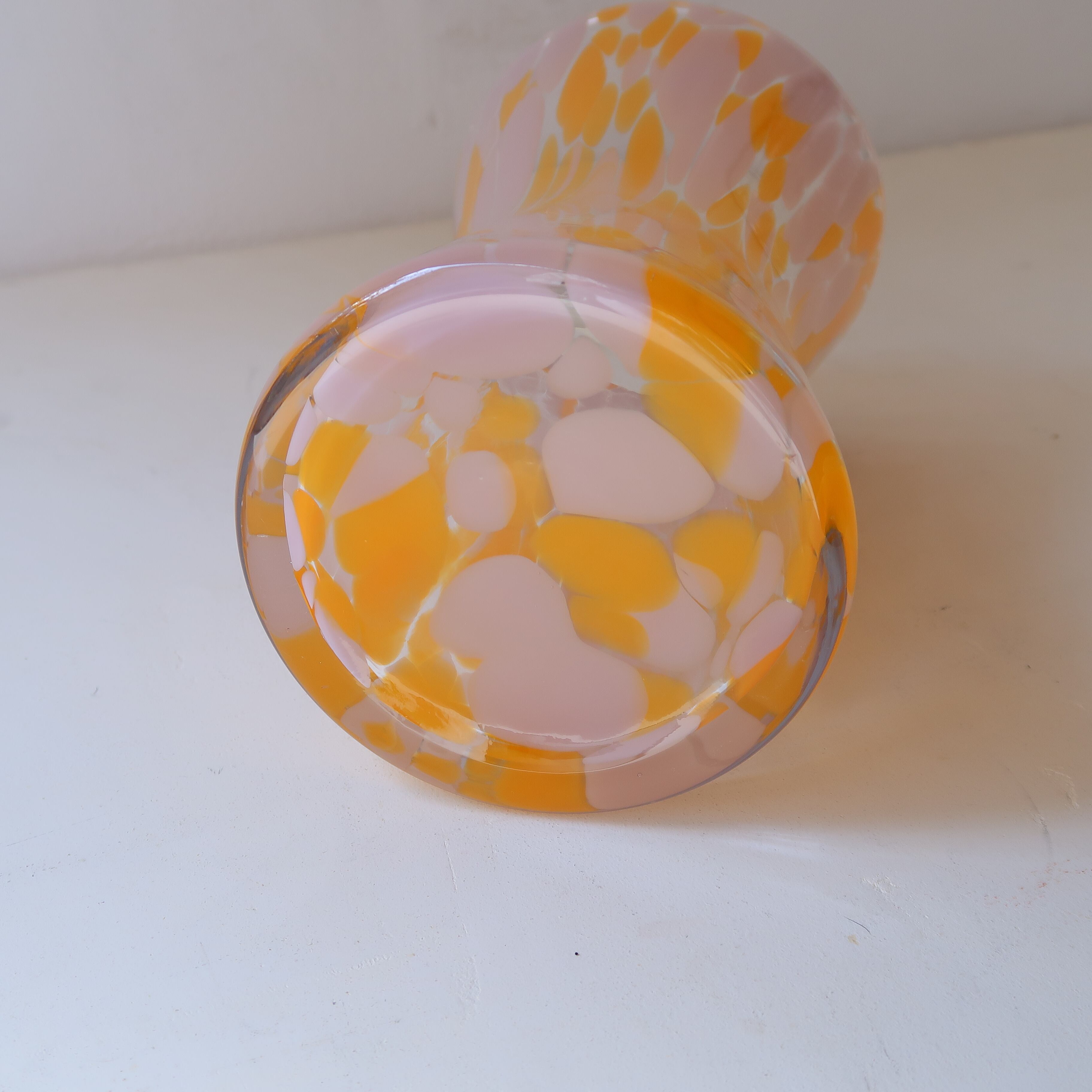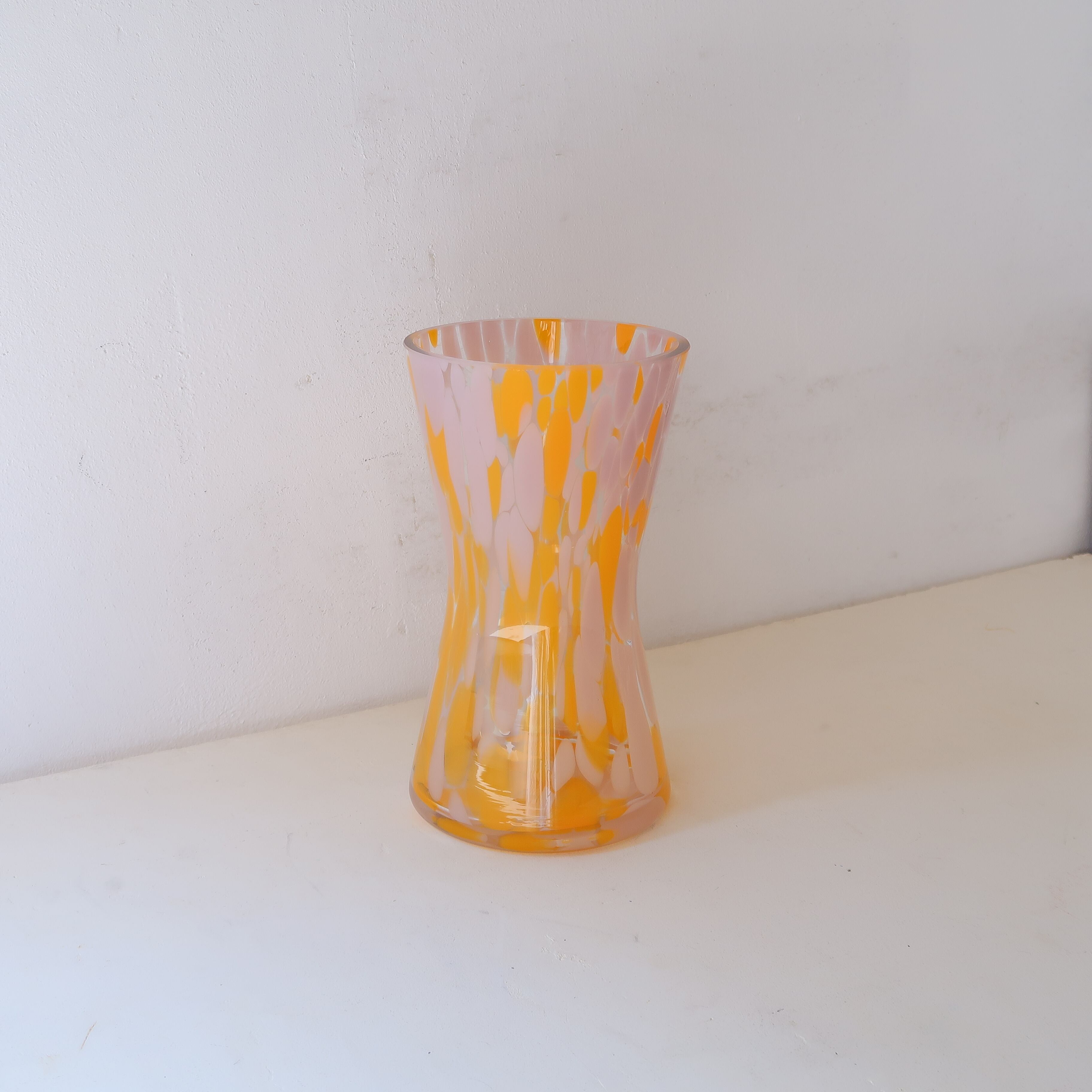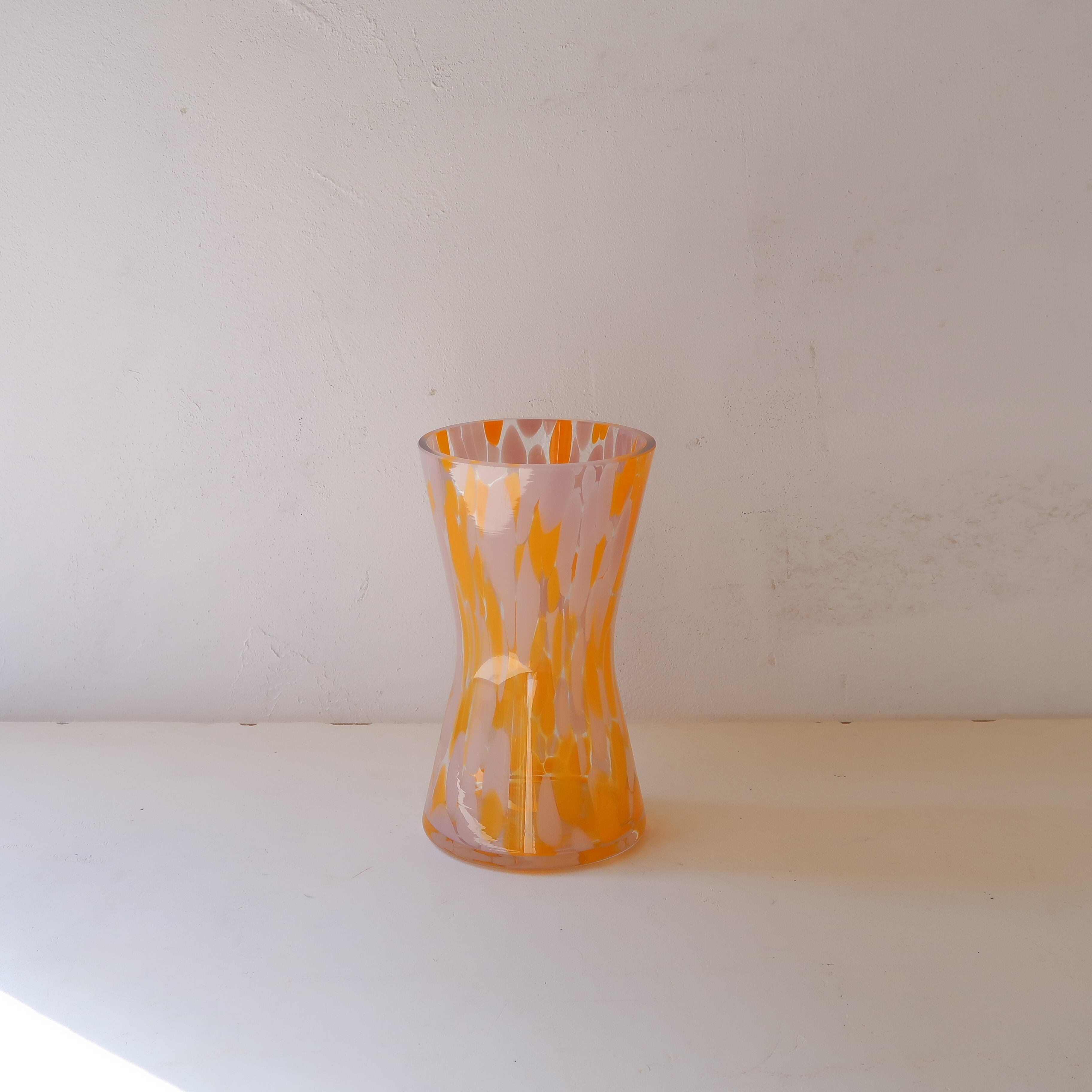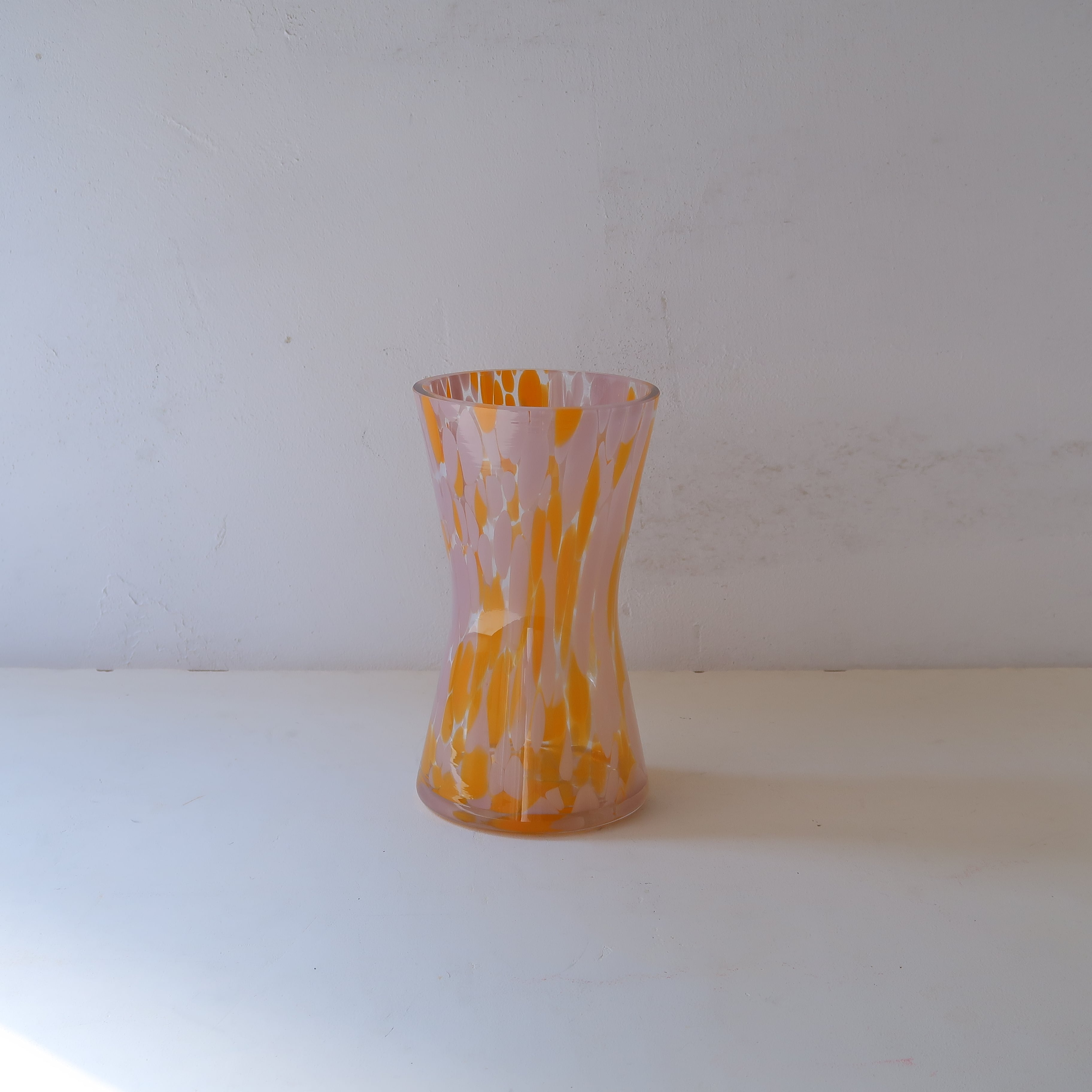 オレンジ、パープルピンク…。ふたつの色が混ざり合った、華やかなマーブルの花瓶。透明感があり、向こう側の絵柄が透けるのも良い。フォルムは太鼓のような安定感で、お花もたっぷりと生けられます。
