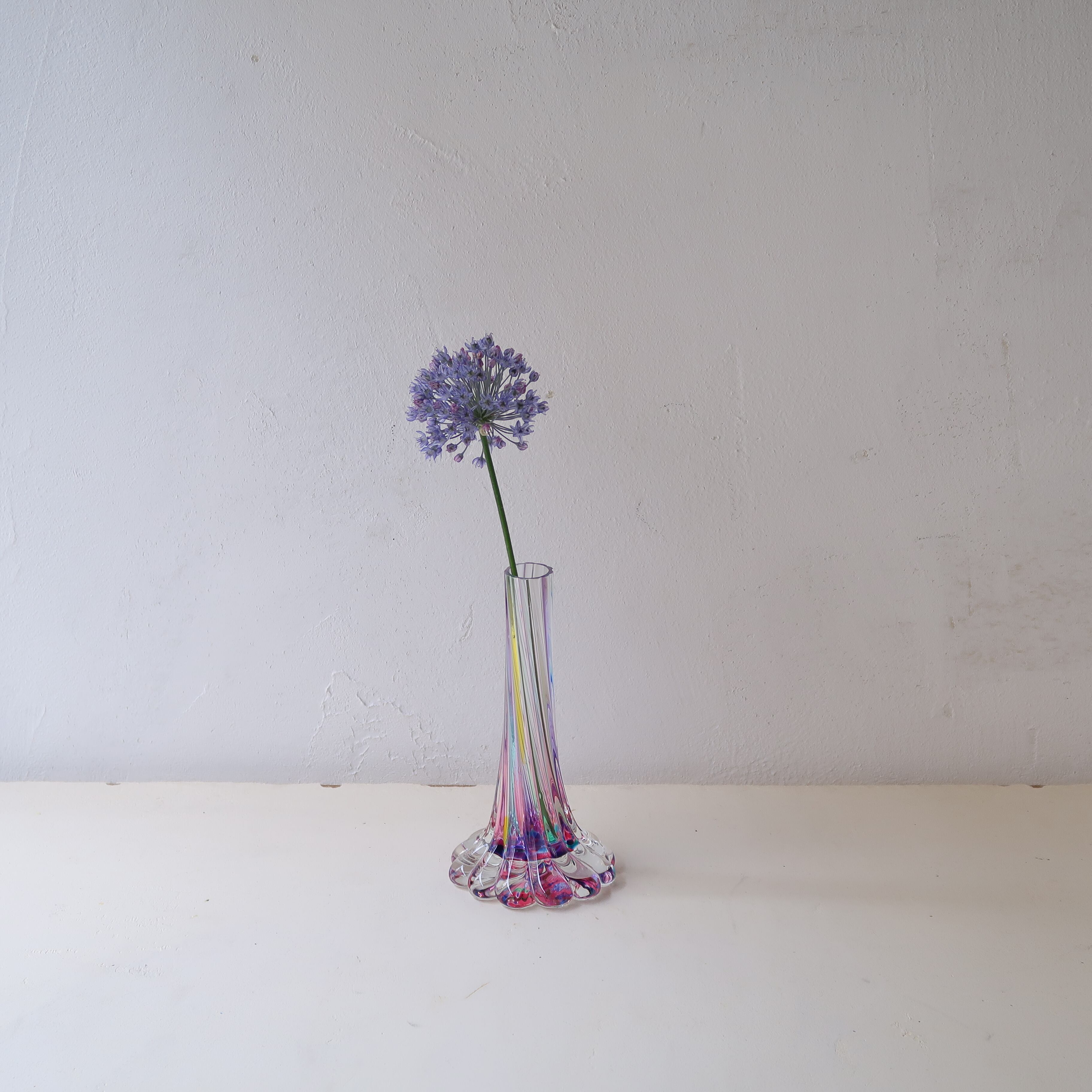 パープルをベースに、イエローやブルー、グリーン...。ビー玉のようにカラフルなガラスの花瓶です。
