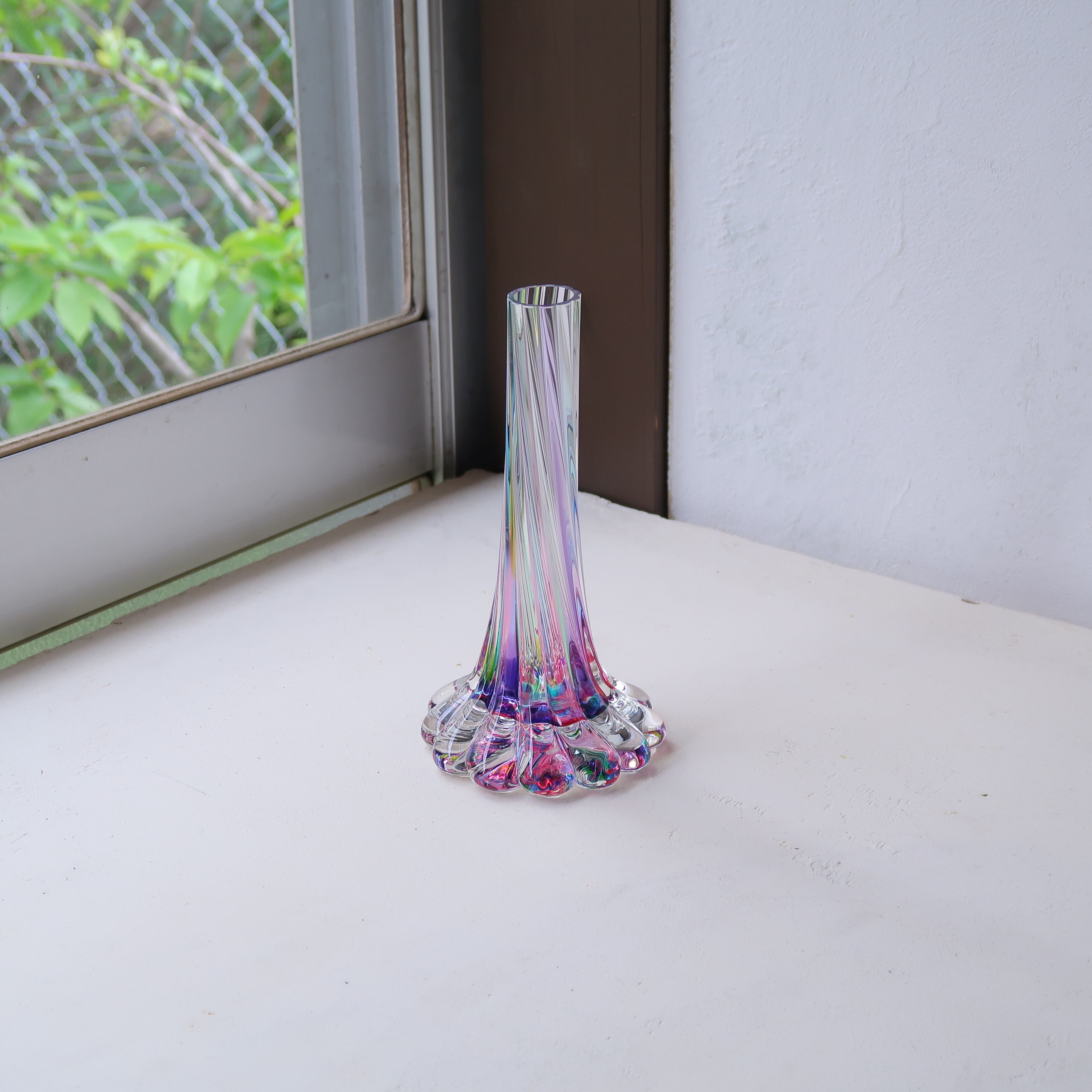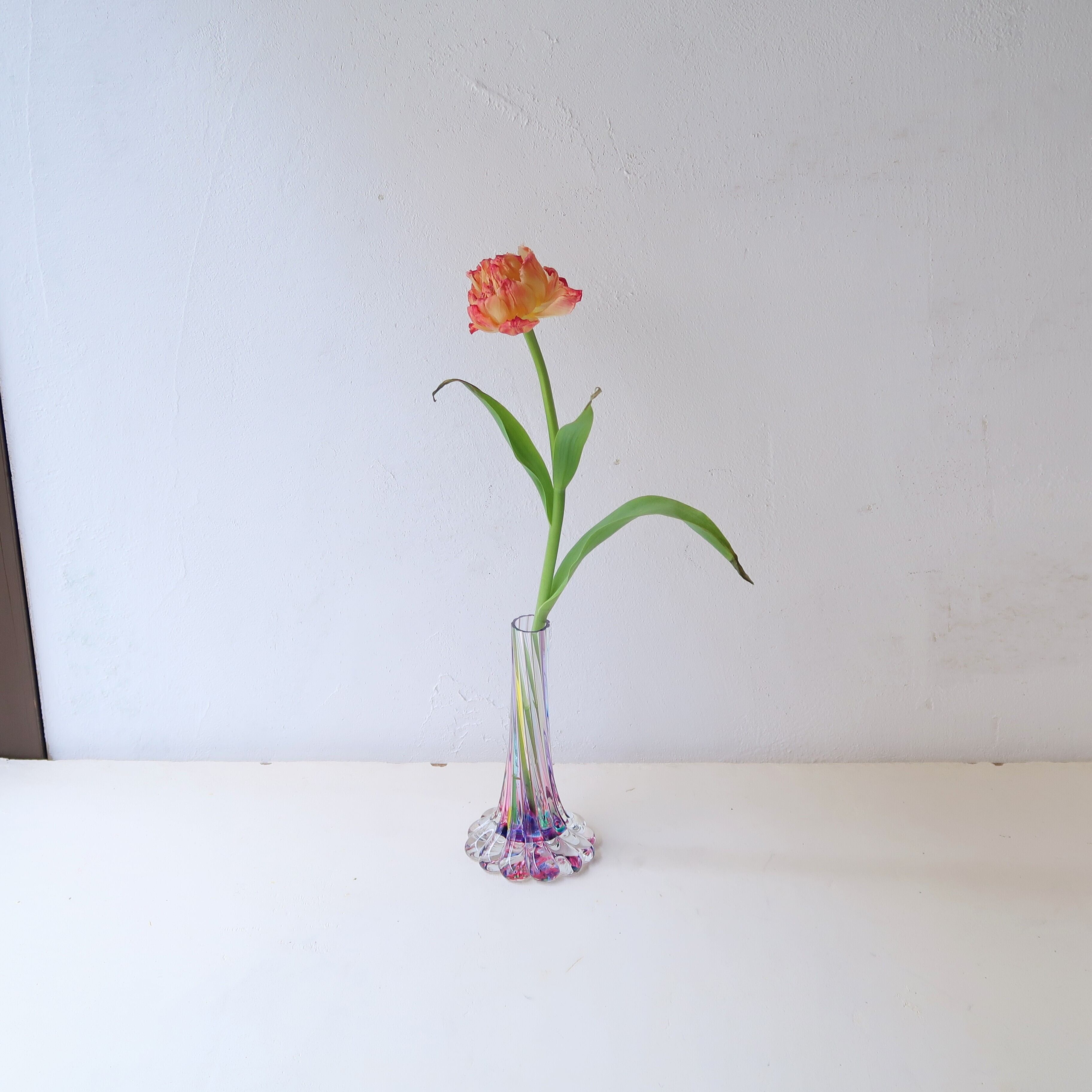 底はぷっくりと花びらのような形で、水感のあるデザイン。口のほそーいフォルムは、一輪挿しにぴったりです。
