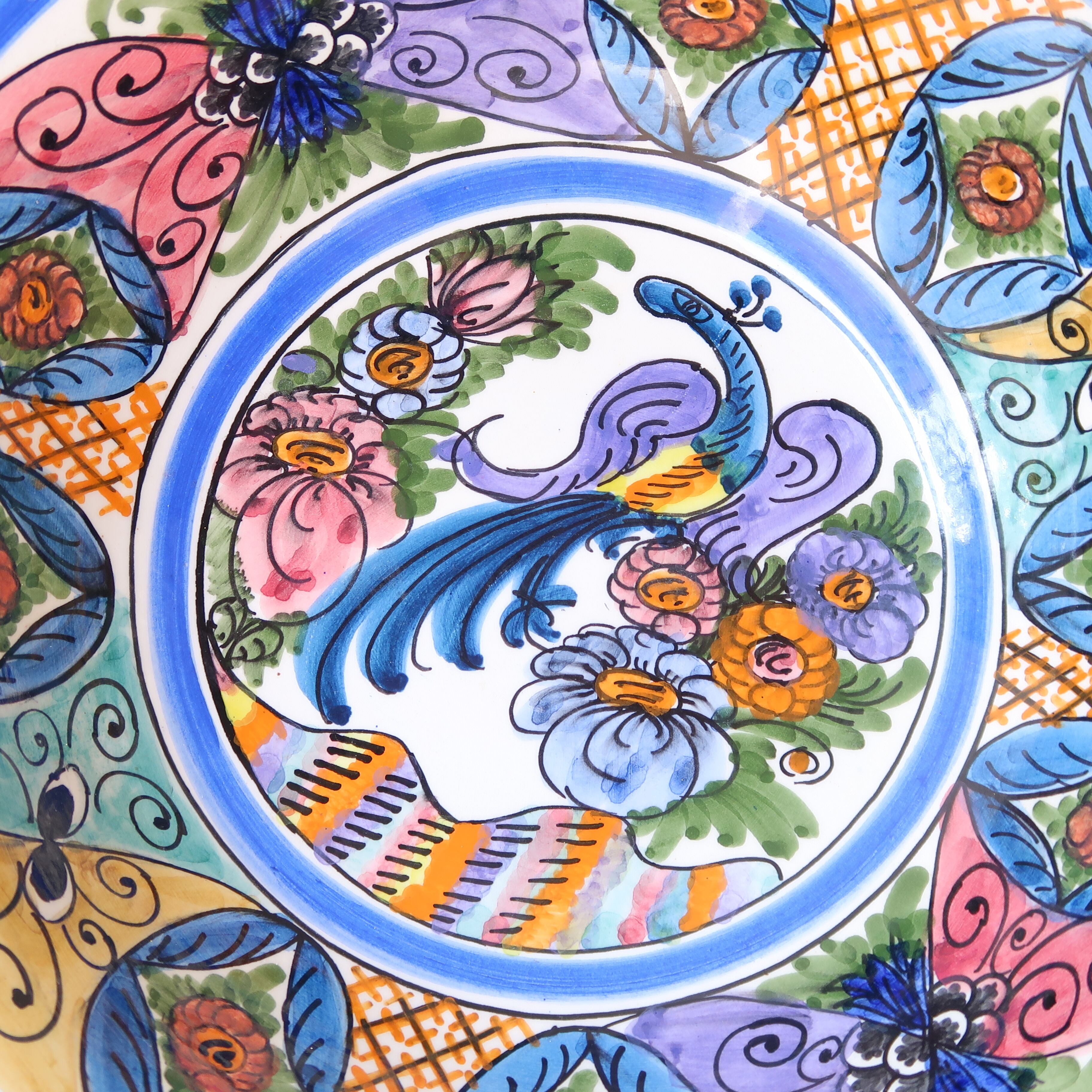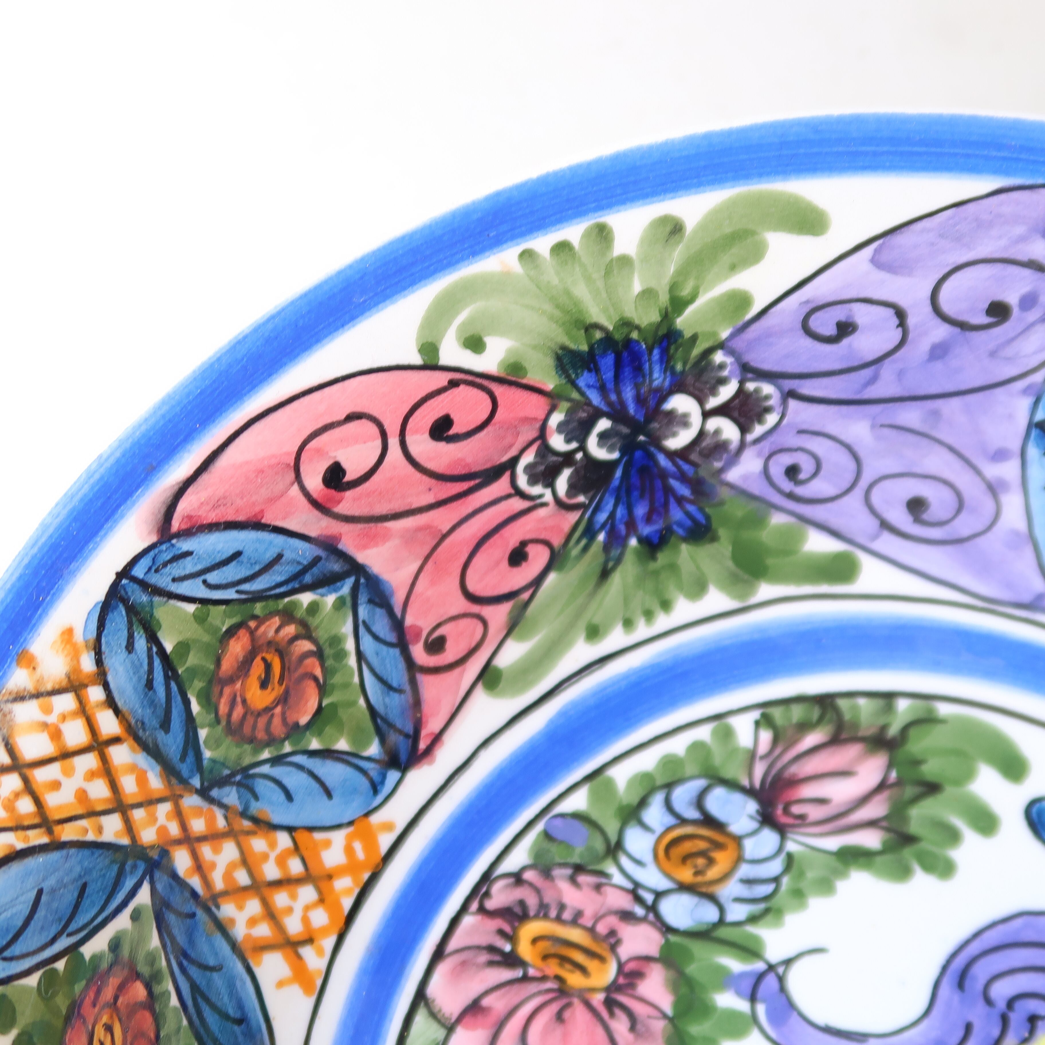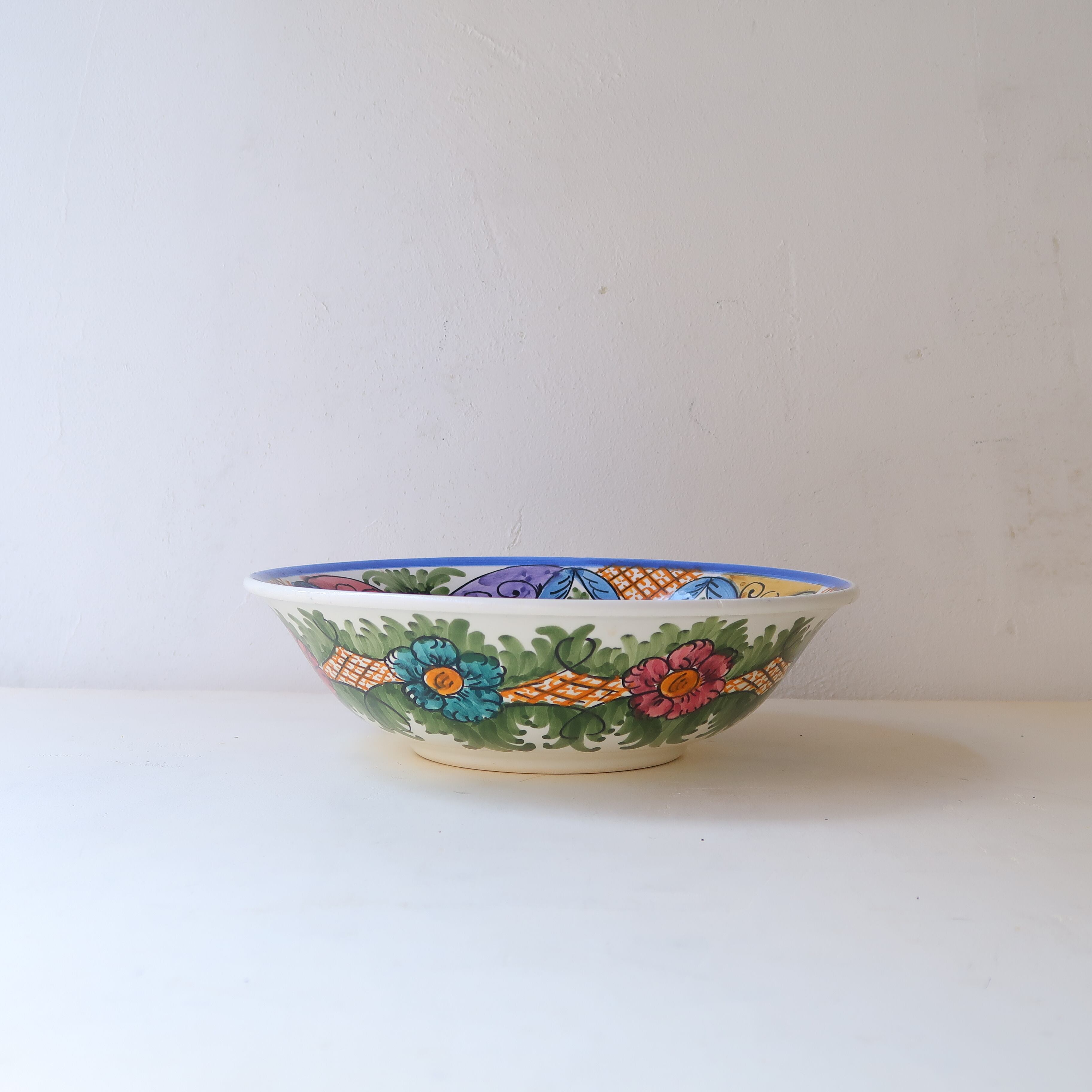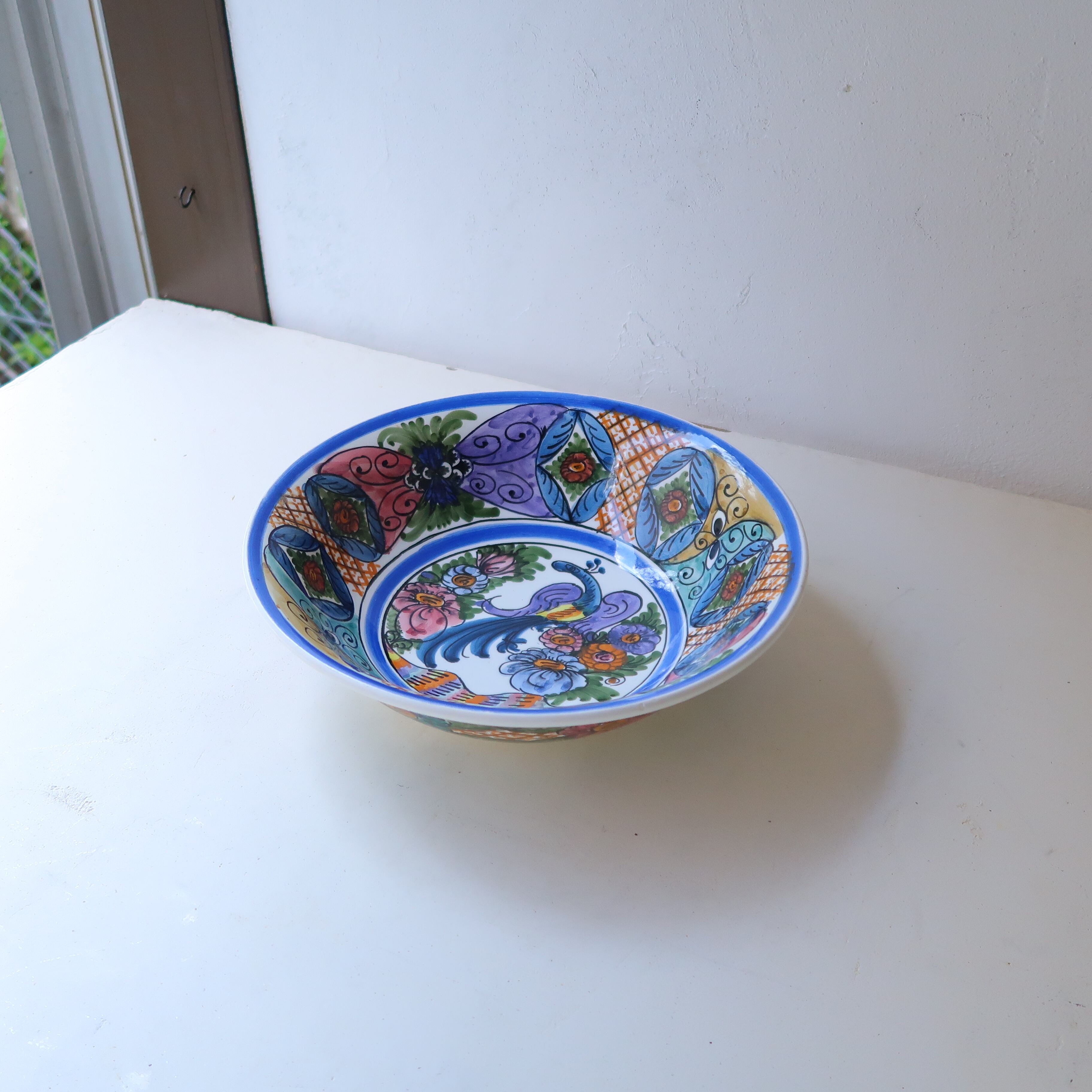 エーゲ海と白い街並み、陽気な気分、のような鉢。2〜3人用のパスタやサラダを盛ると良さそうな、ボウルのサイズ感です。内側には、ブルーをベースに、色とりどりのお花や鳳凰のような生き物が手描きされています。