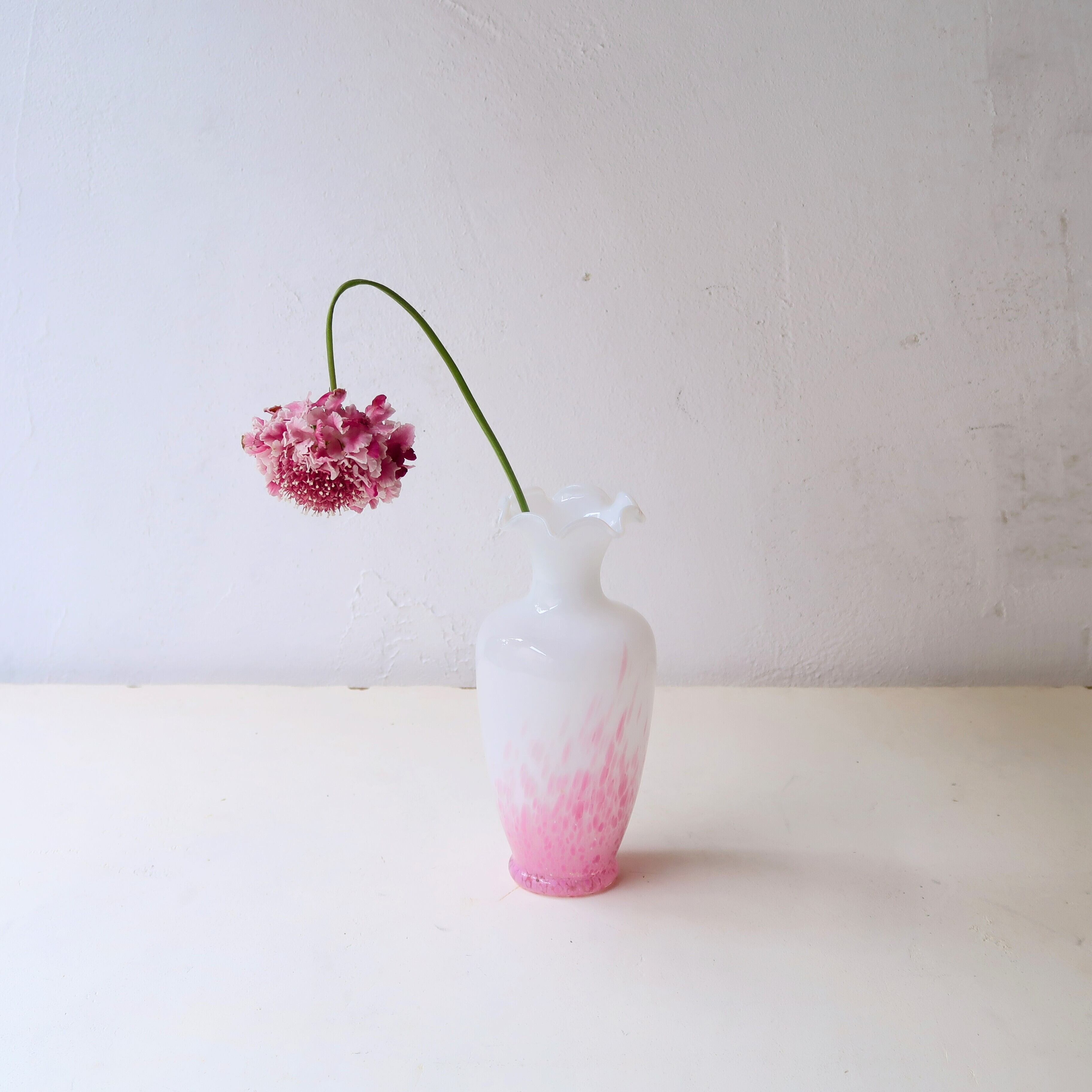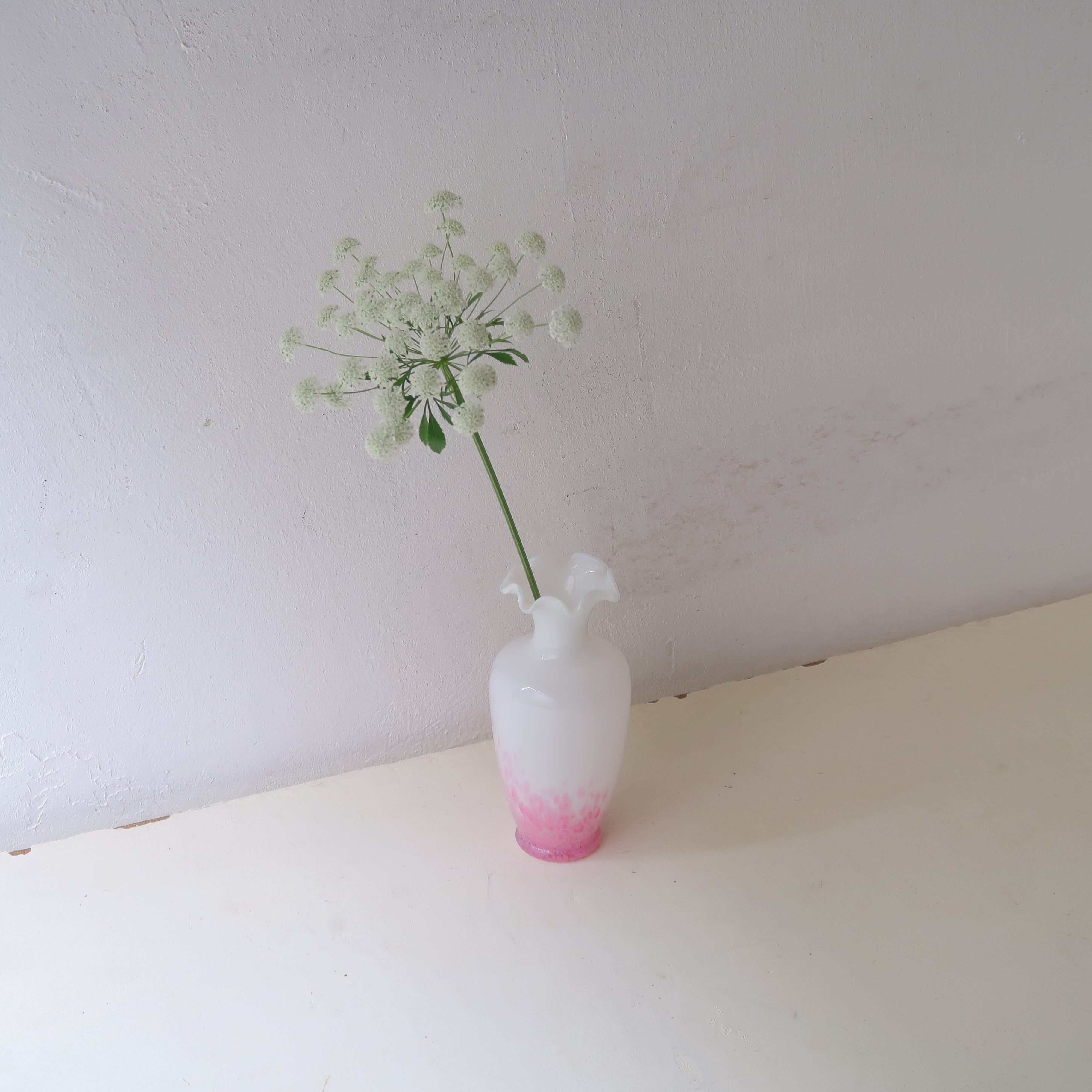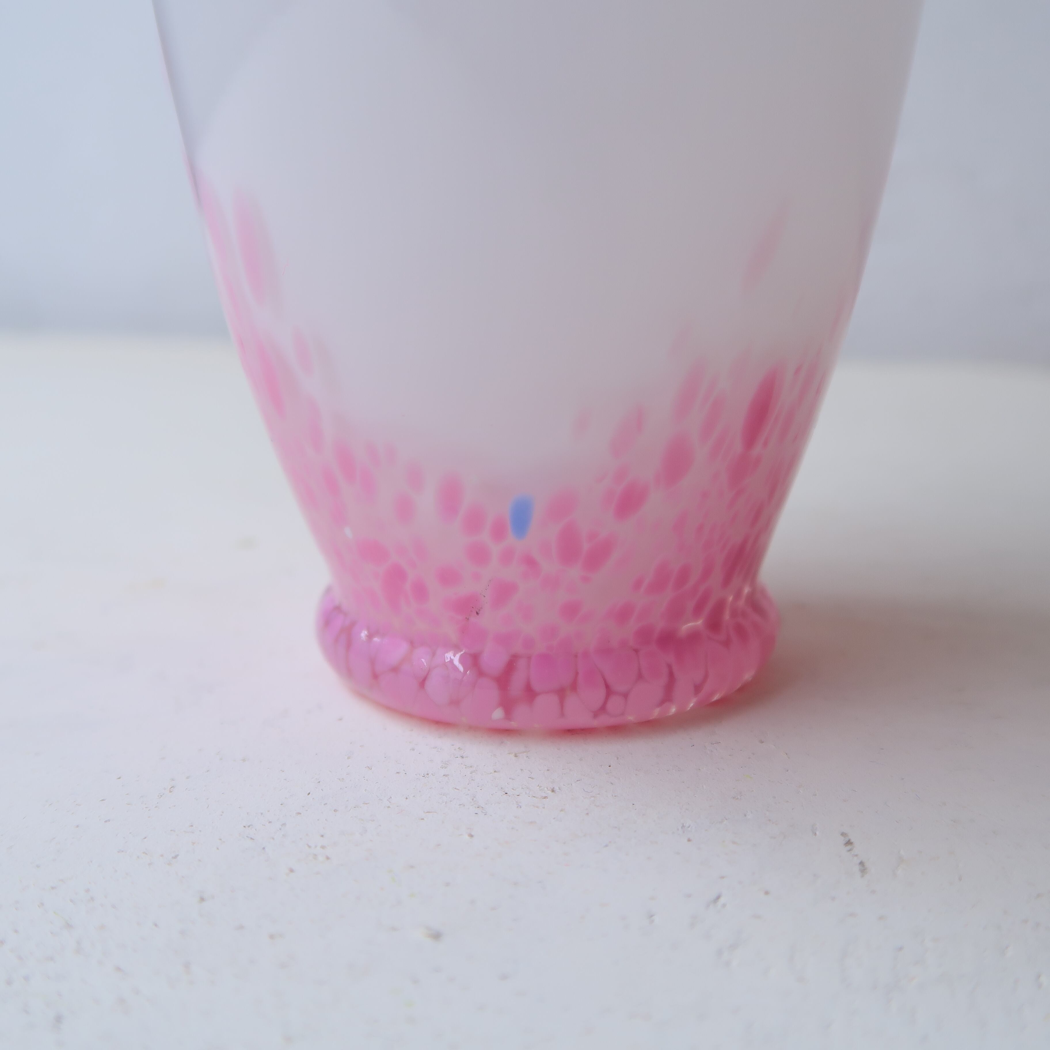 乳白色のガラスに、そよそよとピンクの模様、ときどきブルー(!)。口はひらひらとしていて、繊細で愛らしいフォルム。