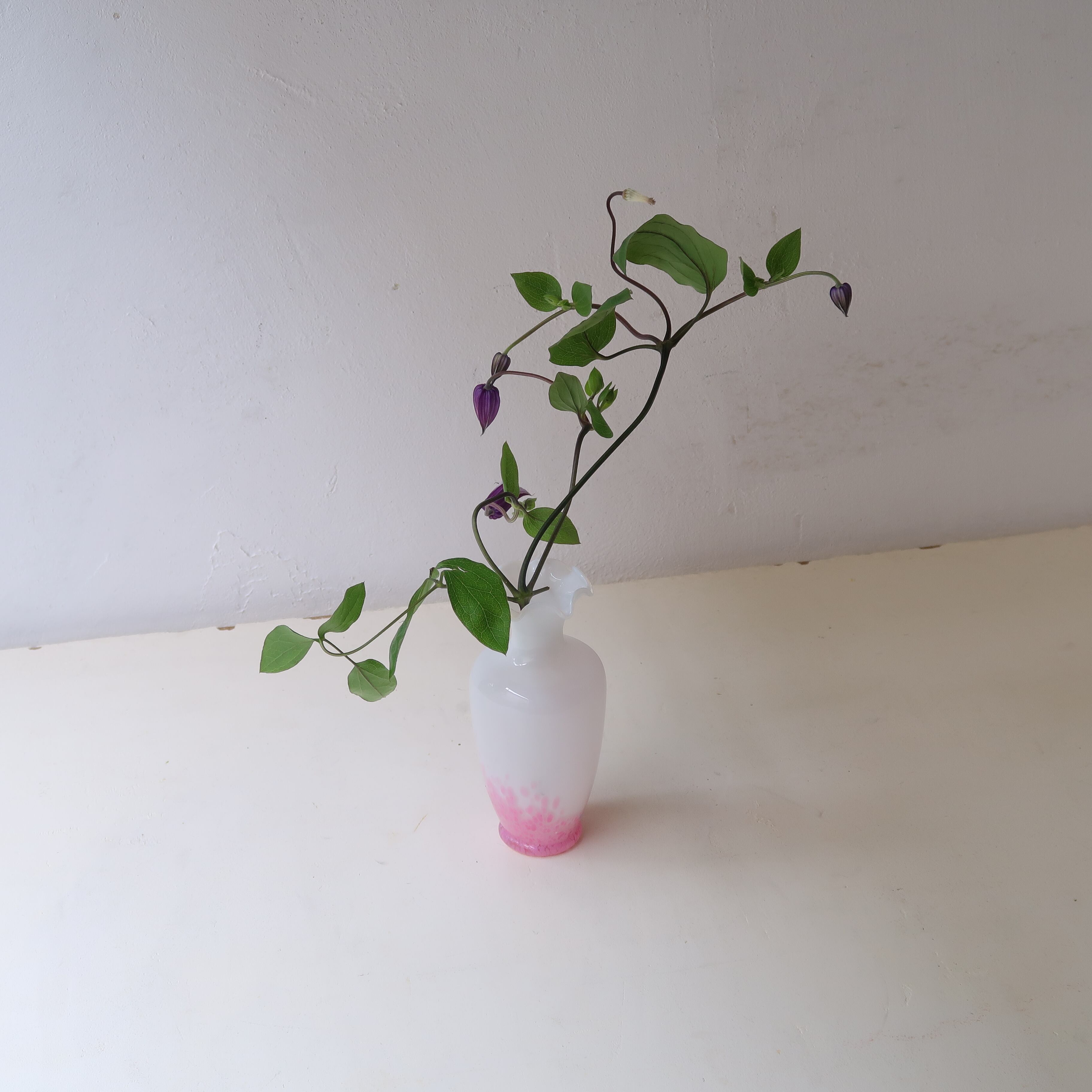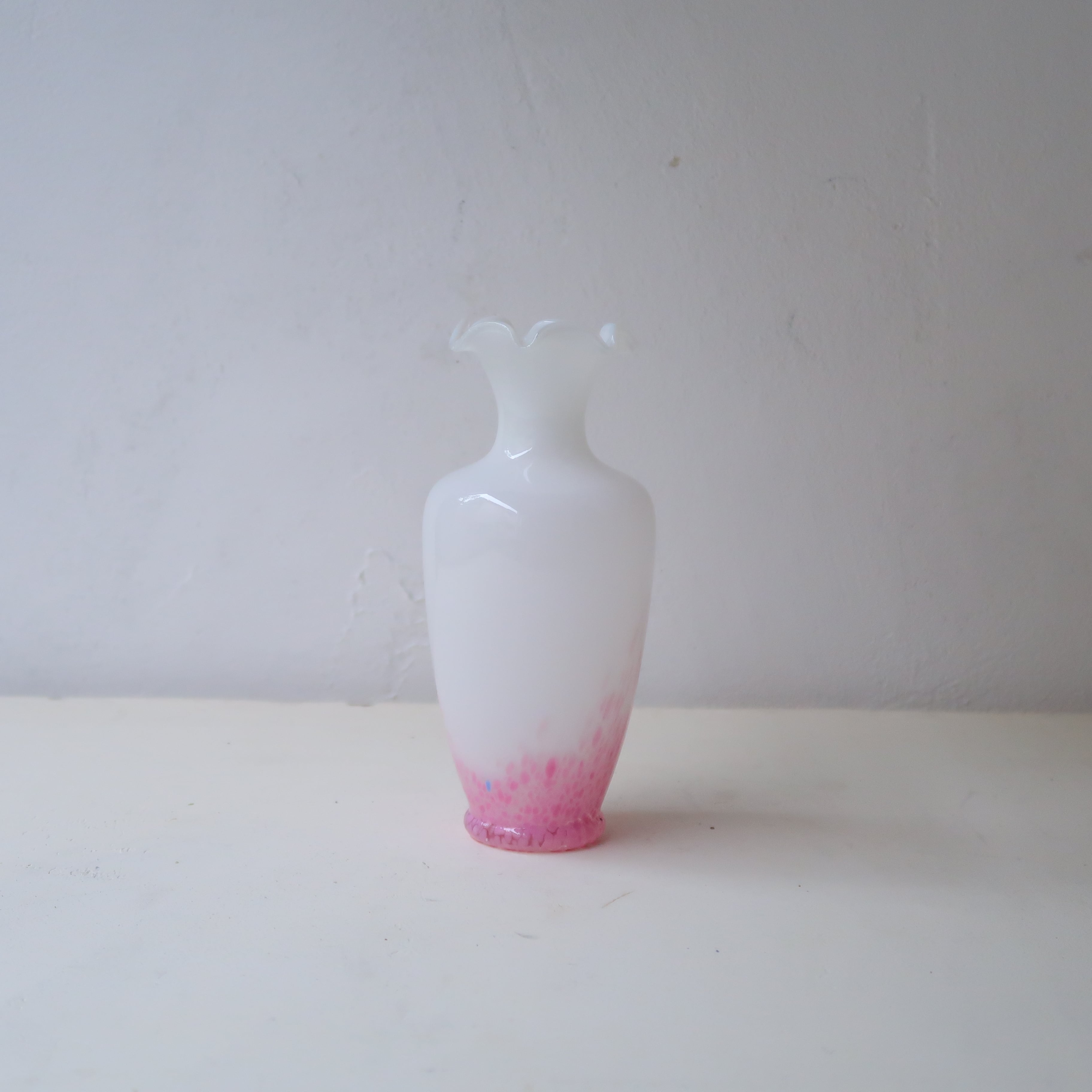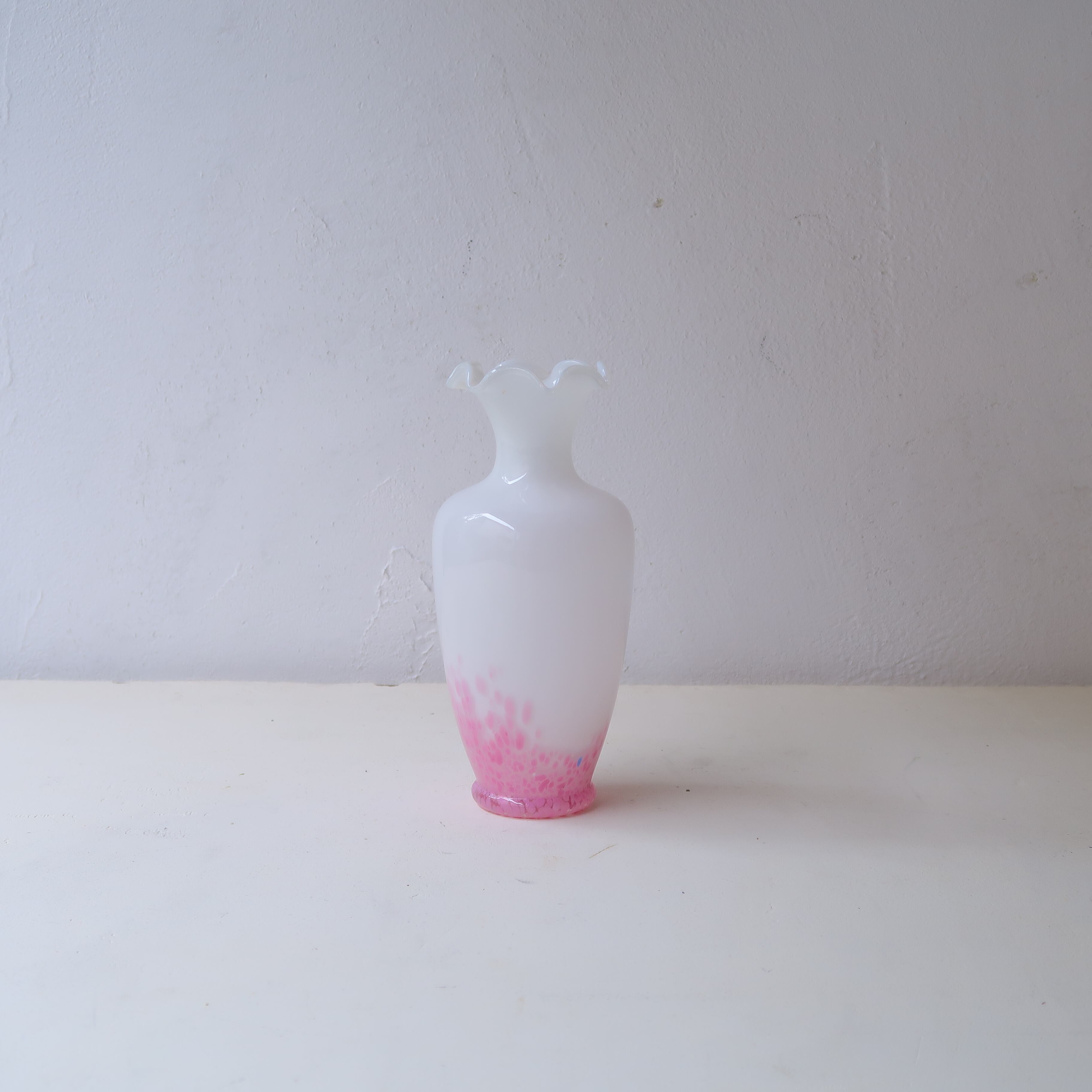 乳白色のガラスに、そよそよとピンクの模様、ときどきブルー(!)。口はひらひらとしていて、繊細で愛らしいフォルム。