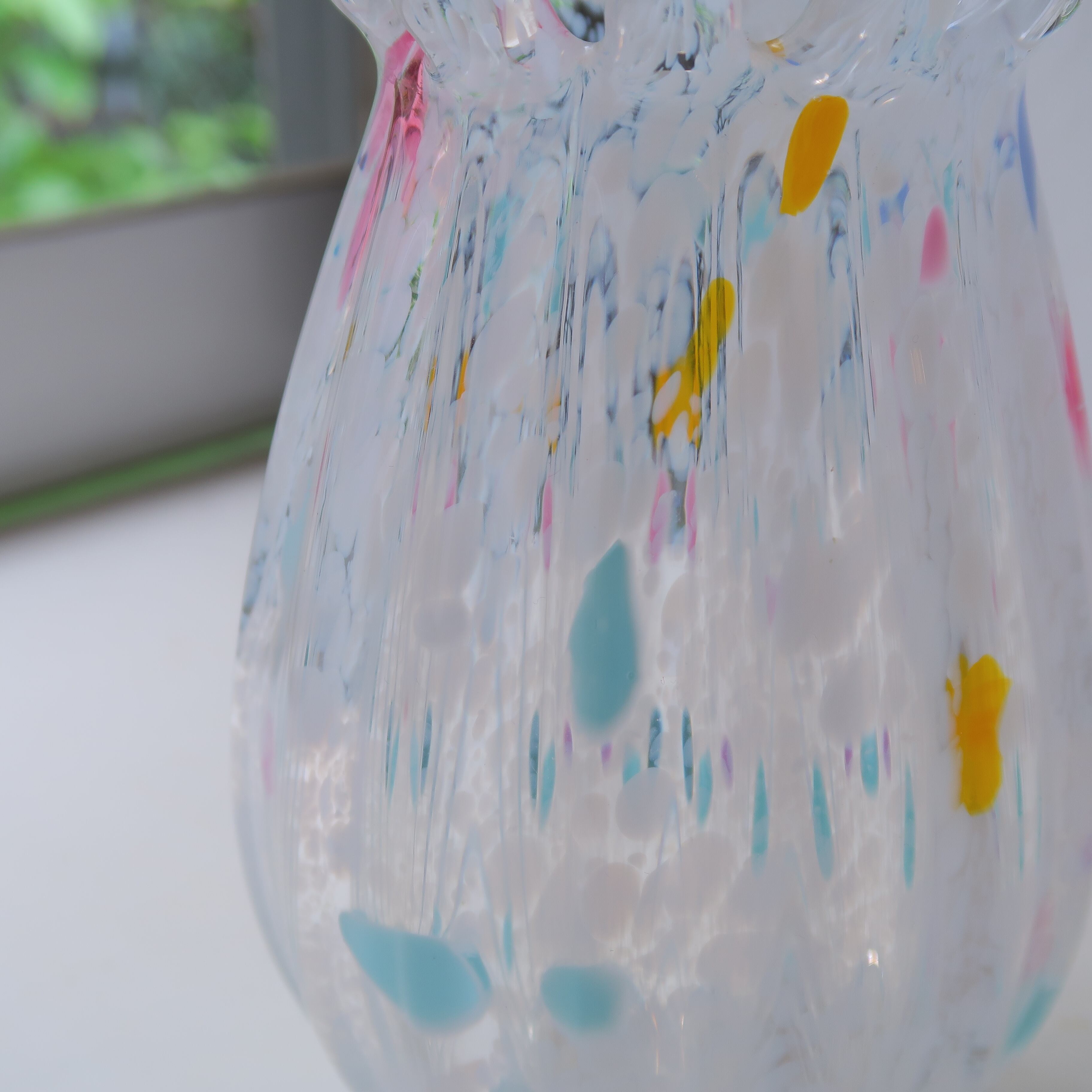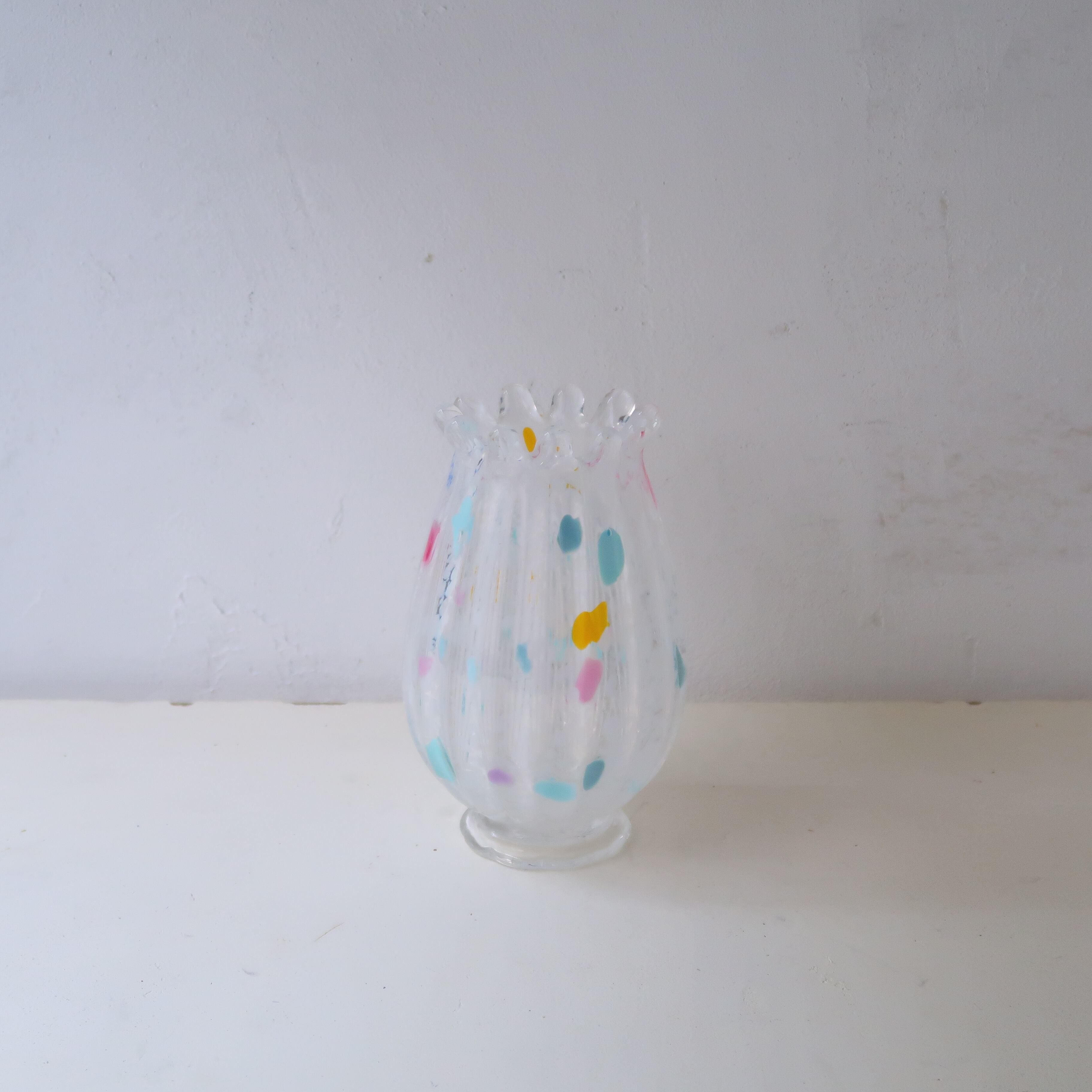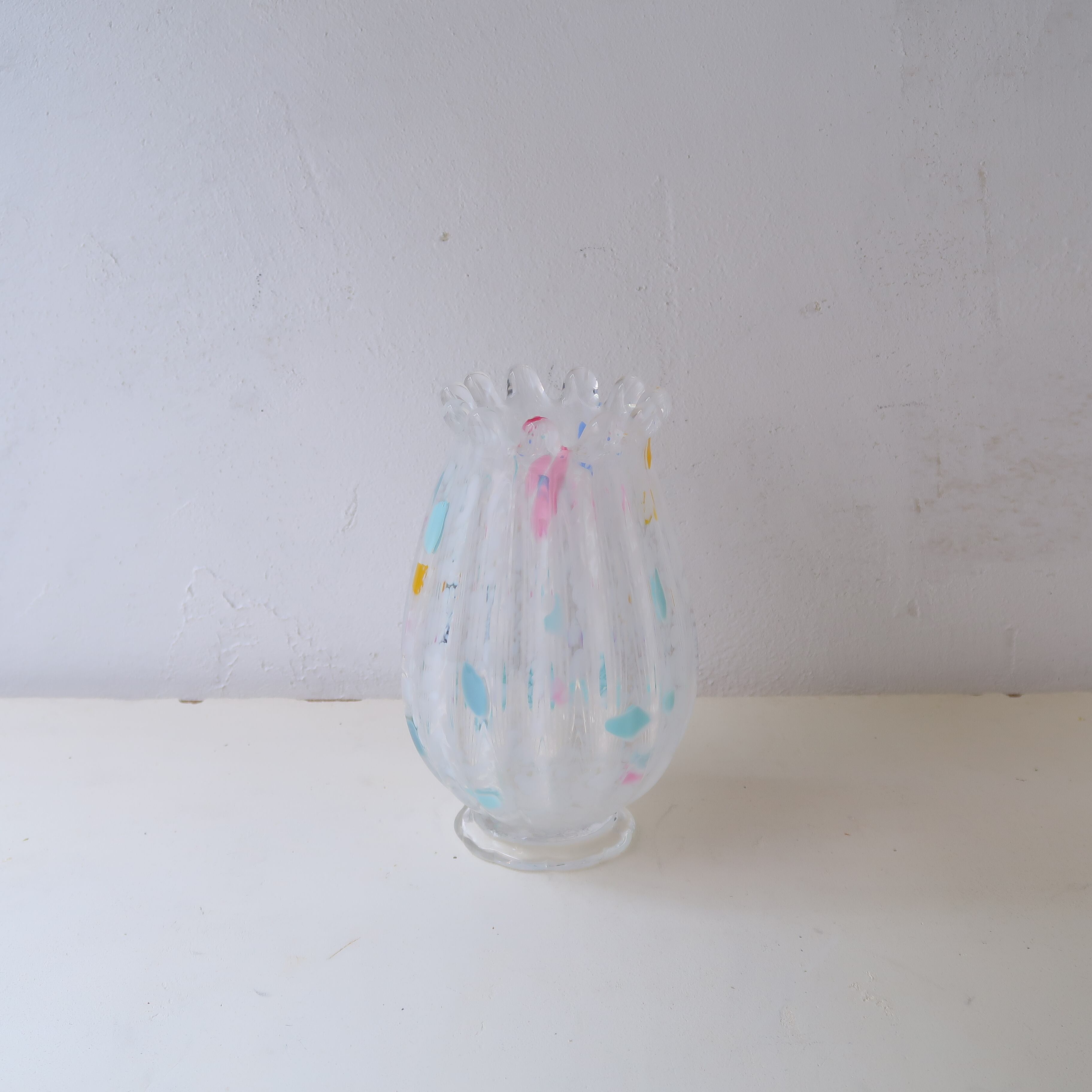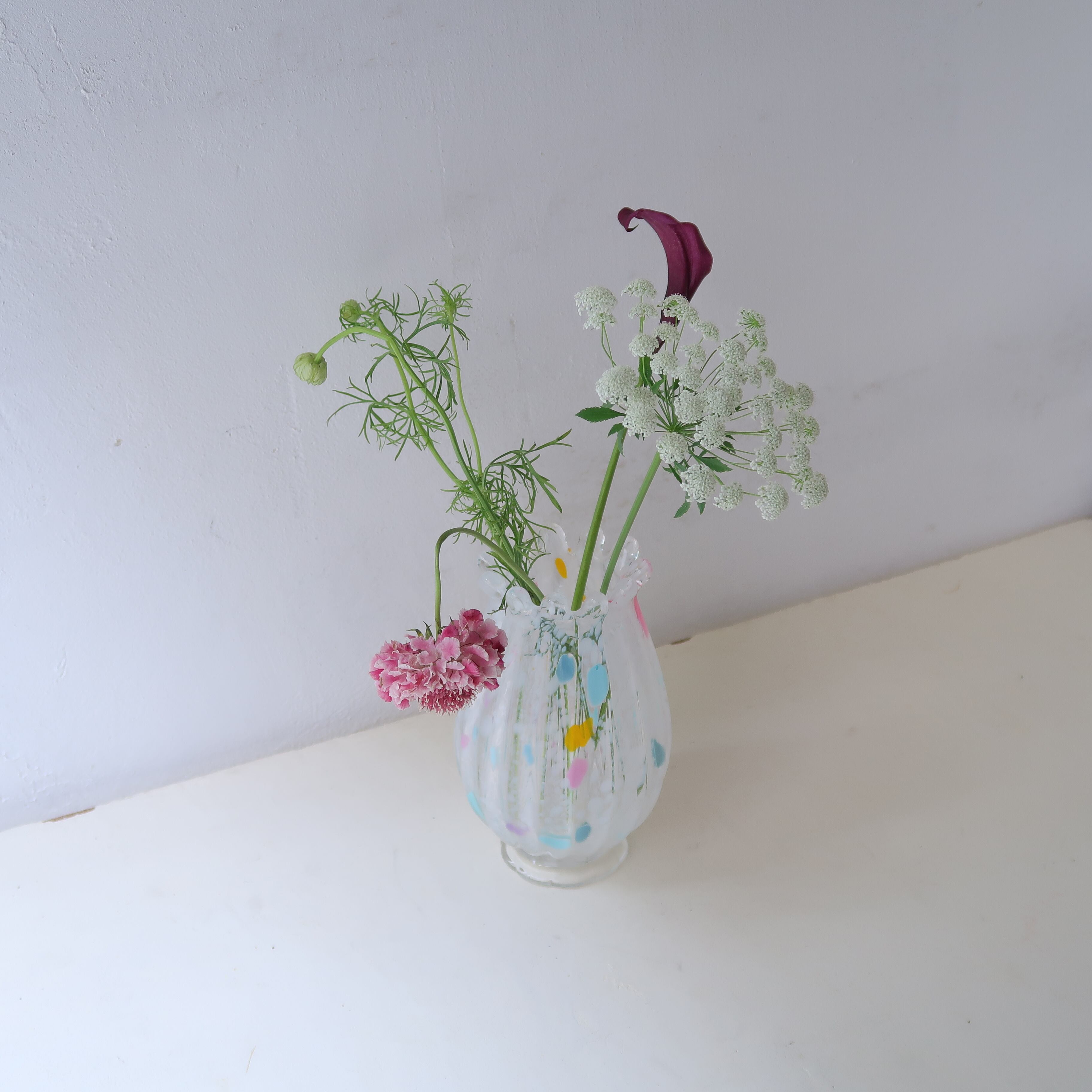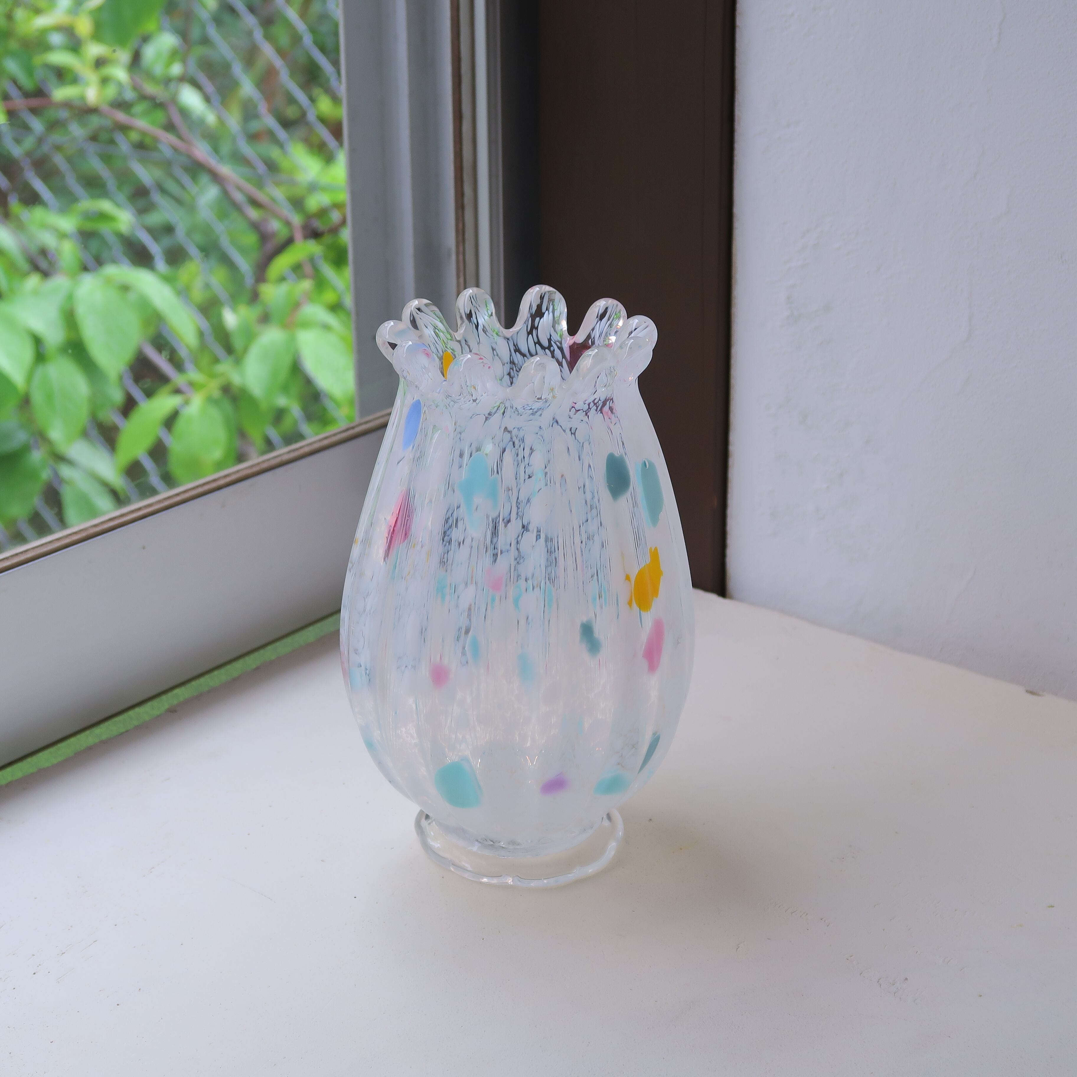 ミルクが一滴おちてはじけたときのような、王冠のようなぷくぷくがかわいい花瓶。とうめいのガラスに、白やピンク、イエロー、ペールブルー…。カラフルなマーブルが、なんとも言えません。脚は、なんと花びら形。芸が細かいですね〜。