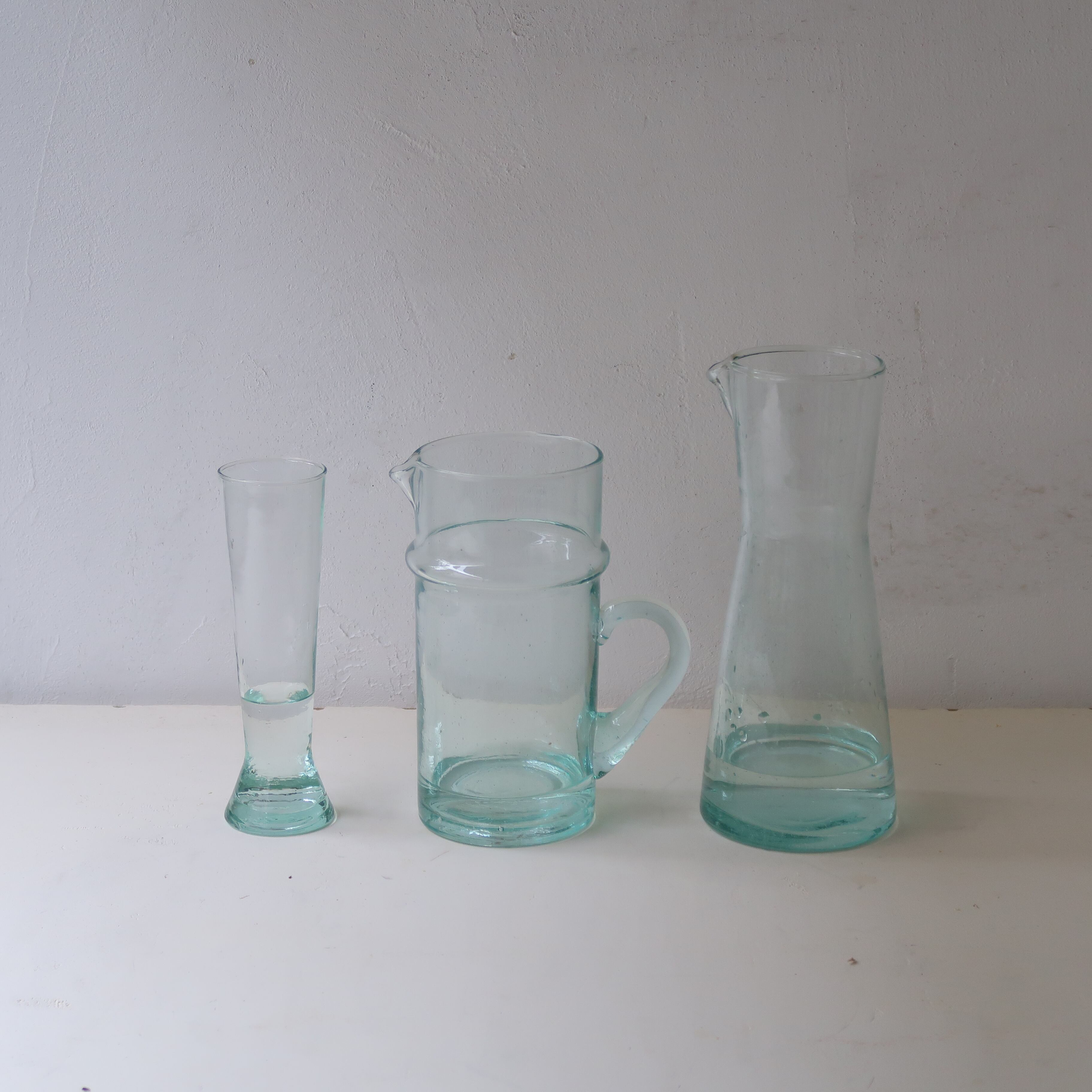 そんなこちらは、モロッコで伝統的に使われてきたリサイクルガラスを使用したピッチャー。吹きガラスならではの、ぽってり感、気泡、この色合い、大好きです。