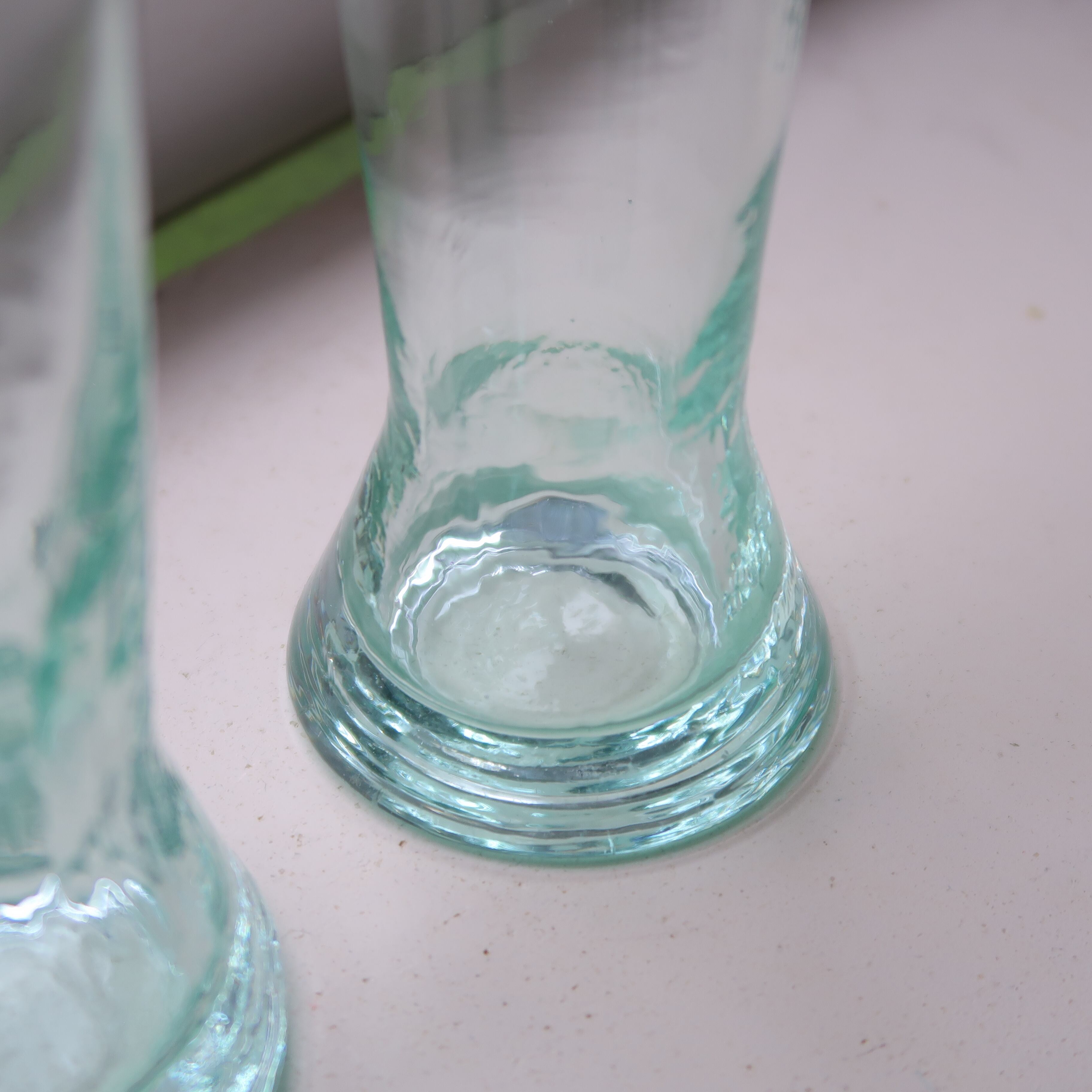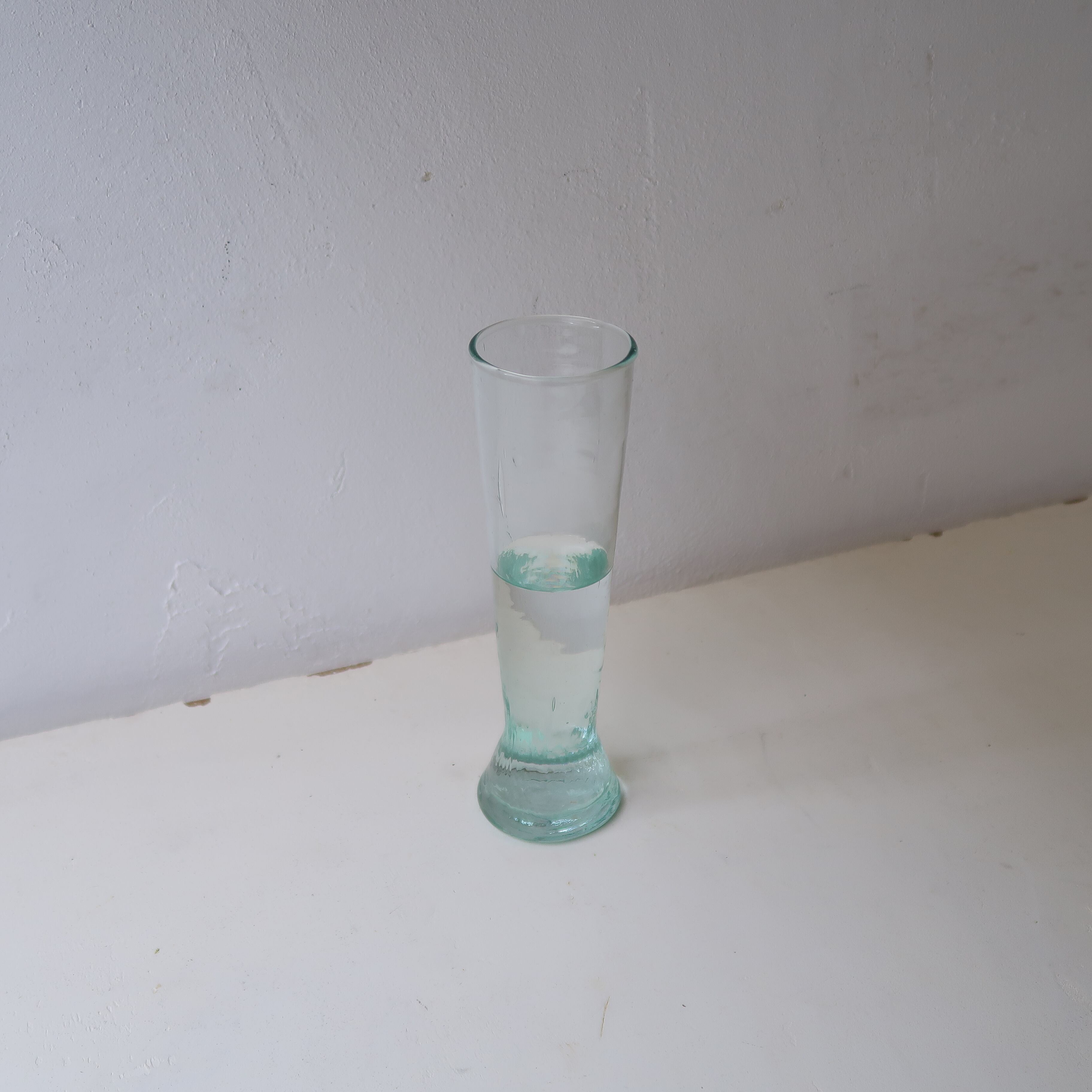 ガラスの原料には不純物として酸化鉄が含まれていて、そこに別の色を足すことで、透明に見せることができる。リサイクルガラスの色は、加色をしていない、不純物の酸化鉄がそのまま残った色。不純物だとされるものを残してくれたからこそ、こんなにも素敵な色のグラスが生まれたのだと知ると、なおさらこの色が愛おしく思えます。