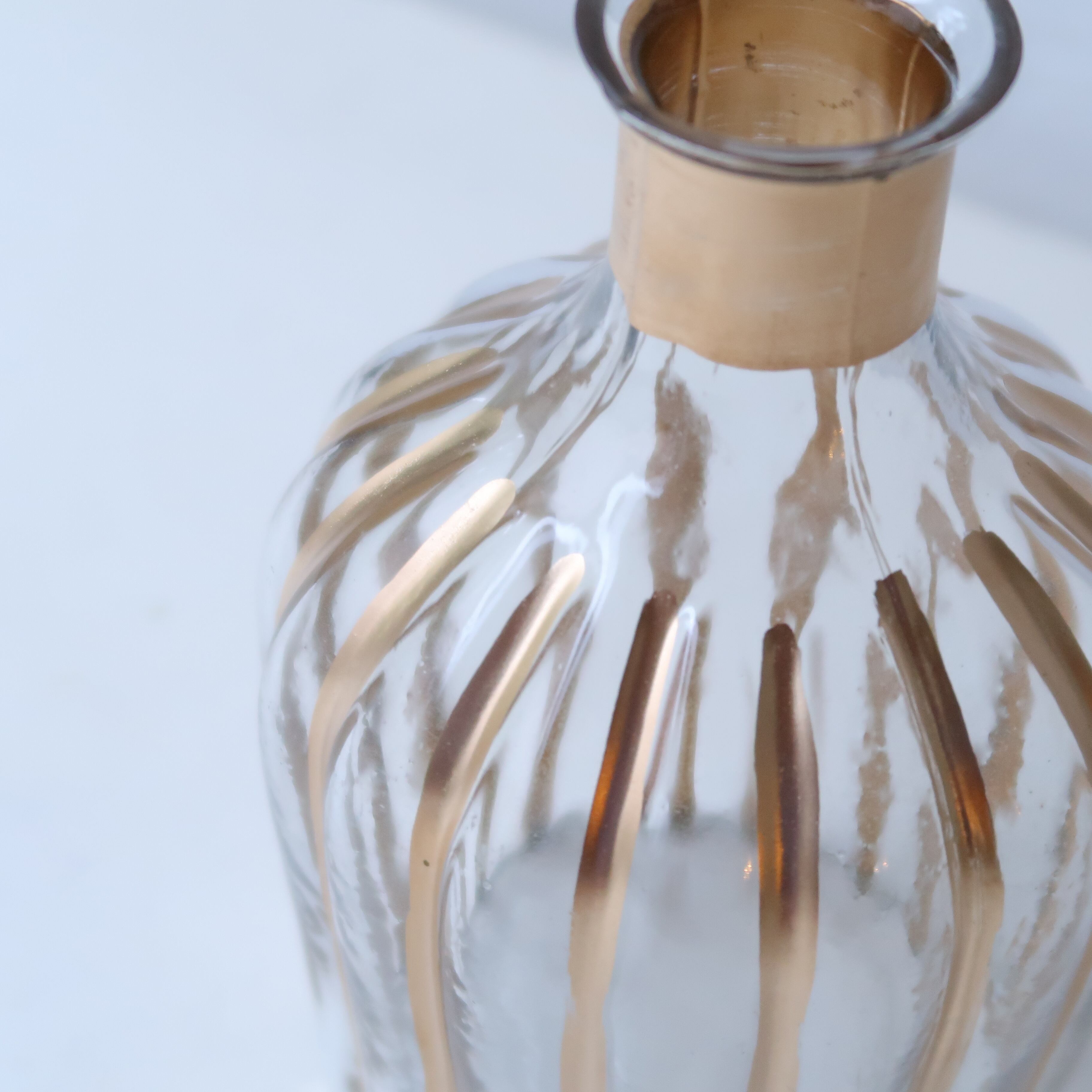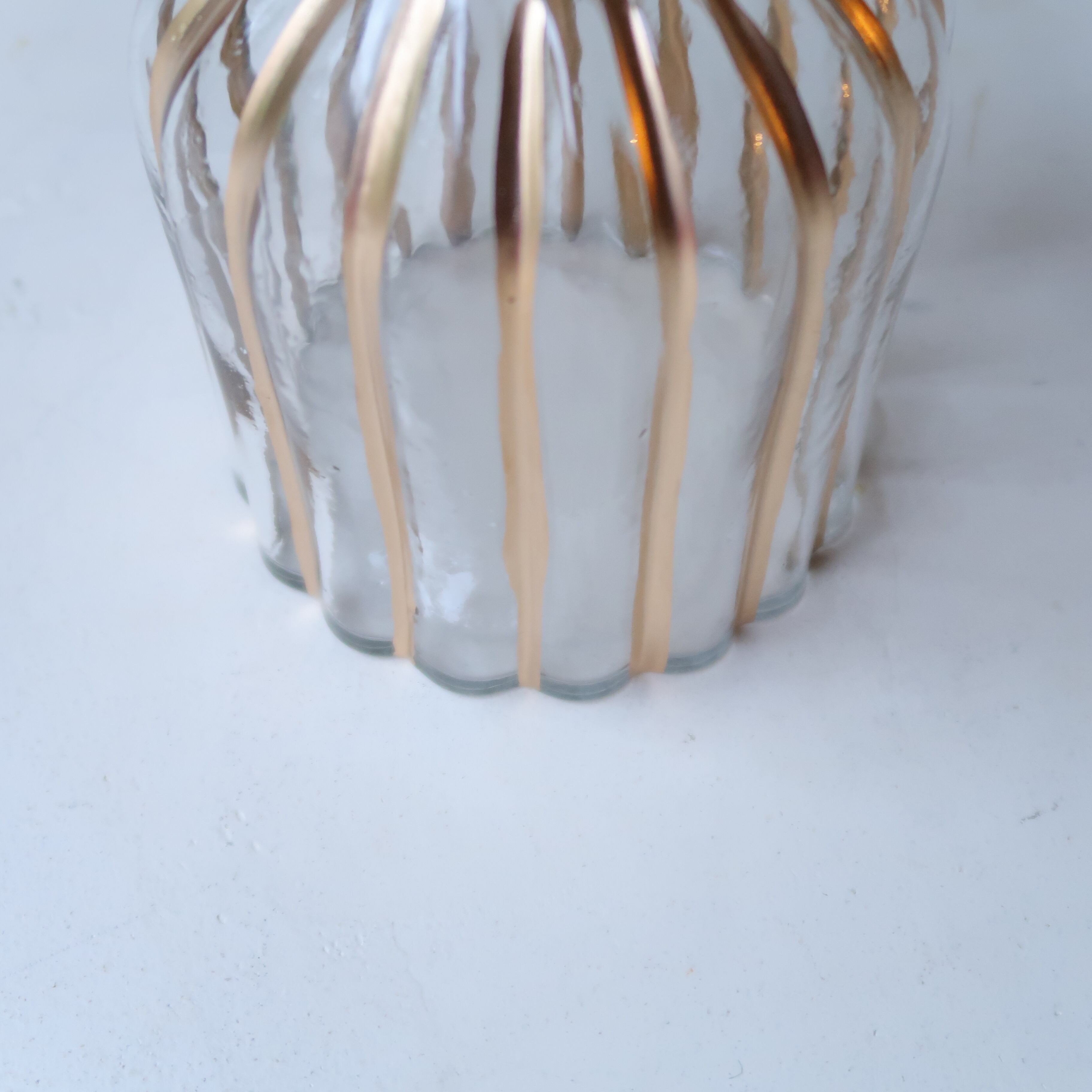 ぱきっとしたゴールドのラインがかわいい花瓶。底は花びら型で、そのくぼみにラインが描かれています。よーく見ると、ガラスにはところどころ気泡があり、ゆらぎのある姿もまた、愛らしい。