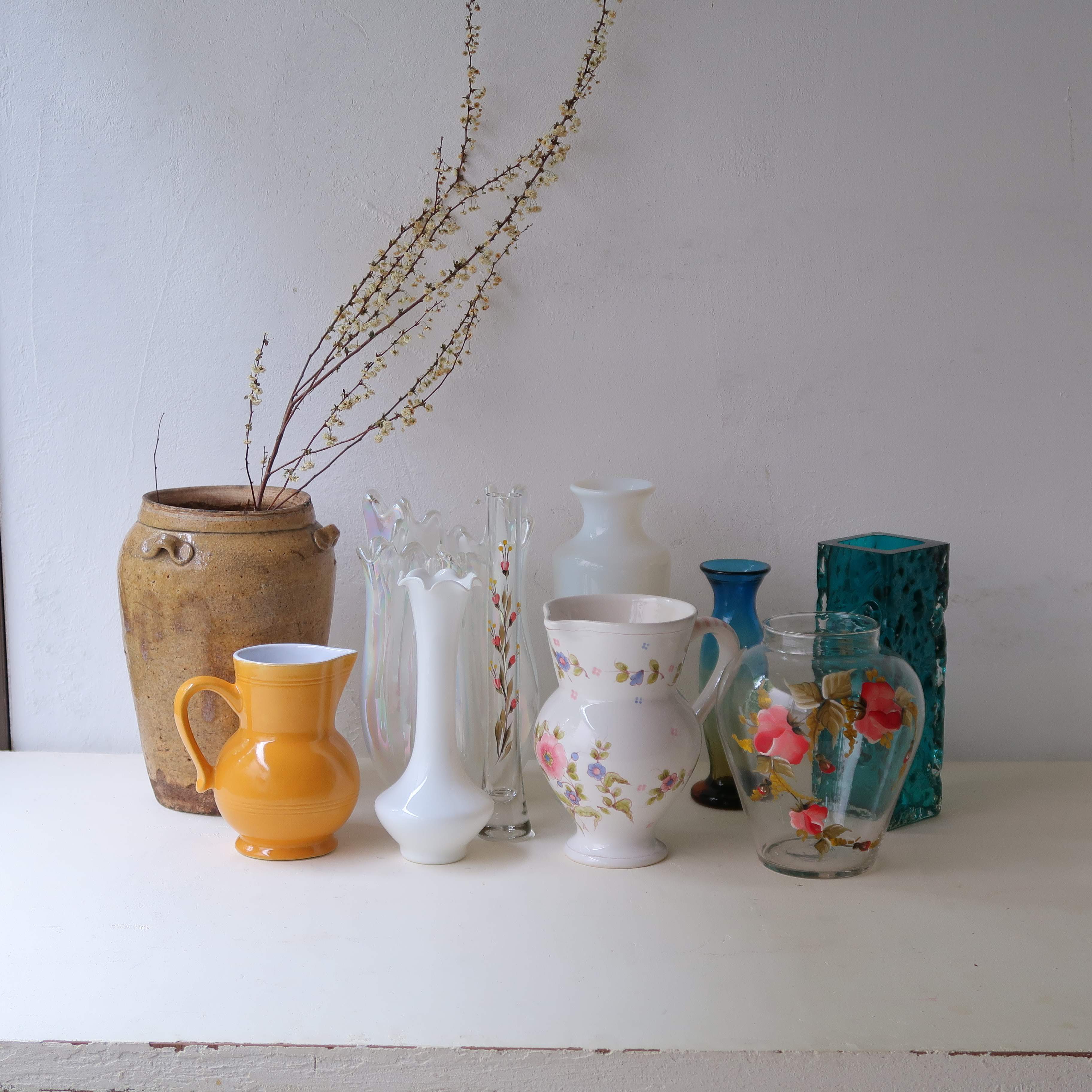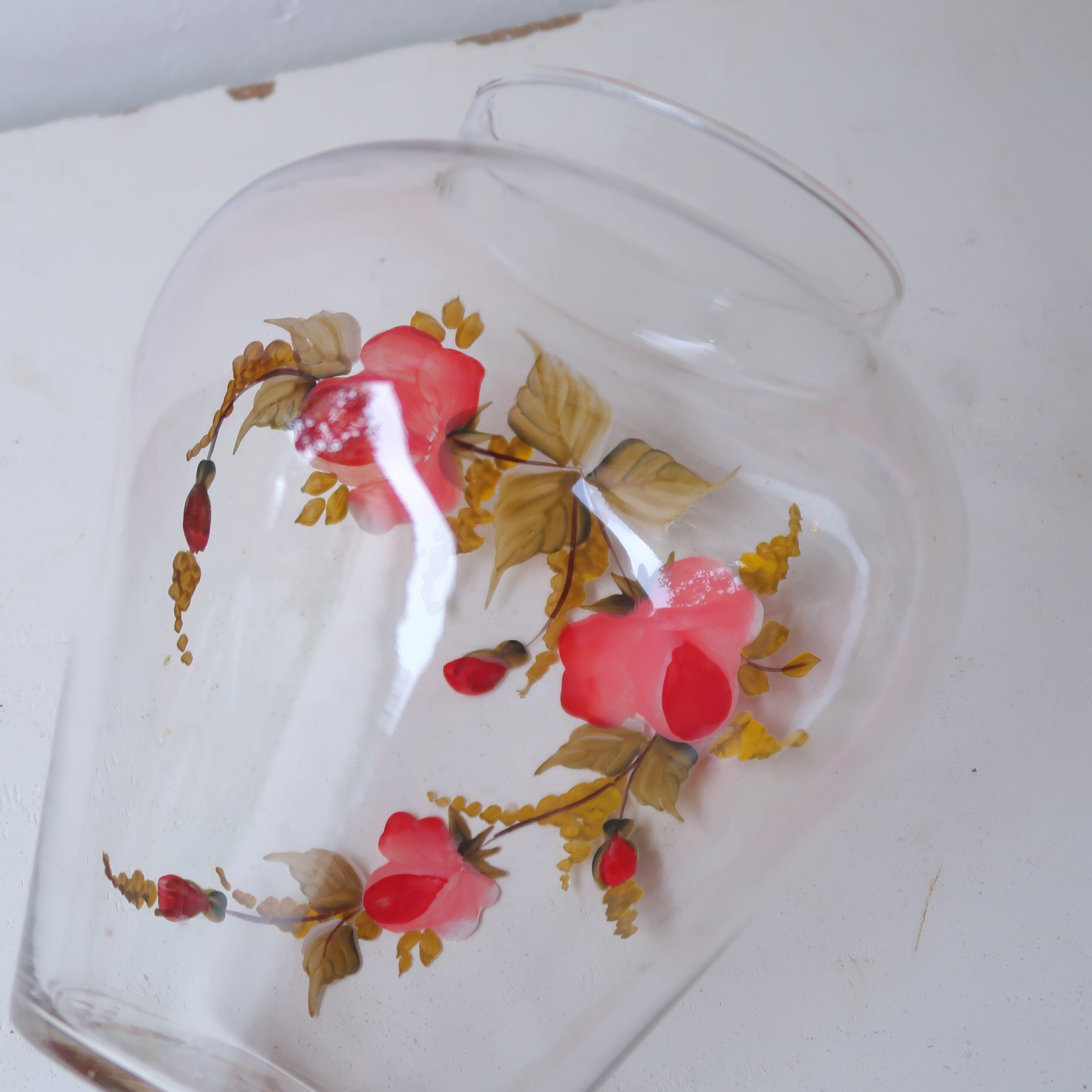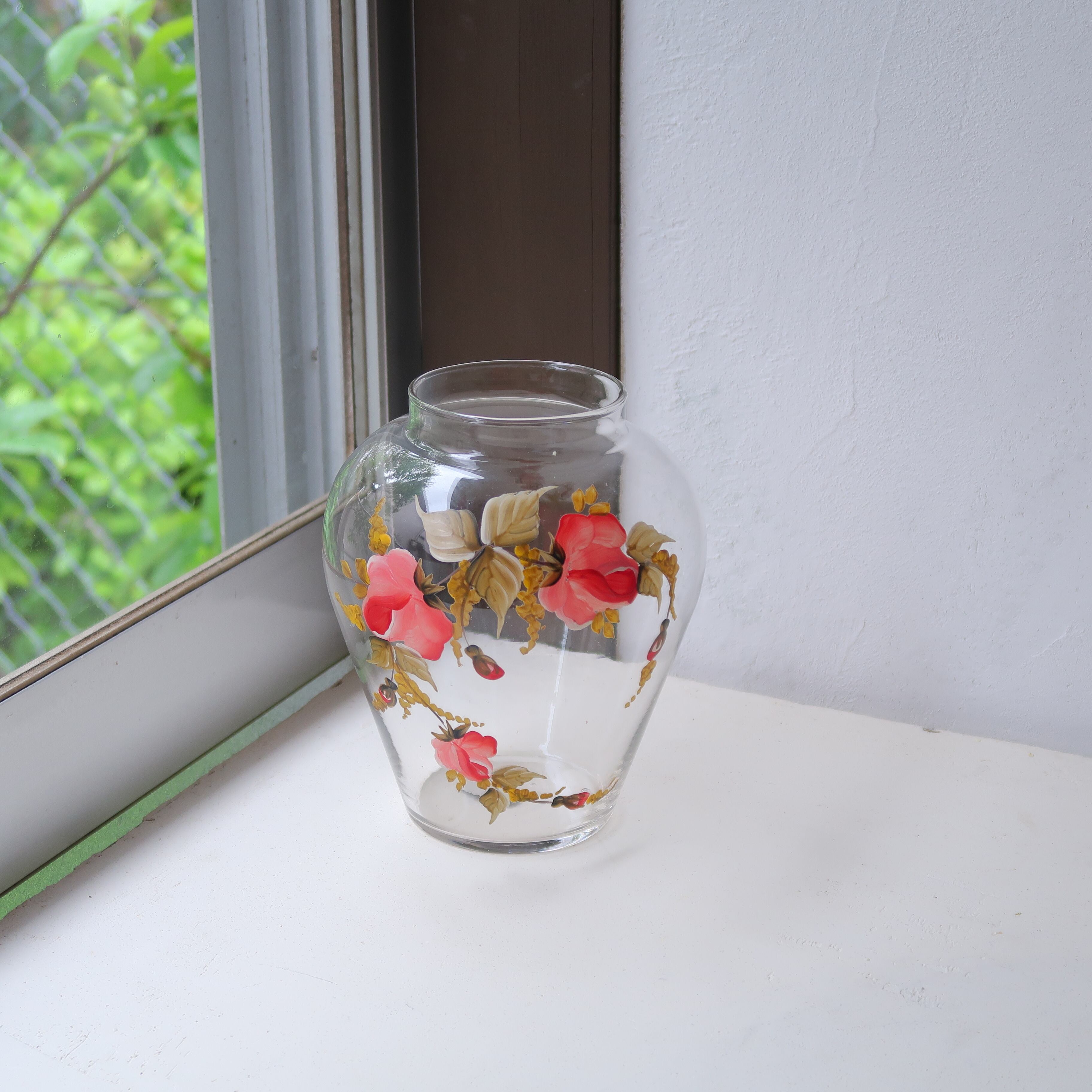 ぷくぷくと赤いお花がペイントされたガラスの花瓶。りんごのようなまるいフォルムが美しい。