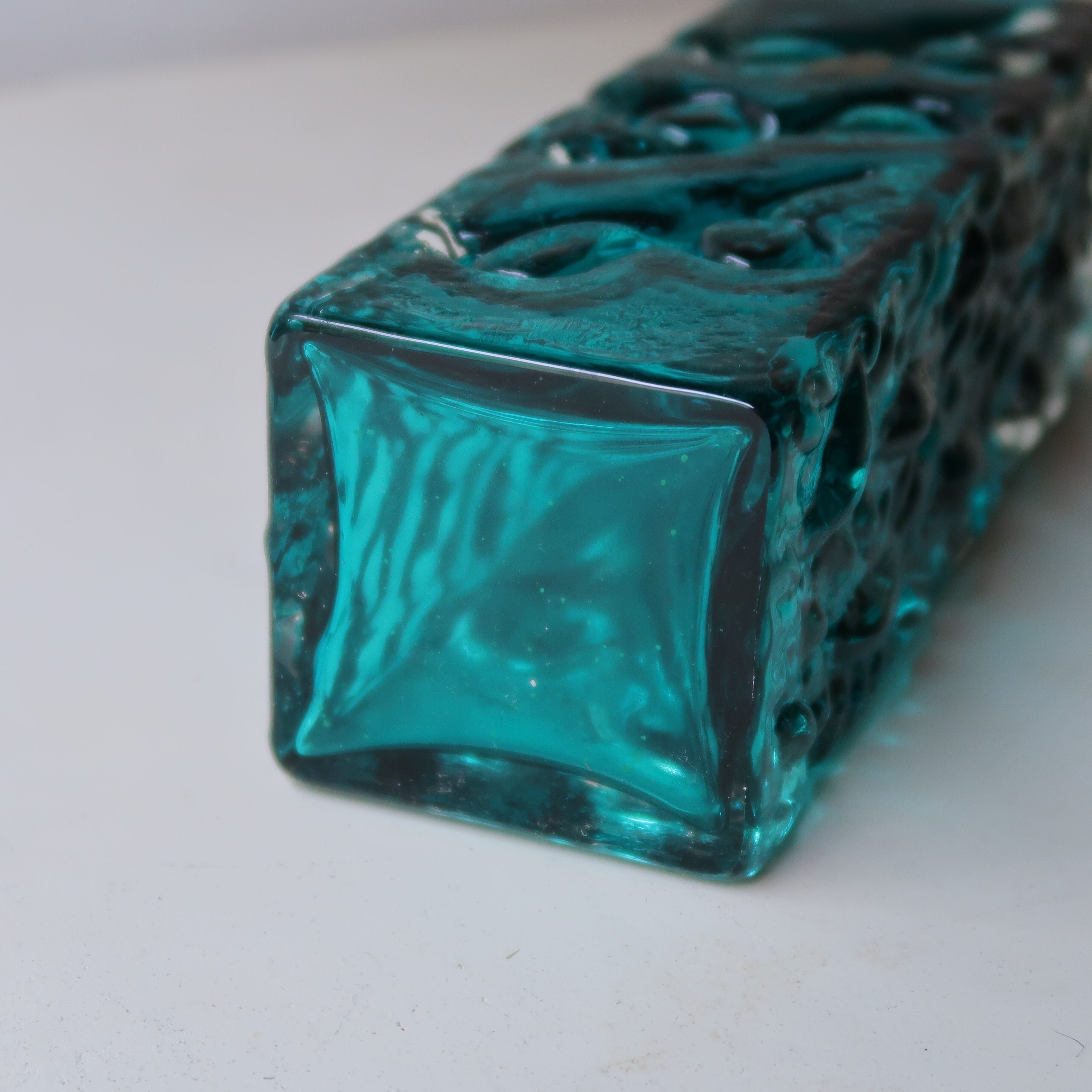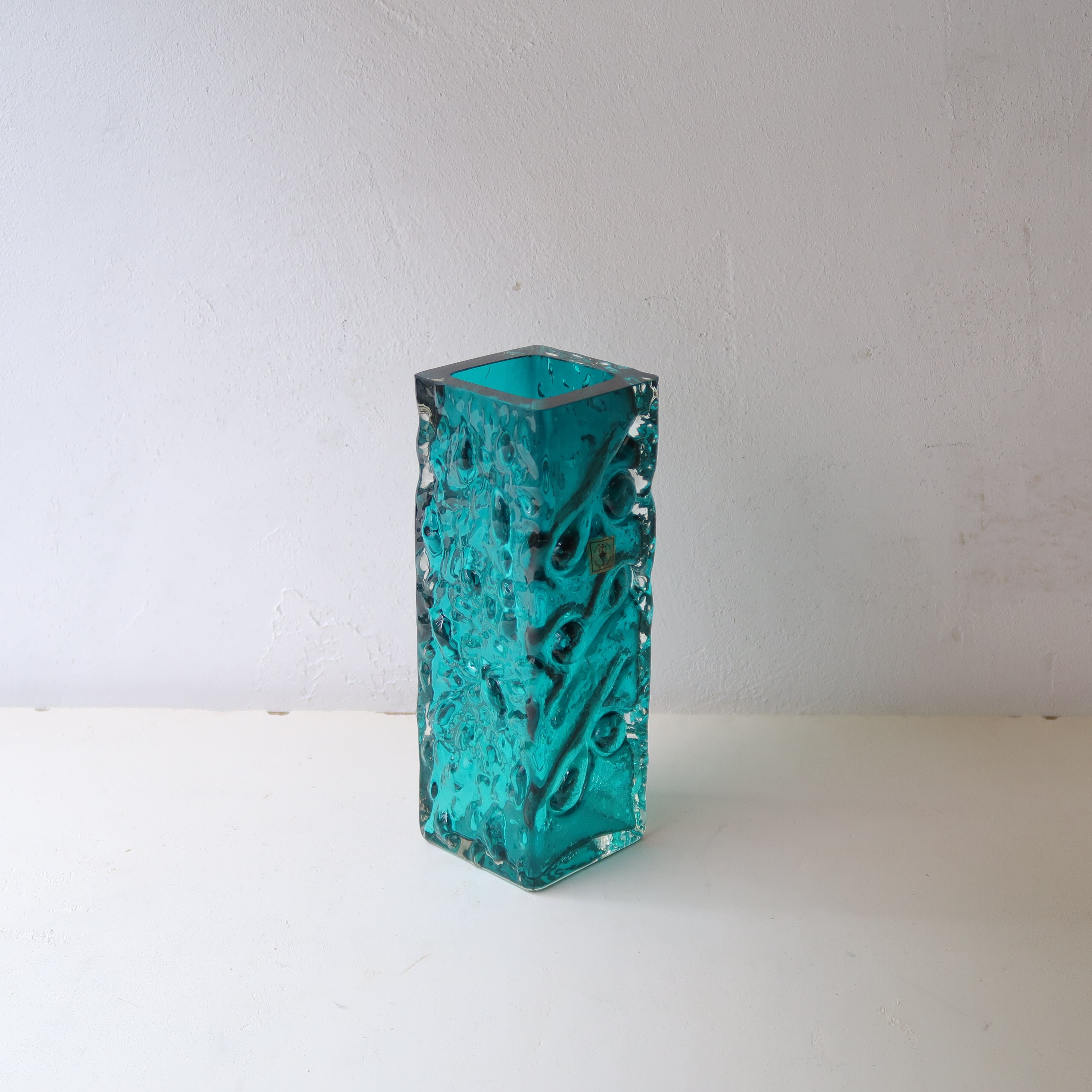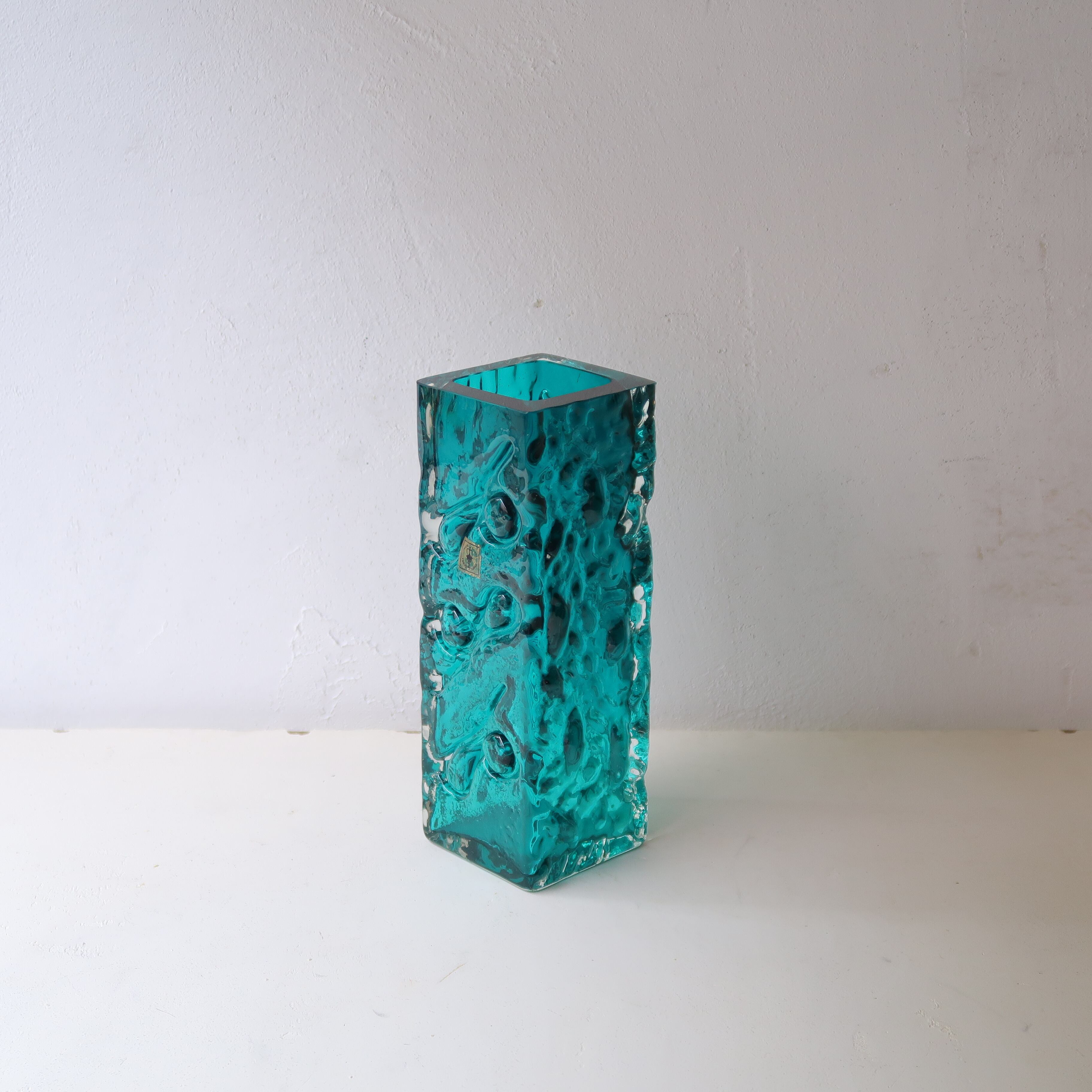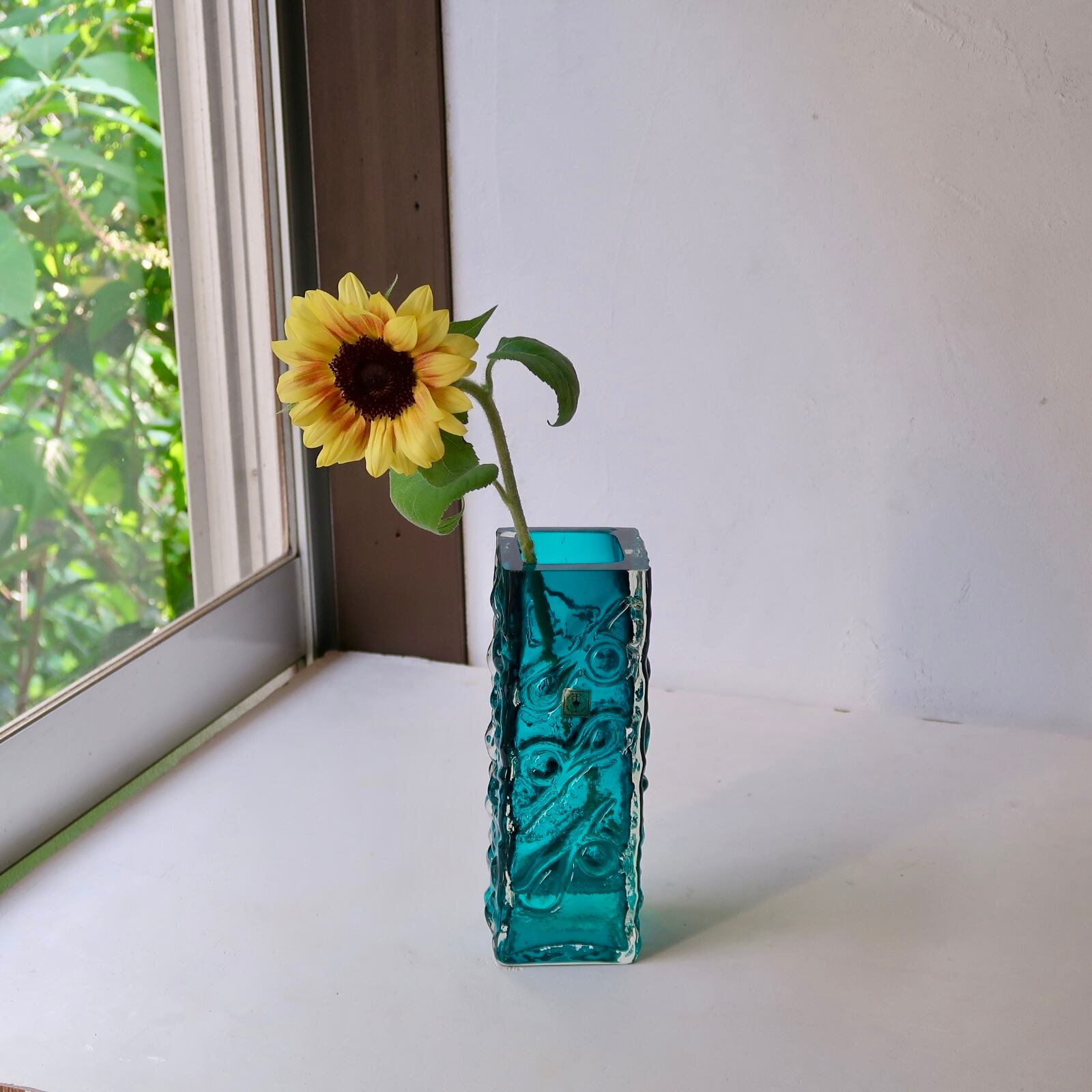 なんとも言えない、深いブルーグリーンのガラス。渦を巻くような、植物の実のような凹凸、分厚く四角いフォルム。