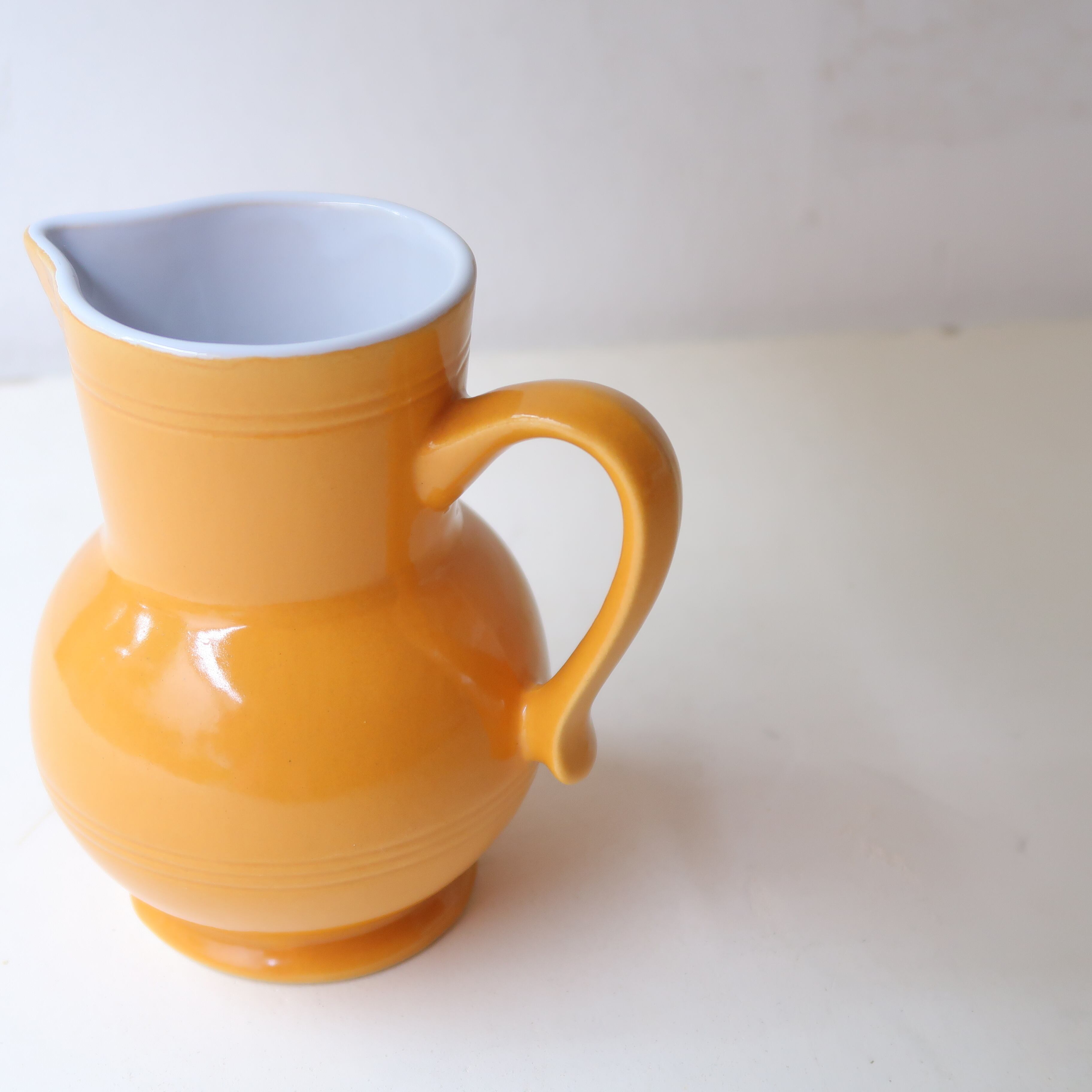 くもりのない元気なキャメル色に、内側はクリーンなホワイト。ぽてっとしたかたちと、取っ手のシャープさがかわいいジャグ。