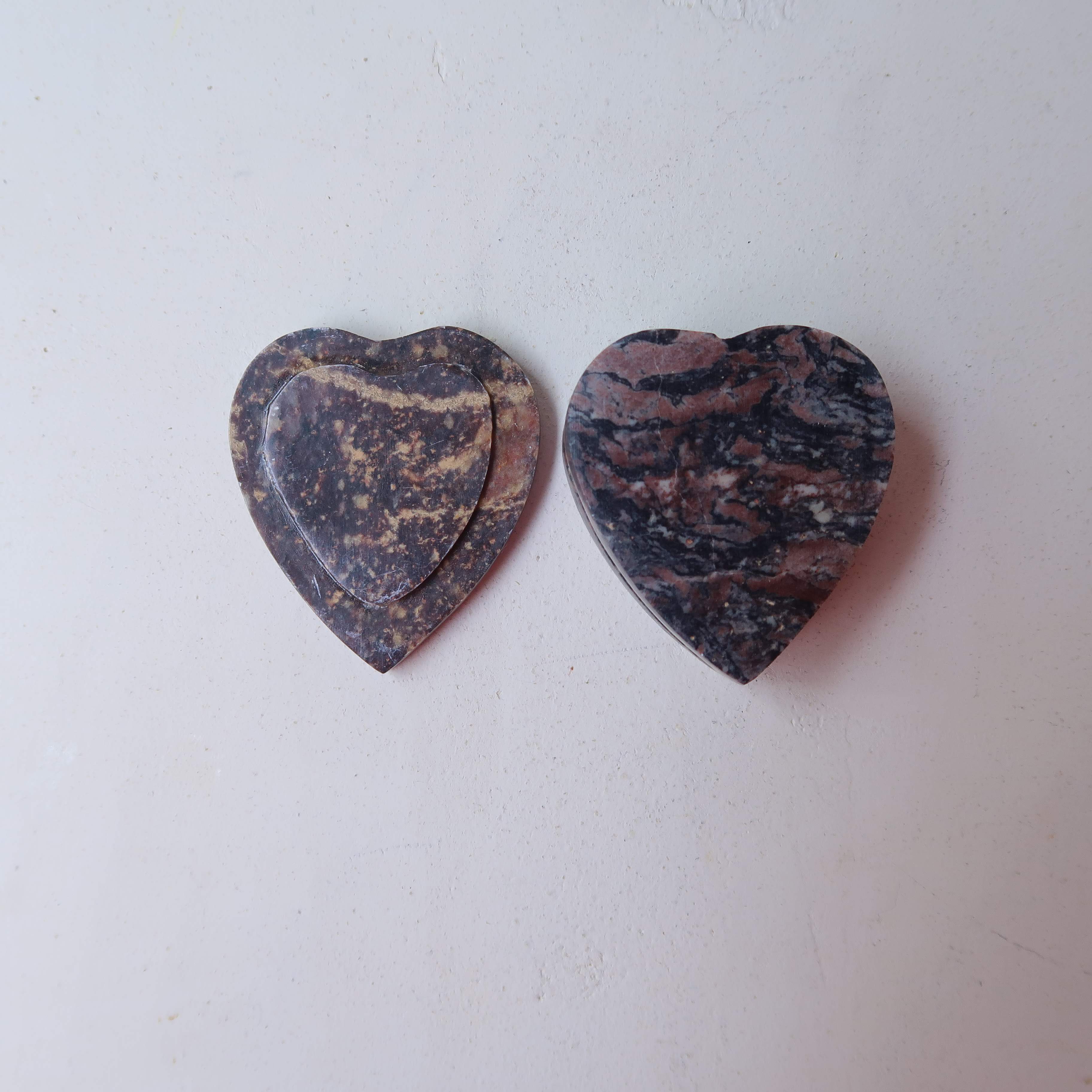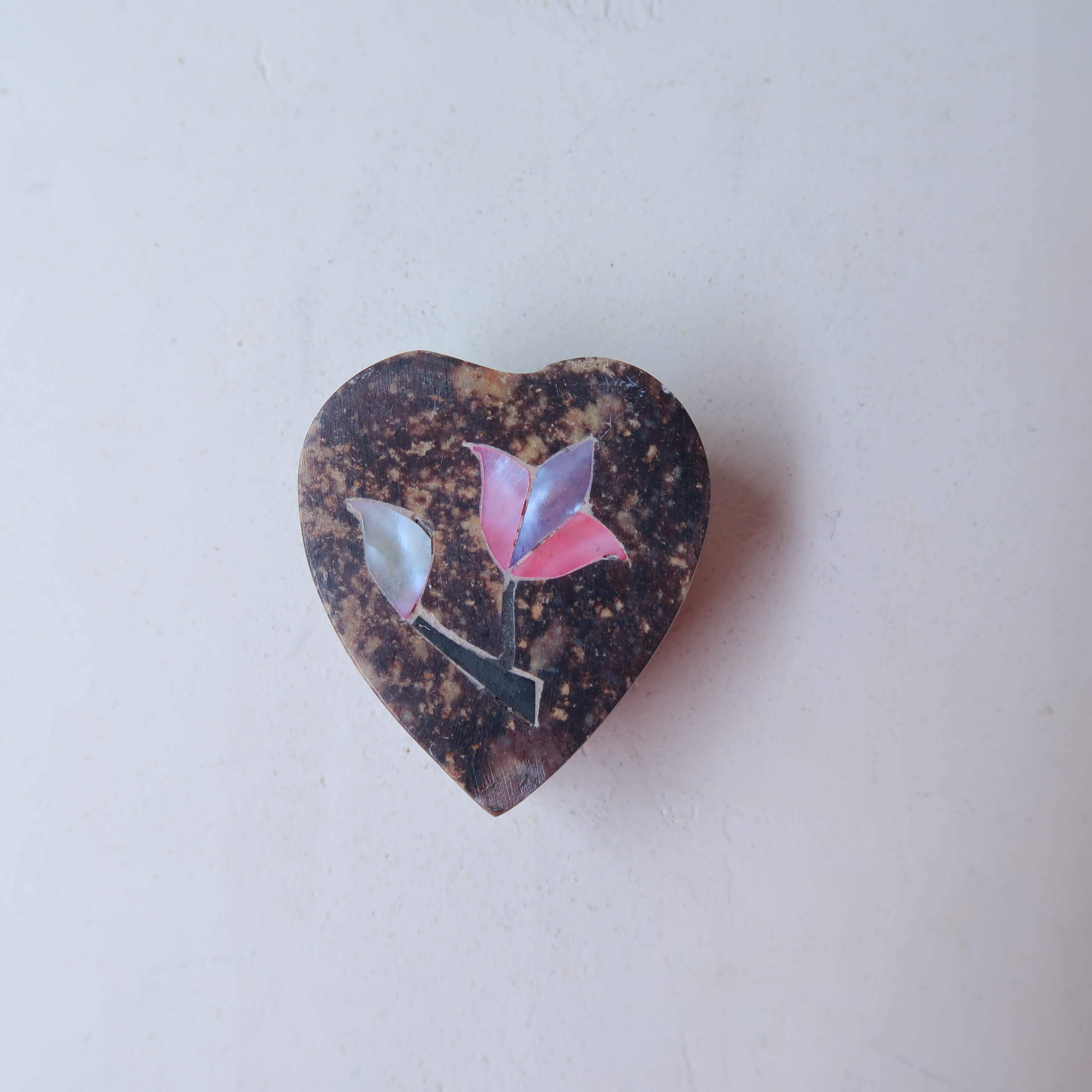 こちらはハートの形。エンブレムのようなフタと、器の側面にくり抜かれたあみあみがかわいい。容器は石、お花は薄くスライスされた貝殻が埋め込まれているインドのアイテムです。