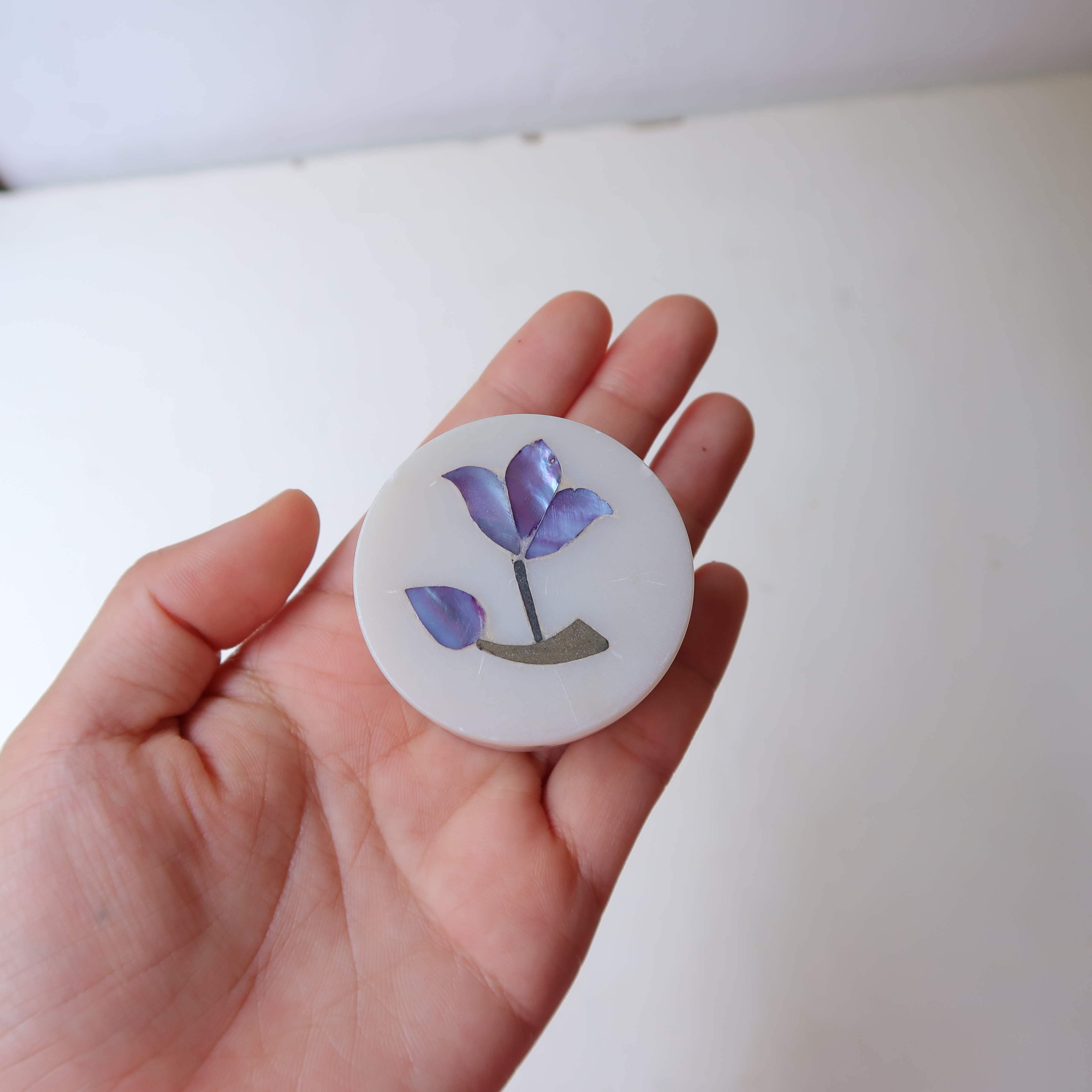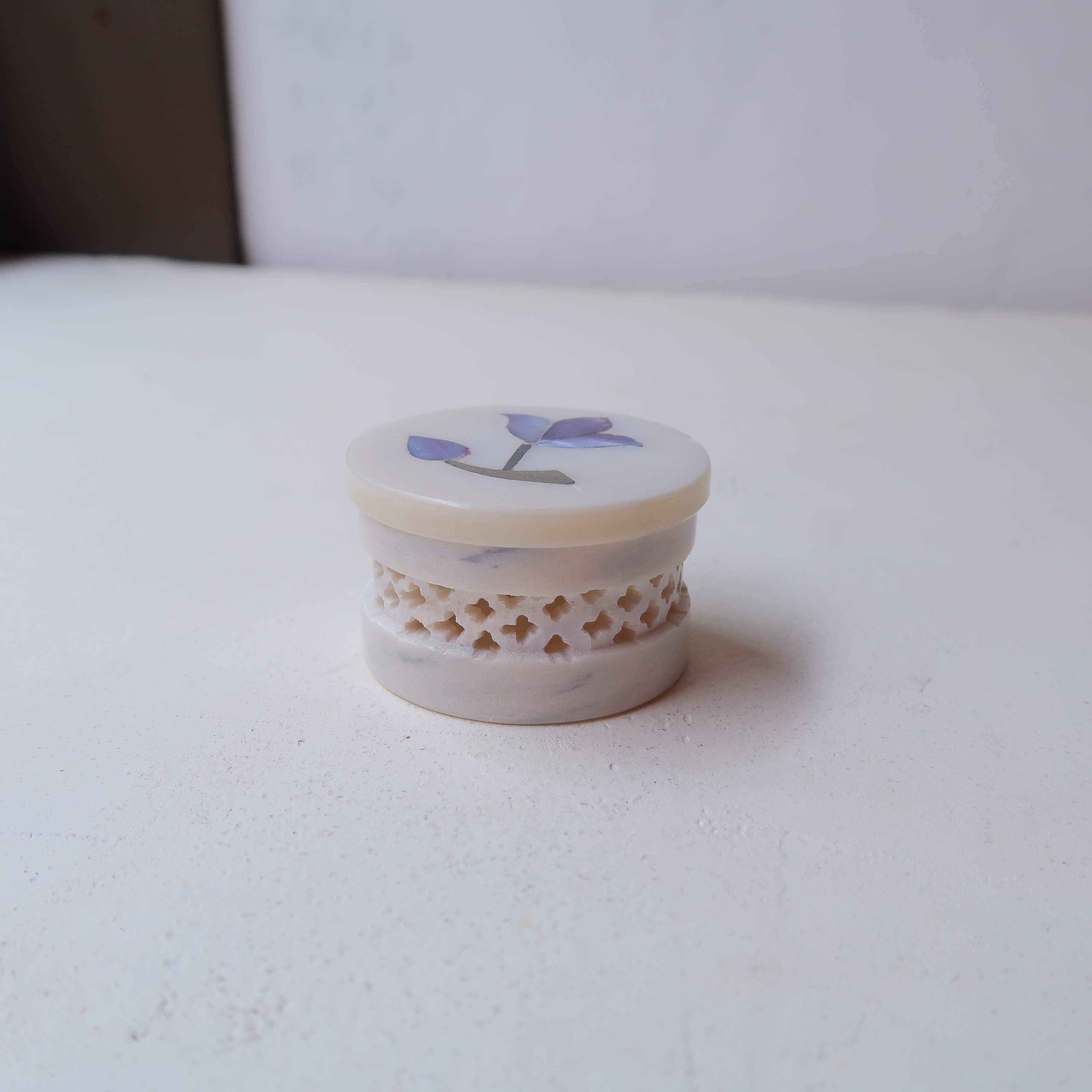 容器は石、お花は薄くスライスされた貝殻が埋め込まれているインドのアイテム。あおいチューリップのようなお花があしらわれたフタと、器の側面にくり抜かれたあみあみがかわいい。