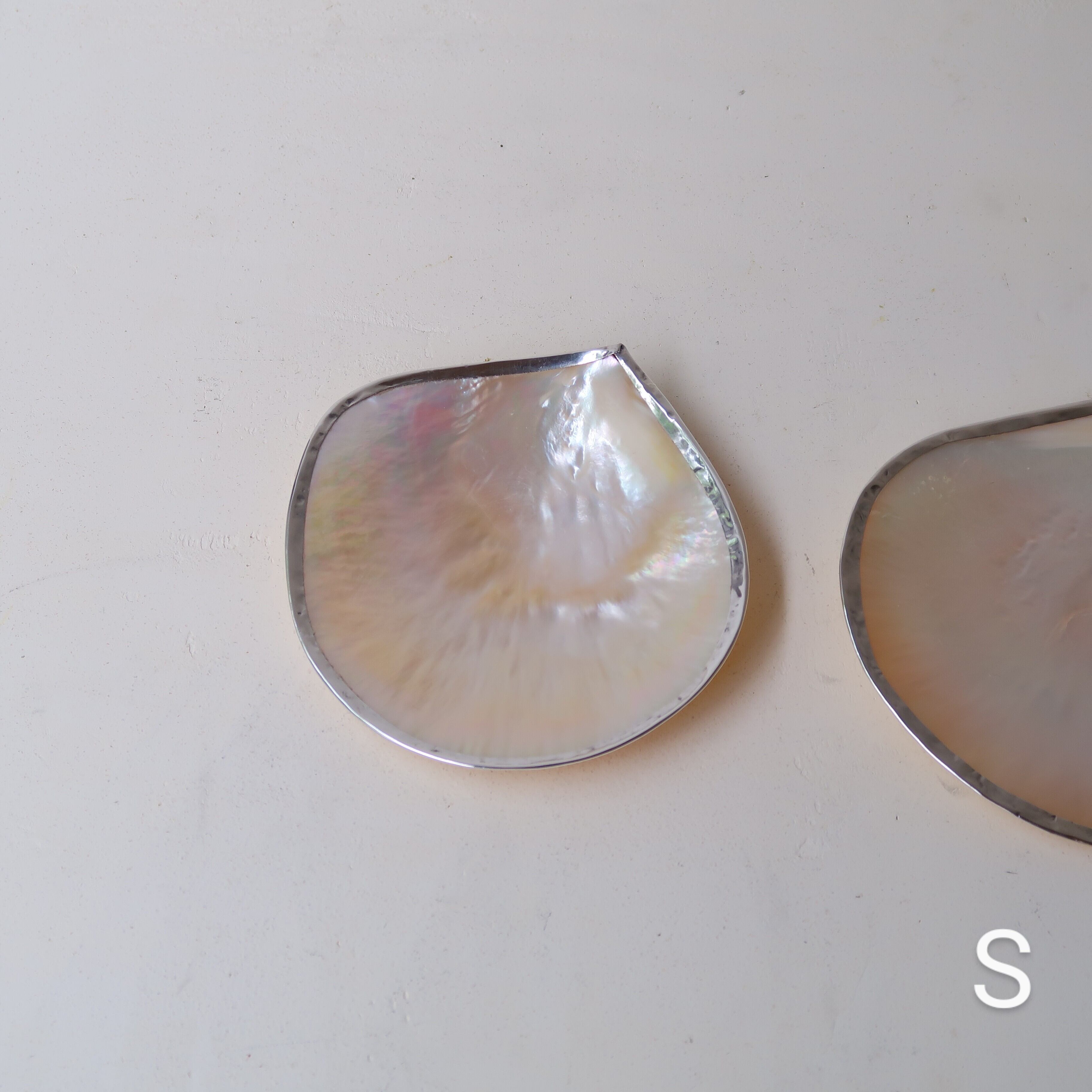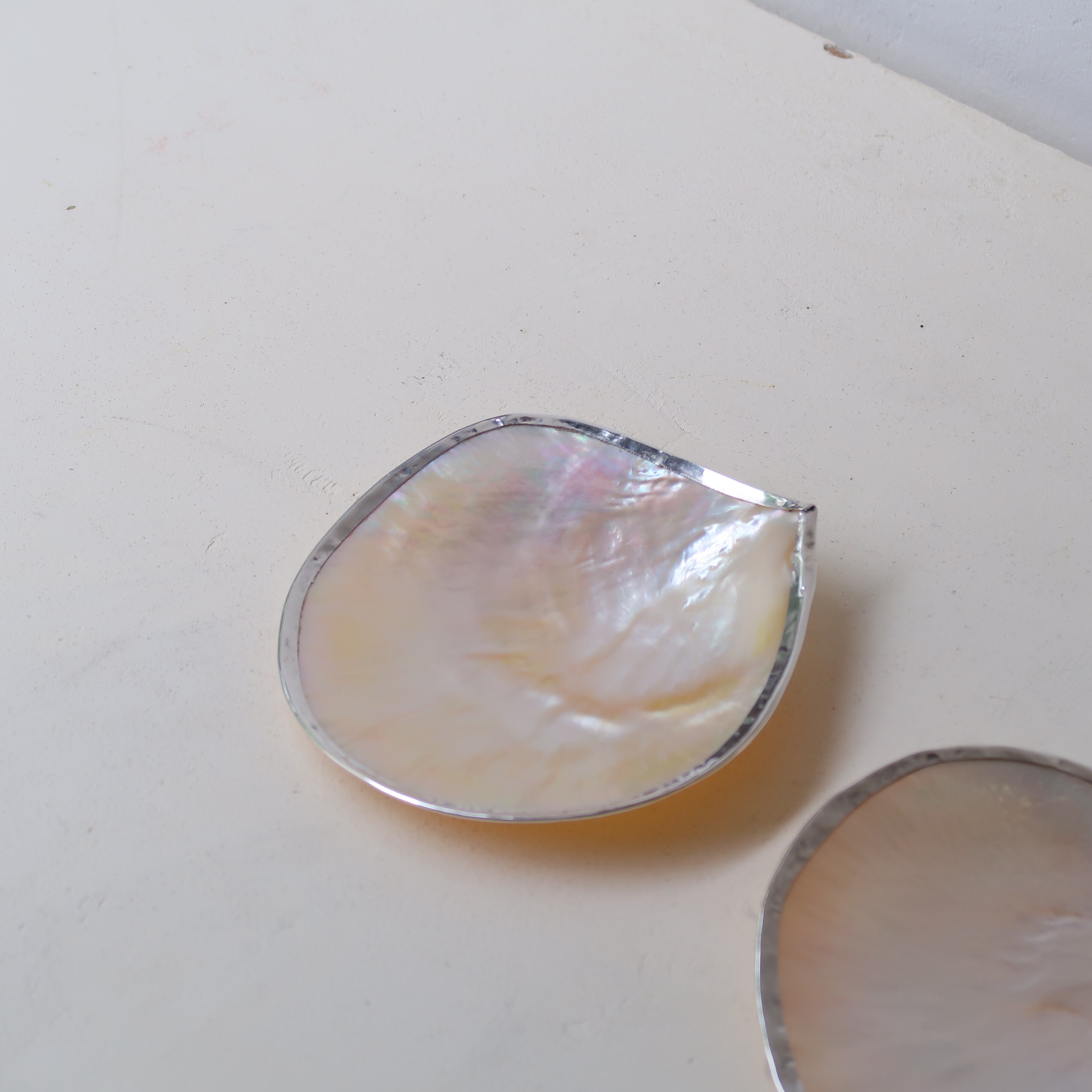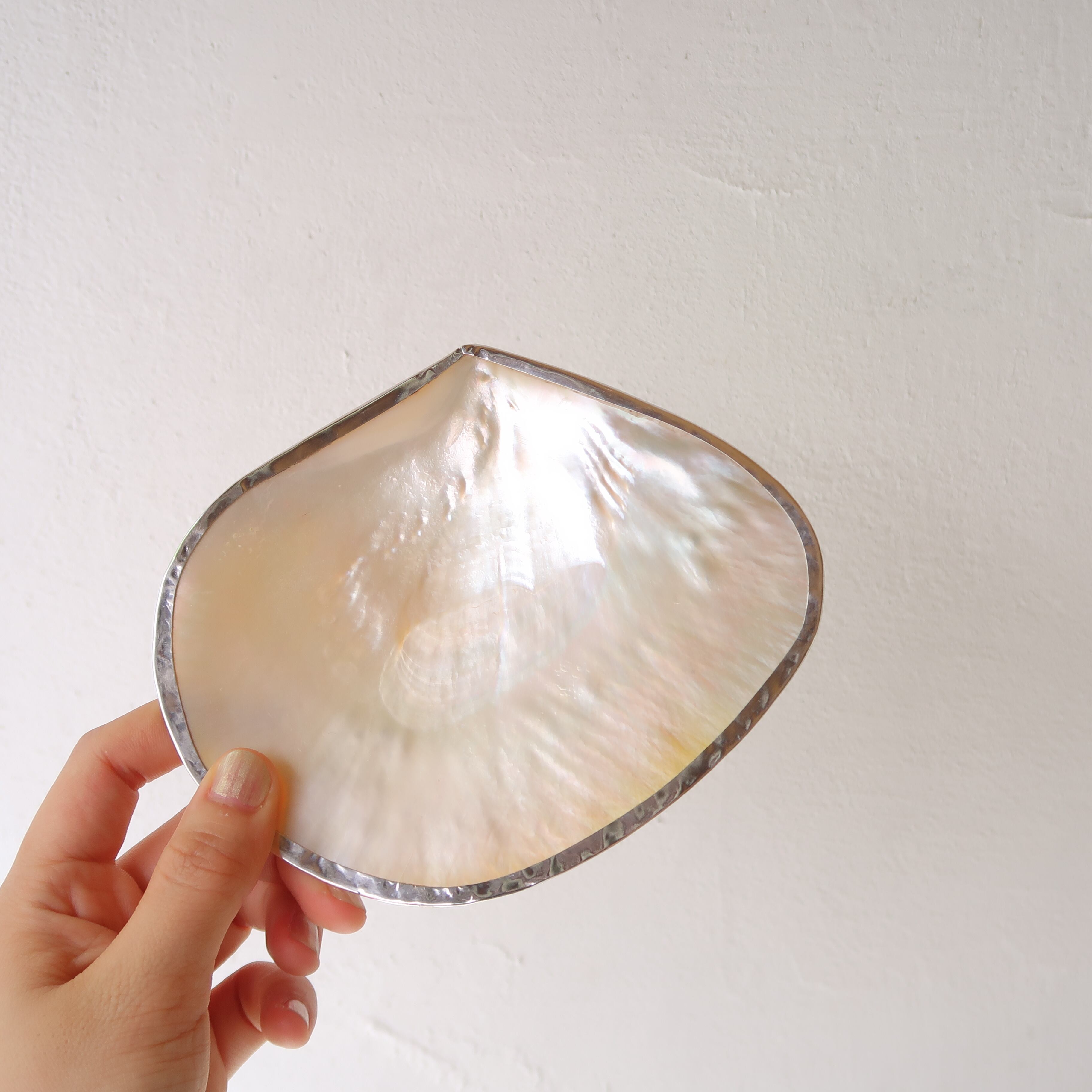 手のひらサイズの貝殻に、シルバーなふちどり。裏を見るとまさに貝殻。見る角度によって、グリーンにも、ピンクにもかがやくオーロラのような光がうつくしい。