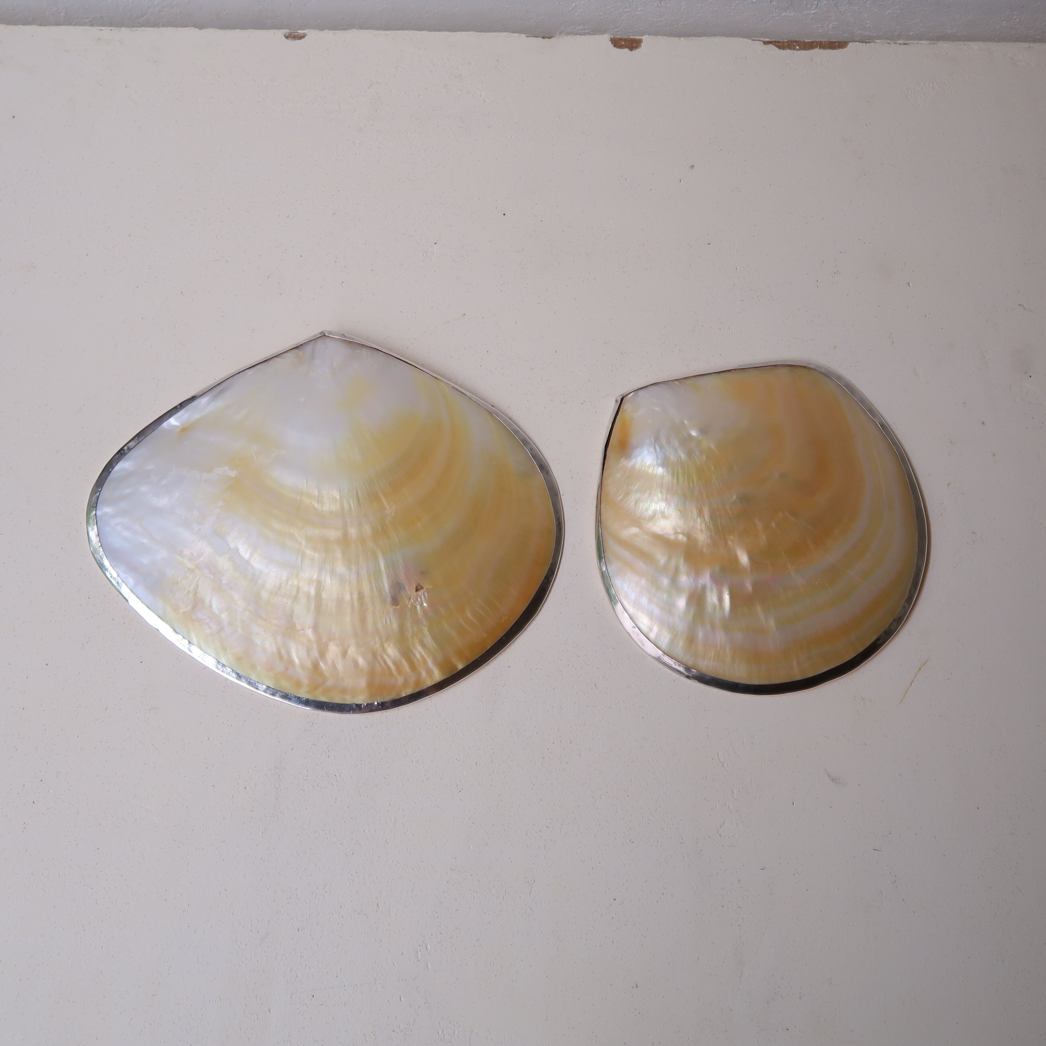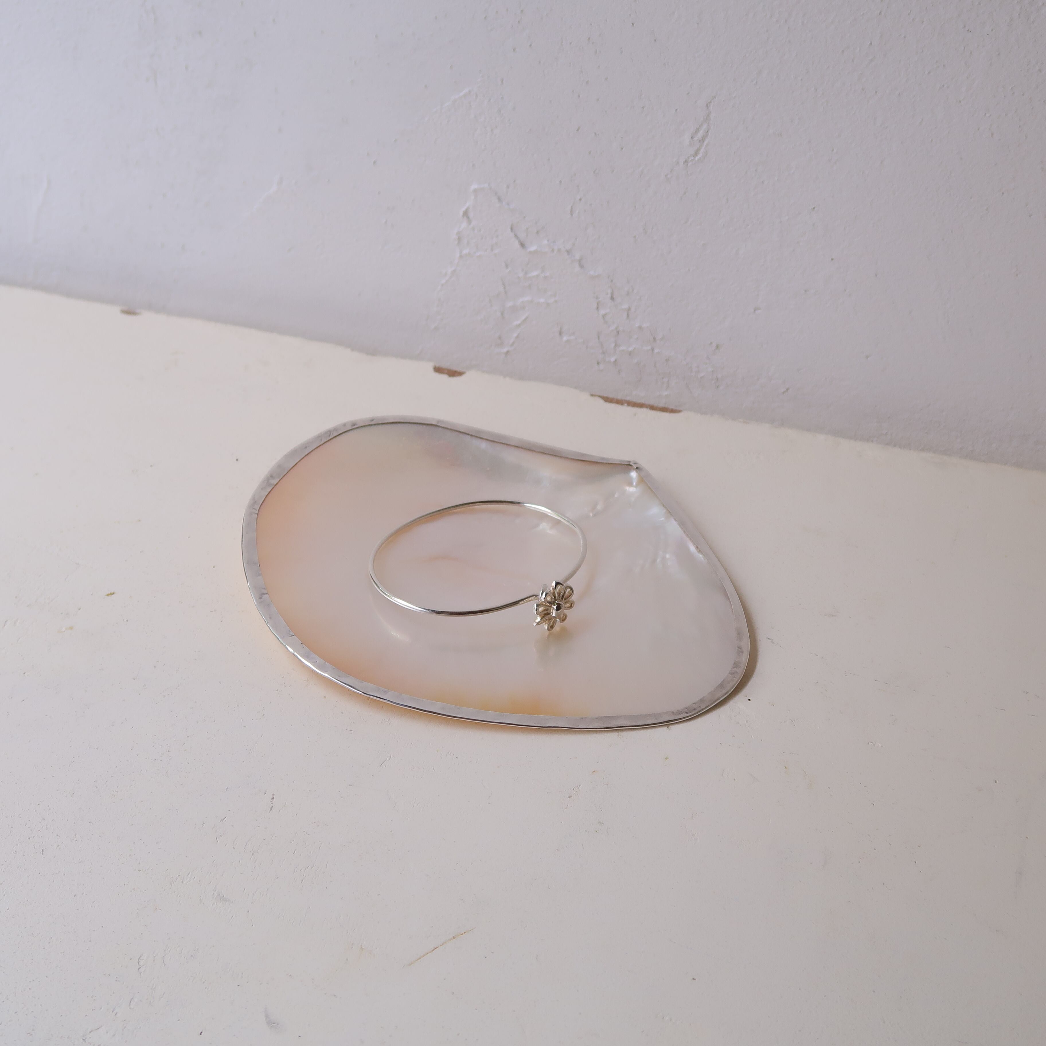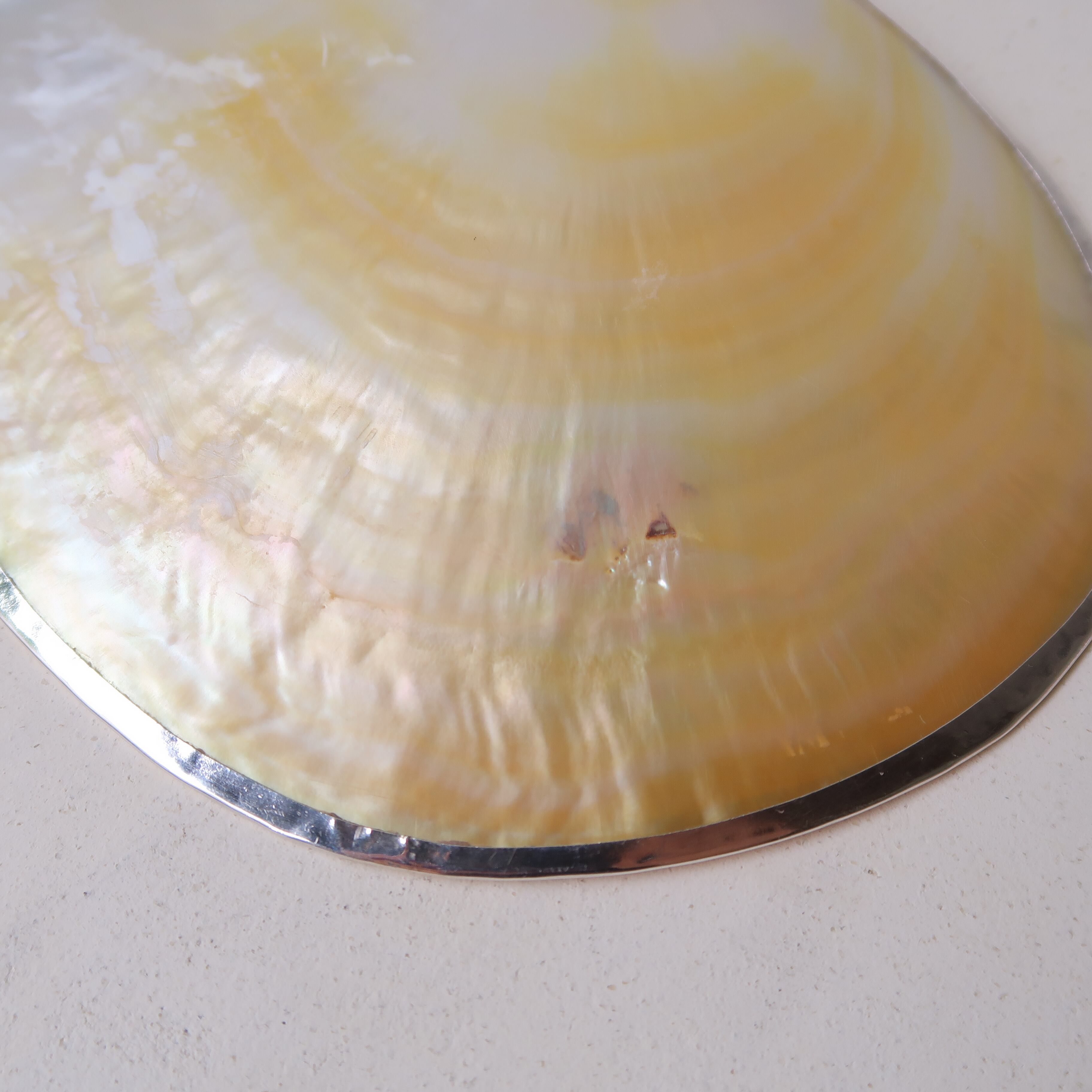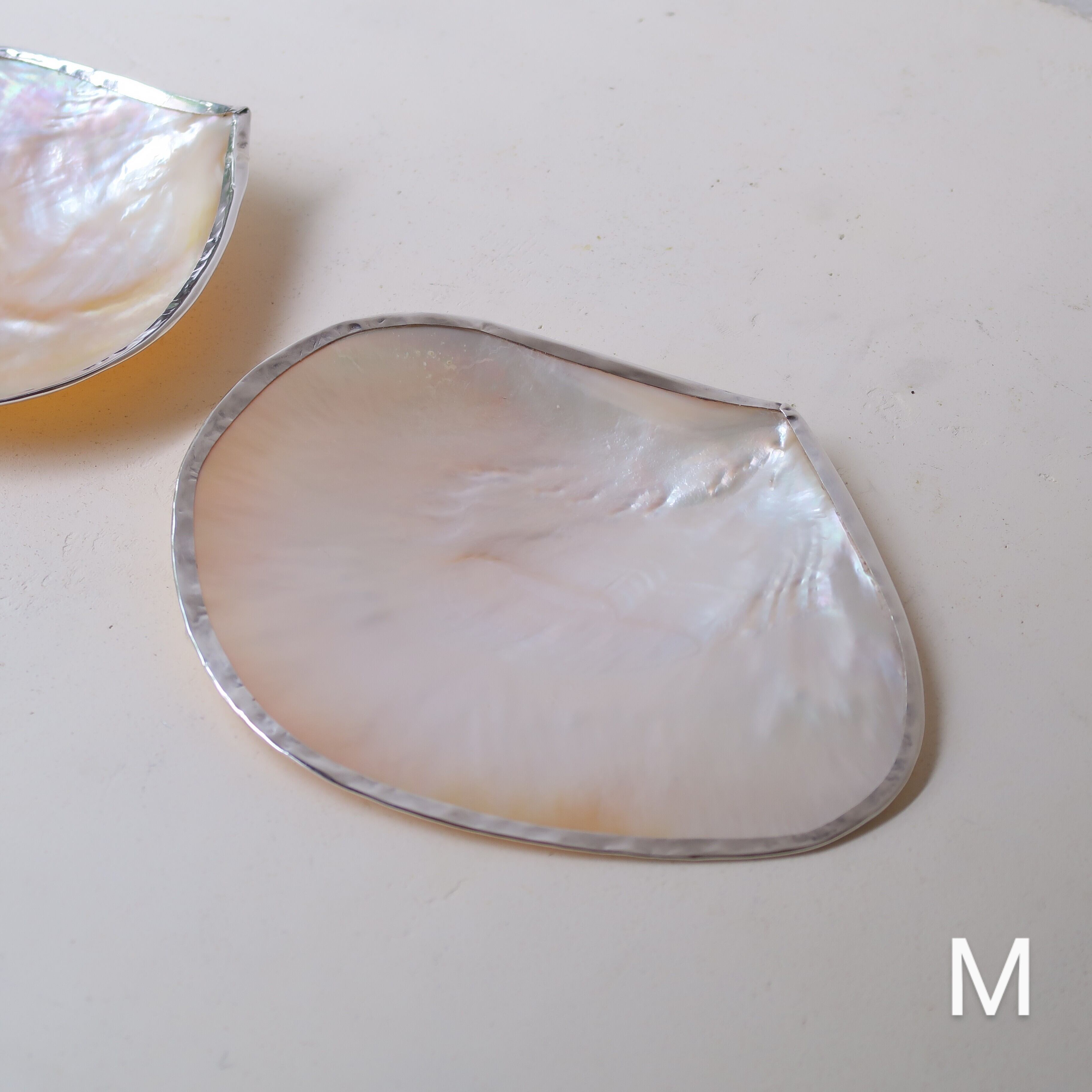 手のひらサイズの貝殻に、シルバーなふちどり。裏を見るとまさに貝殻。見る角度によって、グリーンにも、ピンクにもかがやくオーロラのような光がうつくしい。