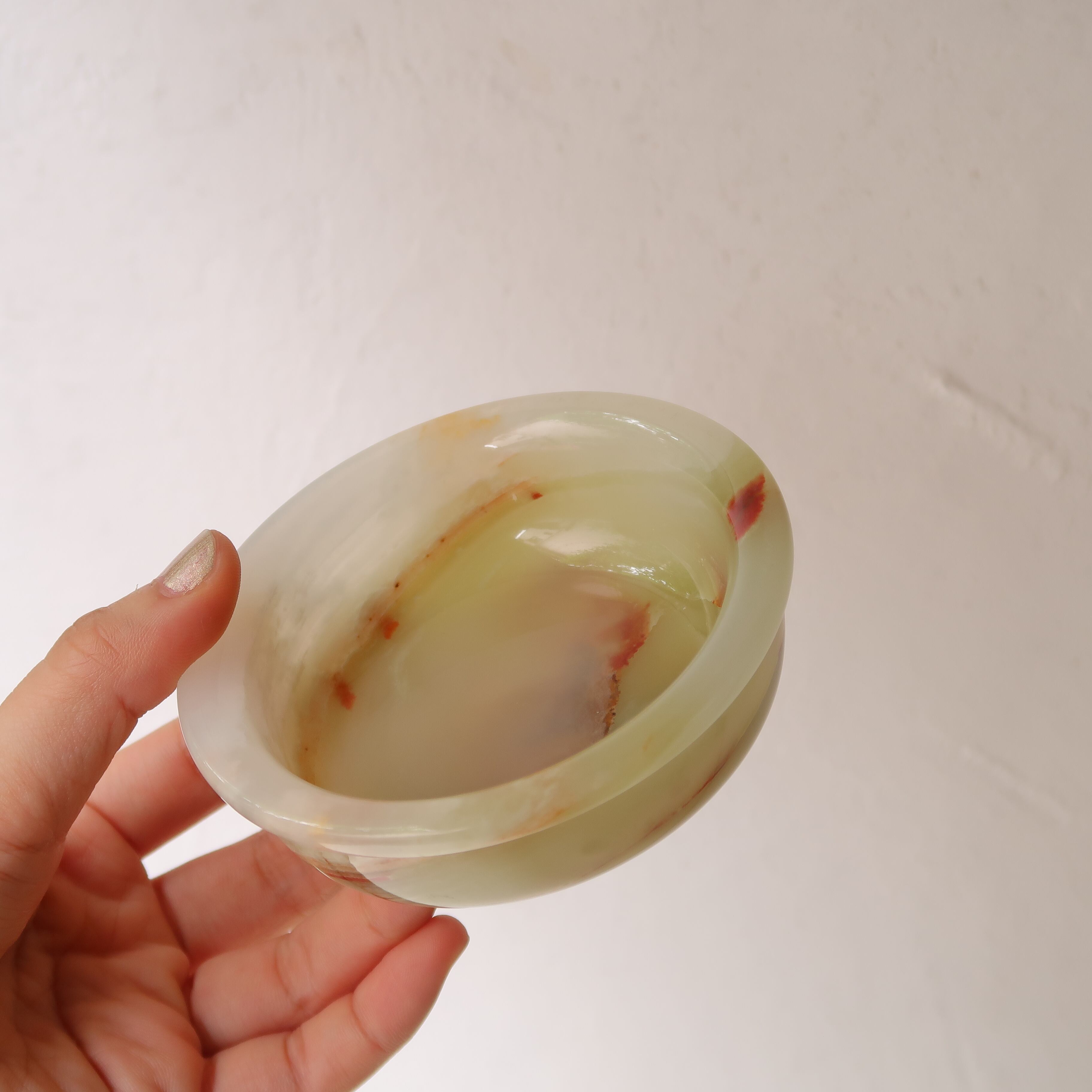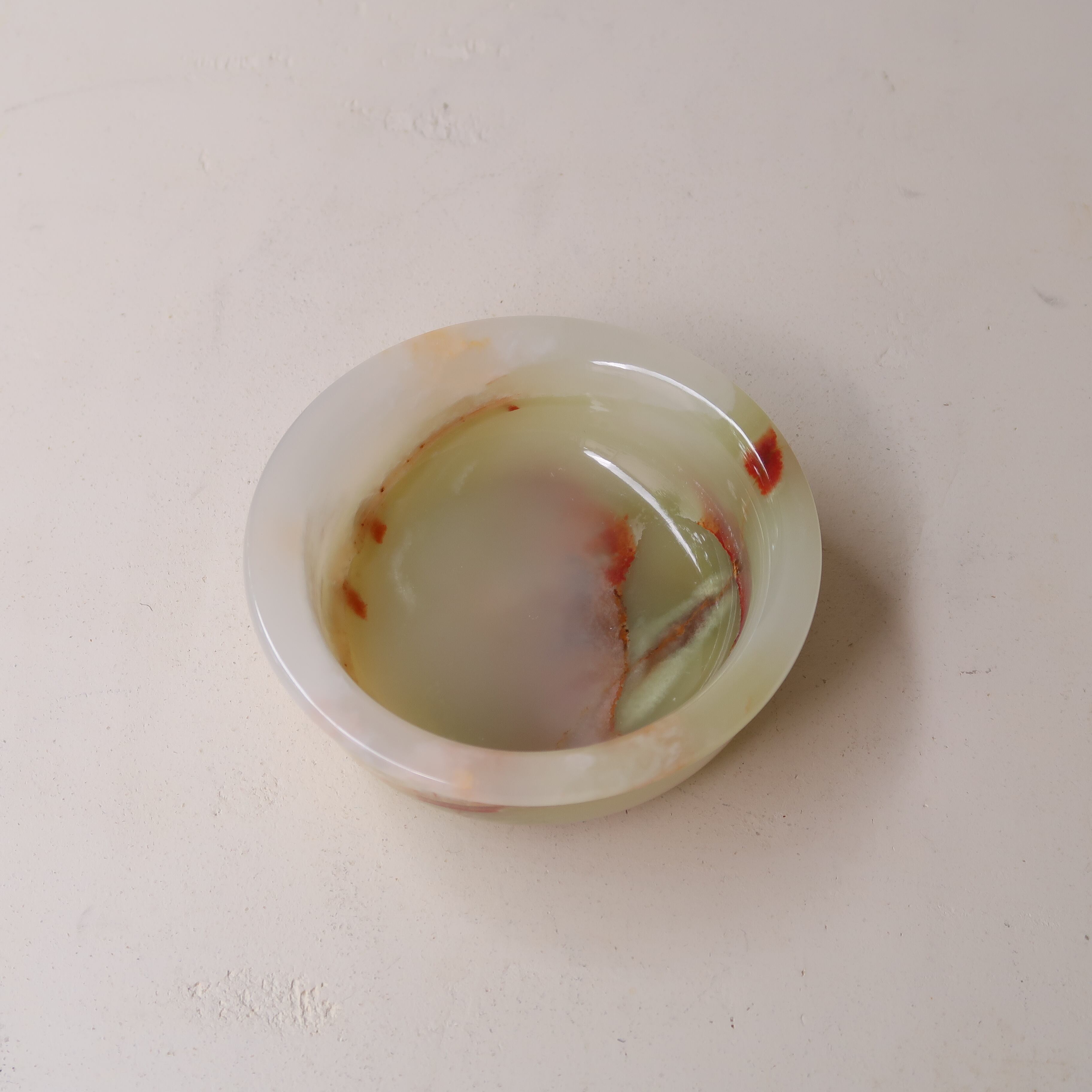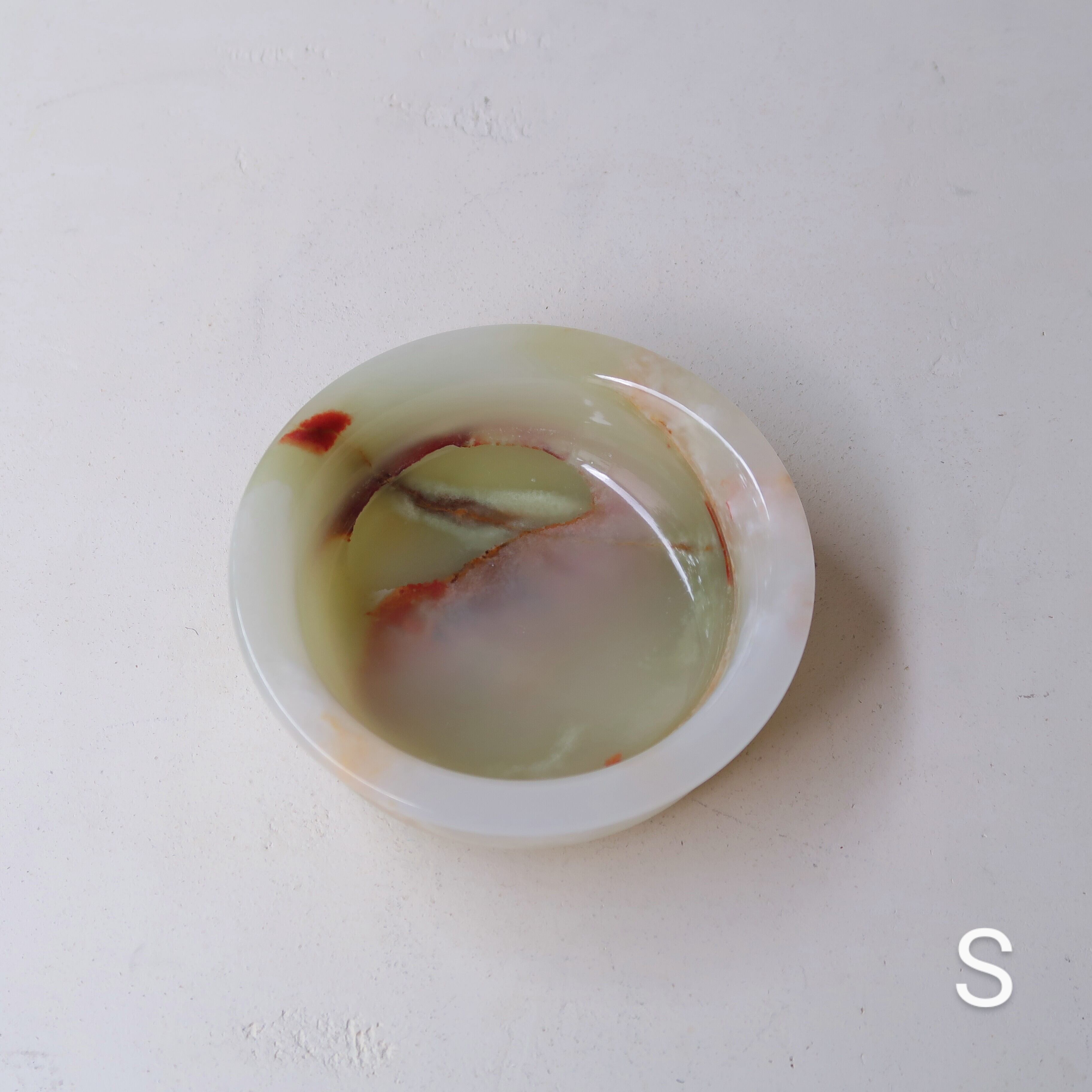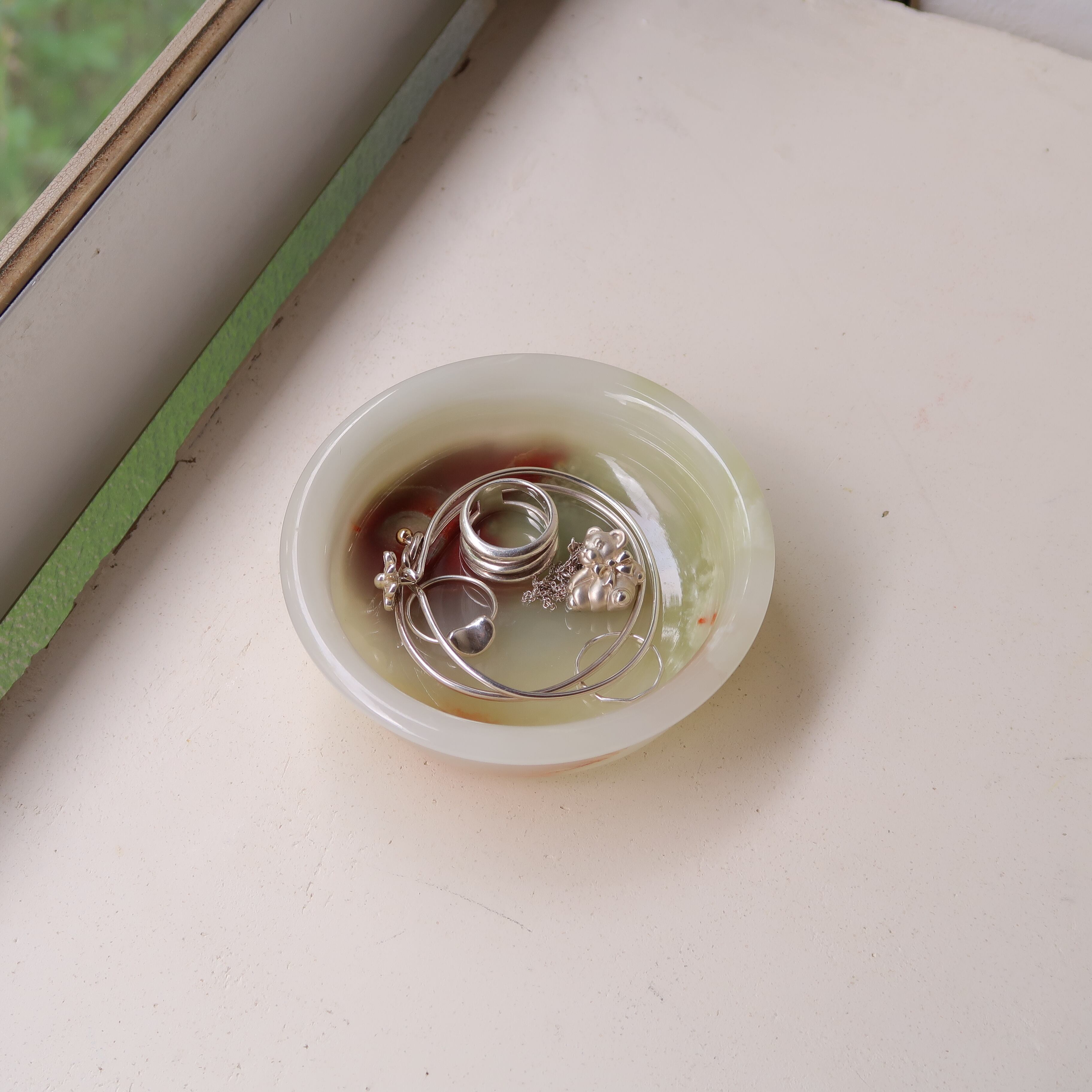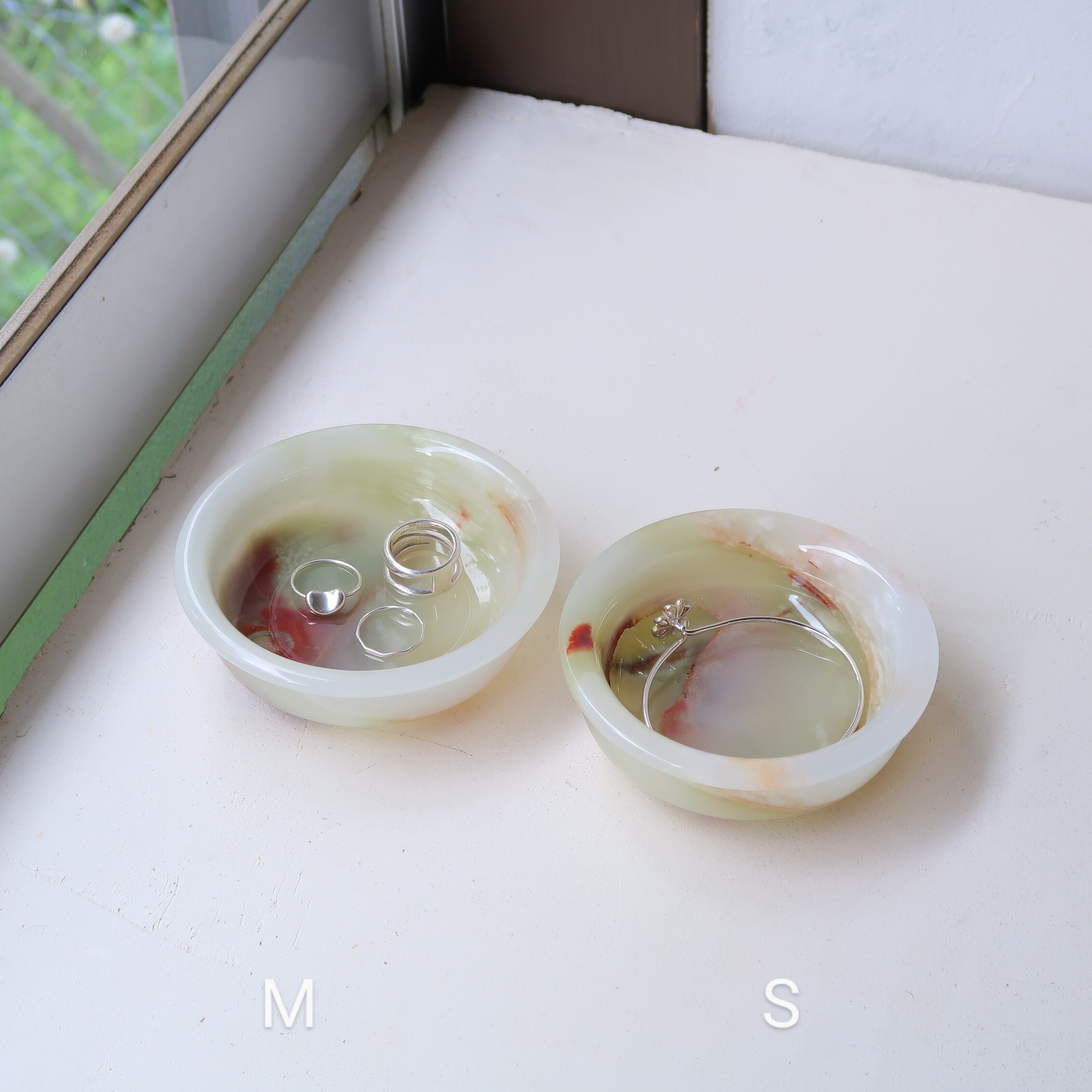 手のひらサイズのまるいジュエリートレイ。お皿のようなフォルムなので、飾りやすく、取り出しやすくな、いいかたち。
