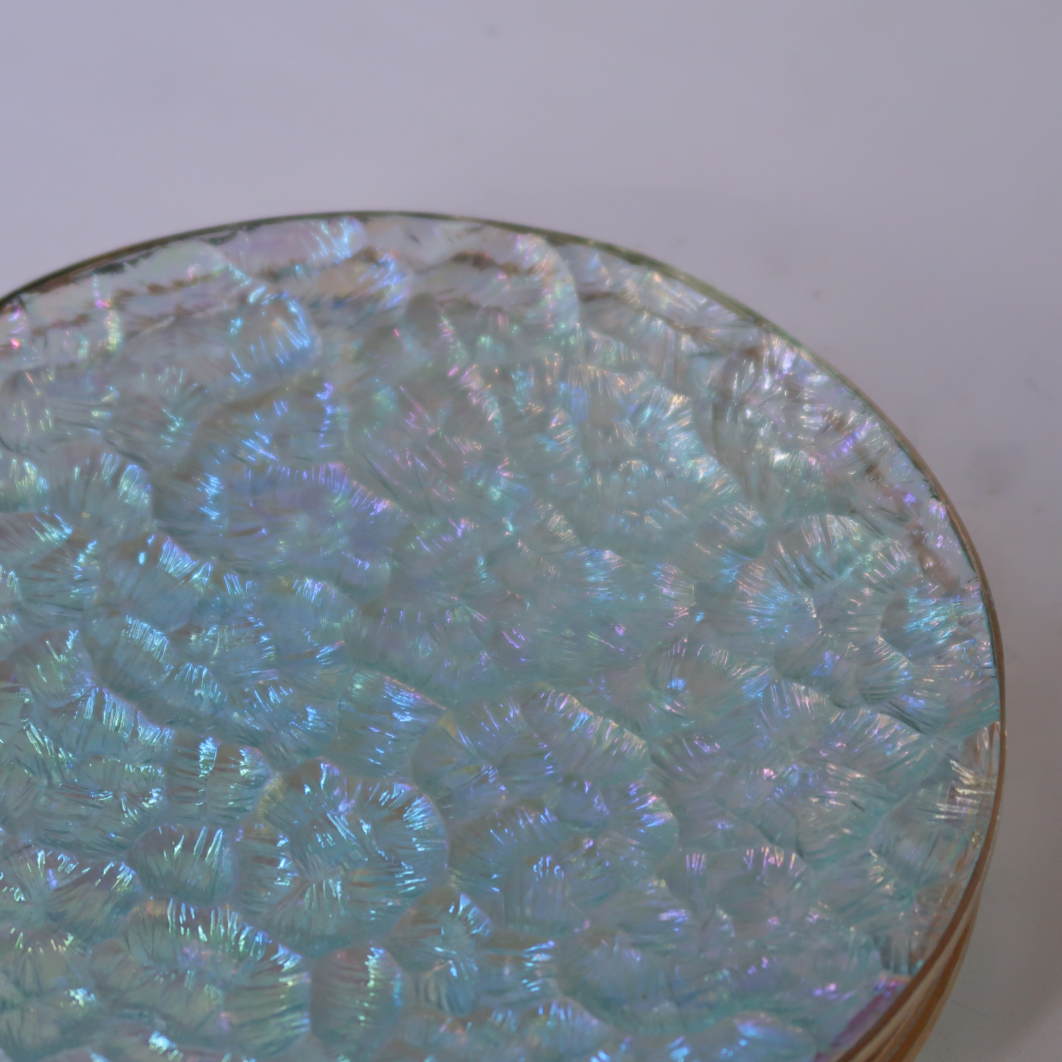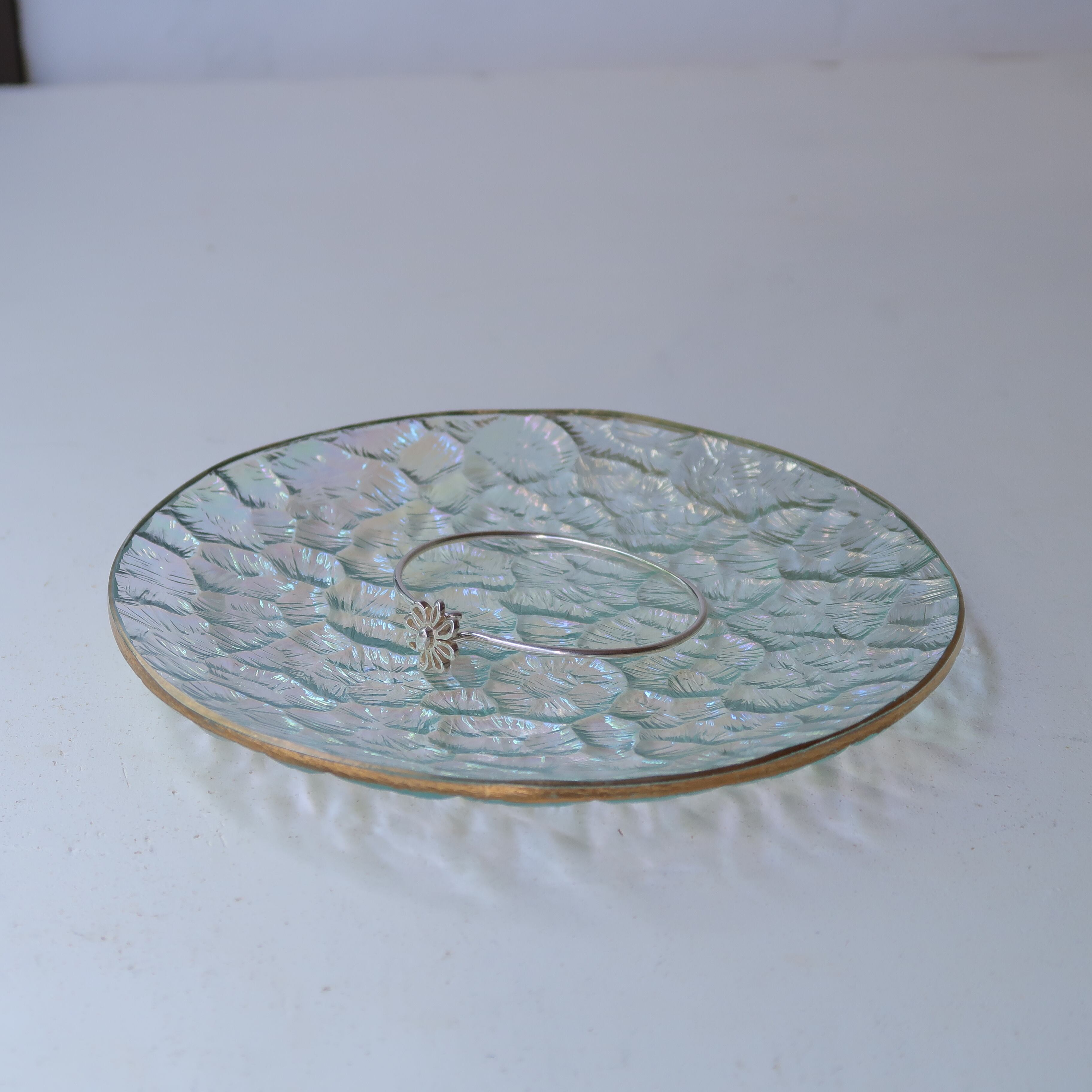 湖の表面が凍っているかのような、ぴきぴきとした凹凸のあるガラスのうつわ。左右にゆらゆらとすると、オーロラのように輝くのも美しい。全体的にちょっぴりブルーがかっていて、重ねると水のような色合いが浮かび上がってくるんです。SUISUIっぽいな〜。