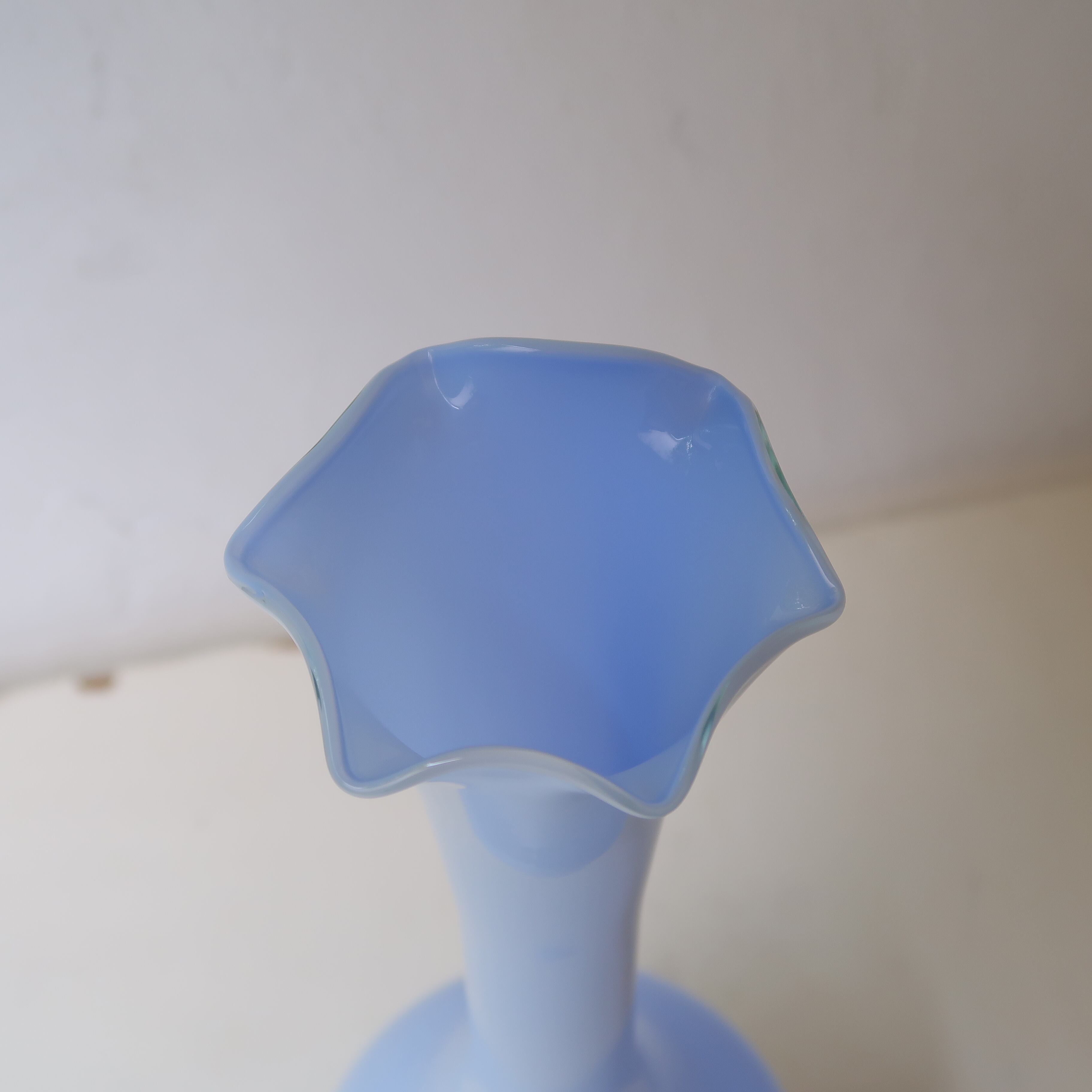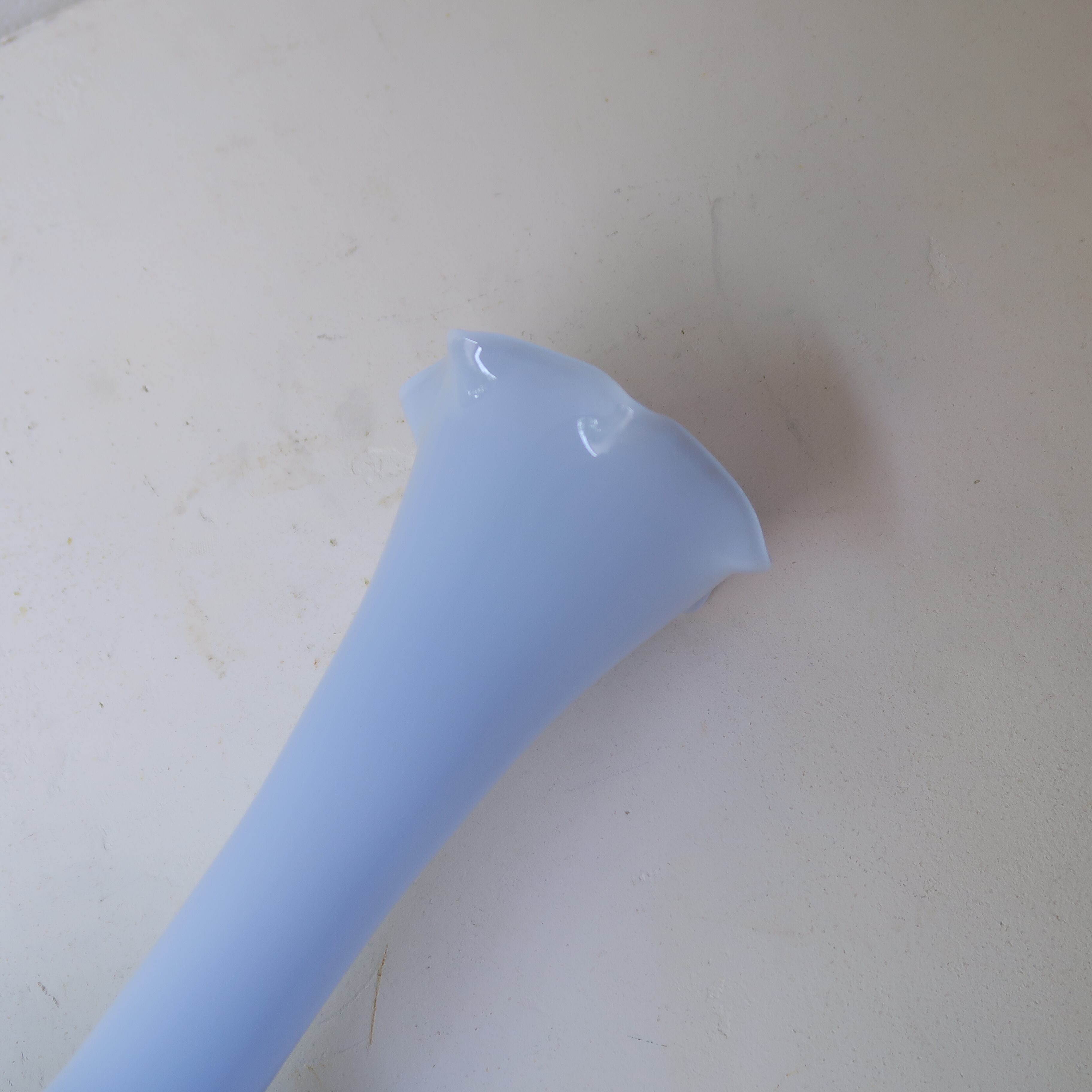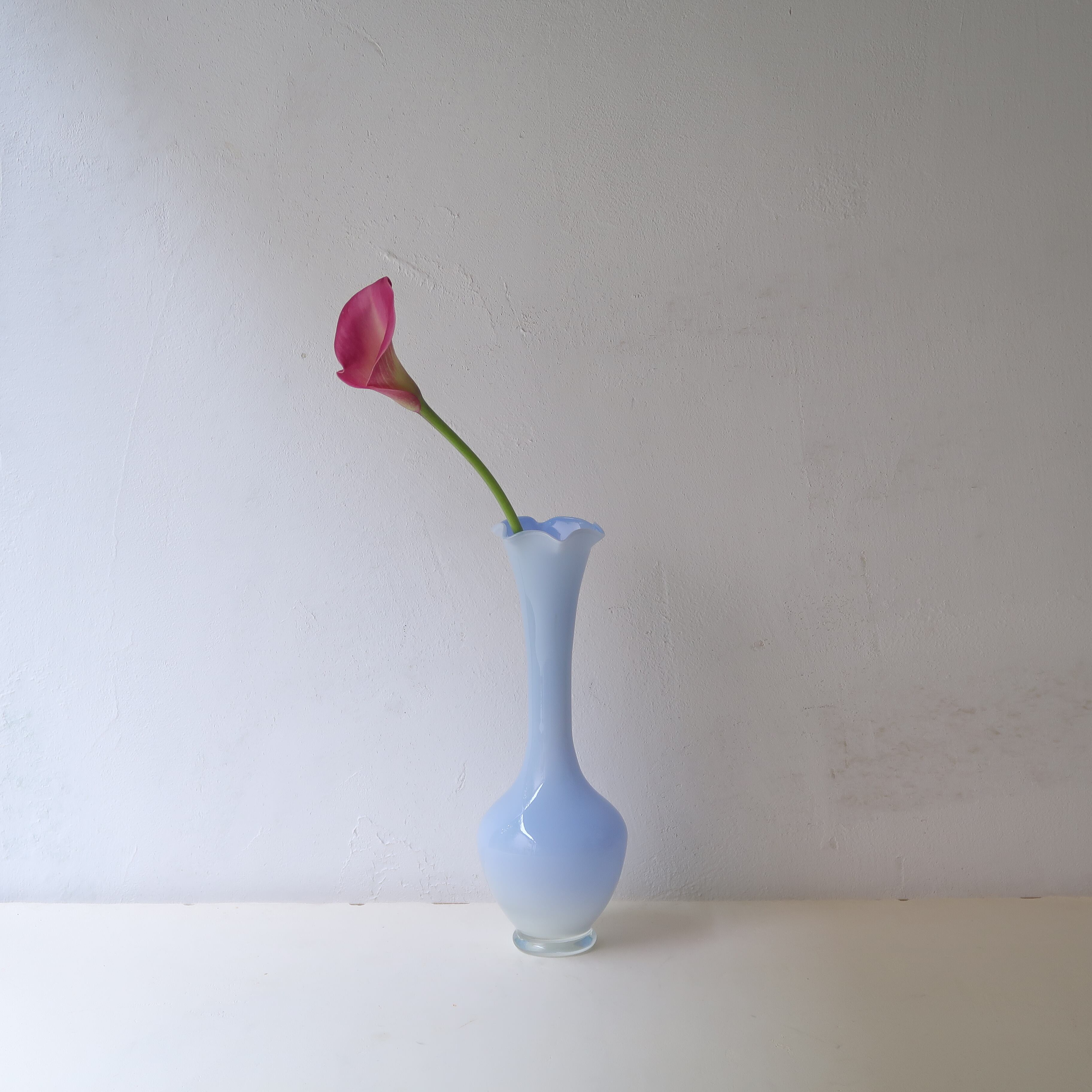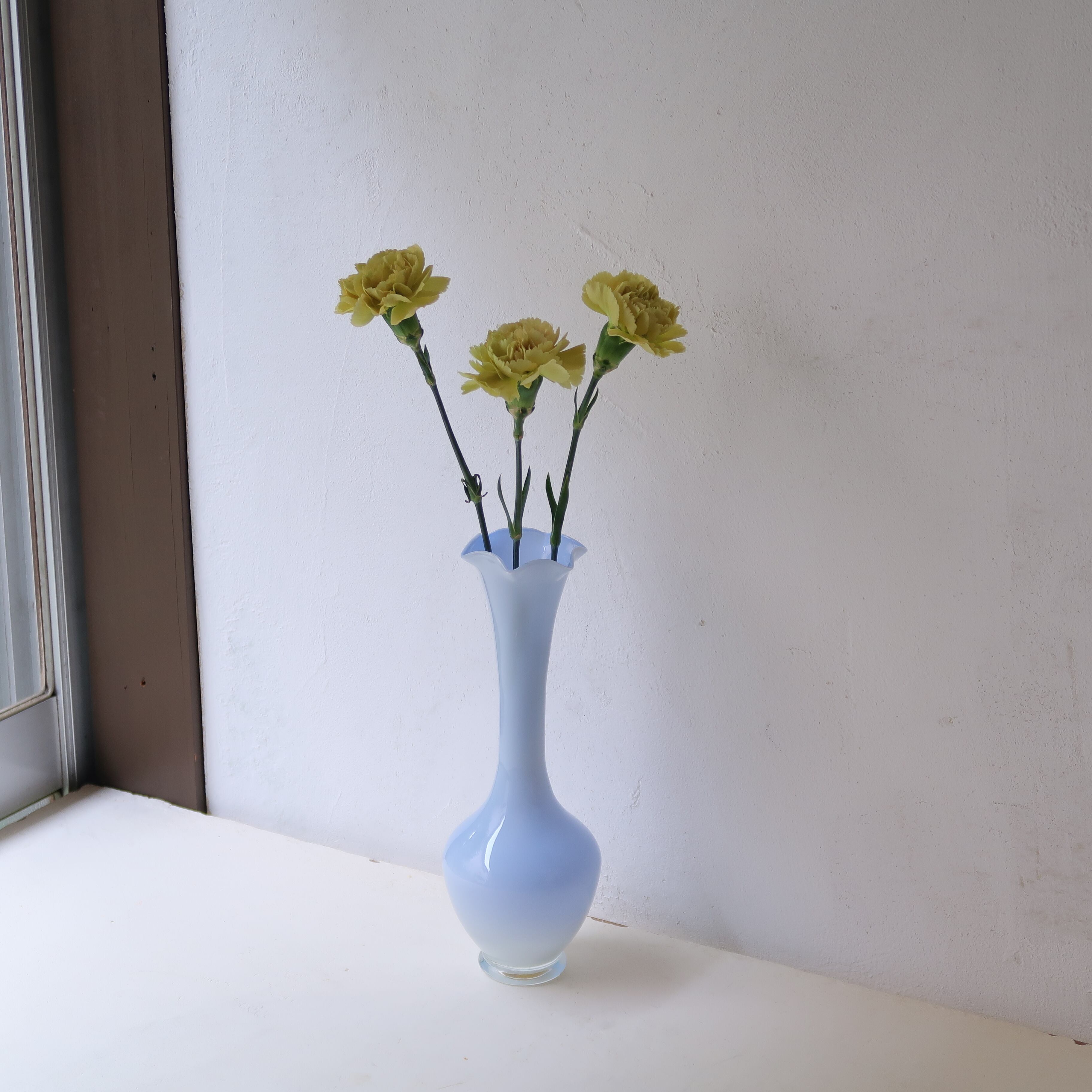 内側はほんのりブルー、外側はホワイト、底はとうめいのガラス。下のほうはぷっくりと、口はひらひらとしていて、繊細で愛らしいフォルムの花瓶。