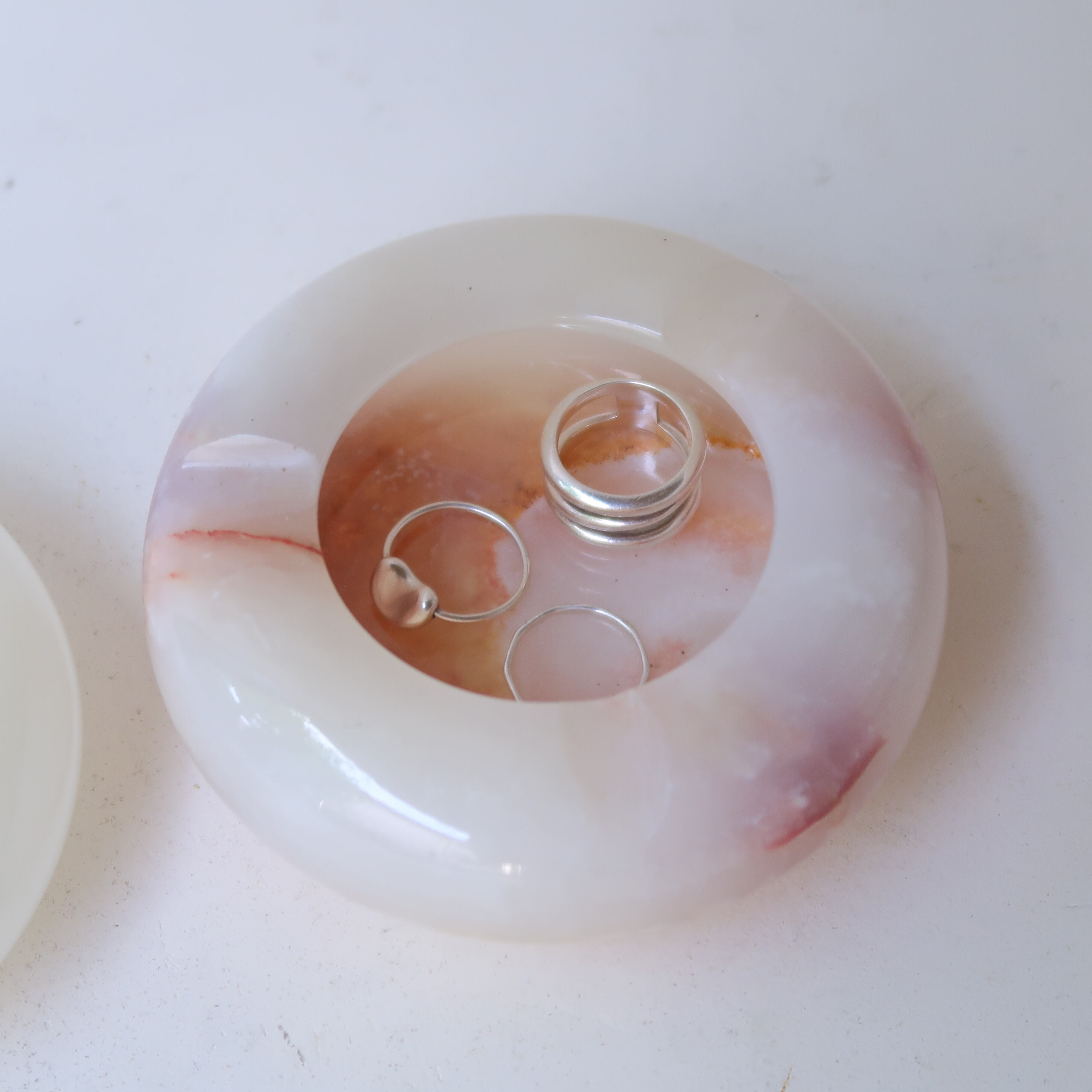 手のひらサイズのまるいジュエリートレイ。口がすぼまるフォルムで、意外とたくさん入ります。