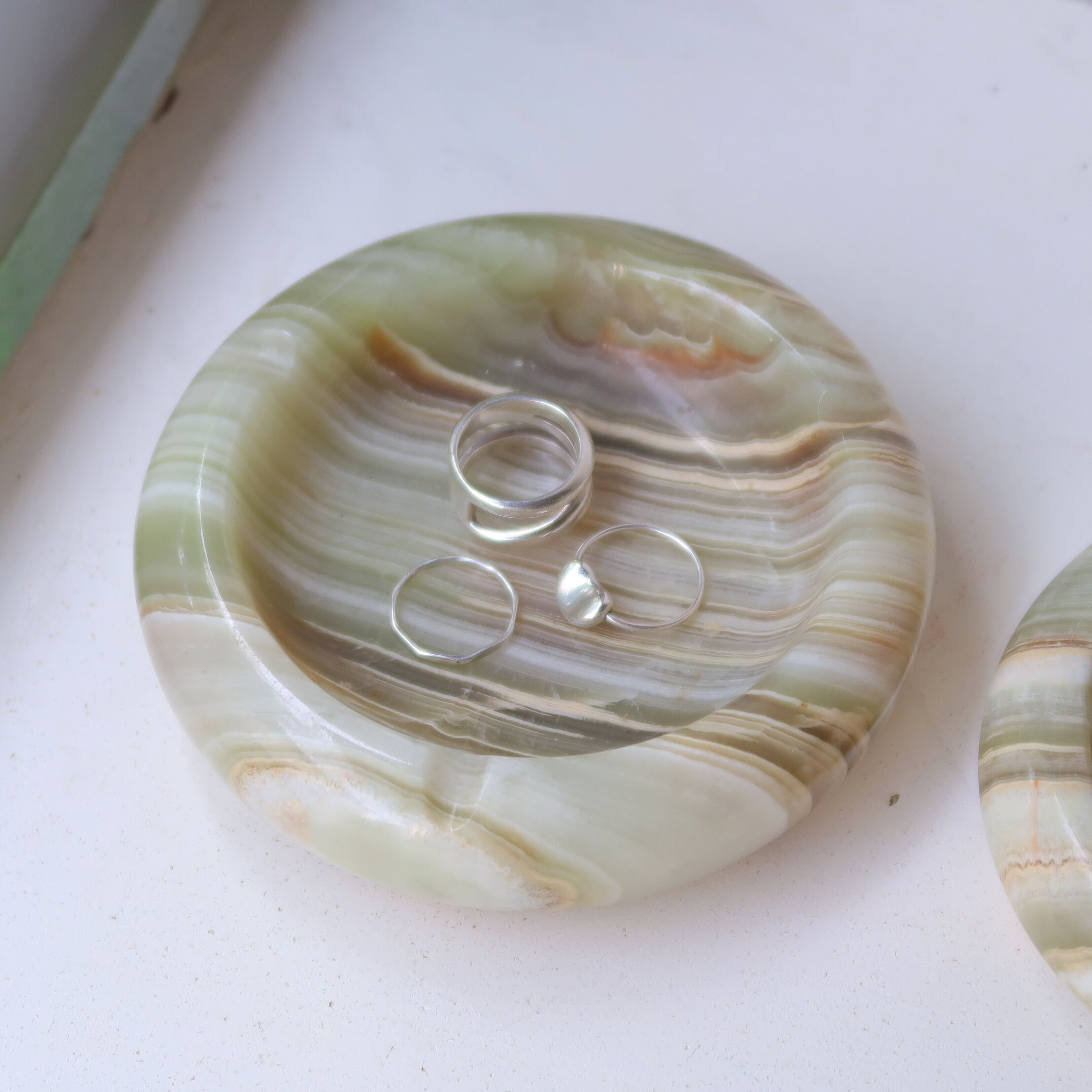 手のひらサイズのまるいジュエリートレイ。お皿のようなフォルムで、取りやすく使いやすいかたち。