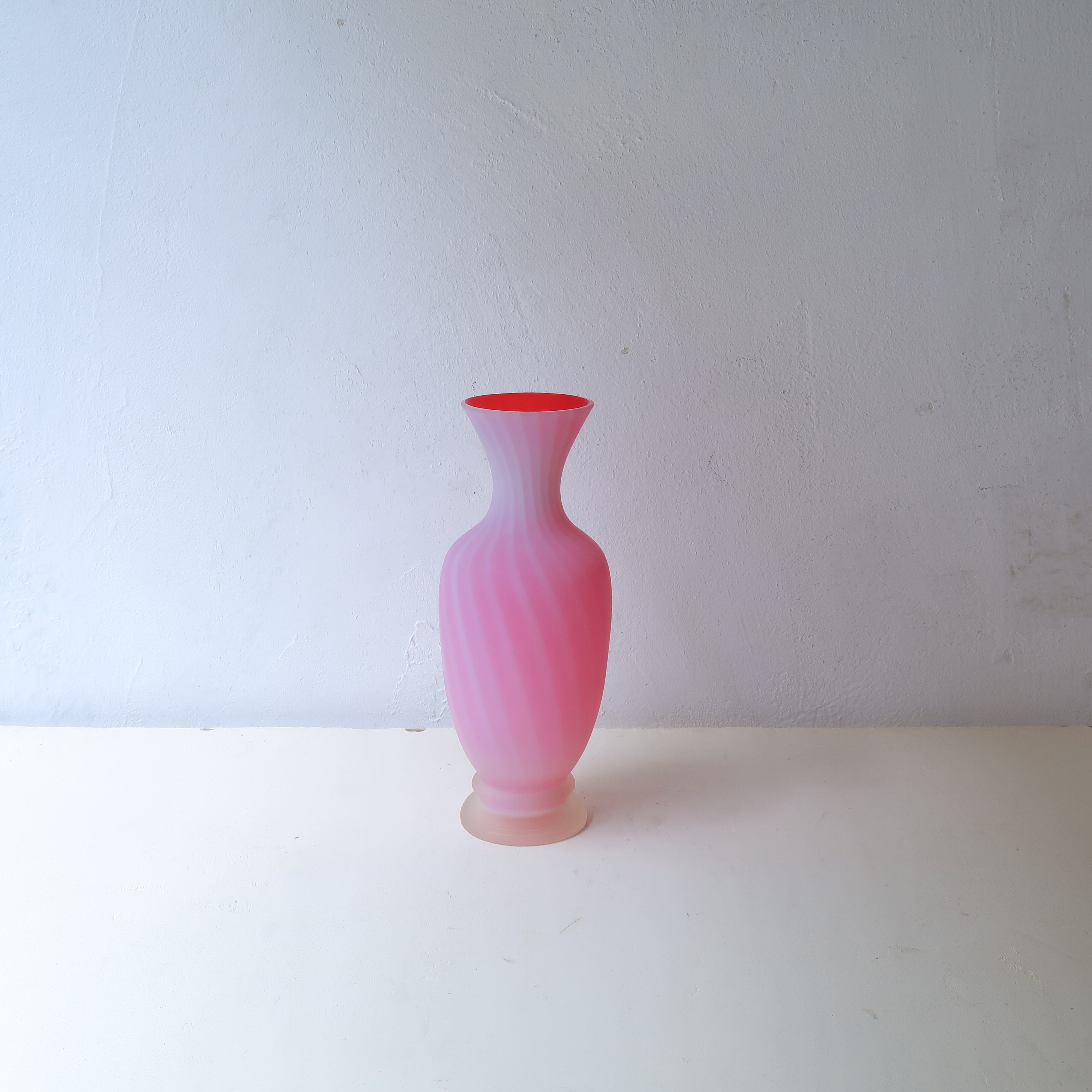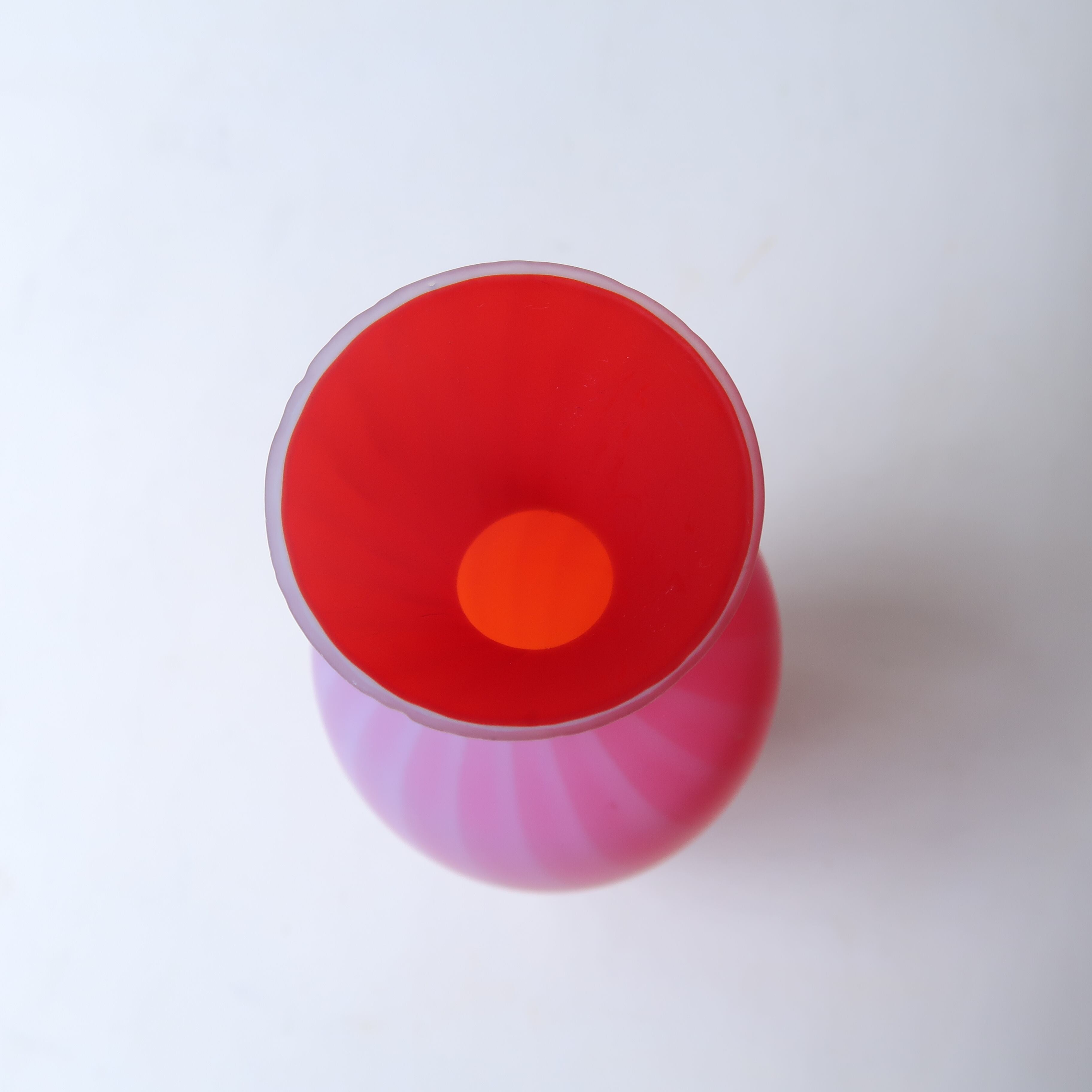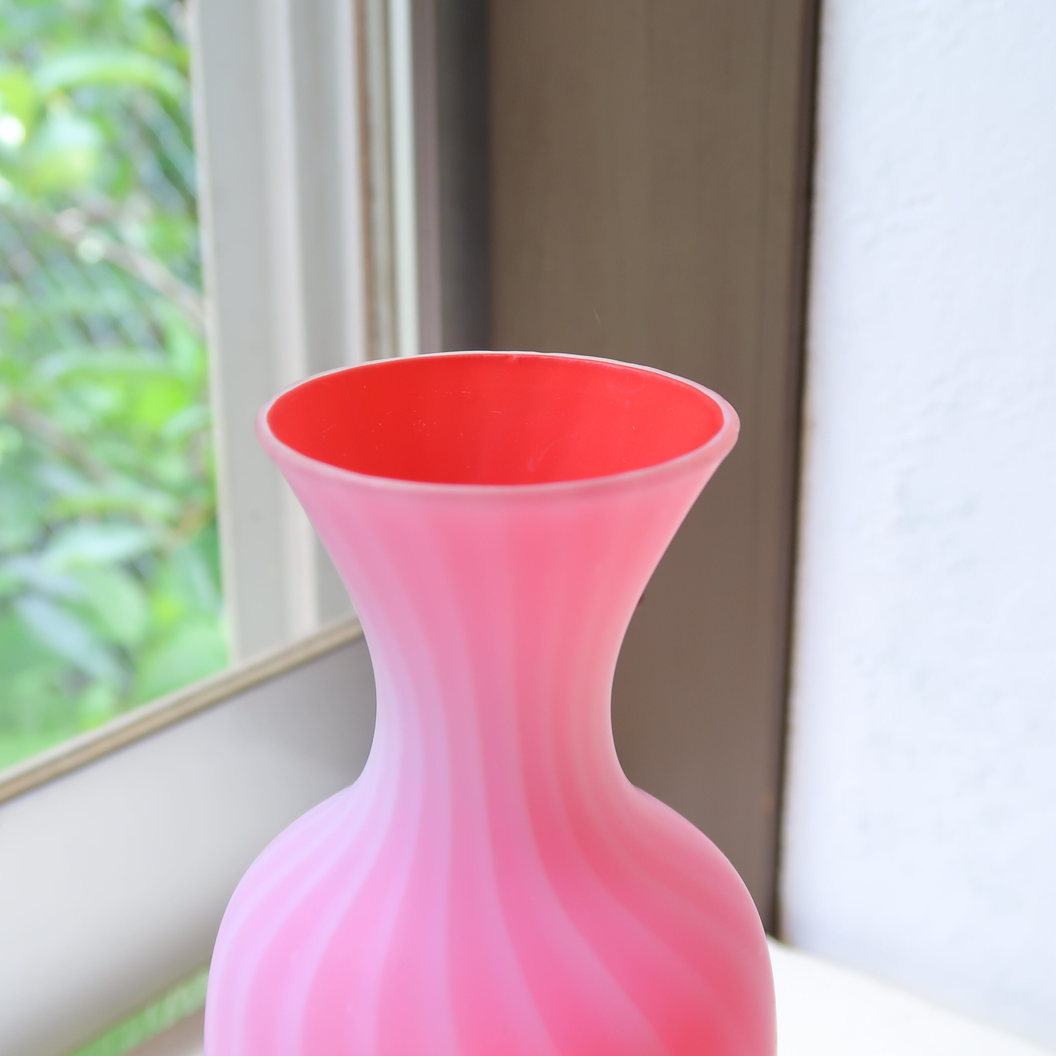 内側が赤、外側が白。白いストライプに真っ赤が透けてピンクに見える、まるでいちごと練乳のような関係の花瓶です。