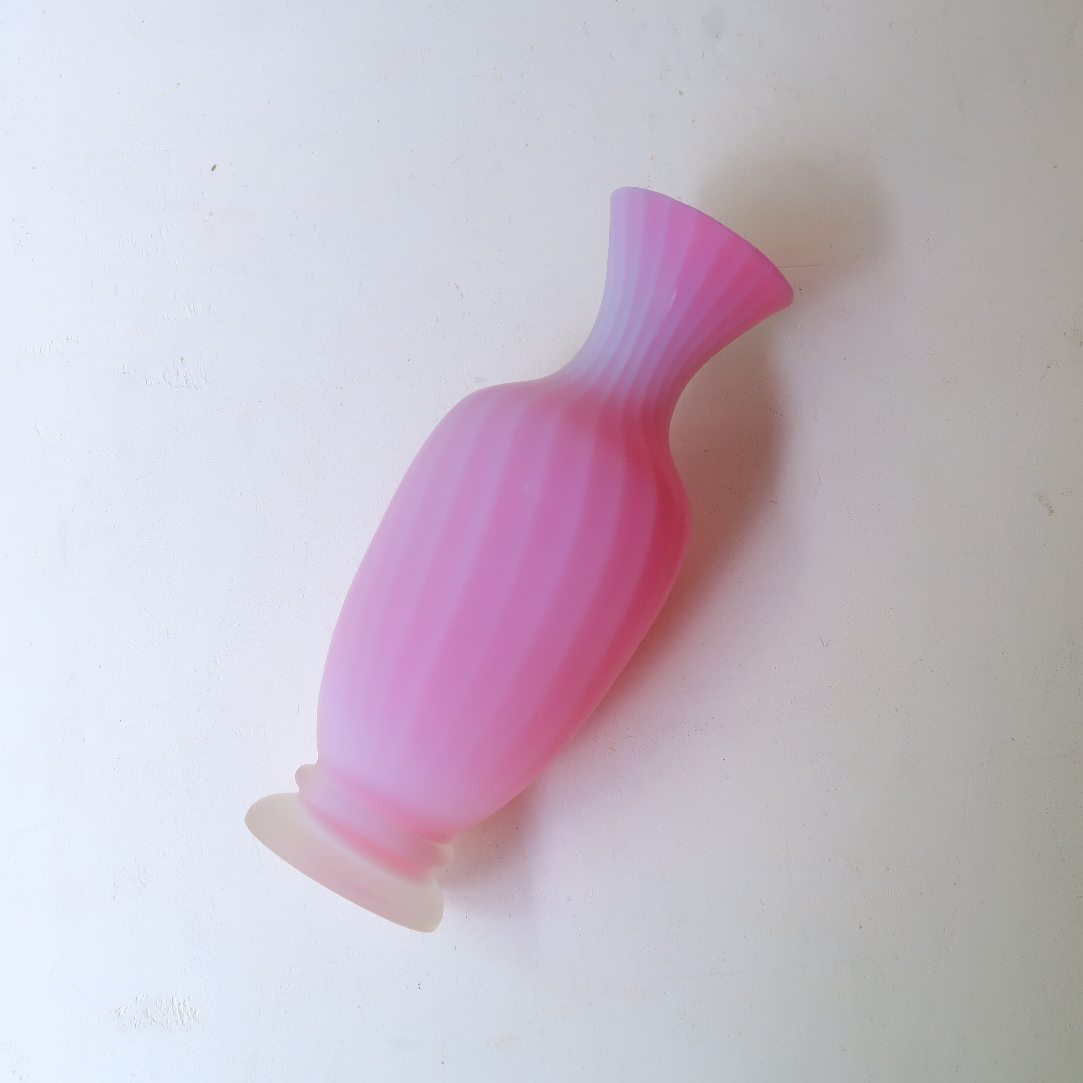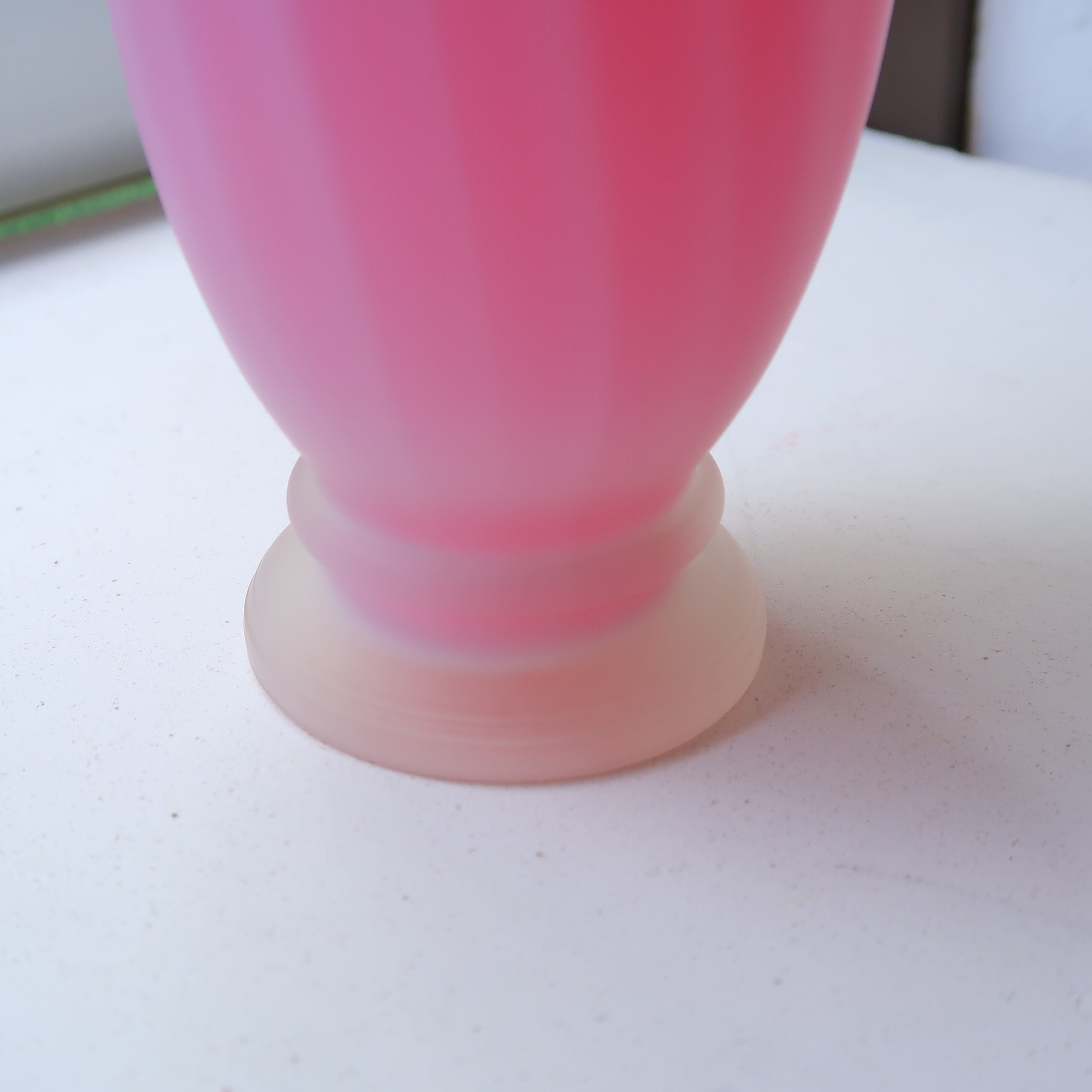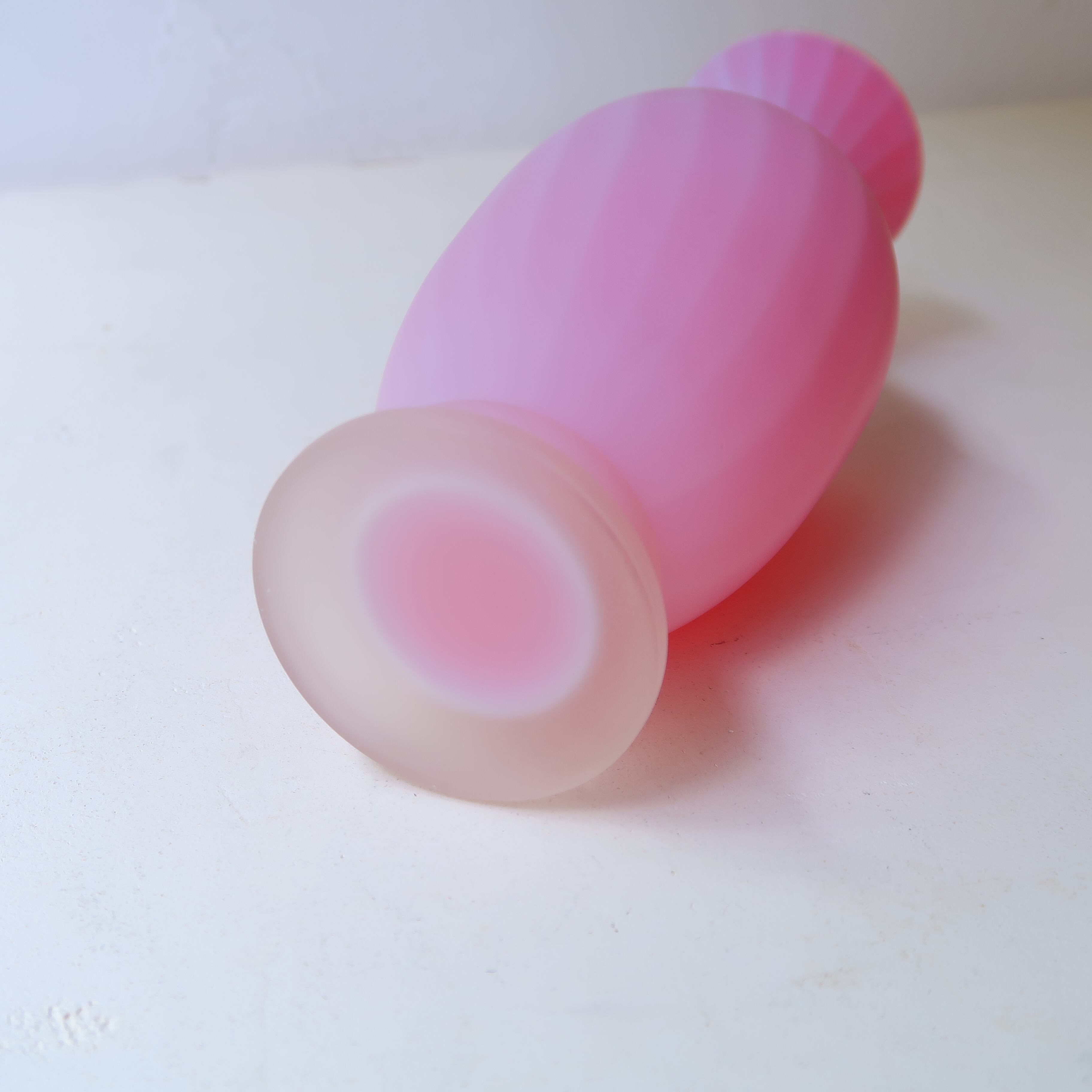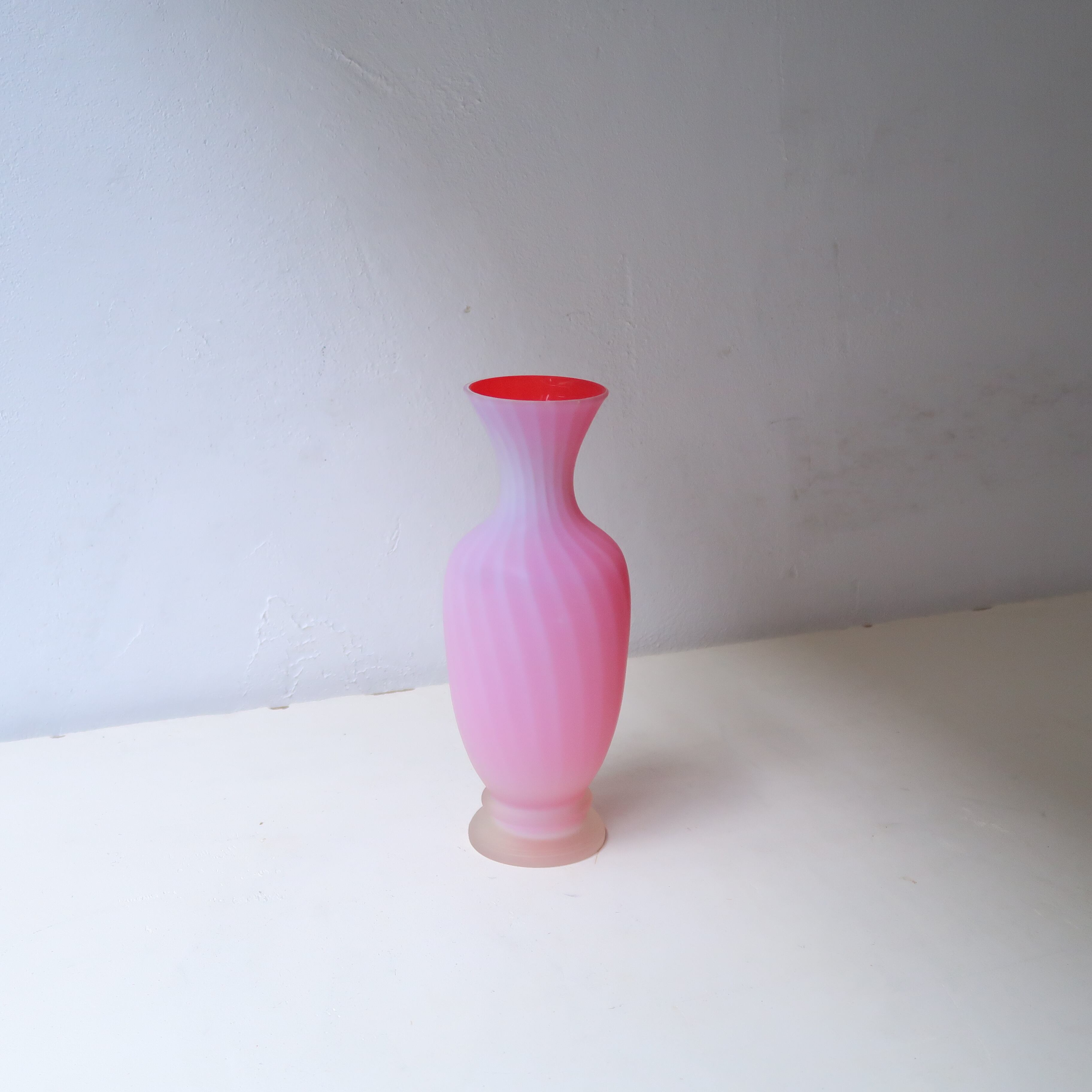 内側が赤、外側が白。白いストライプに真っ赤が透けてピンクに見える、まるでいちごと練乳のような関係の花瓶です。