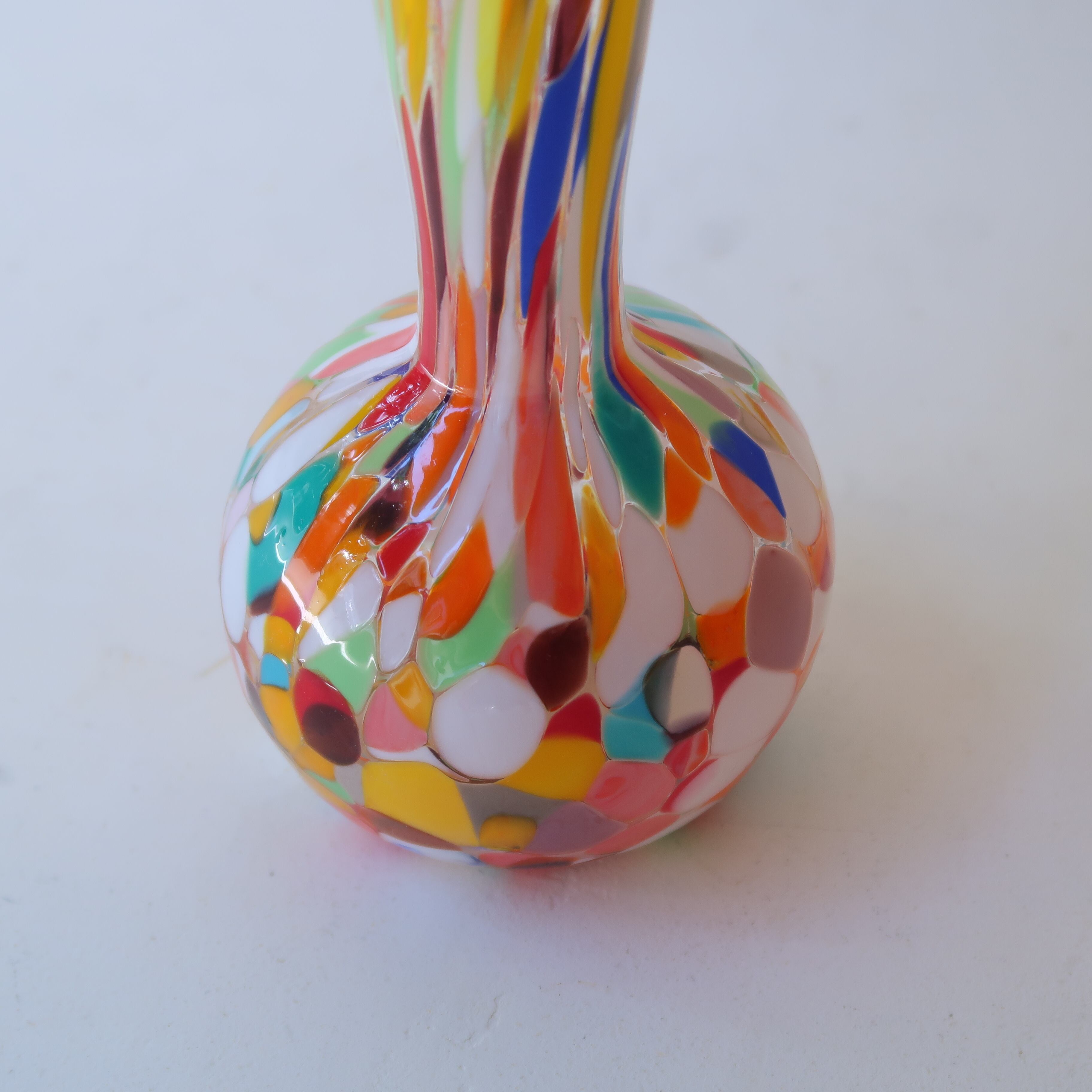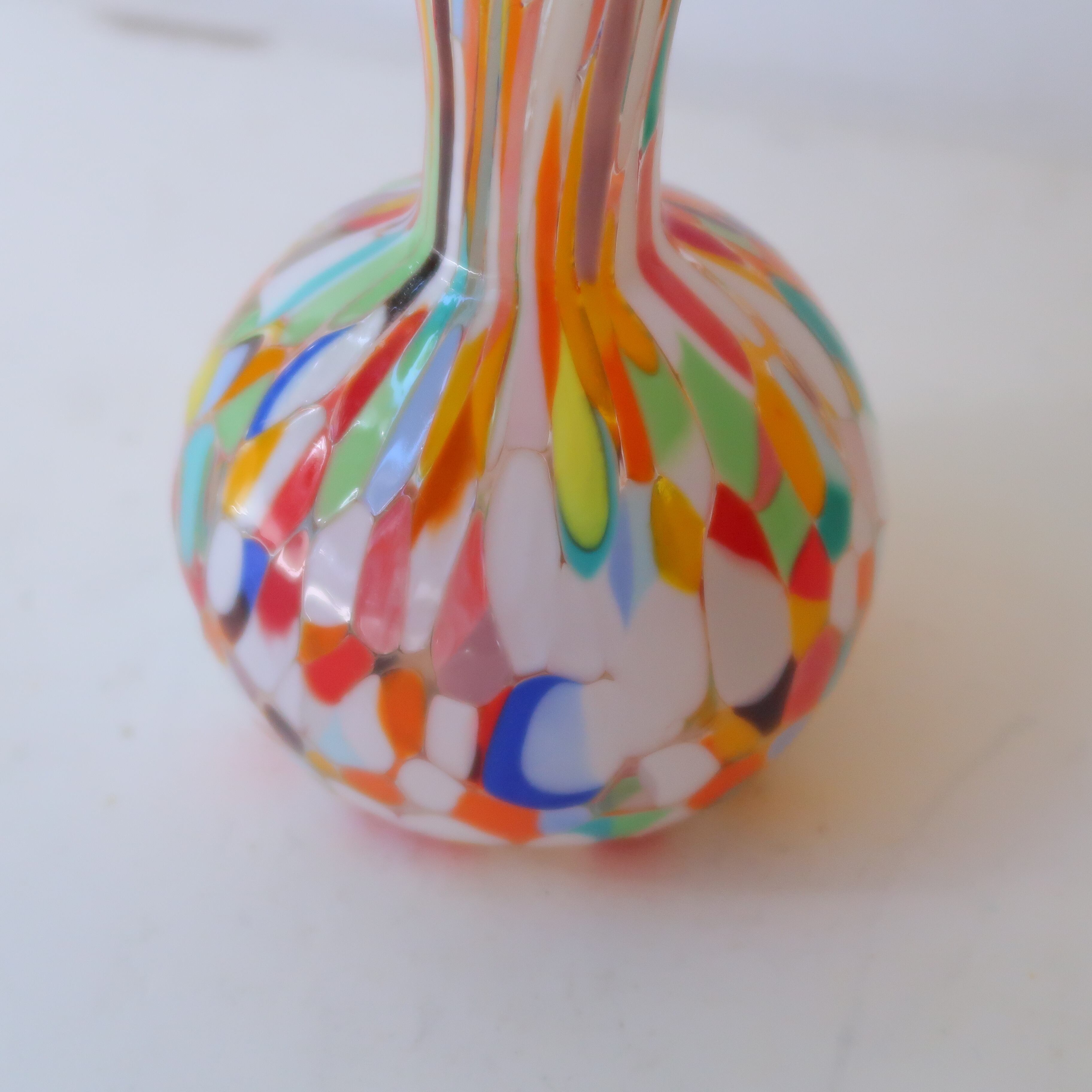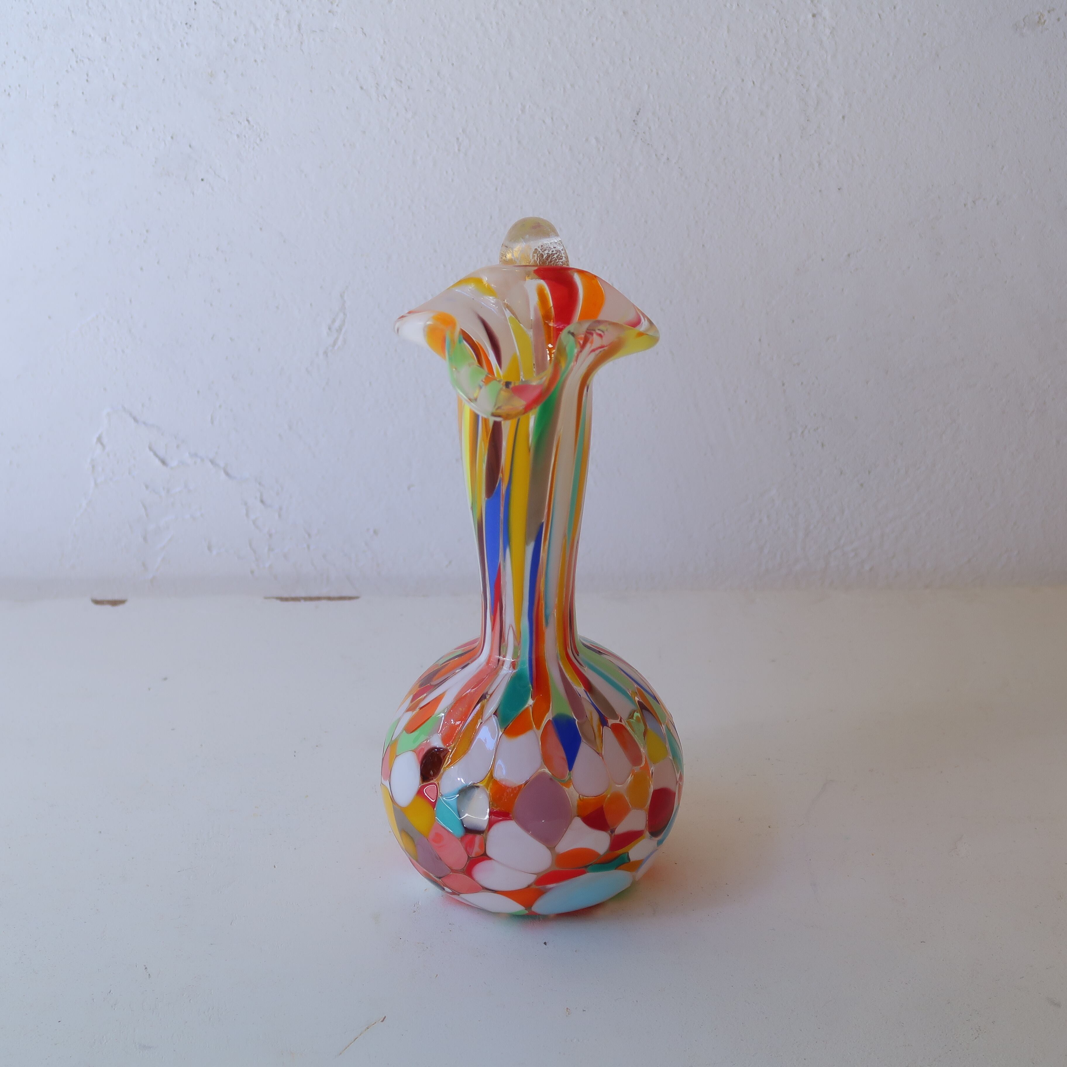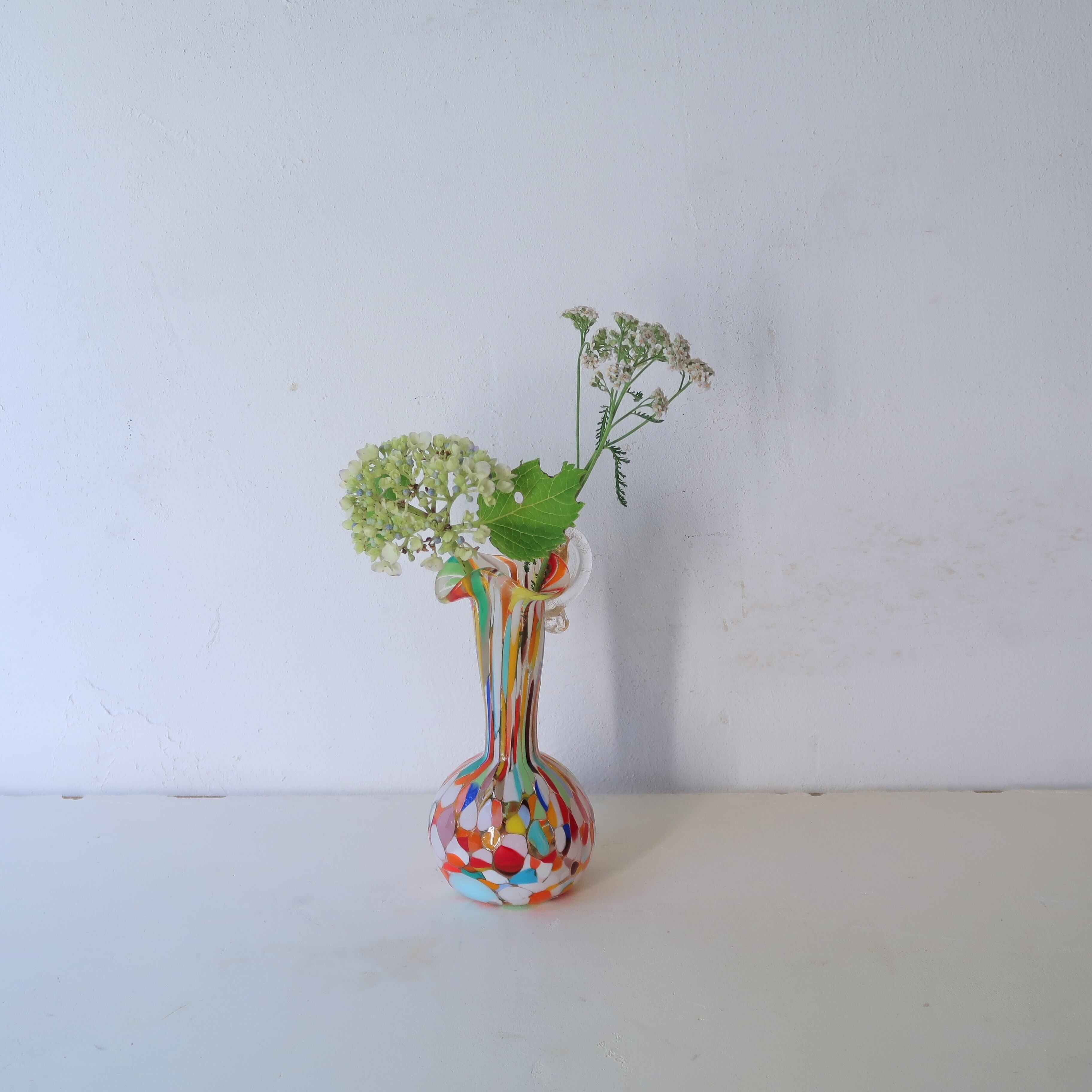 夏祭りのヨーヨーすくいを連想させるような、マーブルな水差し。とうめいのガラスに、白やオレンジ、イエロー、レッド、ブルー、エメラルドグリーン…。凹凸のある丸っこいマーブルと、ふちに向かって引き伸ばされた、カラフルがなんとも言えません。ふちは、ランのような大きくひらいたうすい口。ゴールドの箔が散りばめられた取っ手も、愛らしい。