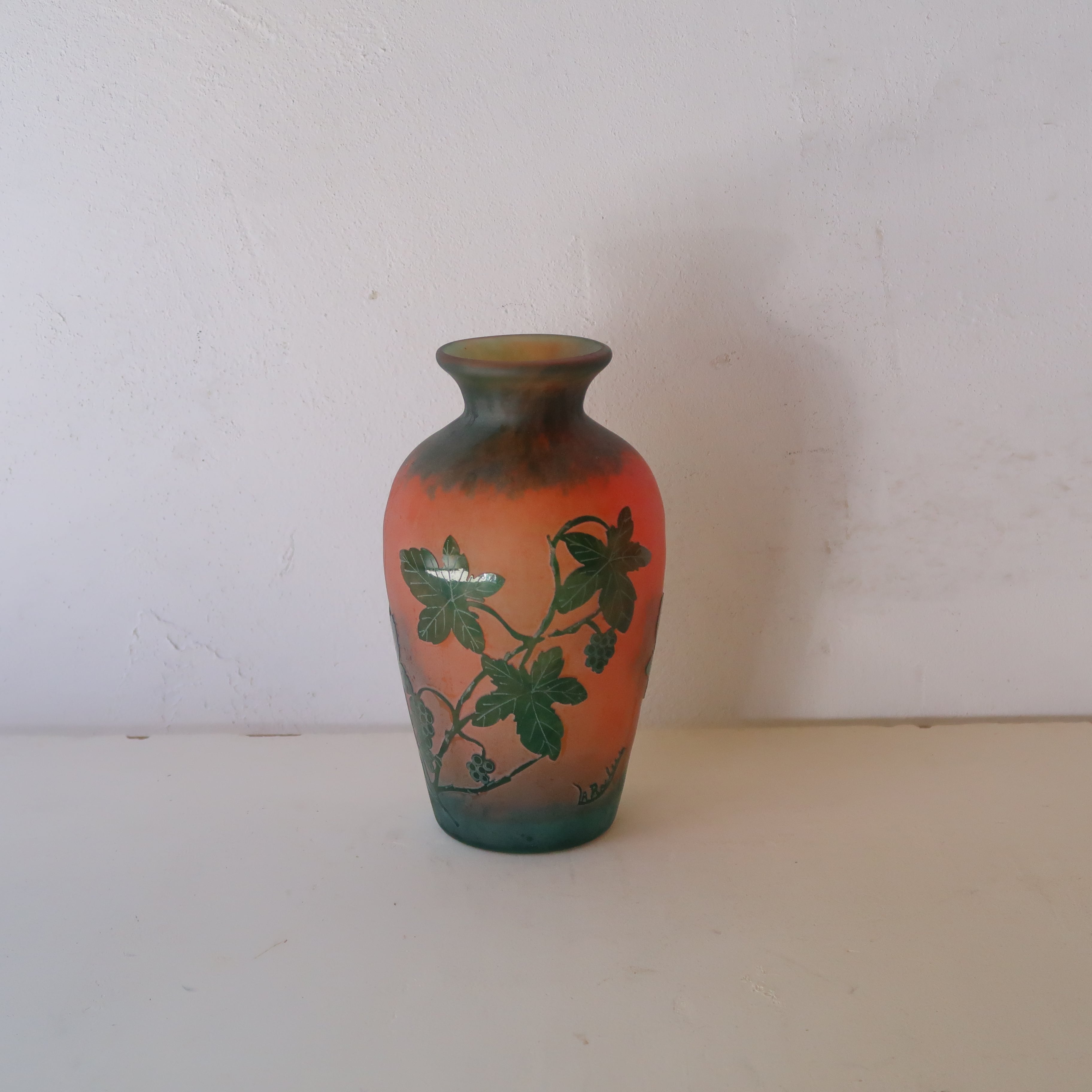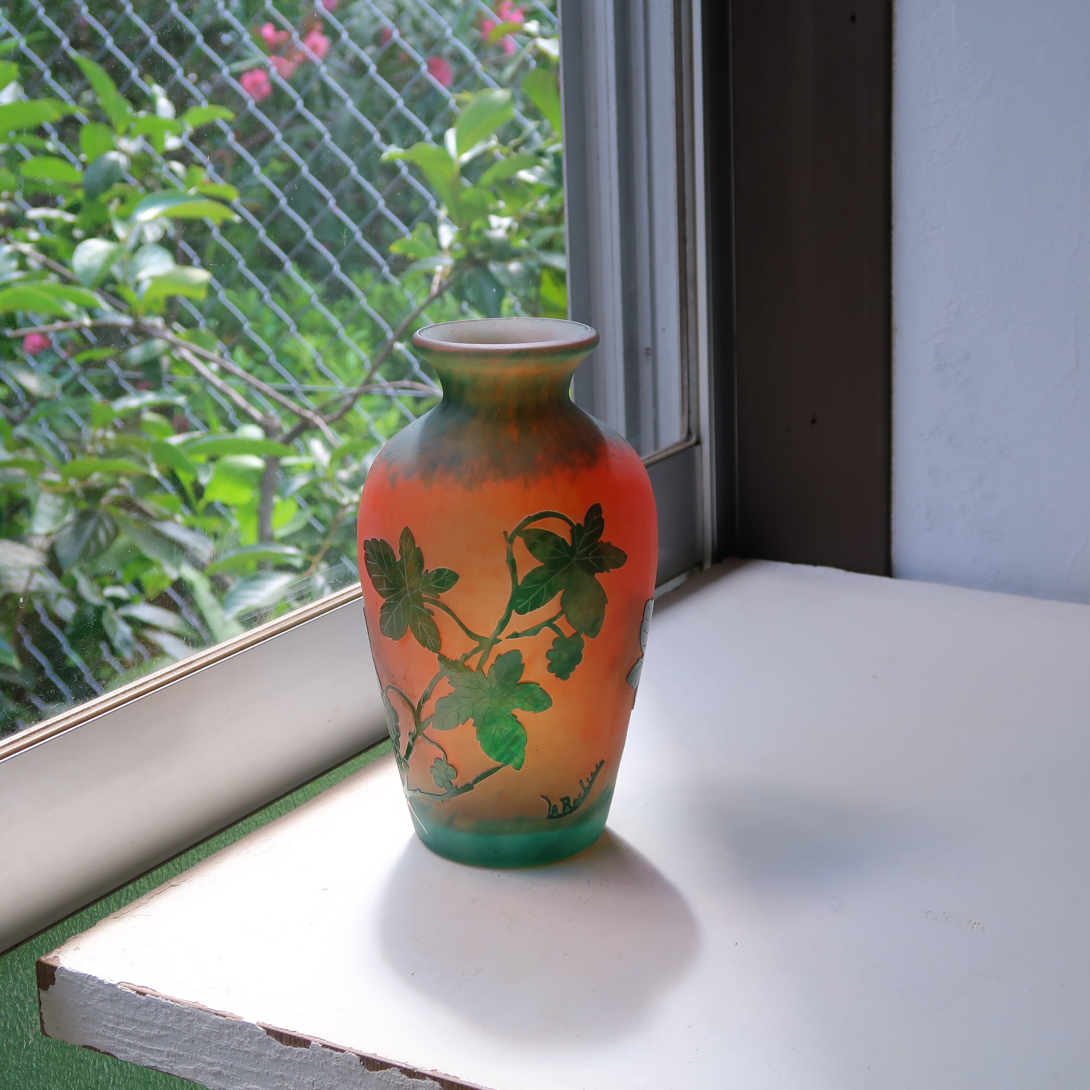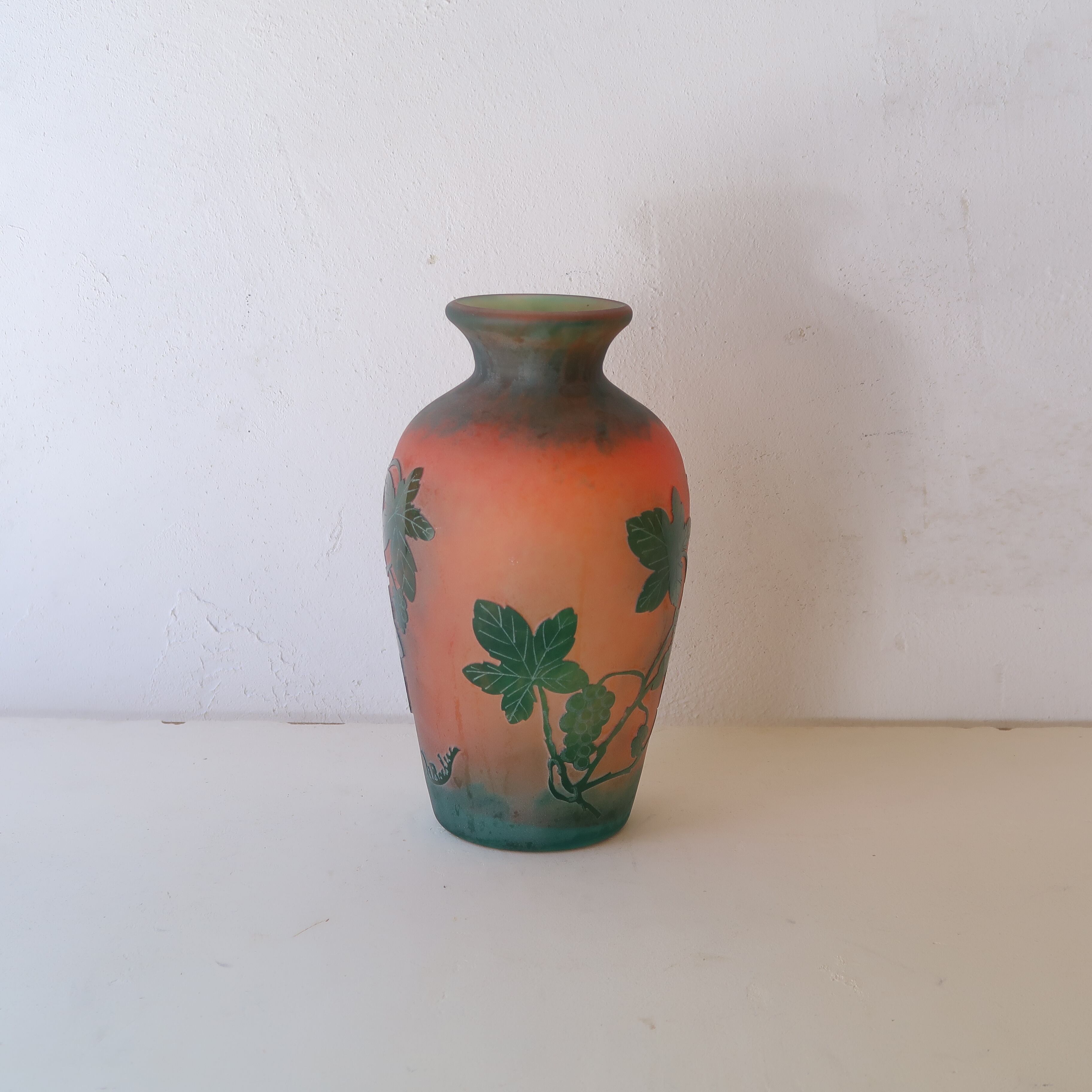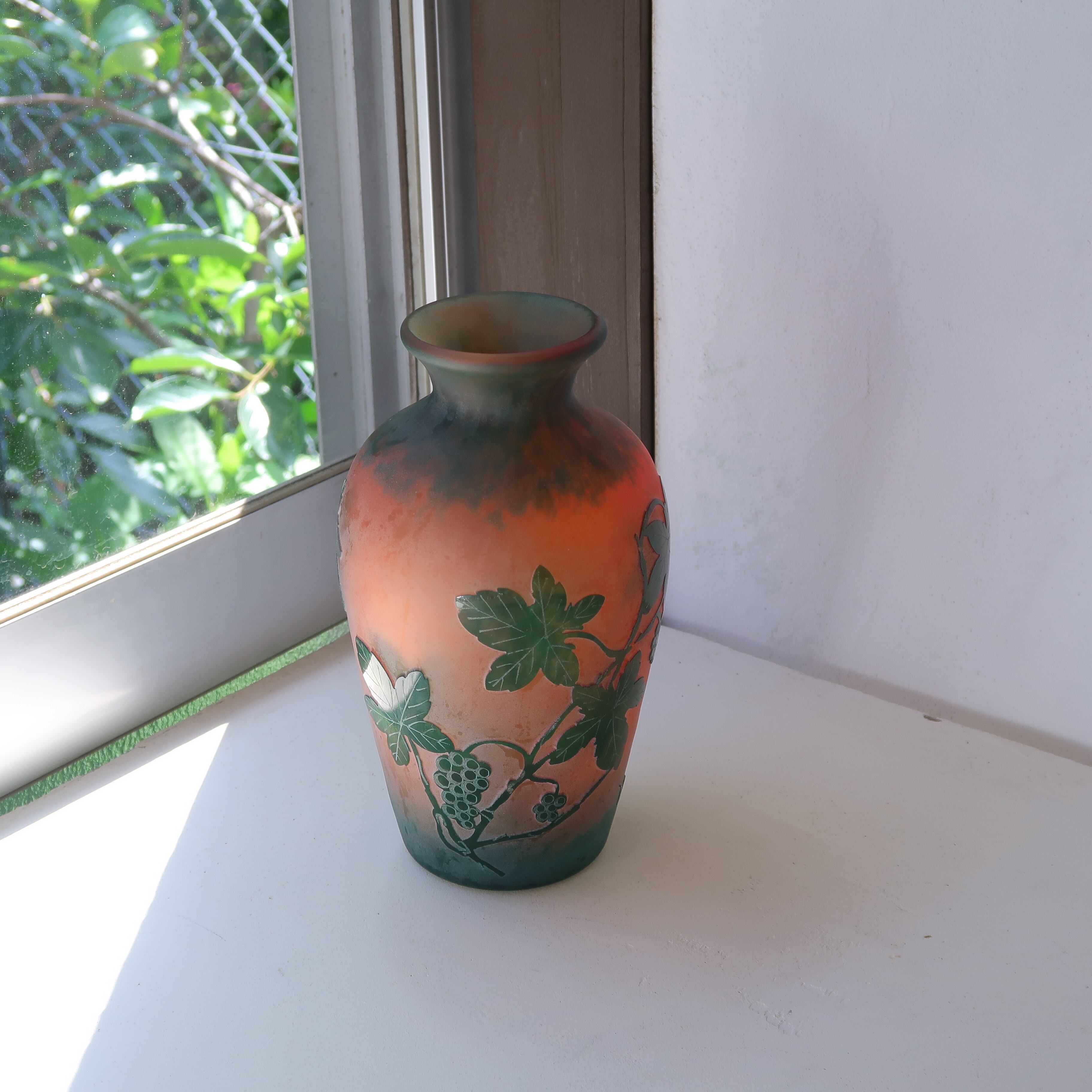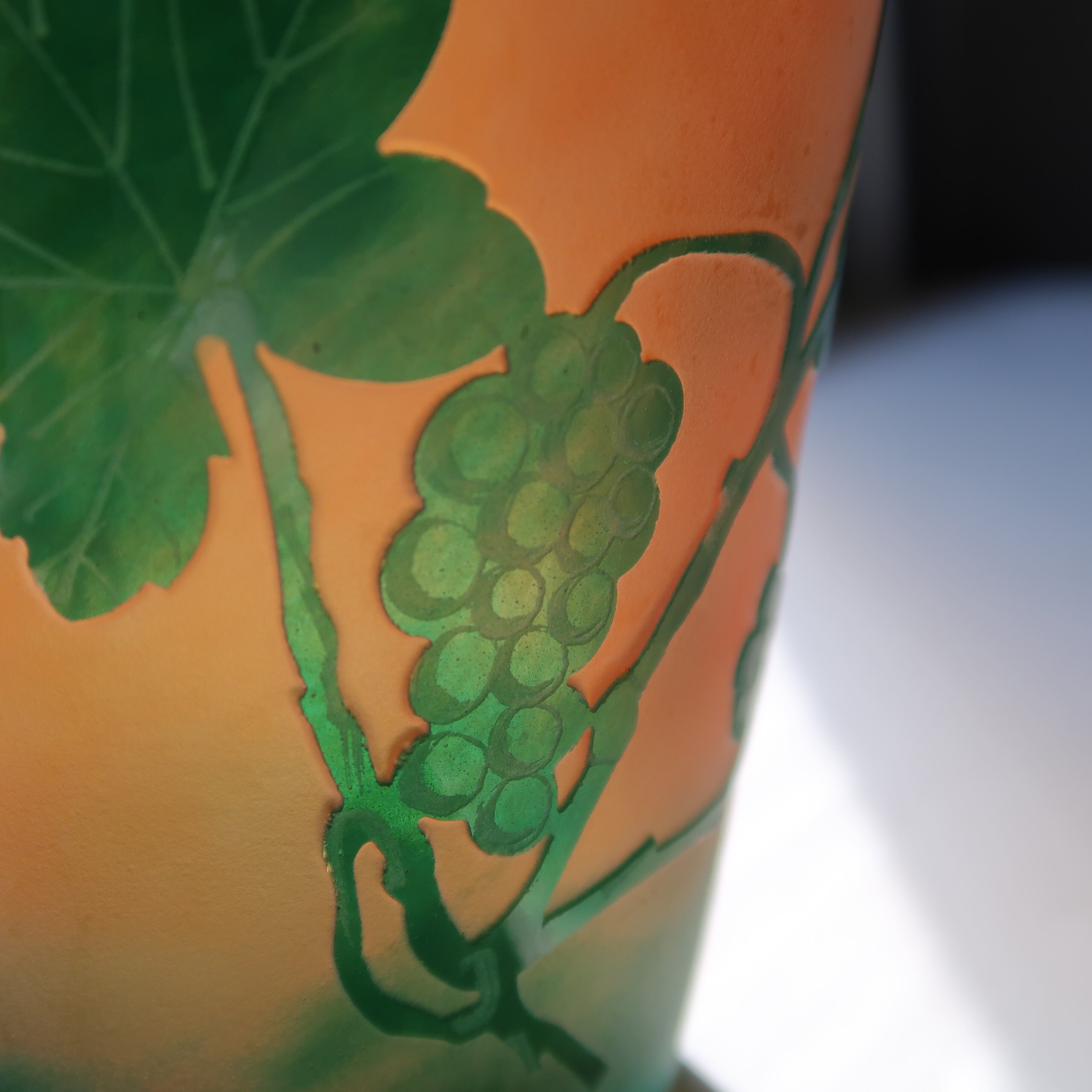 そこに描かれているのは、ぶどうとその葉っぱ。グリーンのガラスで凸状に浮き出ており、ここだけつるりとした質感。よく見ると、オレンジのグラデーションも透け、ガラスが何層にも重なっているのがわかります。アールヌーボー、ガレを感じるような。底のほうのエメラルドグリーンもきれいです。