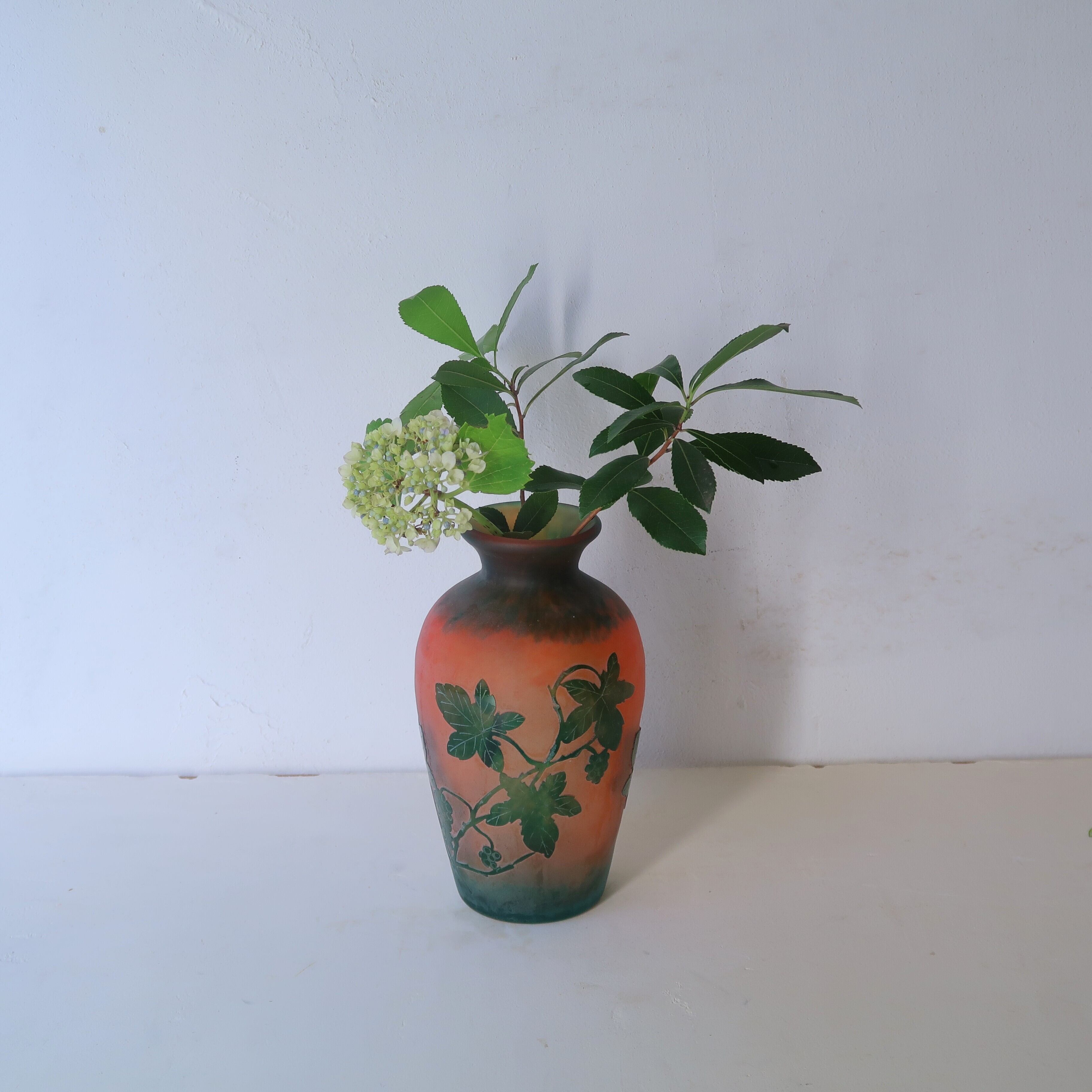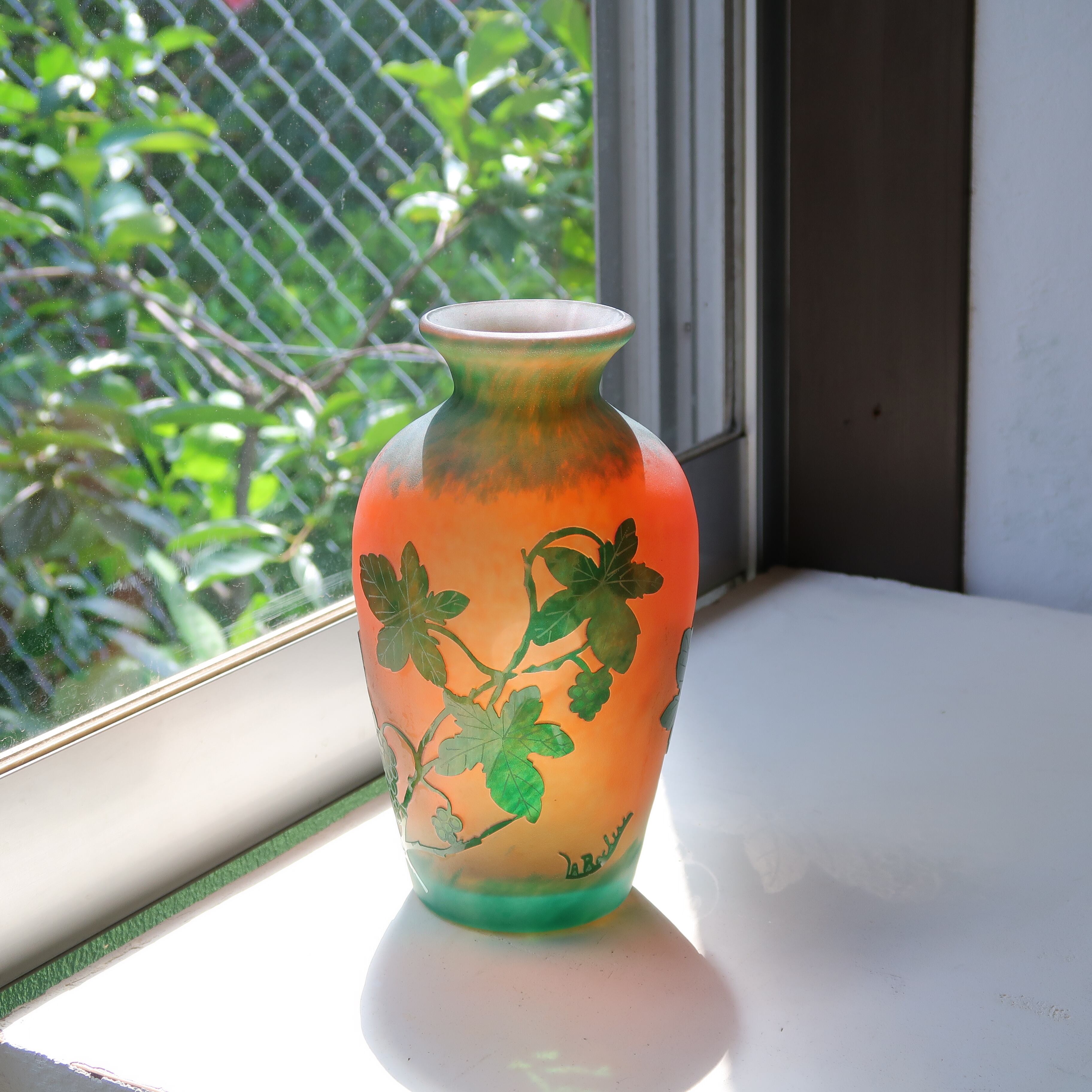 夕日が赤く燃えているかのような、エネルギッシュな色合いの花瓶。表面はさらさらとマットな質感で、やわらかなオレンジとエメラルドグリーンがきれいに映ります。