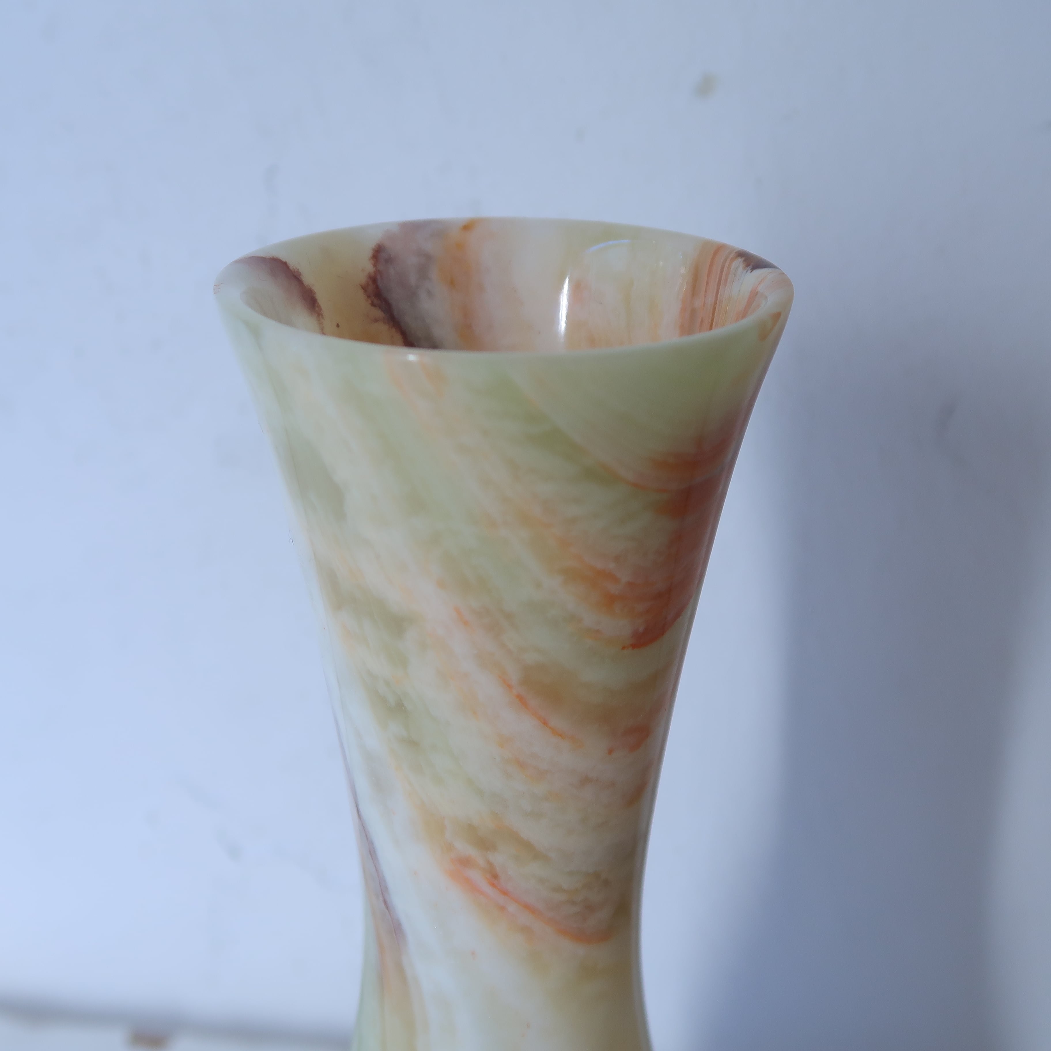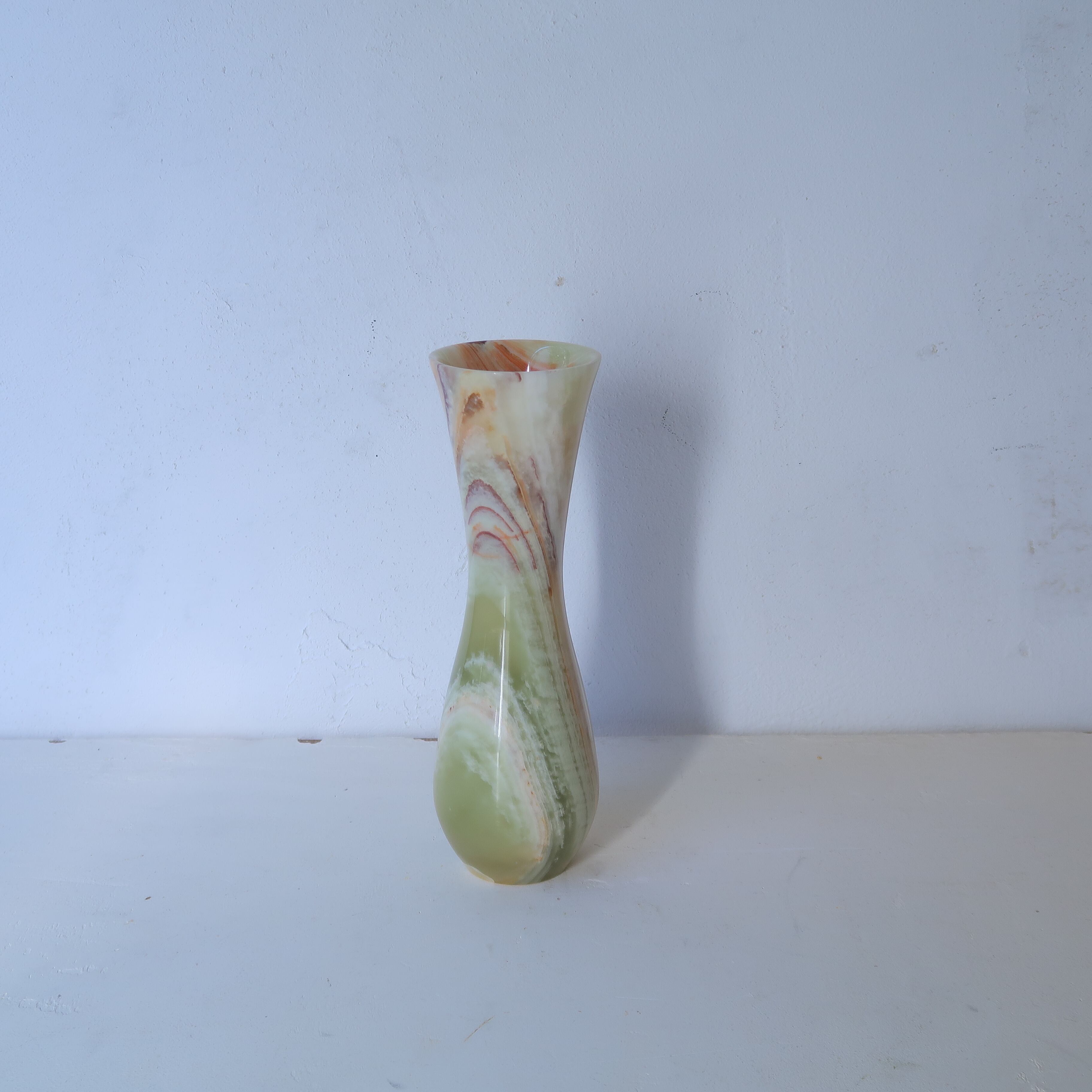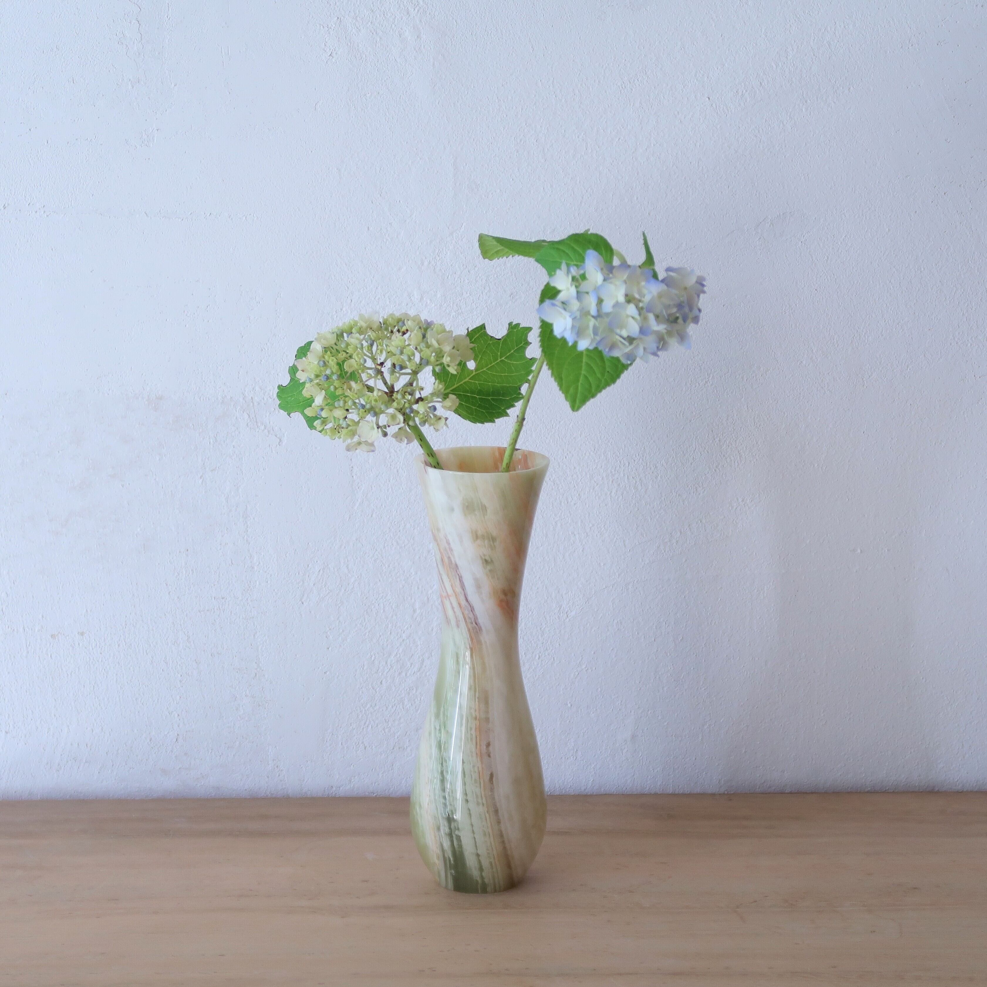 ミルキーホワイト、グリーン、キャメル…とりどりの縞模様がかわいい、つるりとしたオニキスの花瓶。ところどころ向こうが透けて見えます。