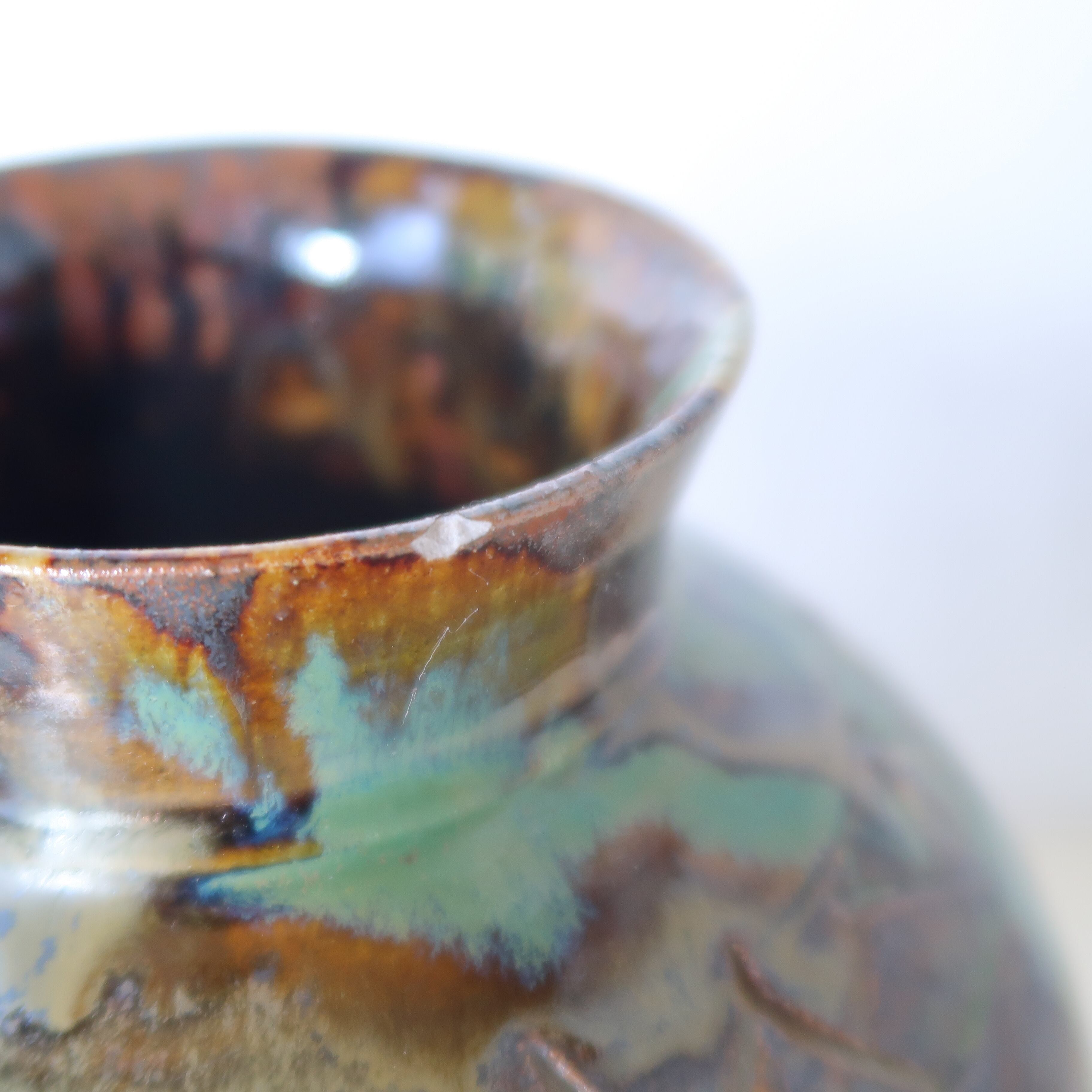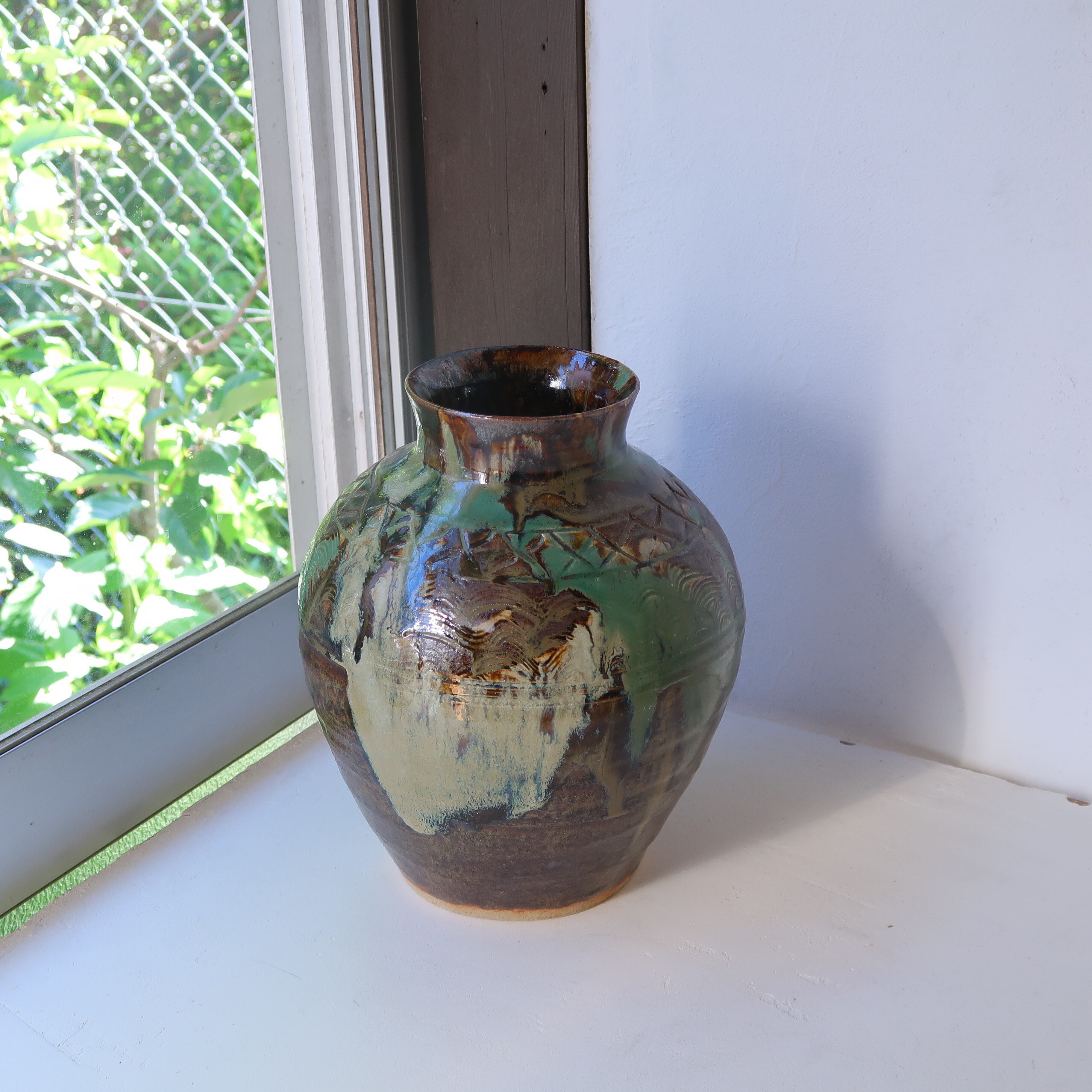 黒飴のようにつやのある土色に、ミルキーなグリーンとホワイトの二色が滴る、あいがけのカレーのような花瓶。上部にはクロスマークや波紋の彫りがあります。