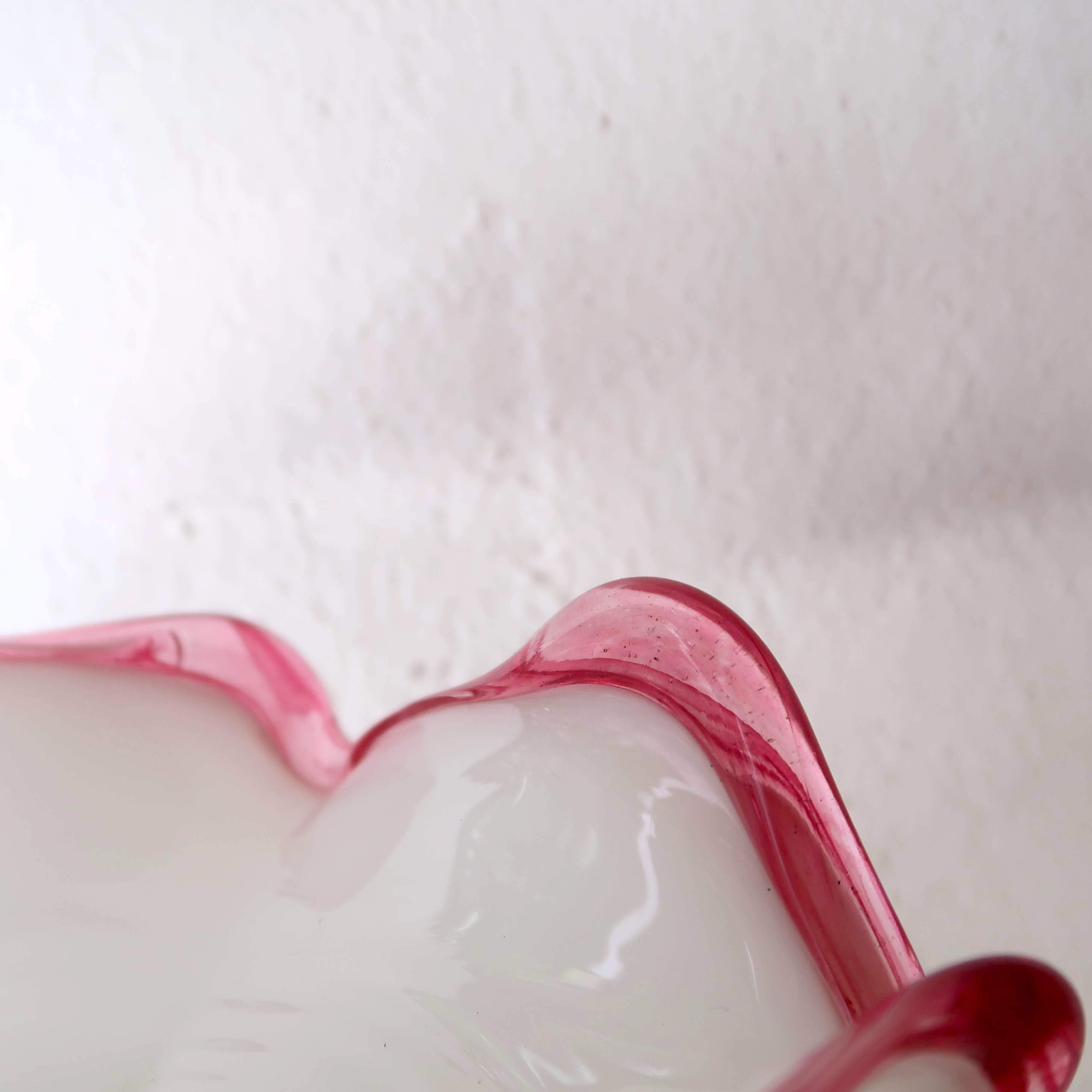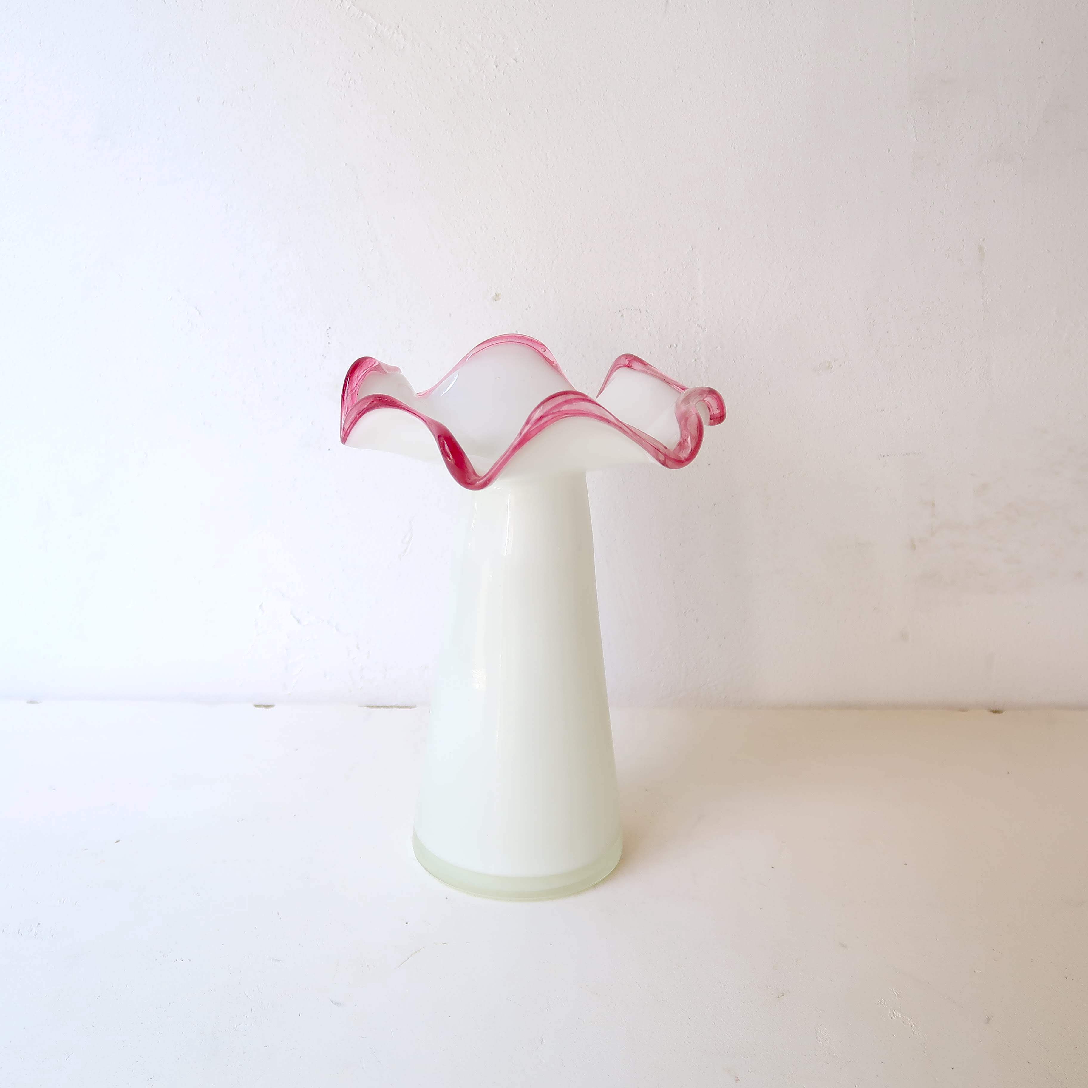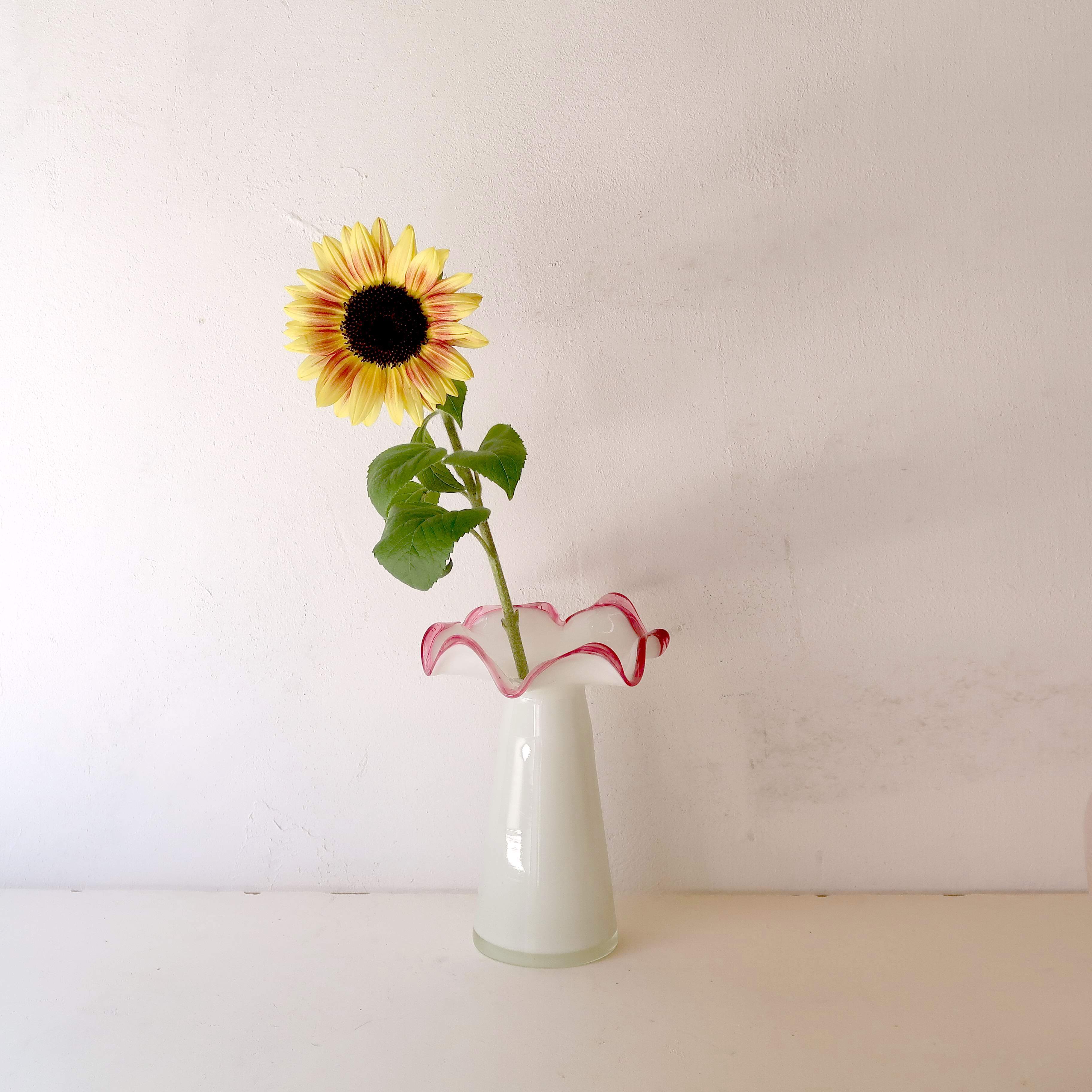 乳白色のガラスに、ピンクのふち、百合のようなひらひら、なんともキュートな花瓶。
