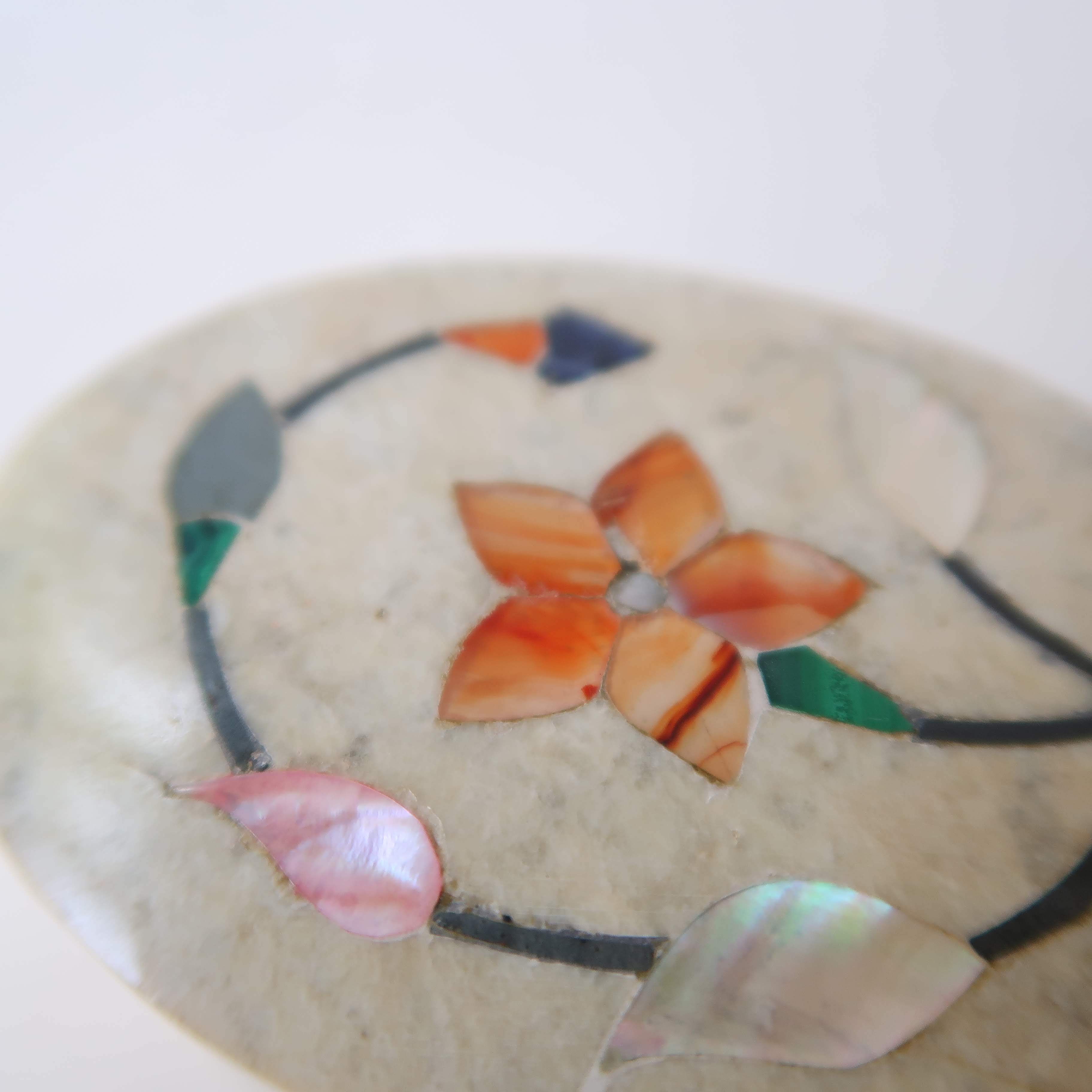 容器は石、お花は薄くスライスされた貝殻が埋め込まれているインドのアイテム。オレンジ、ピンク、グリーン、ホワイト、カラフルで楽しげ。