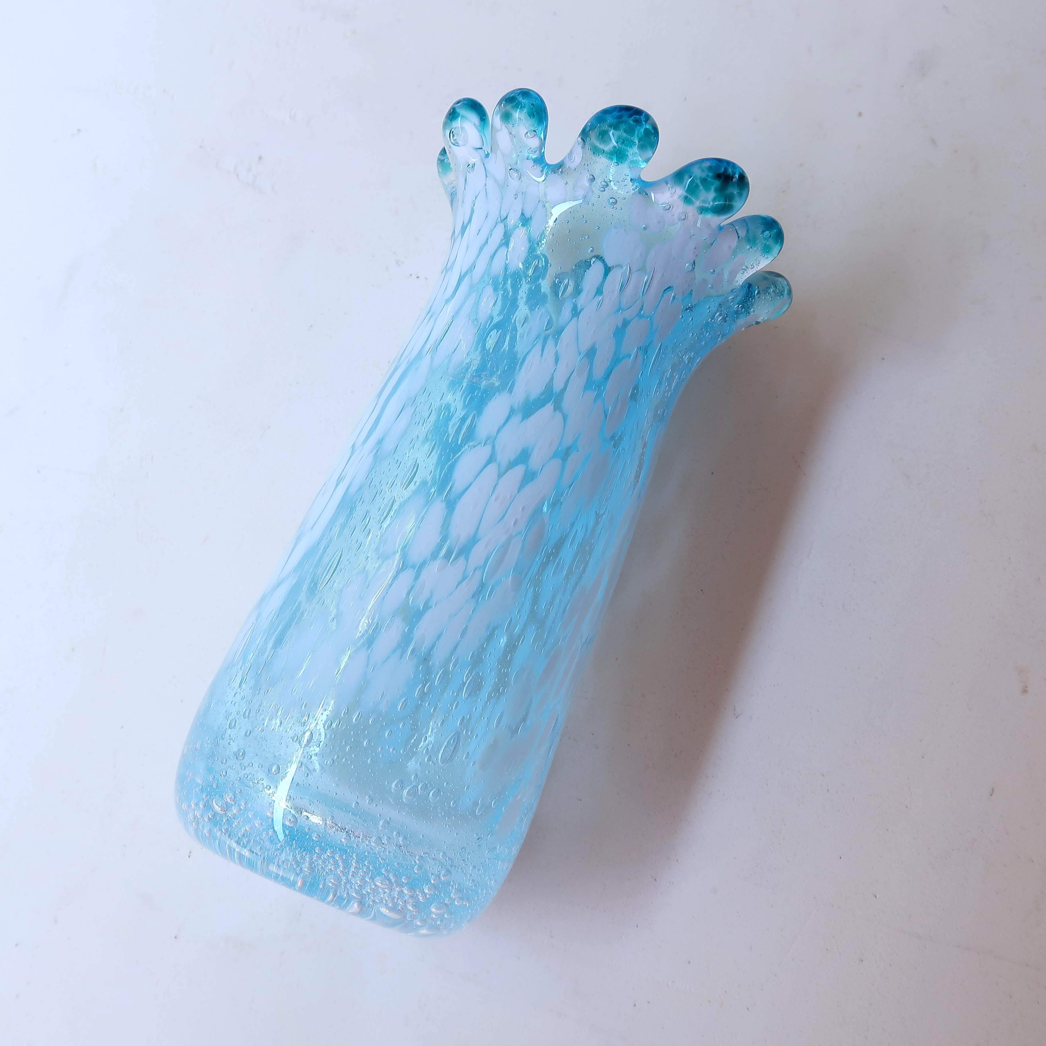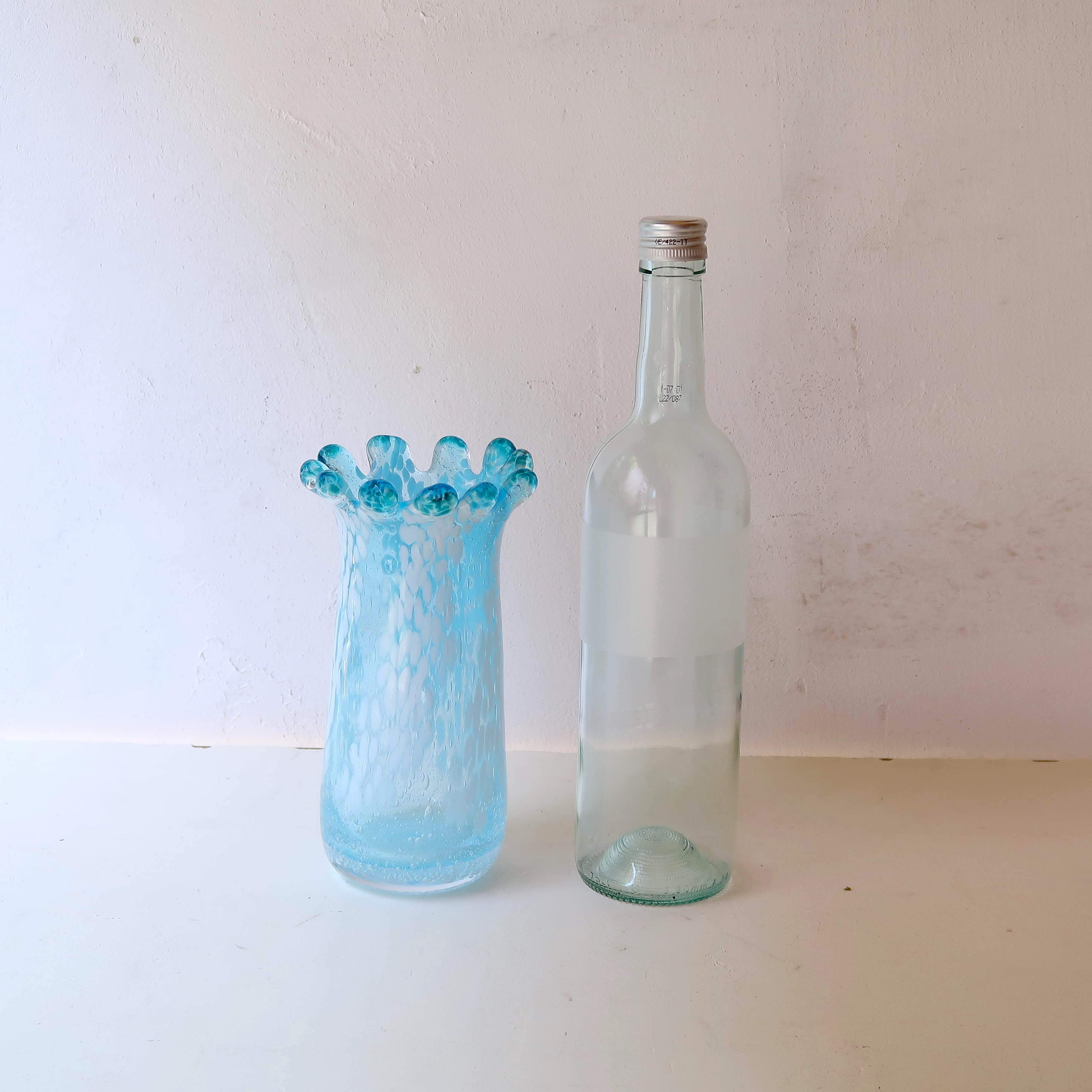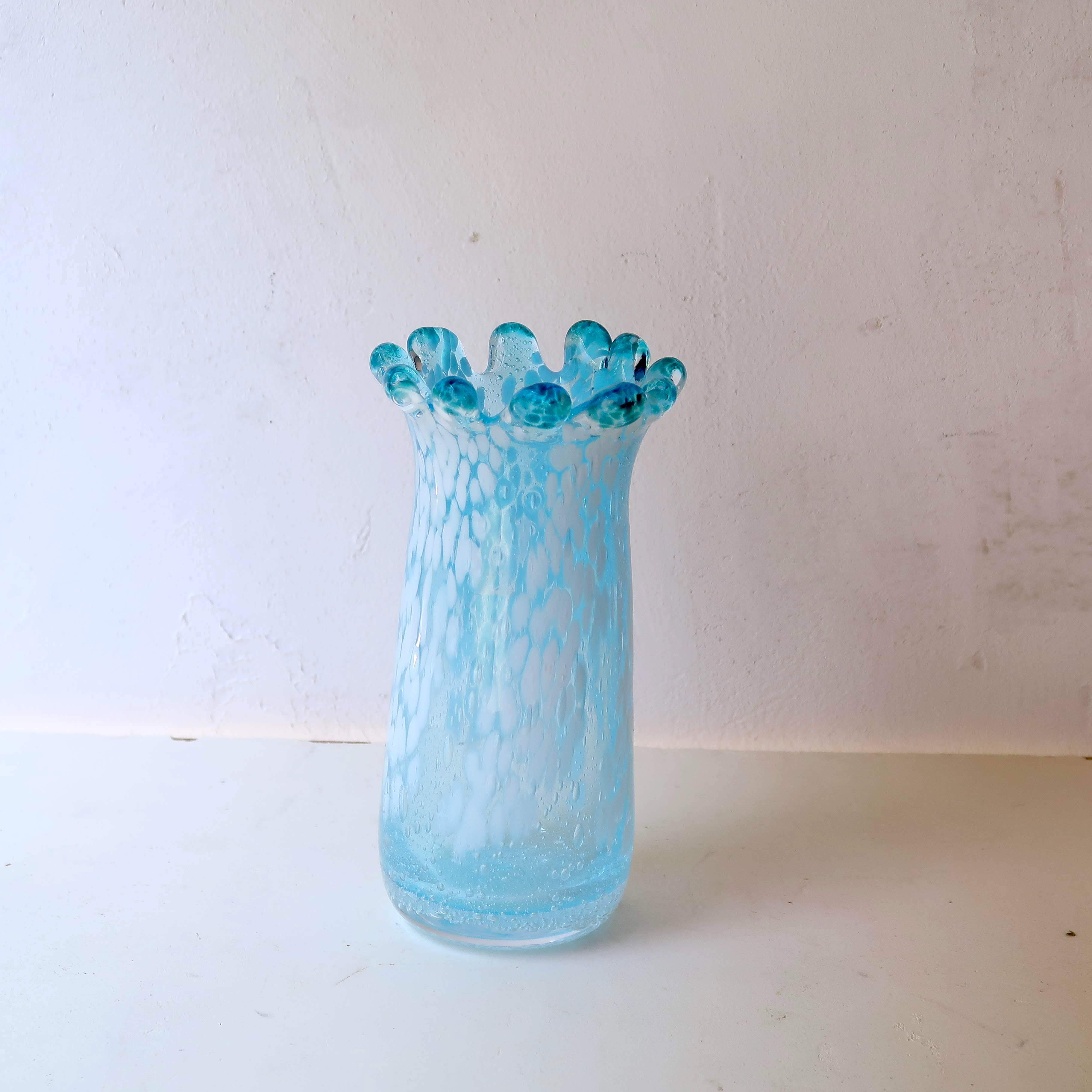 ミルクが一滴おちてはじけたときのような、王冠のようなぷくぷくがかわいい花瓶。水色とうめいのガラスに白のマーブル。ぽこぽこした気泡が光に当たるときらきらとする、水の中にいるような花瓶。