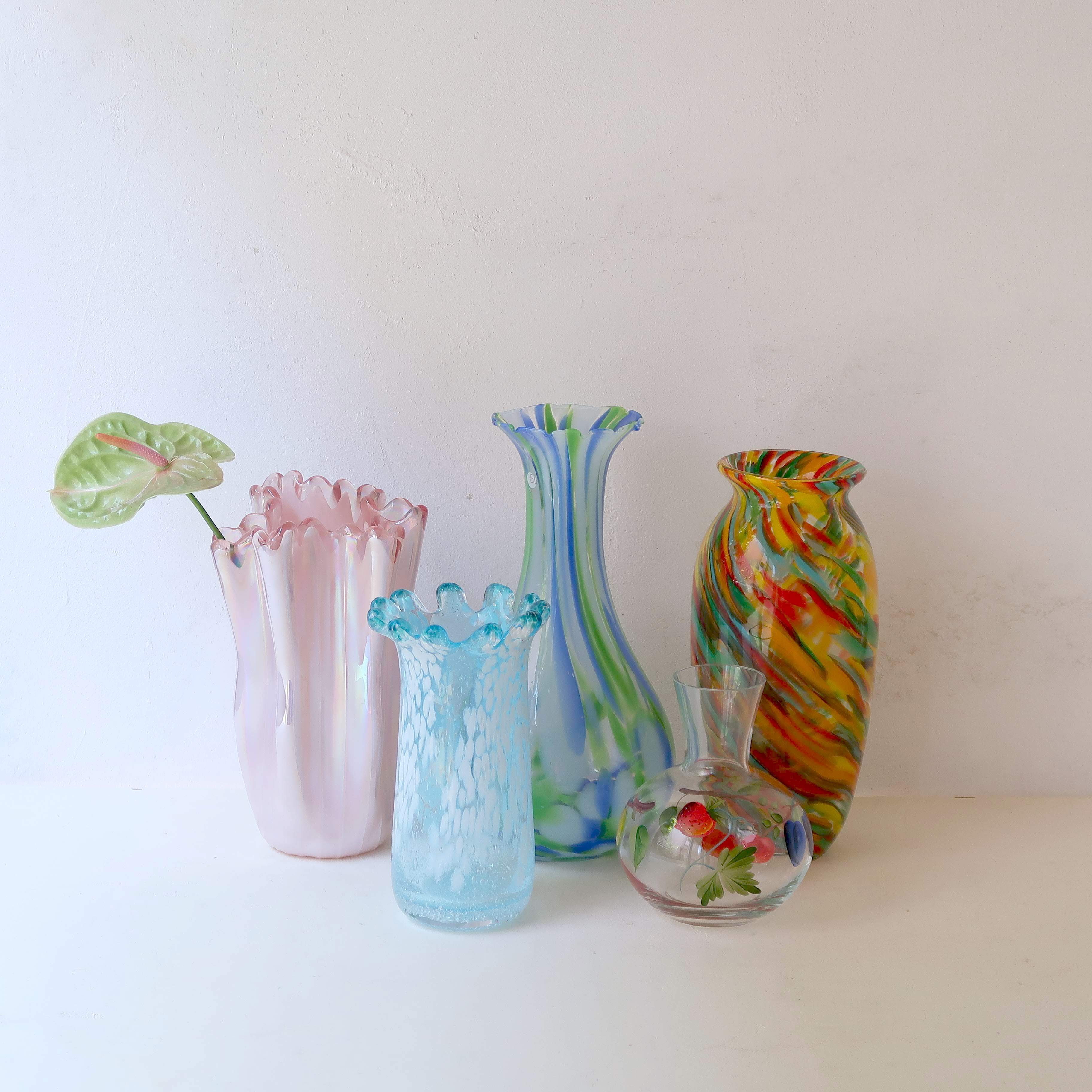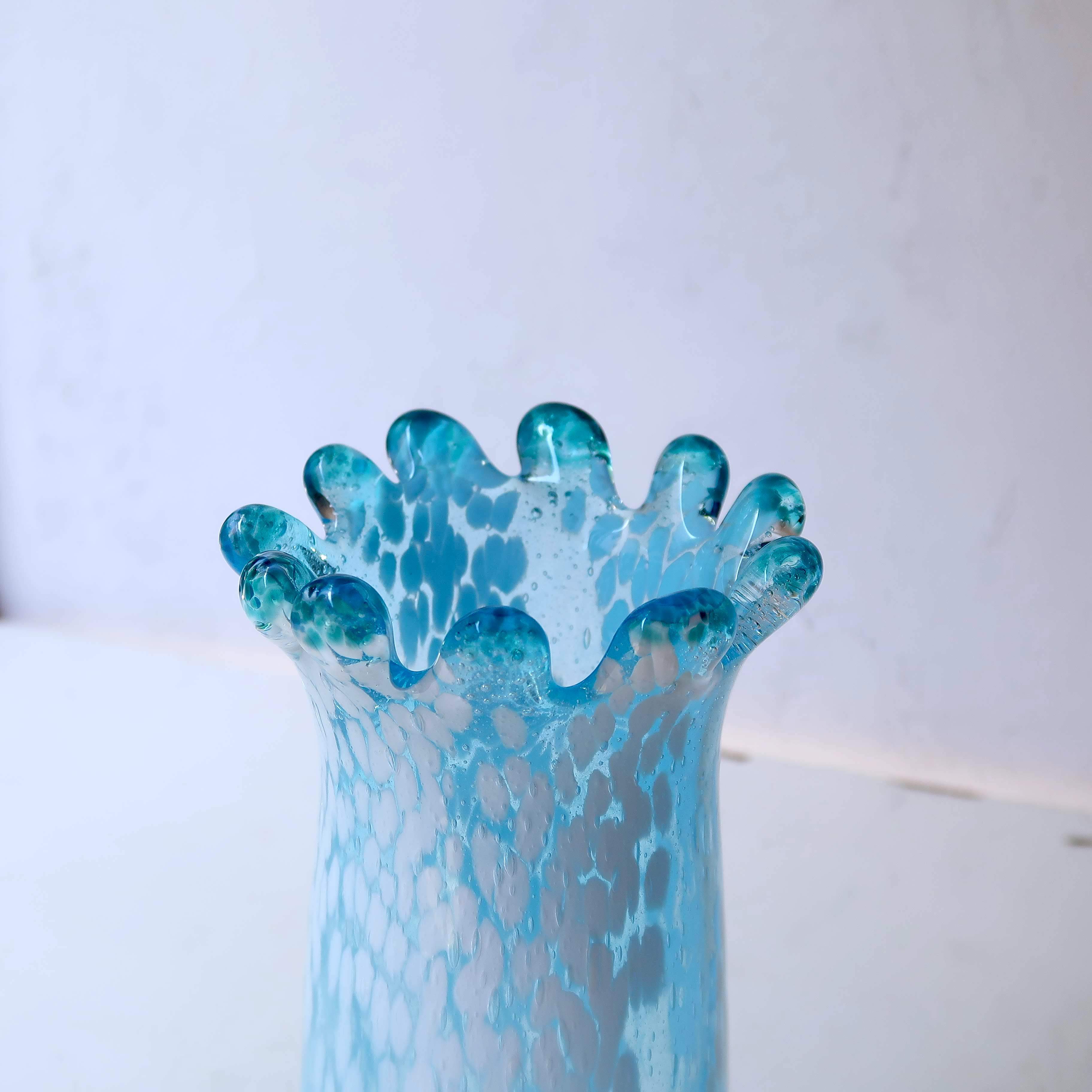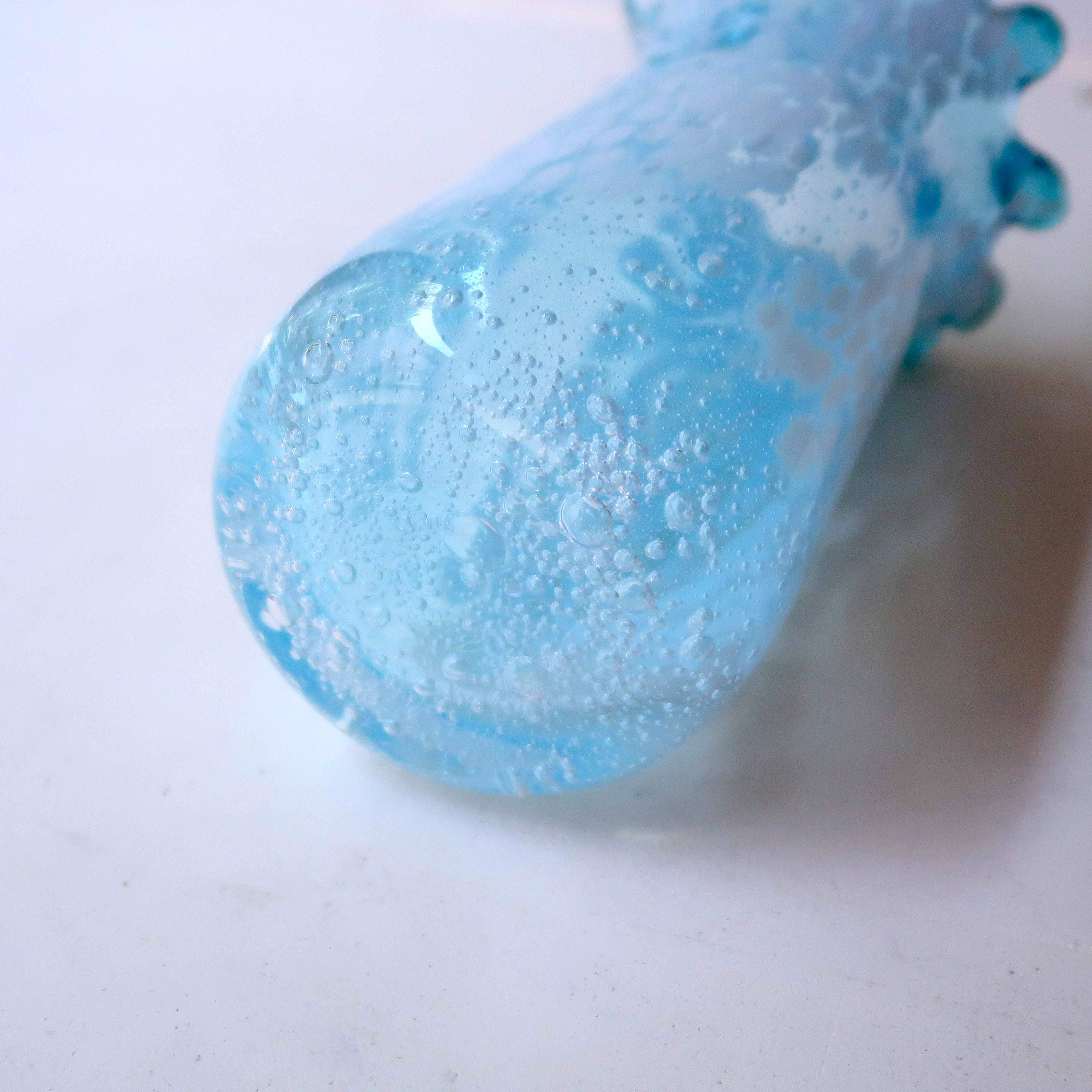 ミルクが一滴おちてはじけたときのような、王冠のようなぷくぷくがかわいい花瓶。水色とうめいのガラスに白のマーブル。ぽこぽこした気泡が光に当たるときらきらとする、水の中にいるような花瓶。