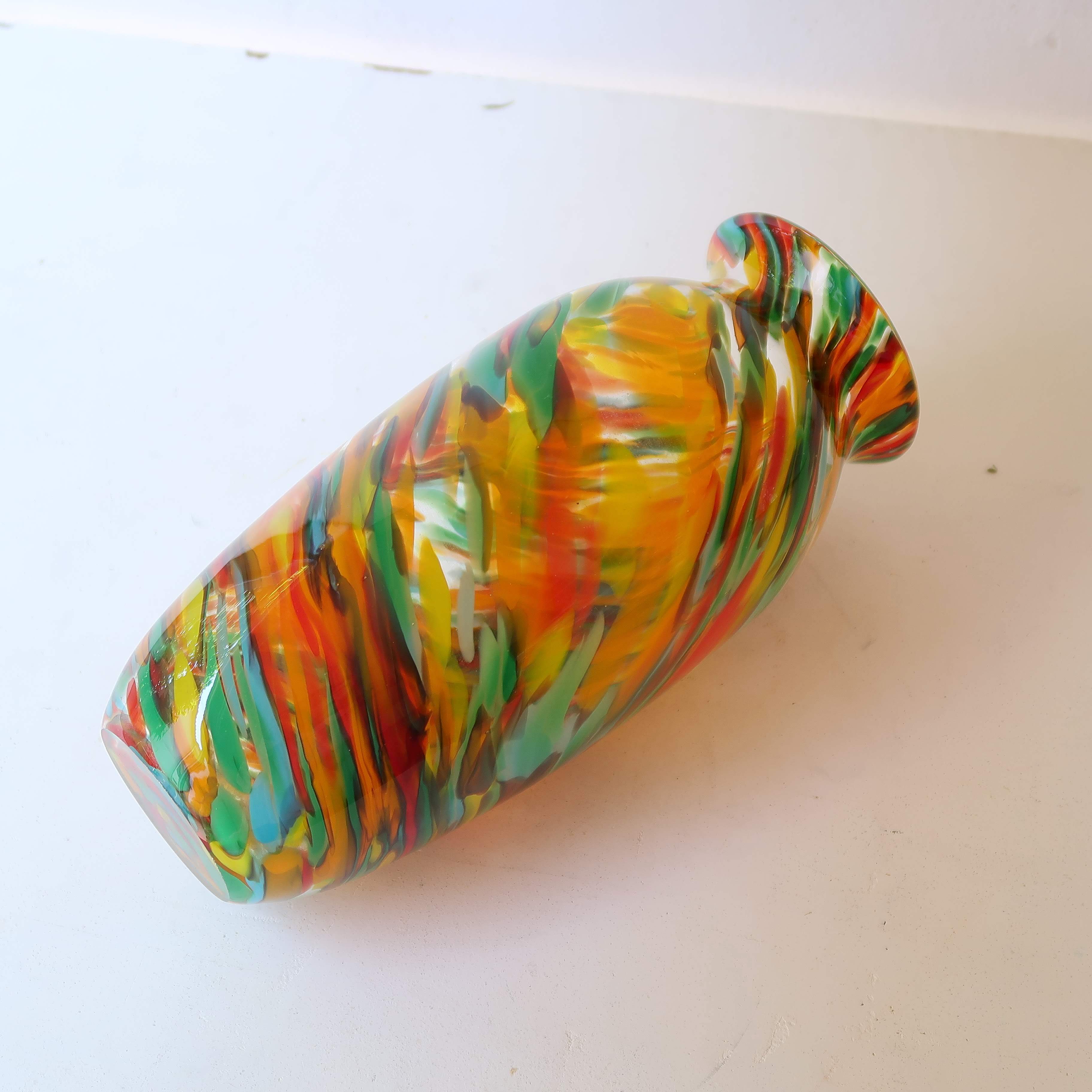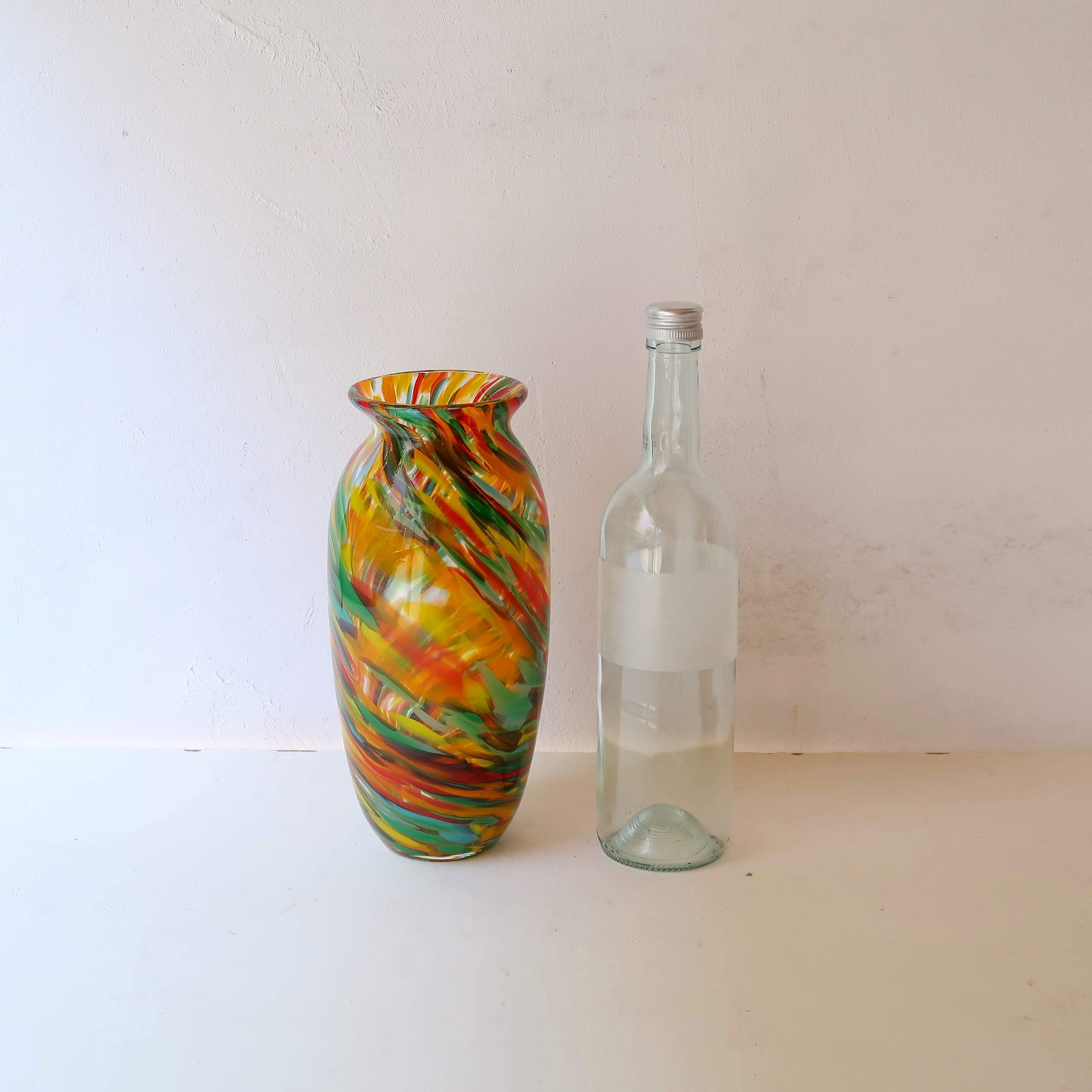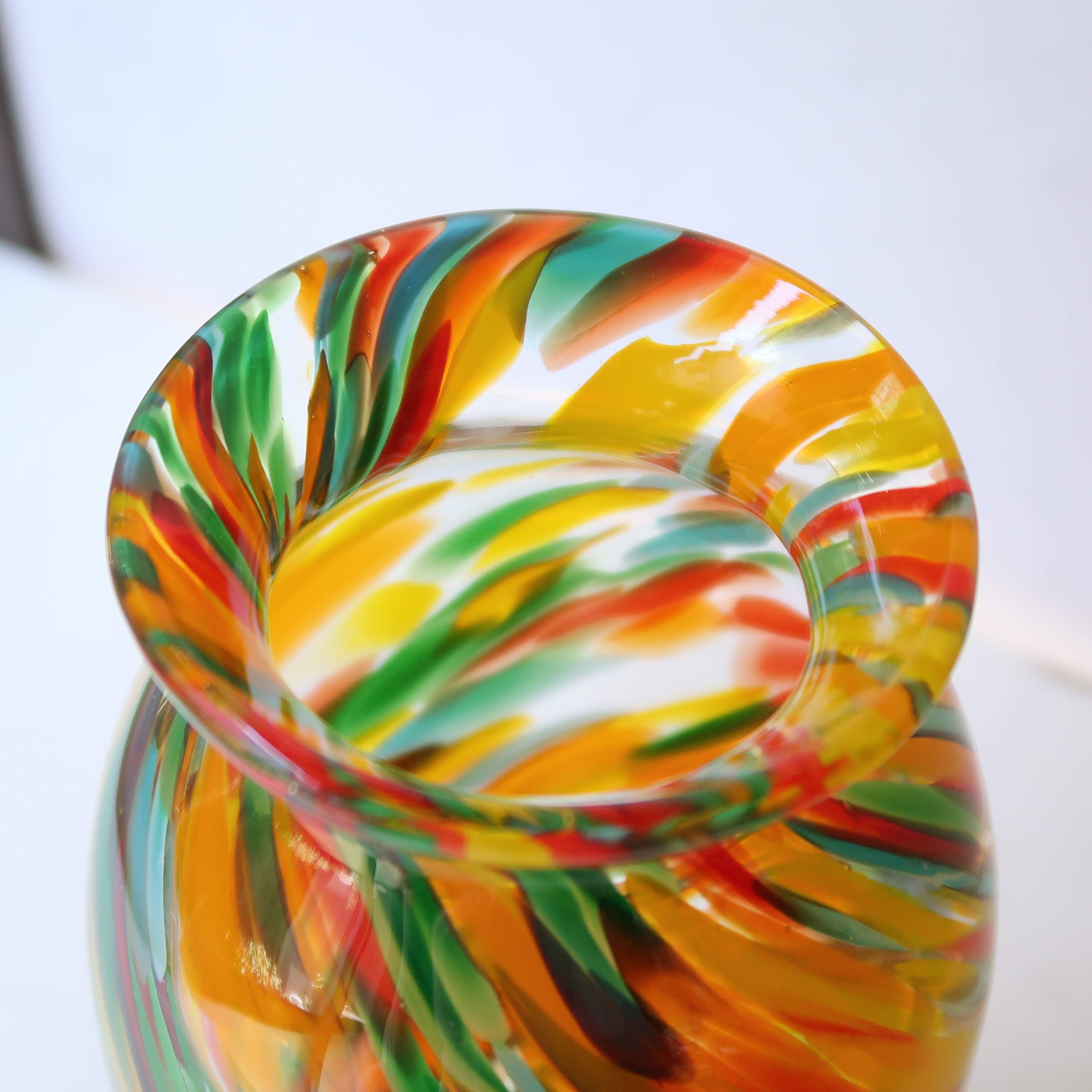 とうめいのガラスに、オレンジや赤、グリーン、イエロー…。カラフルなマーブルが、なんとも言えません。フォルムは、口のすぼまったオーバル型。