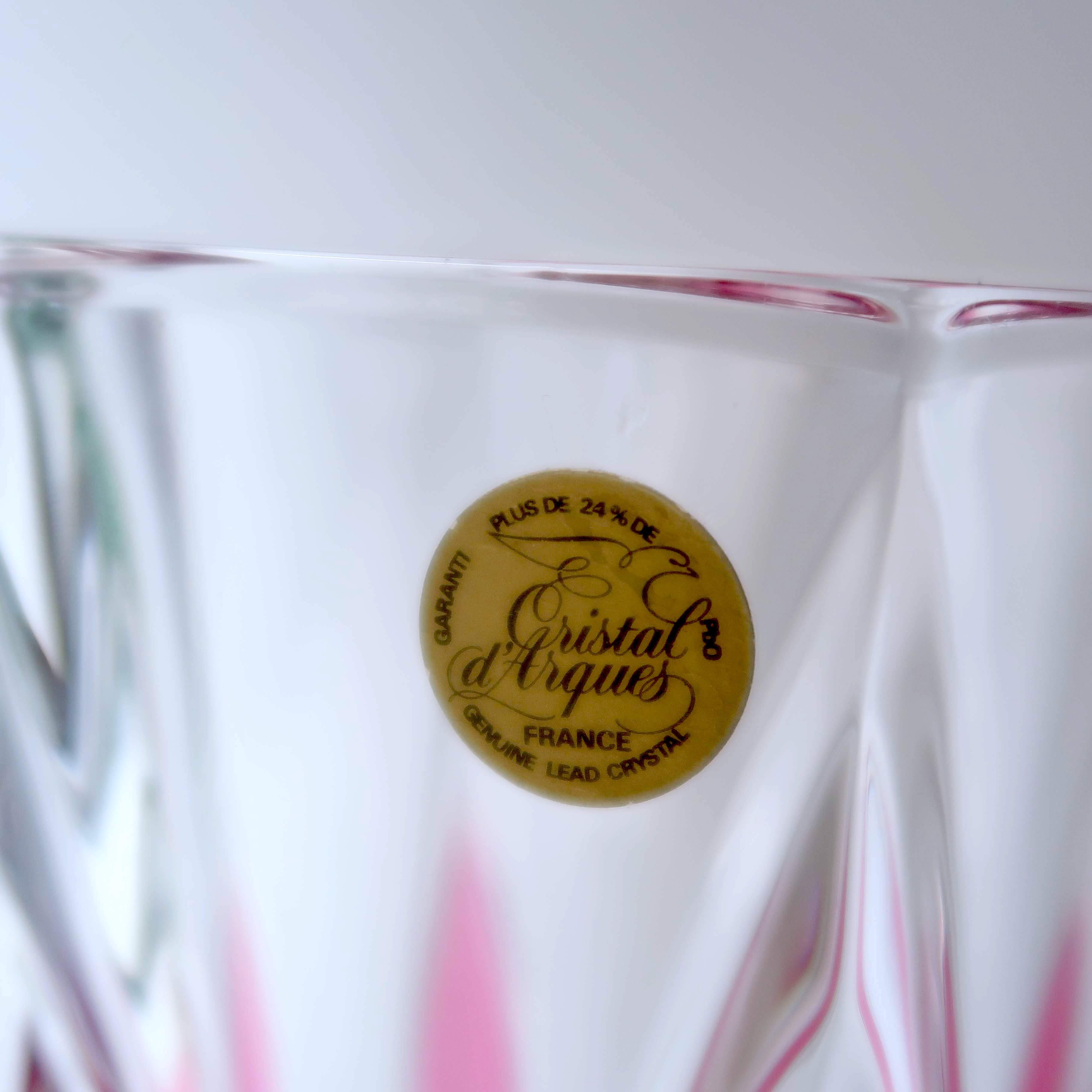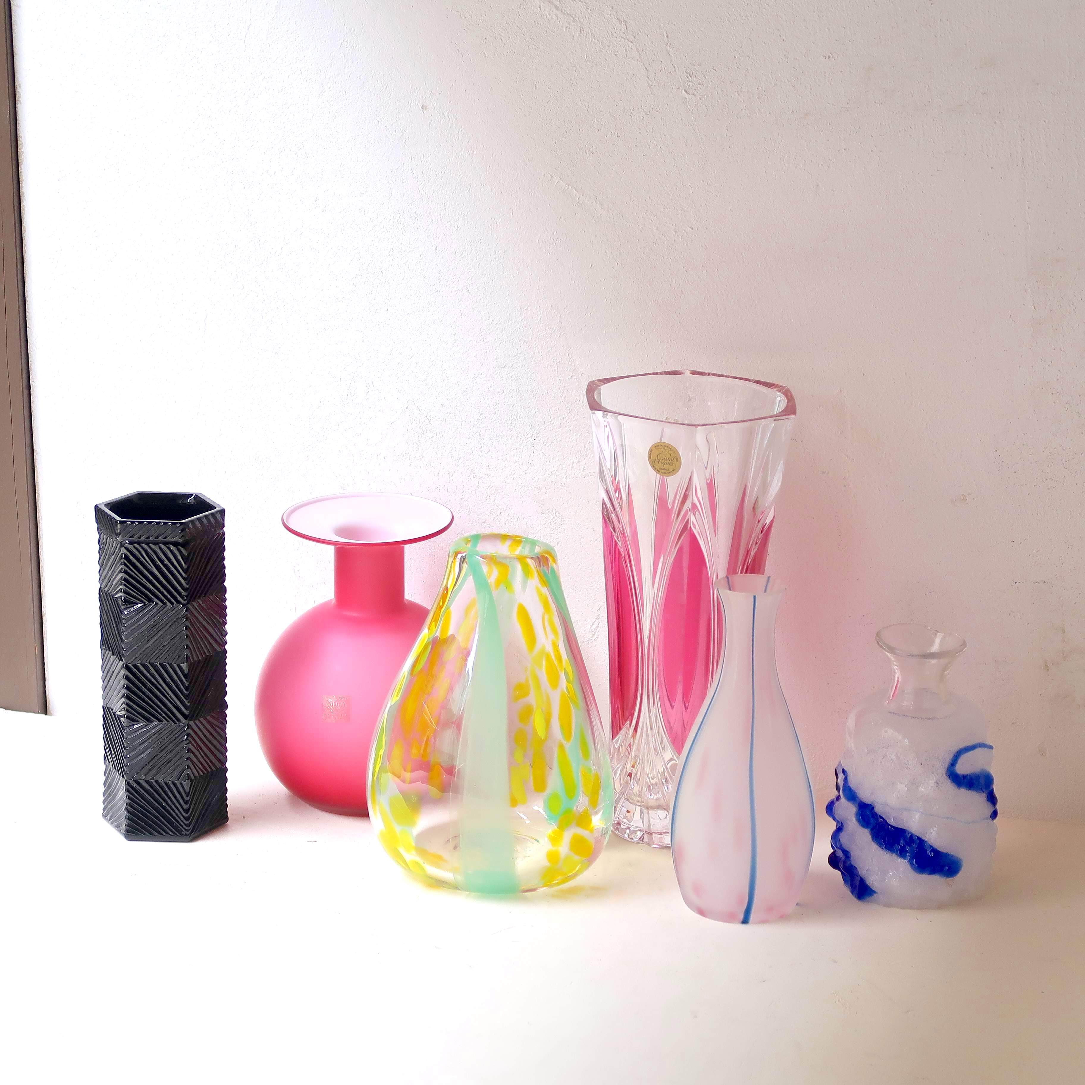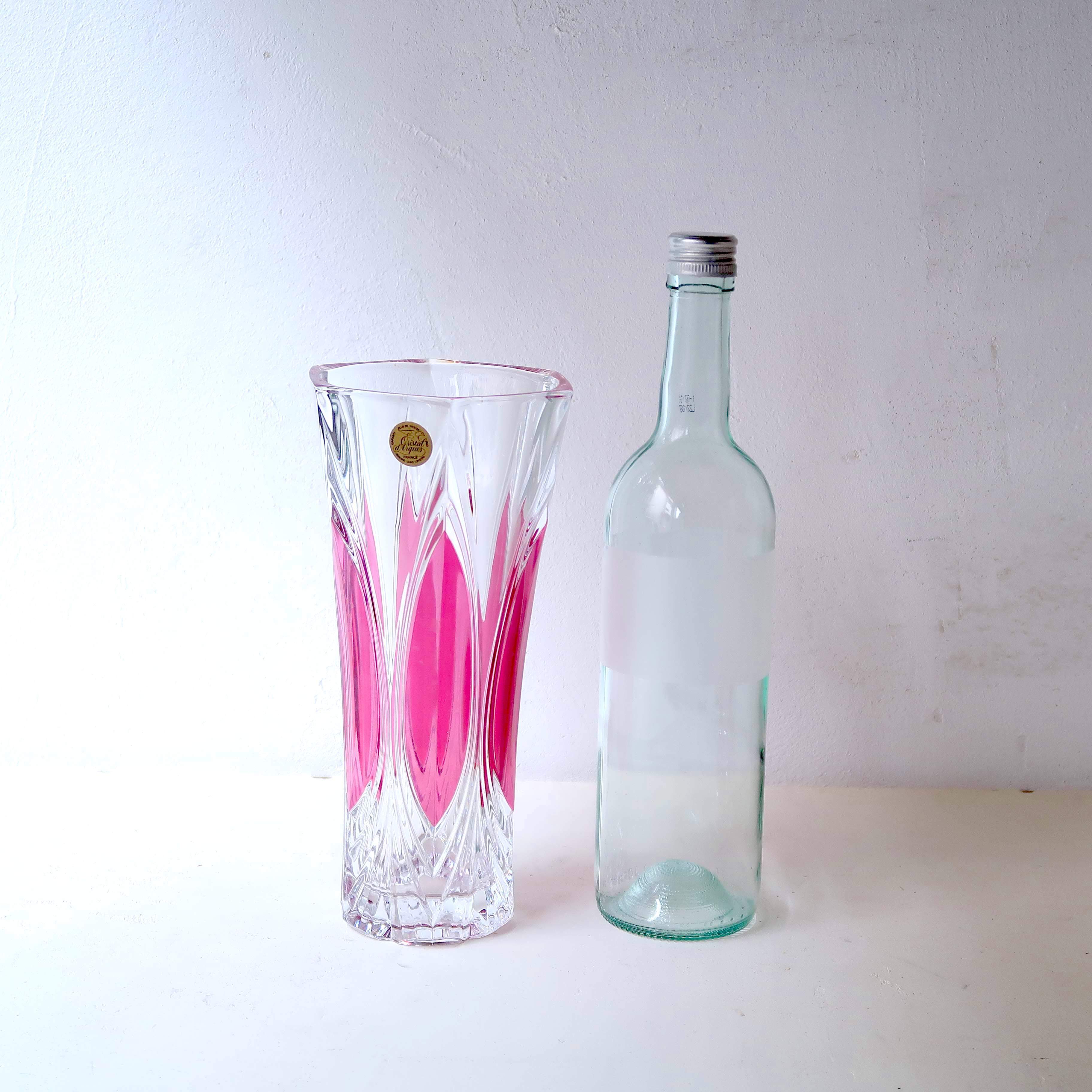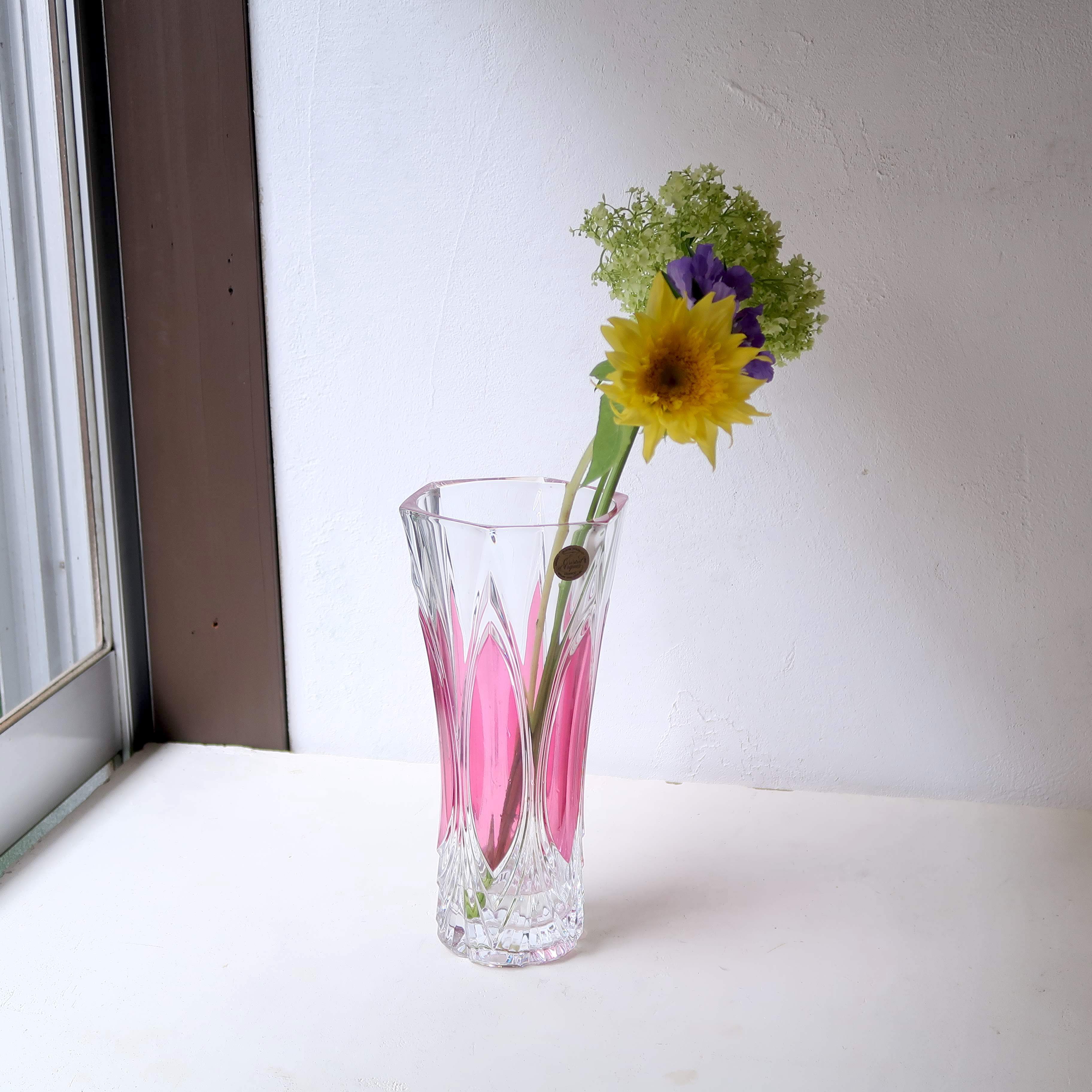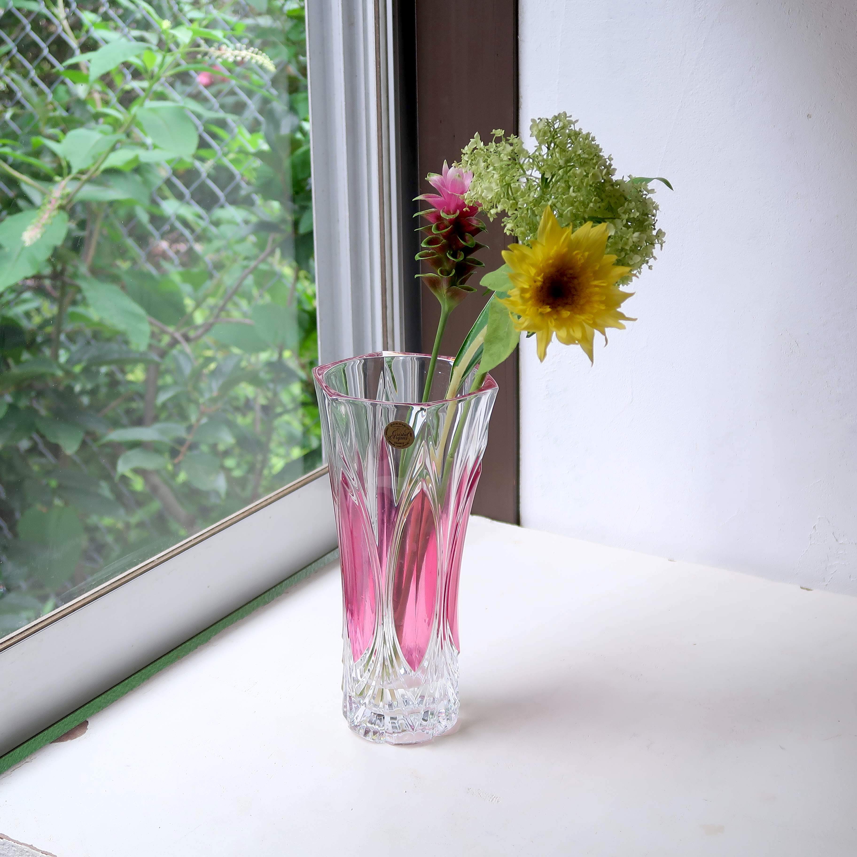 透明のガラスに、きらっとカッティング模様の入った花瓶。ところどころピンクで、ちょっぴり華やか。高さもあるので、たっぷり飾れます。