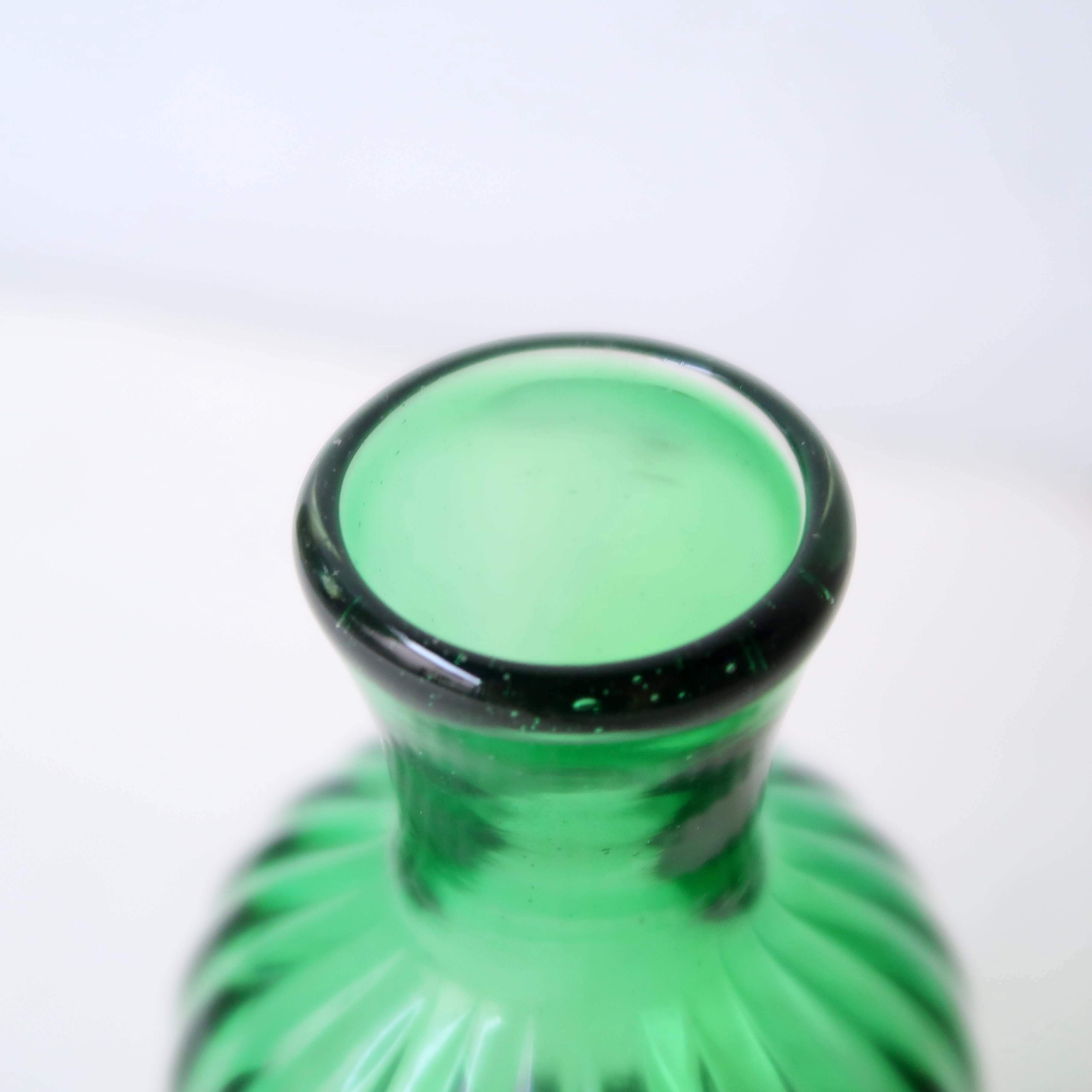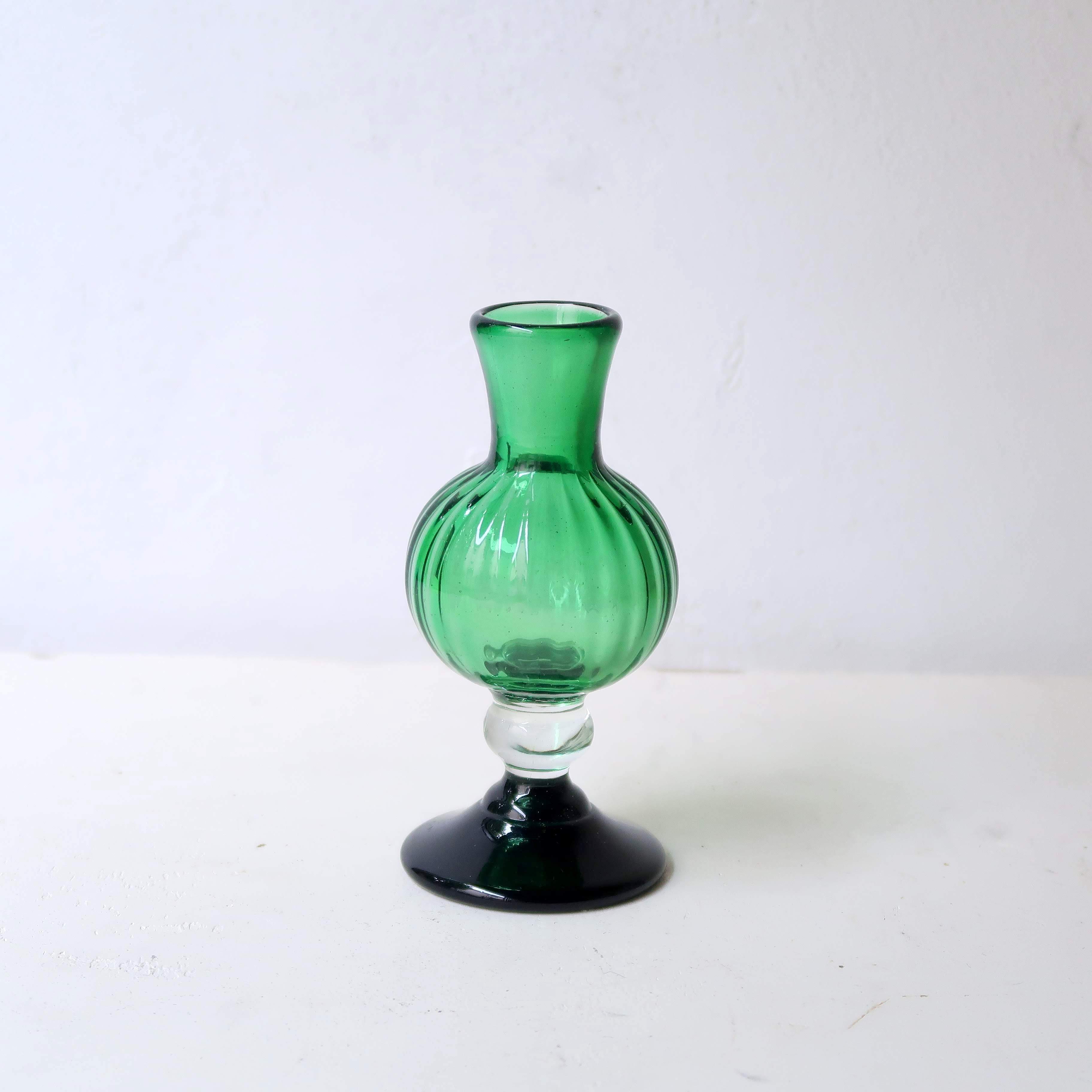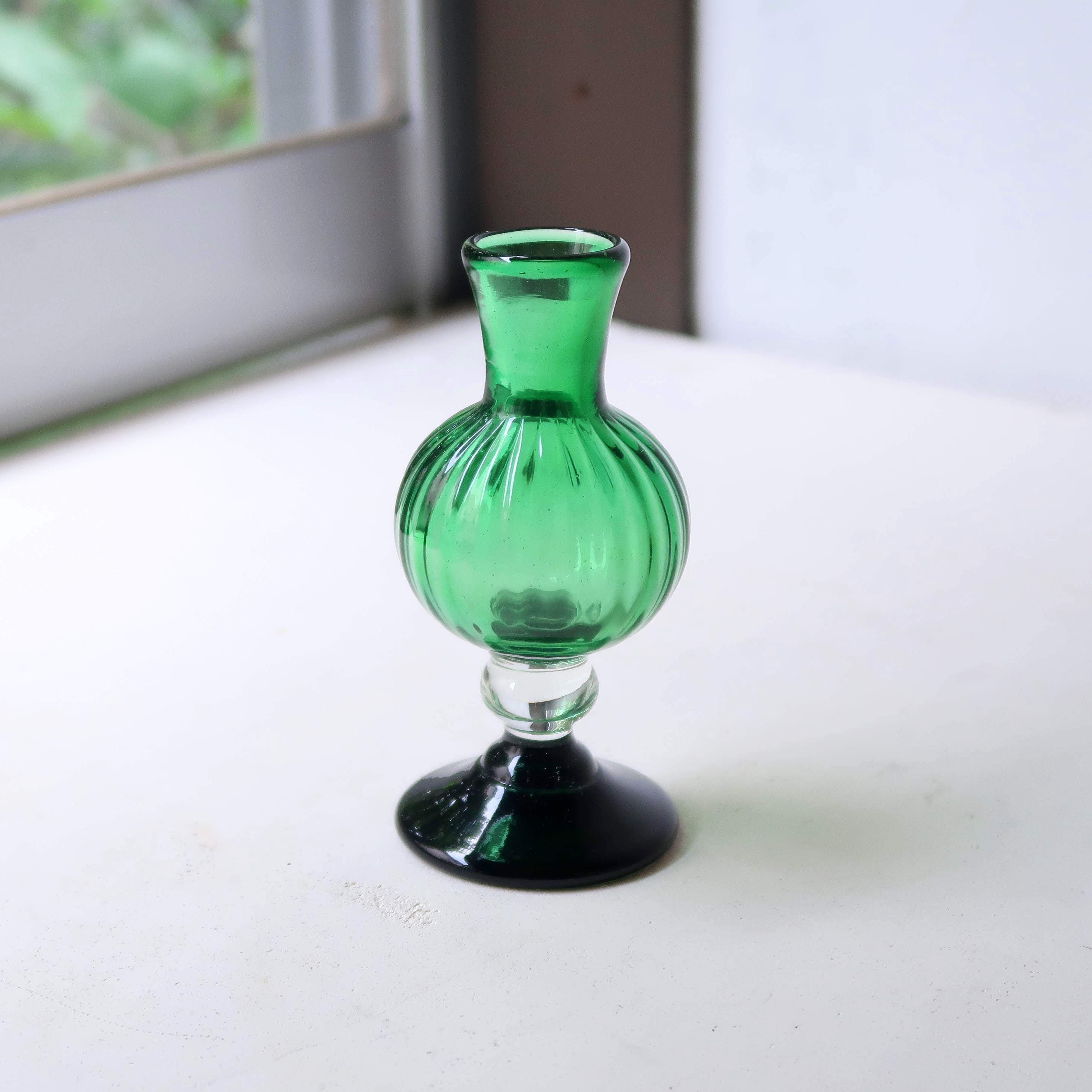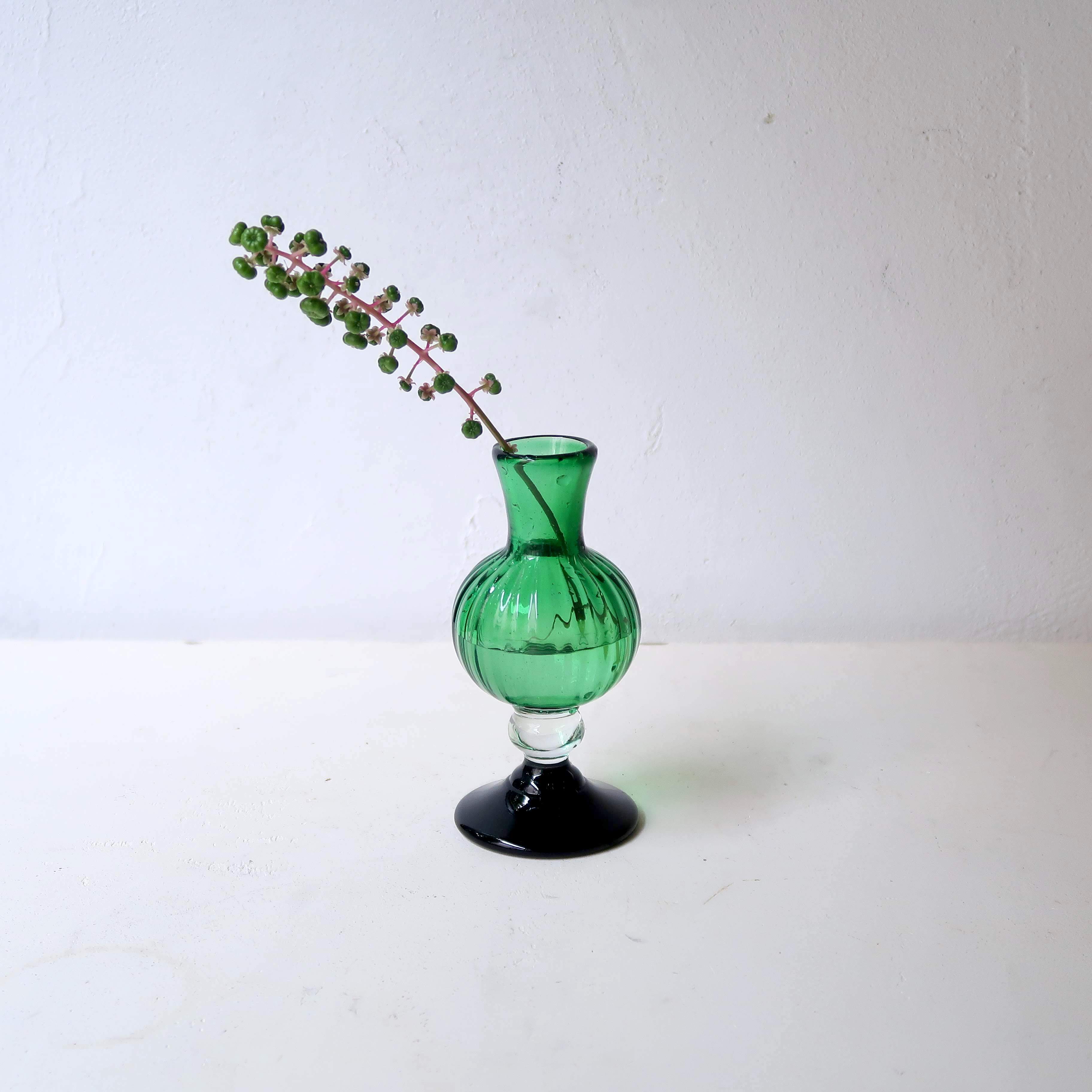 グリーンのガラスに、とうめいのまる、濃いグリーンの足。鮮やかなグリーンのカラーは、目を引くアクセント。つみきのようなかたちが組み合わさった小さなフラワーベースです。