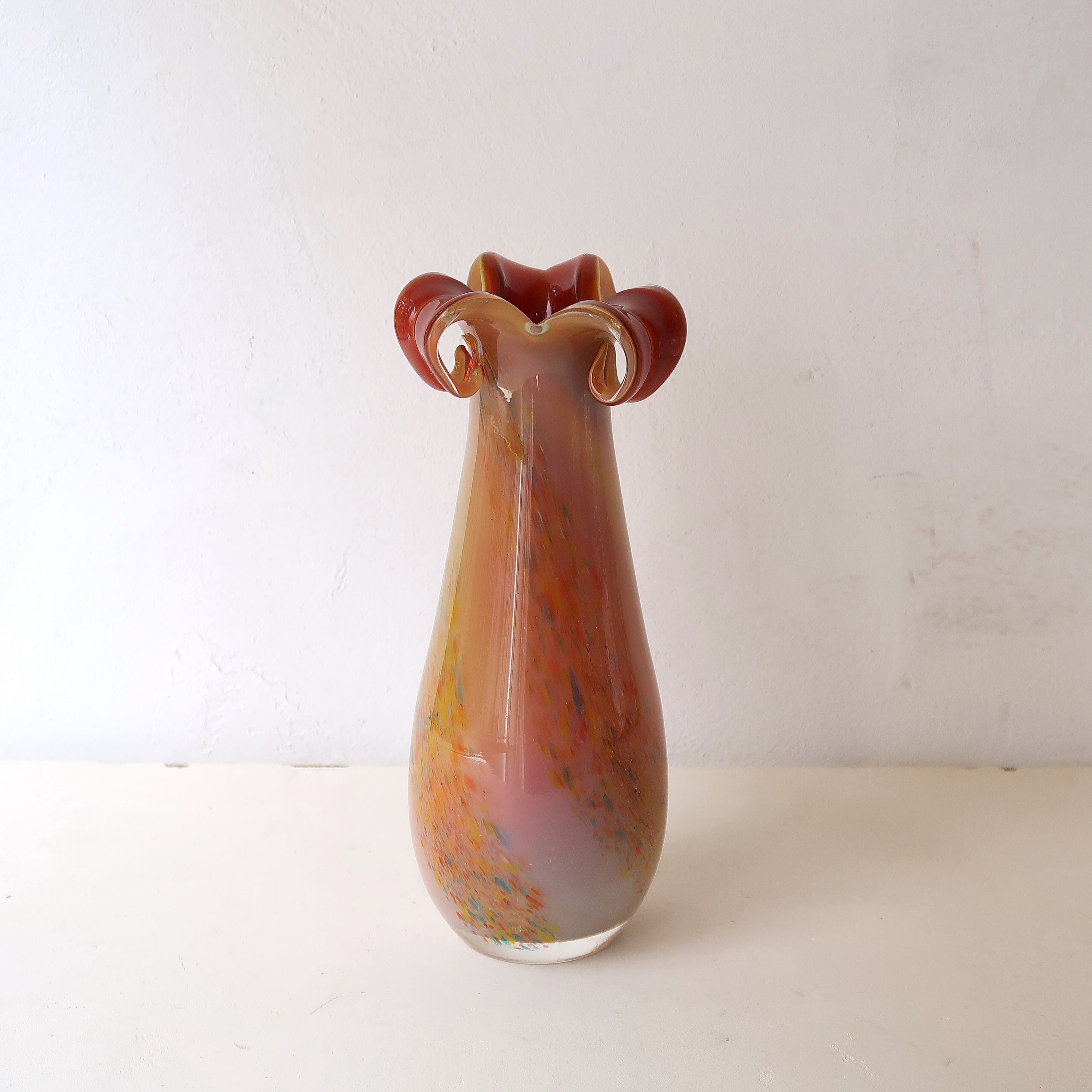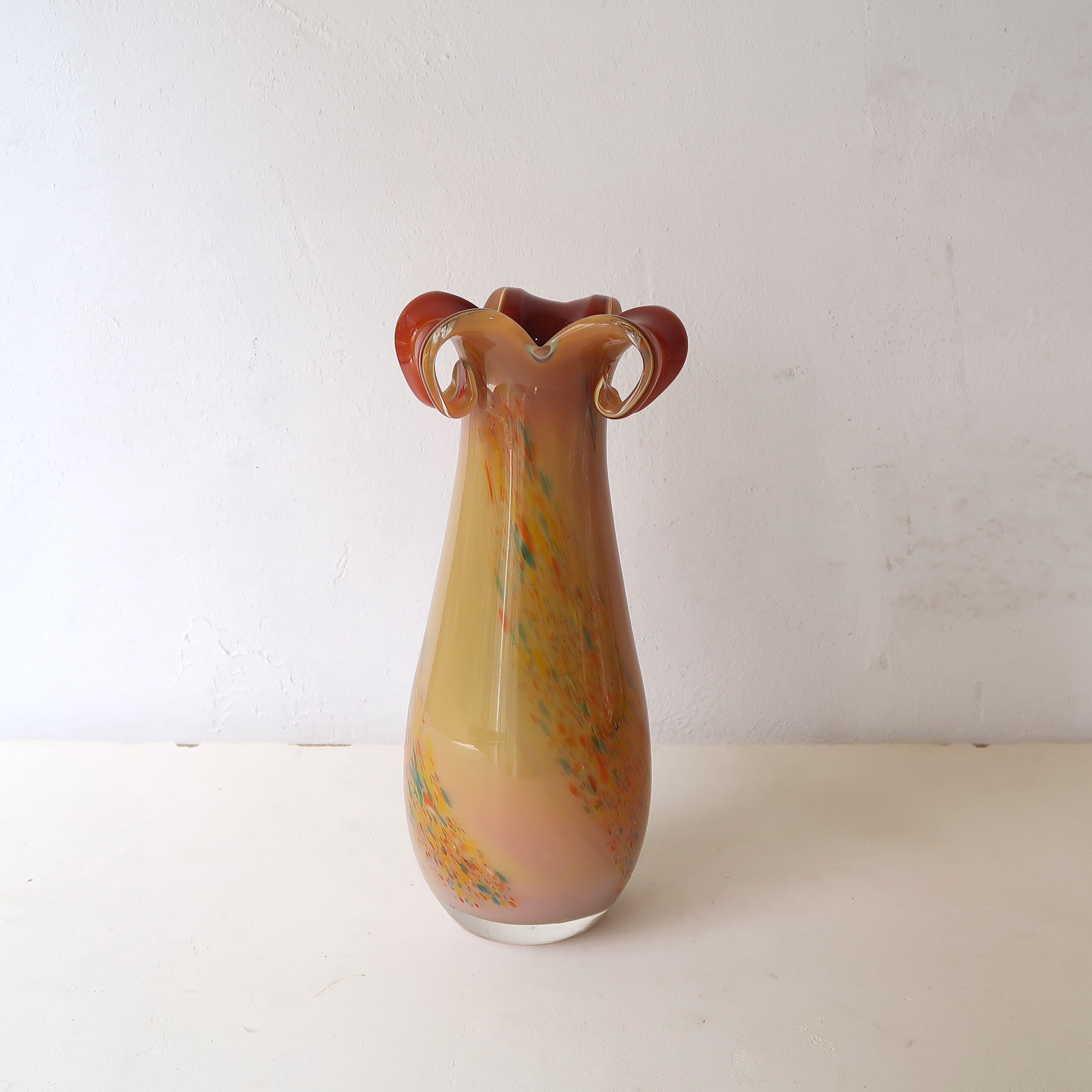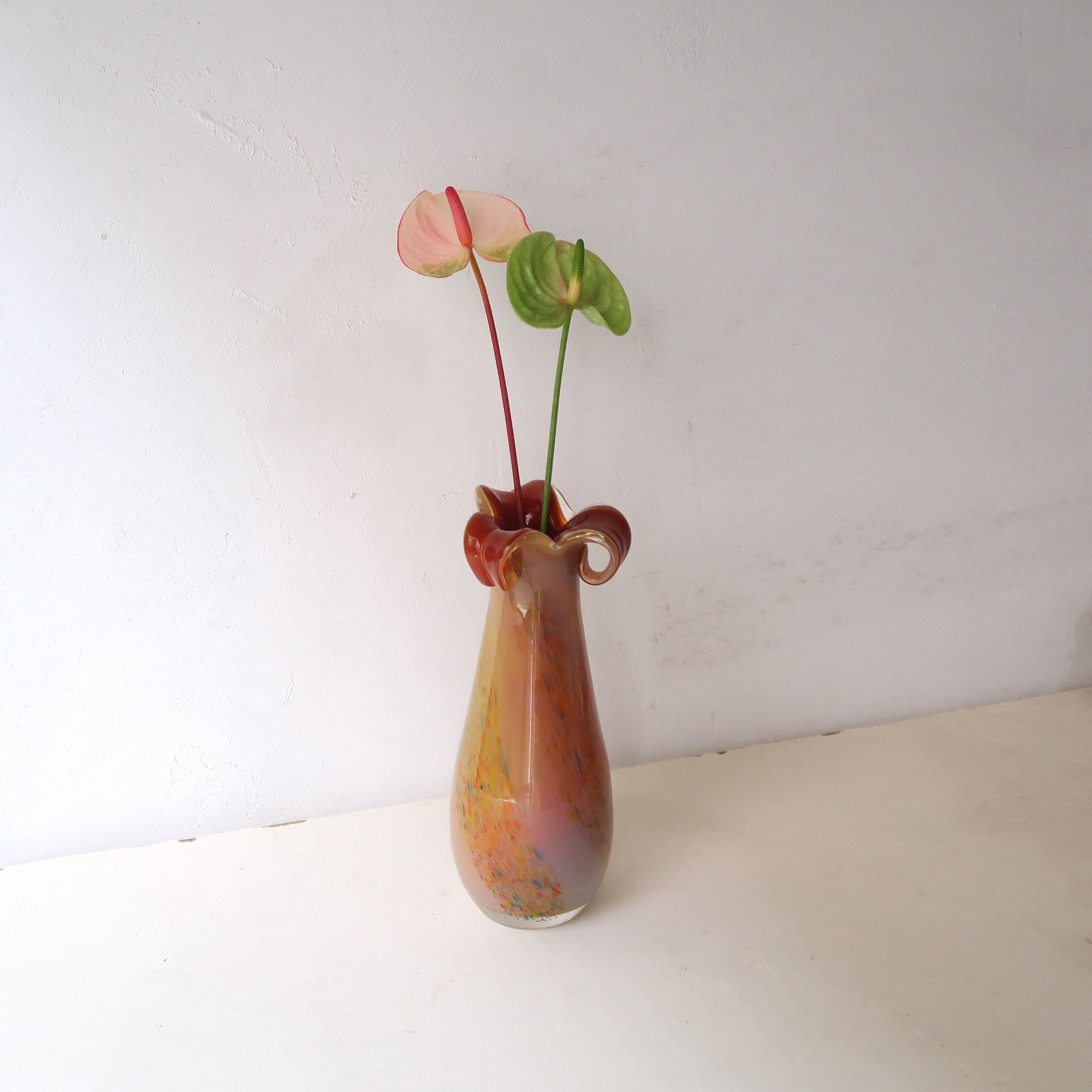 内側はテラコッタ、外側は透明のような乳白色のような。そのなかに、オレンジやブルー、イエローのマーブルがぐるりとあしらわれているフラワーベース。ふちは、ユリのようにくるっと咲いたかたちをしています。うちと外の境目が見えて、おもしろい。