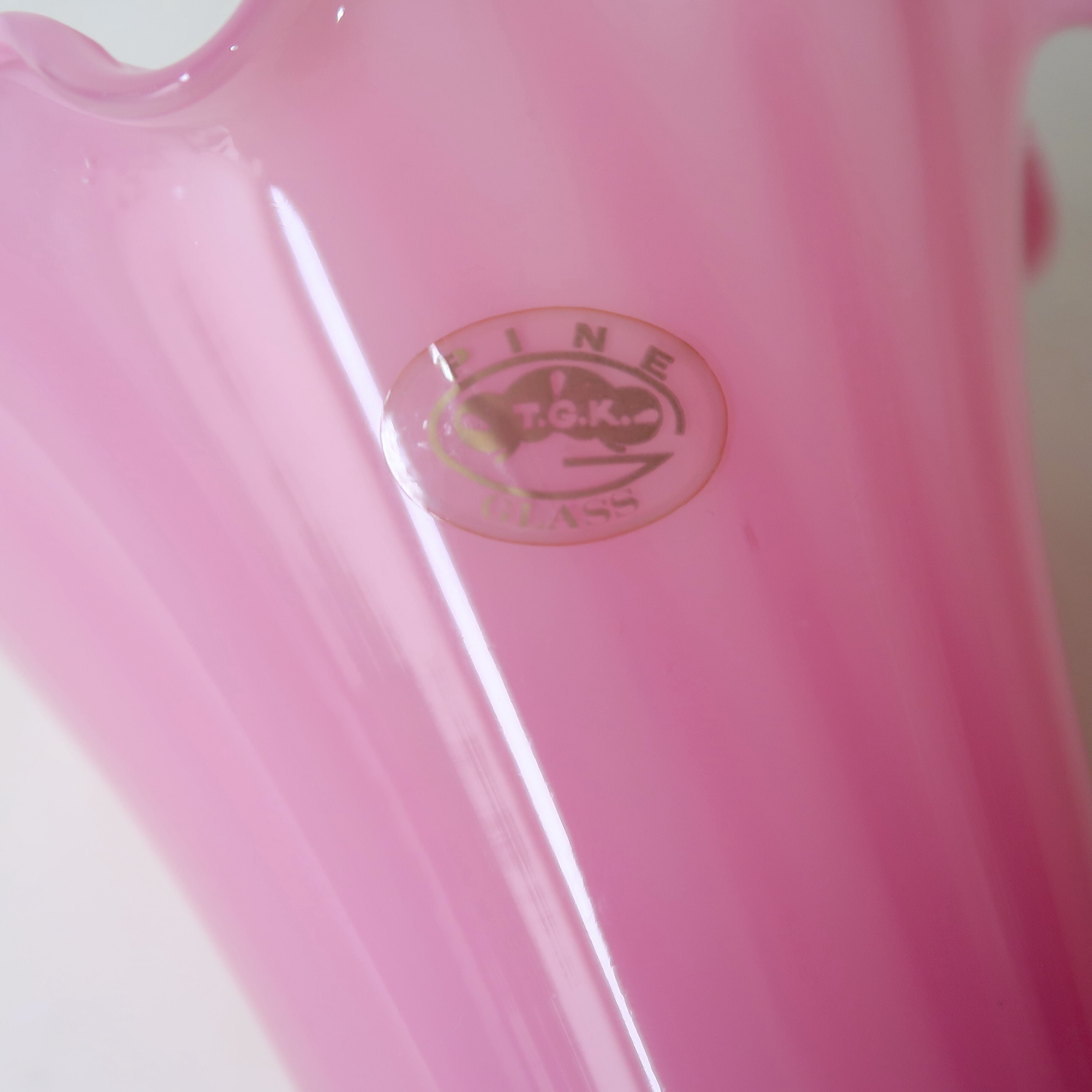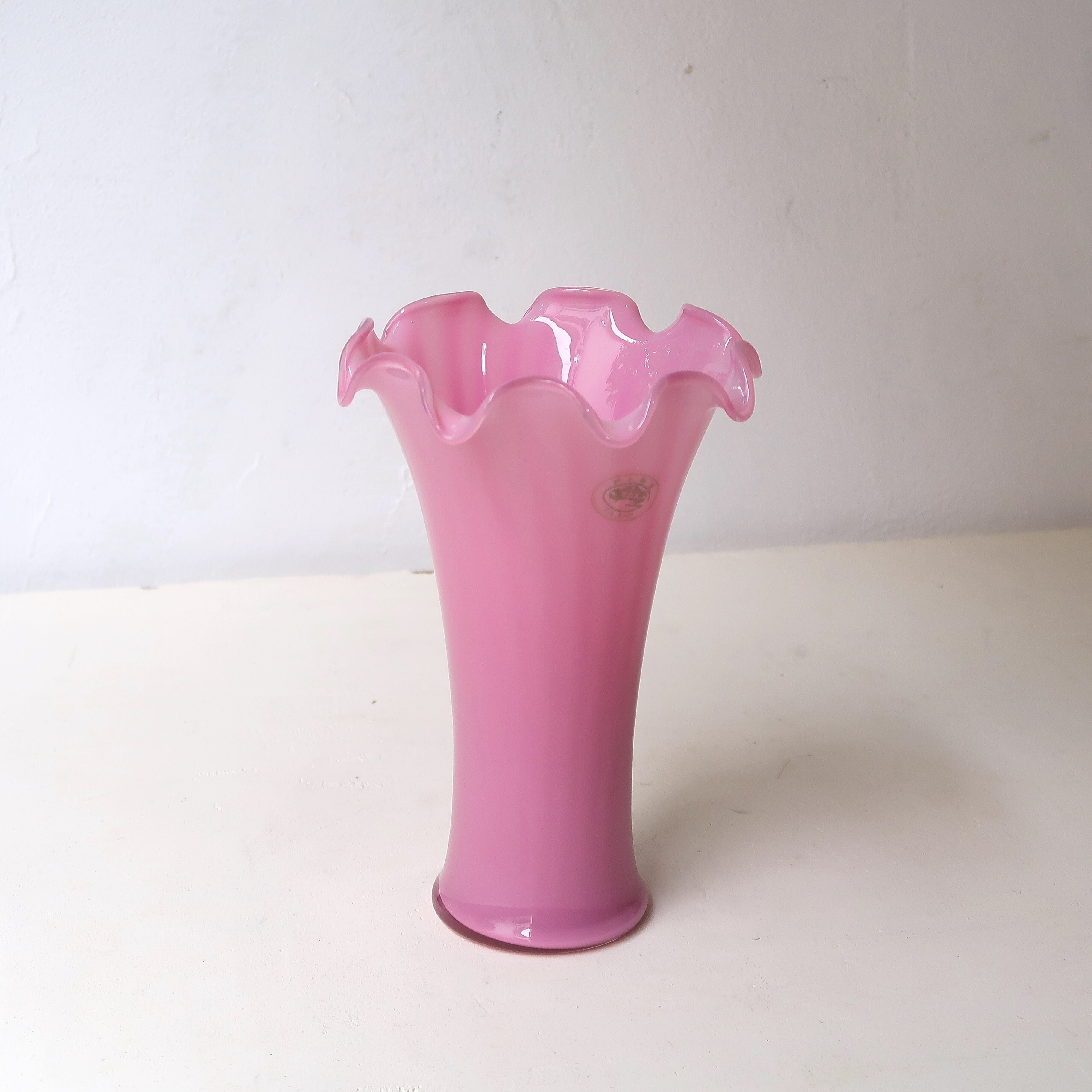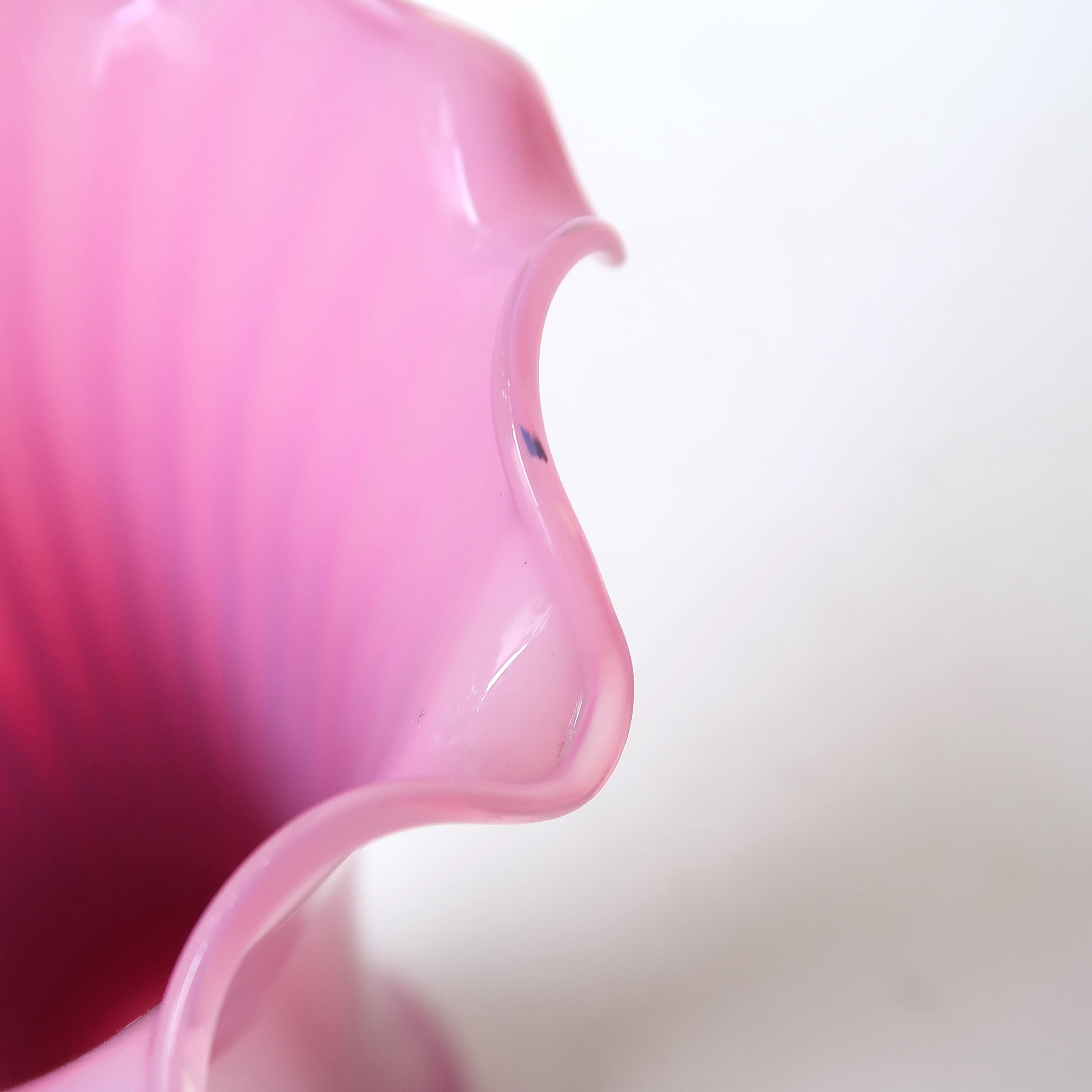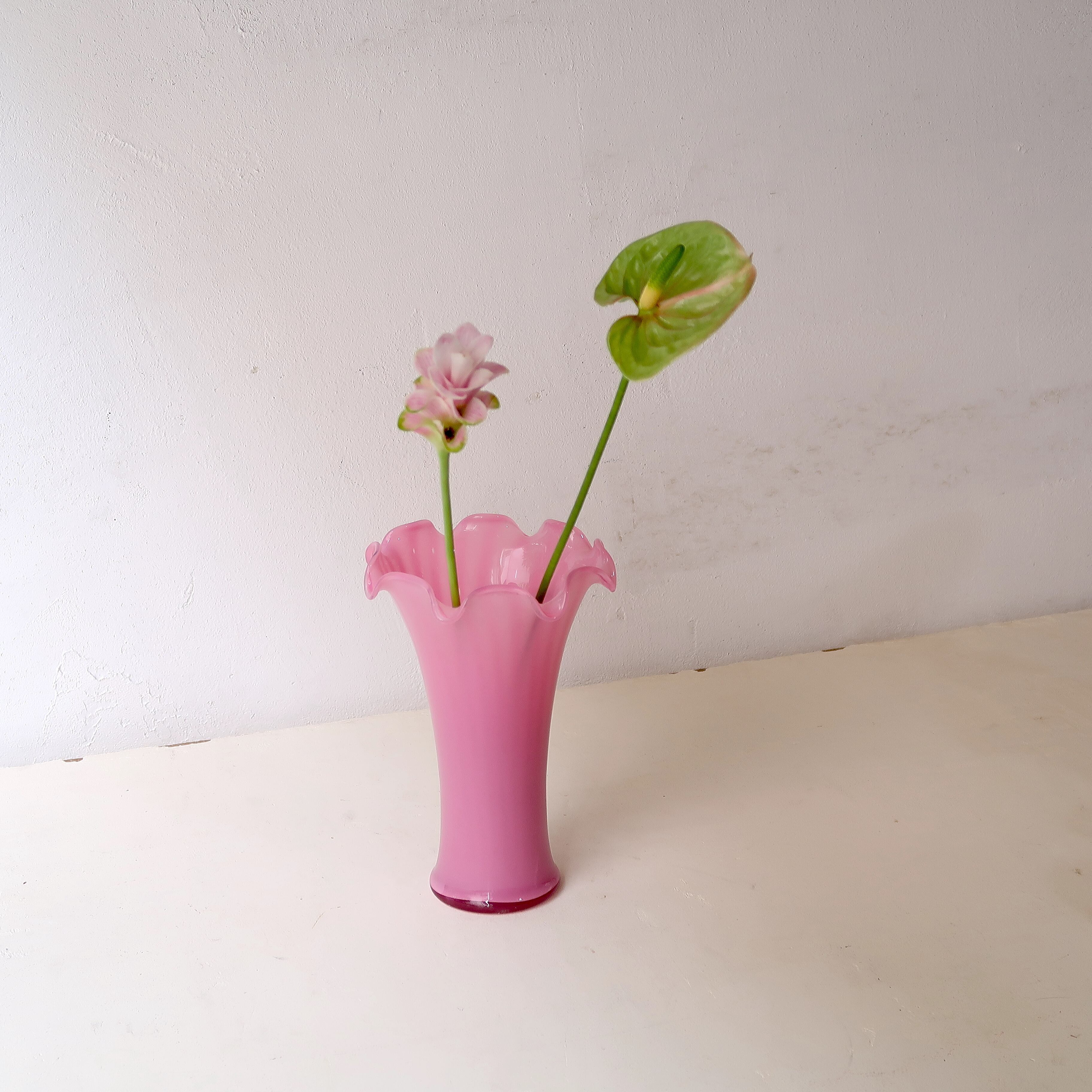 深いピンクに、ストライプの入ったフラワーベース。ふちは、しずくが落ちるようなひらひらとしたかたち。内側を見ると、ストライプがブルーがかったようなグレーの色合いにも見えます。