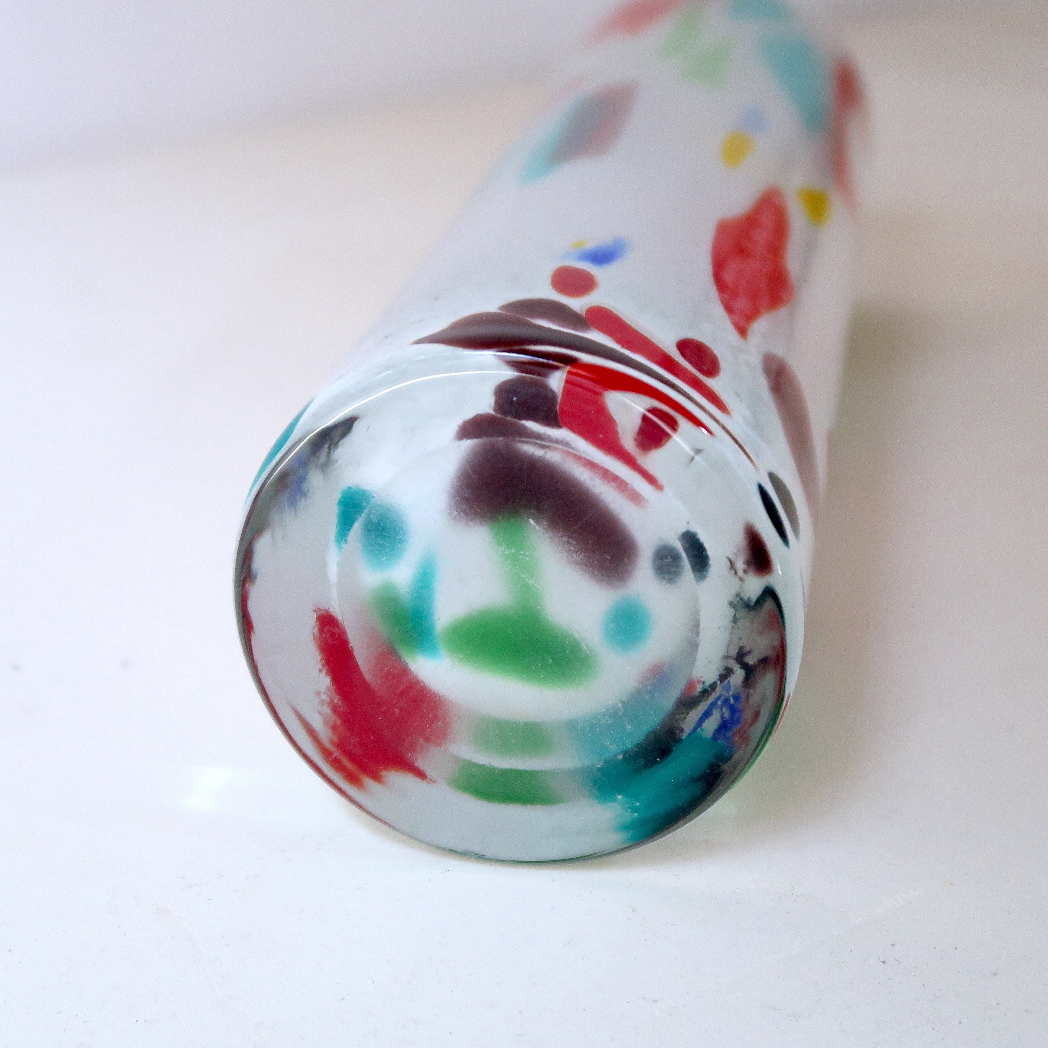 赤やオレンジ、黄色、緑、青…。カラフルなまだらのマーブルは、まるでプールに浮かぶうきわのような模様で、たのしげ。よく見るとベースの白も、ふつふつとした味わいのある質感。