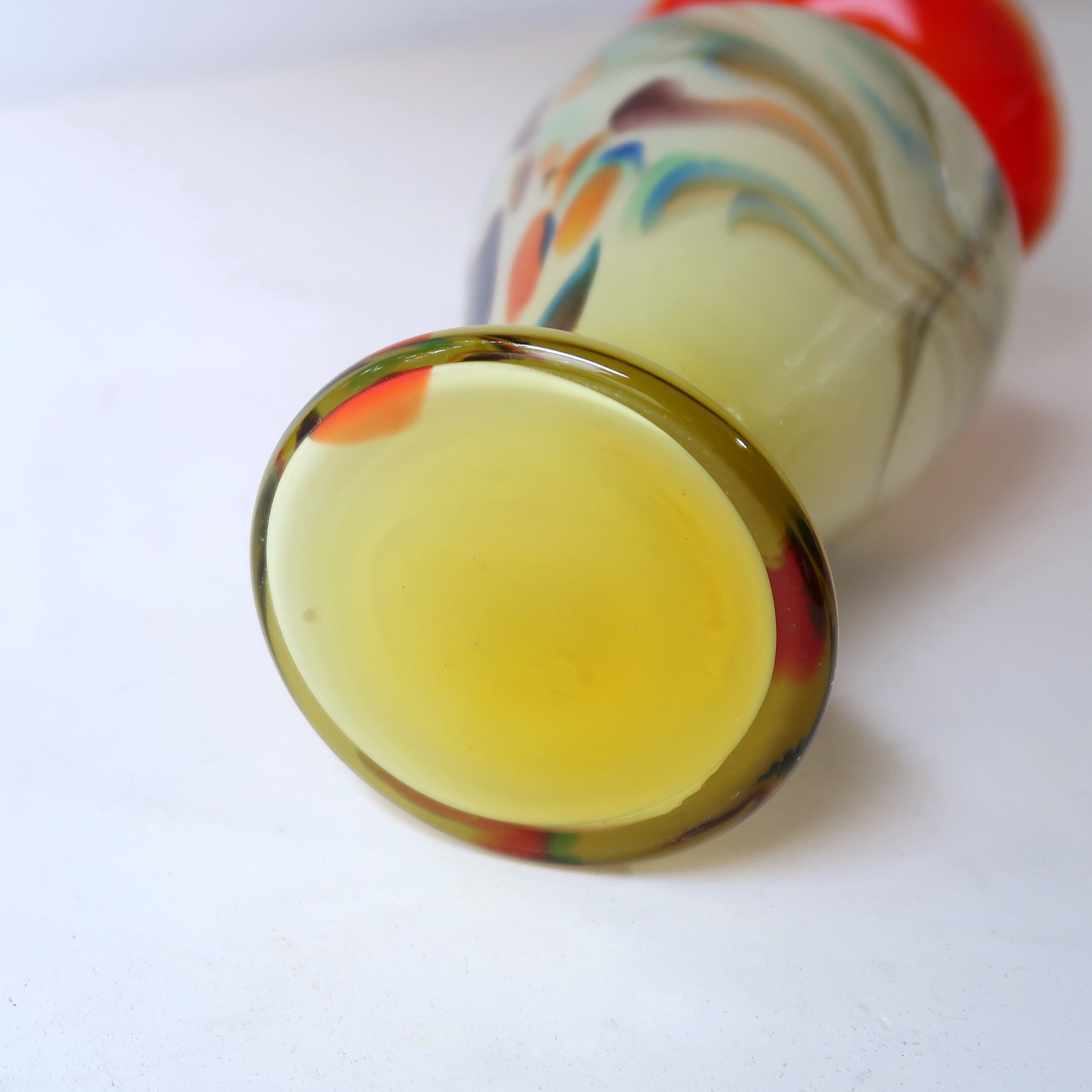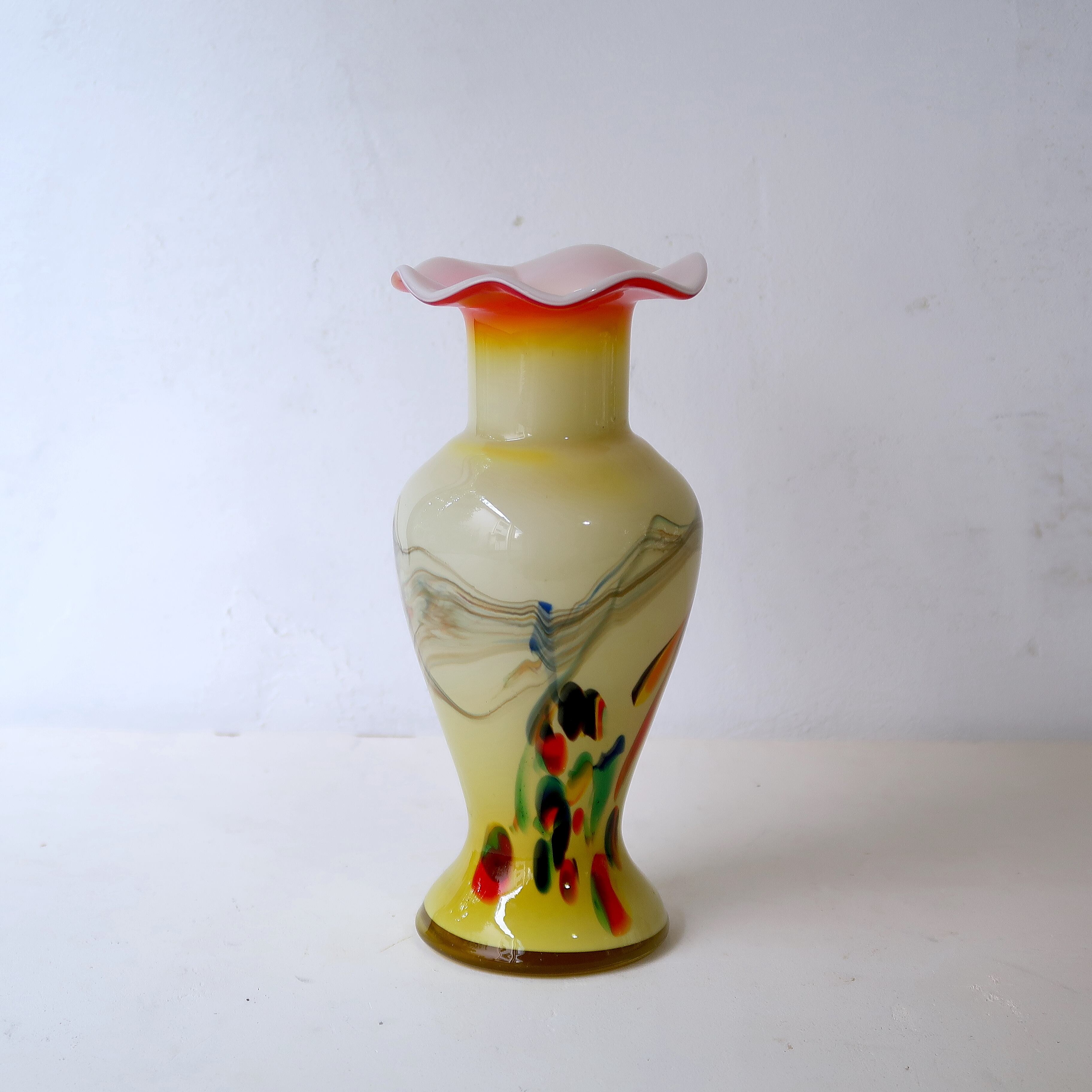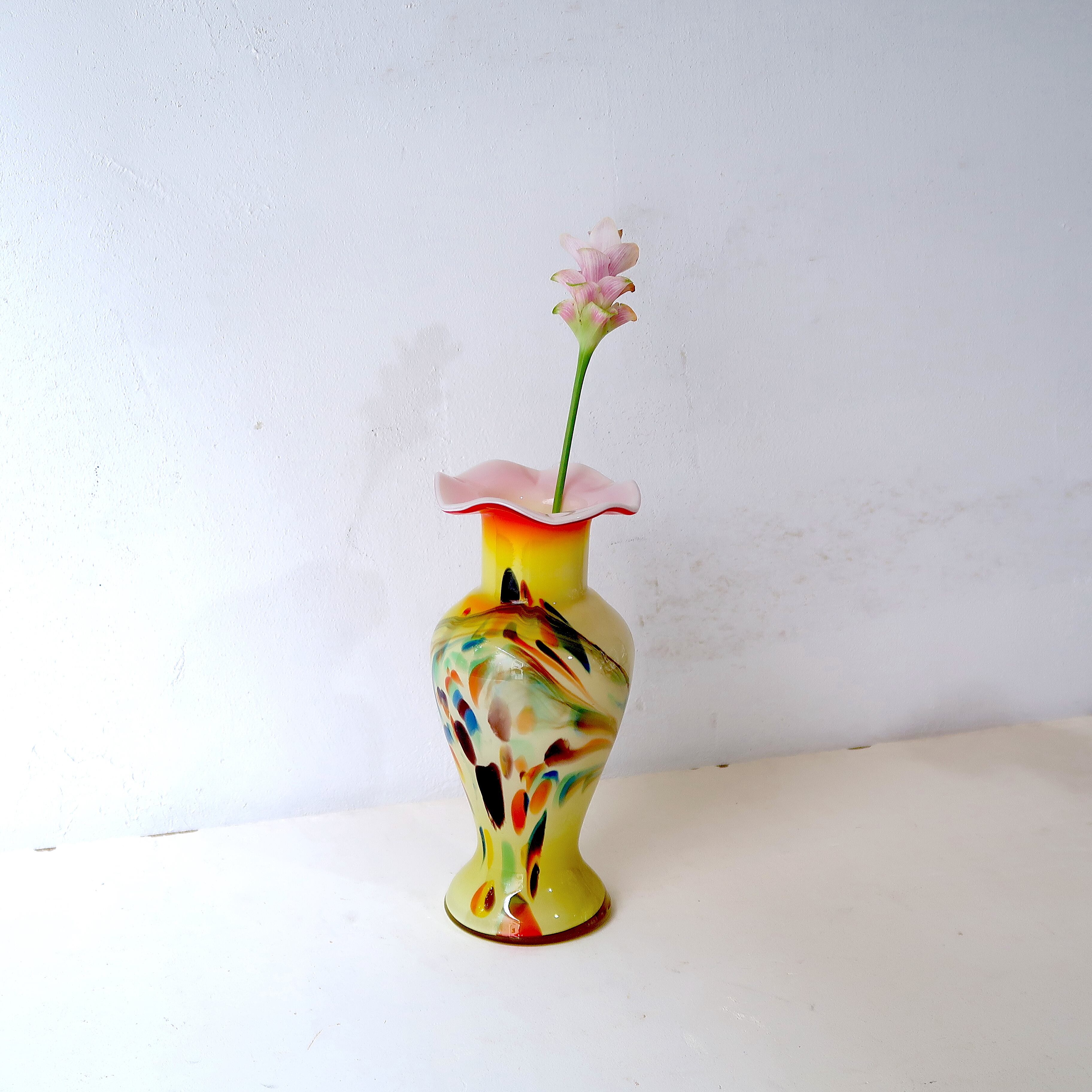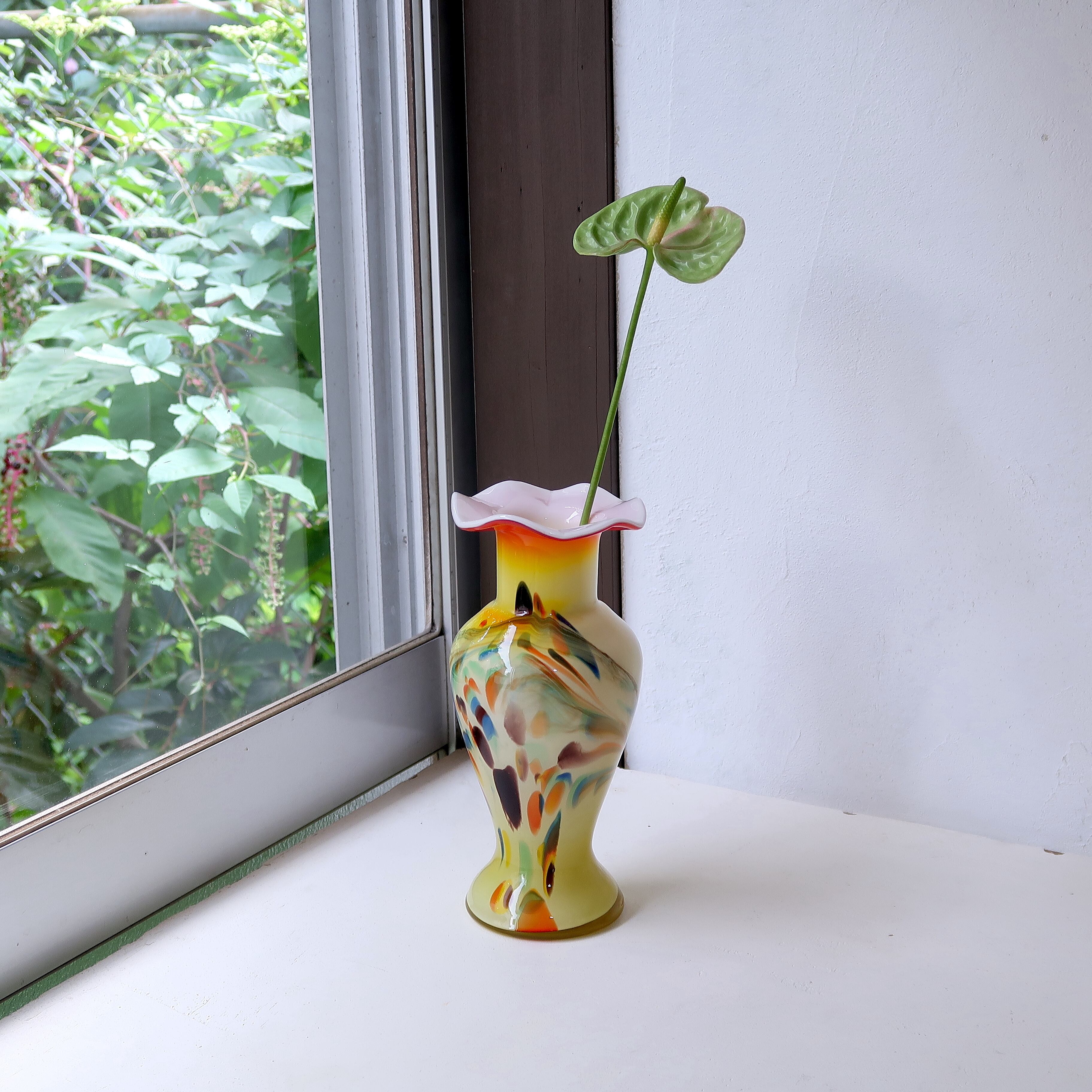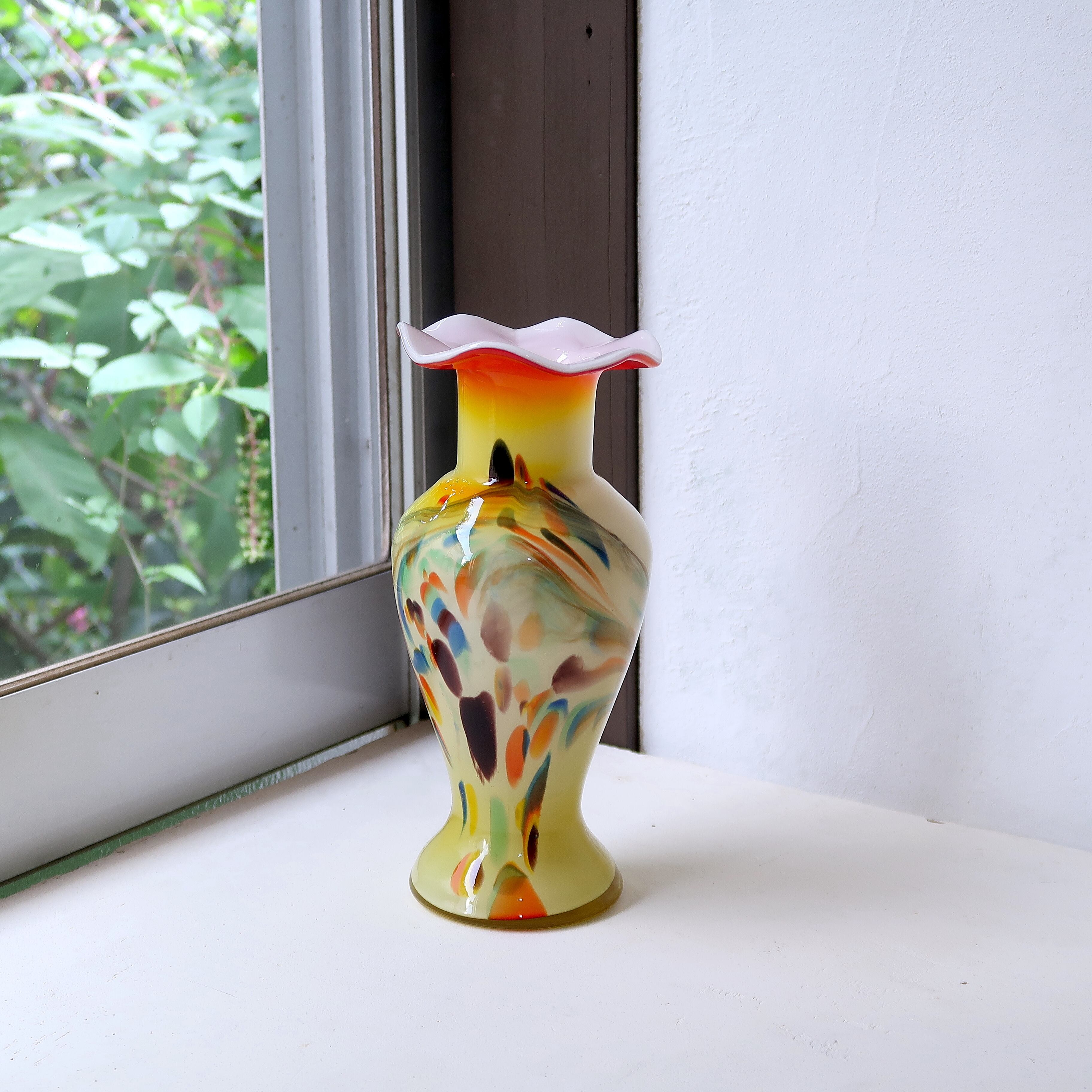 イエローベースに、パープルやオレンジ、グリーンのカラフルなまだらのマーブル。ふちのひらひらには赤が仕込まれ、上から見るとピンクに見えます。
