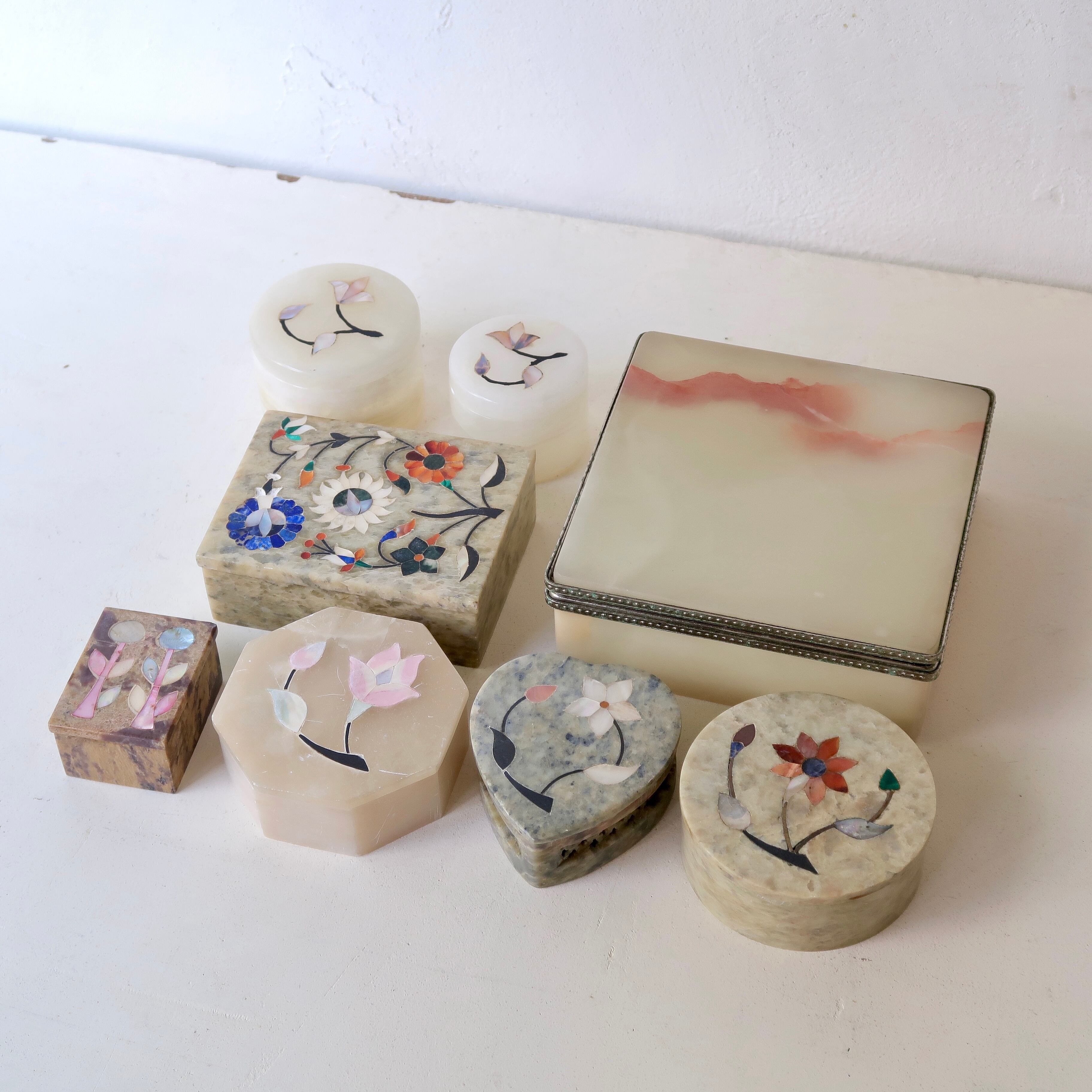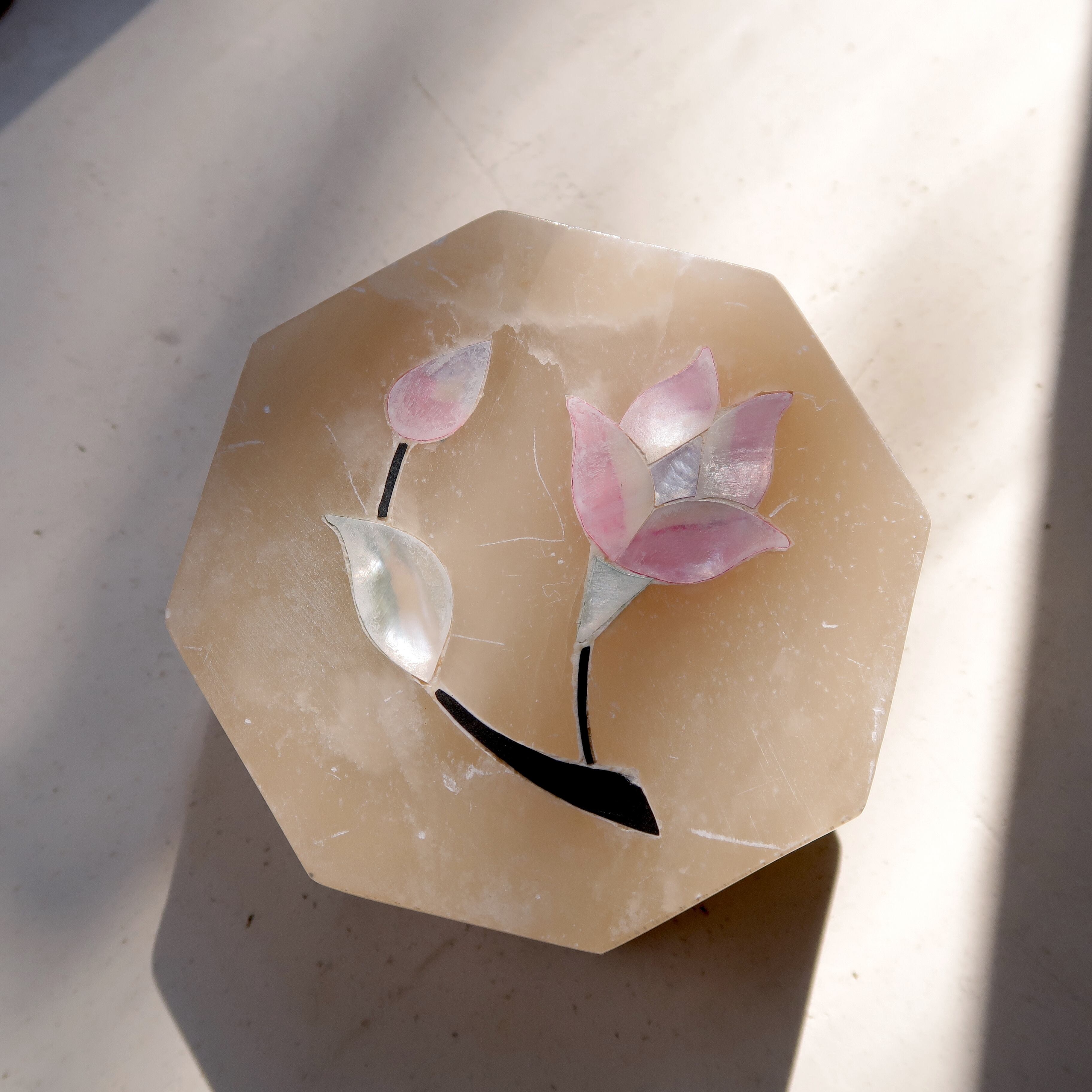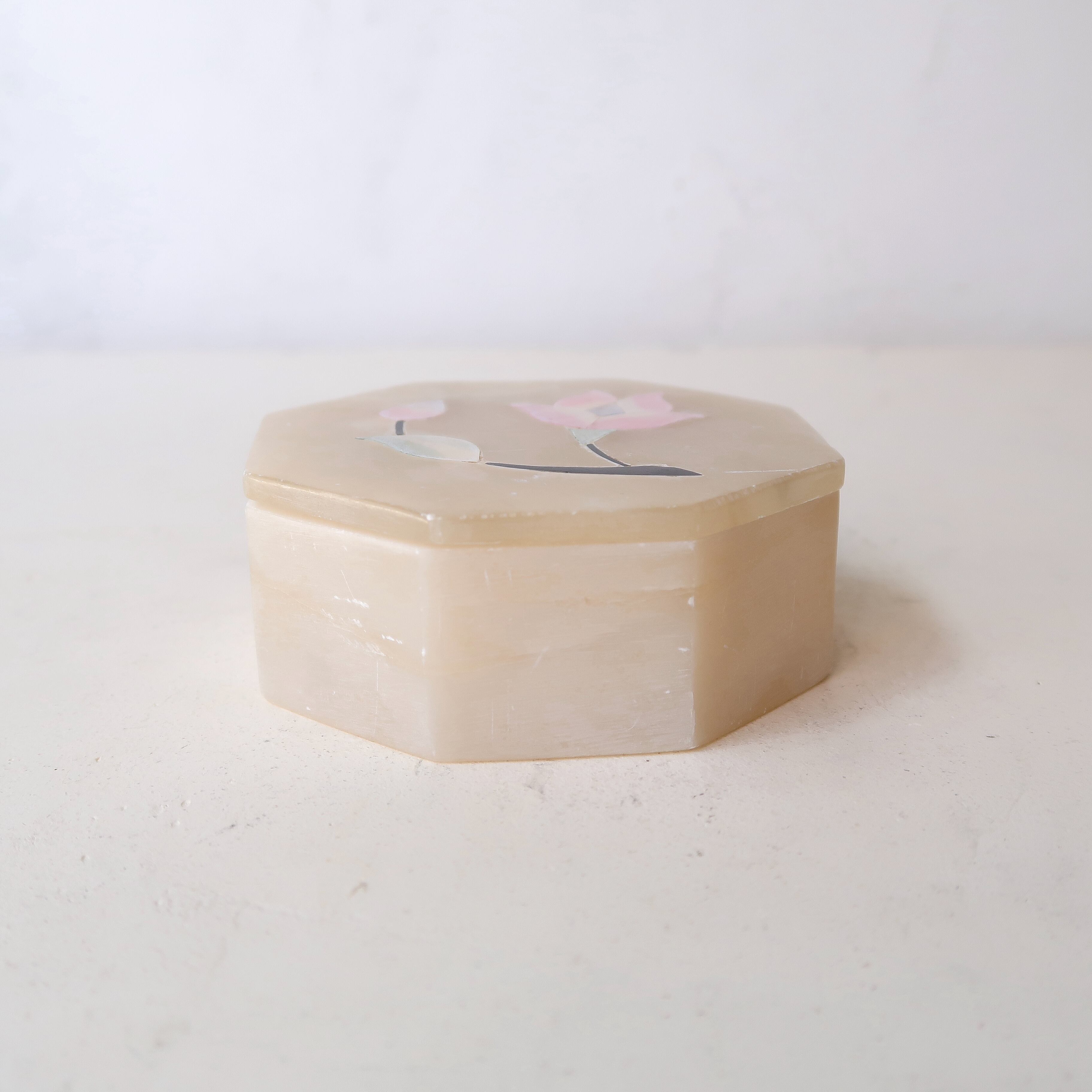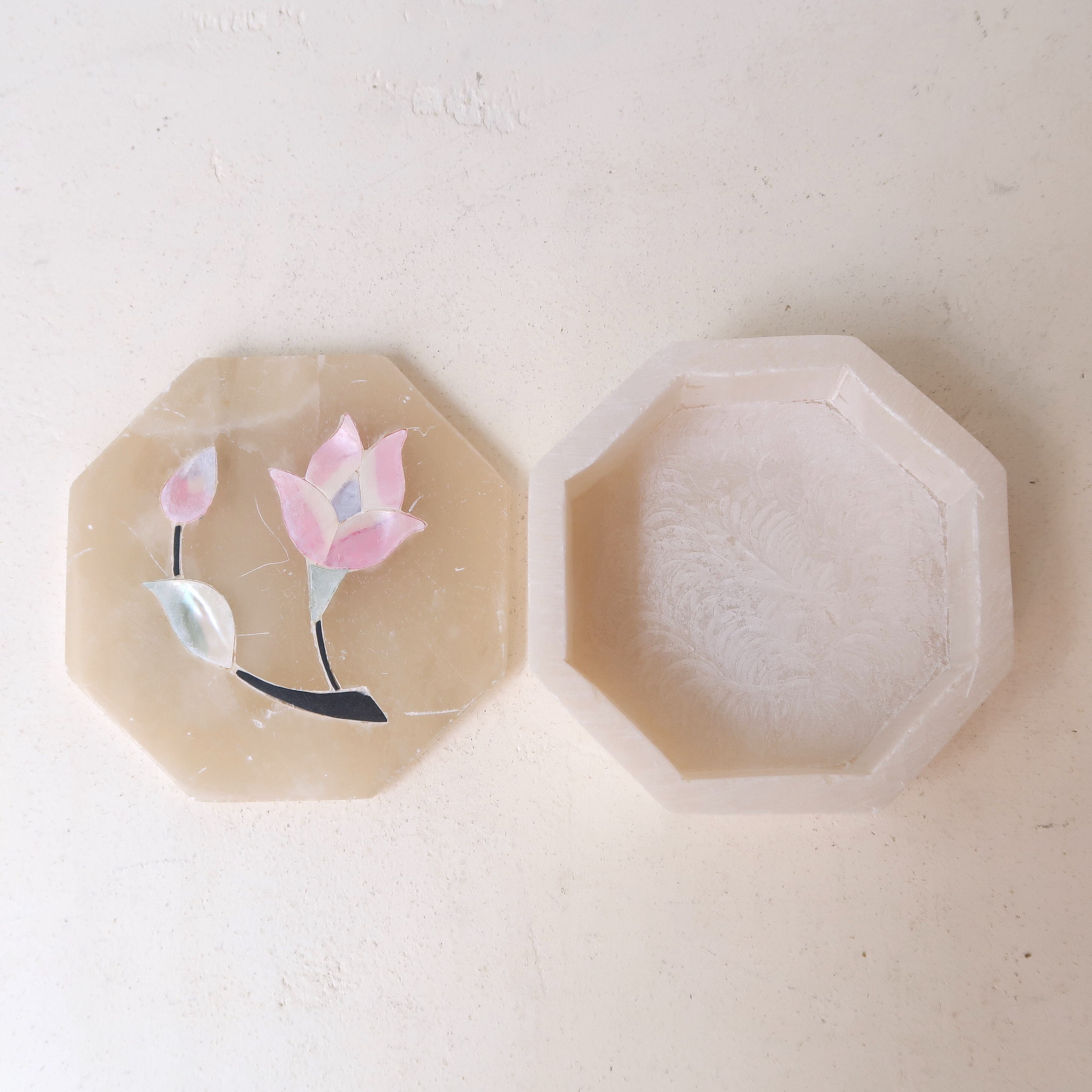 お花の象嵌がほどこされたちいさなジュエリーケース。容器は石、お花は薄くスライスされた貝殻が埋め込まれているインドのアイテムです。