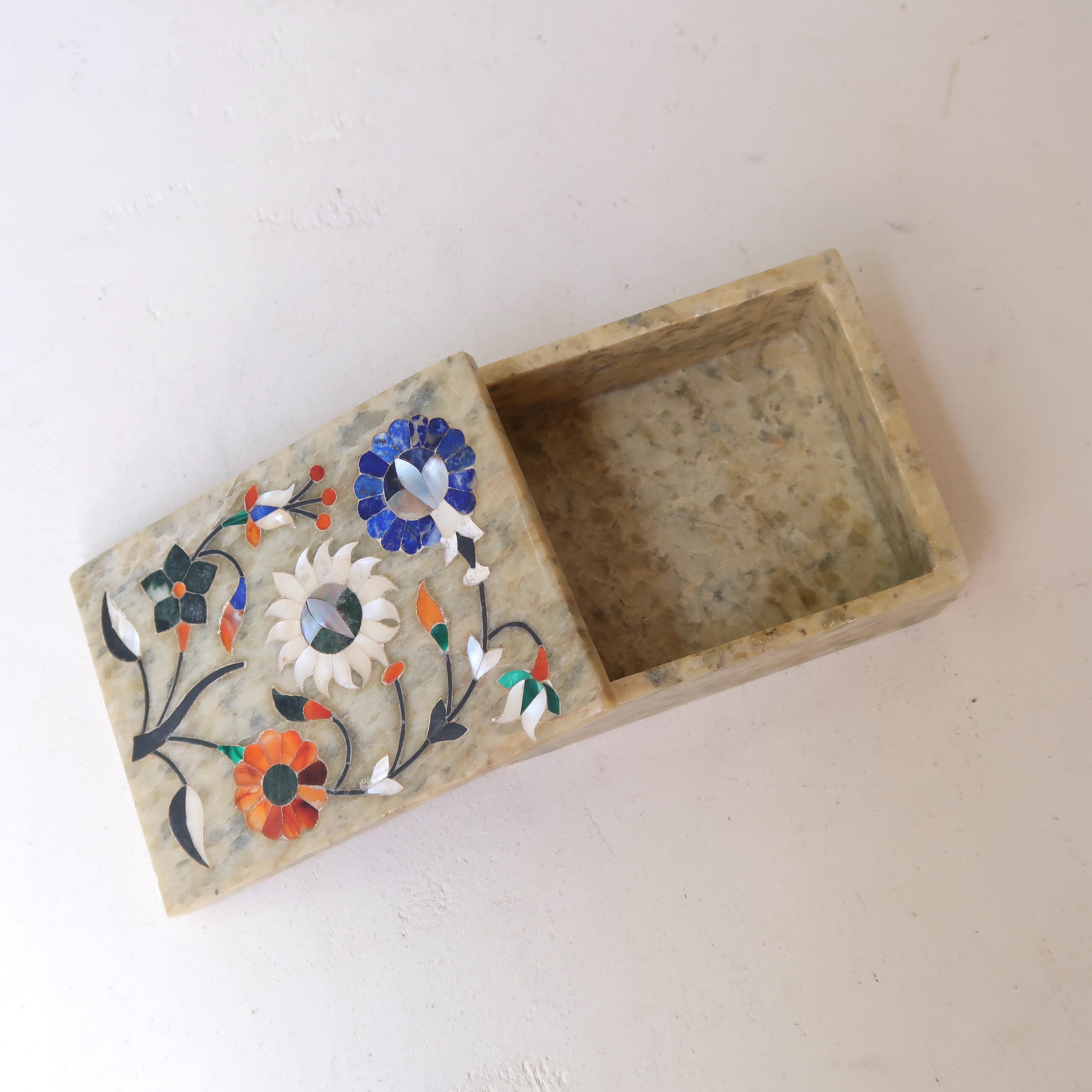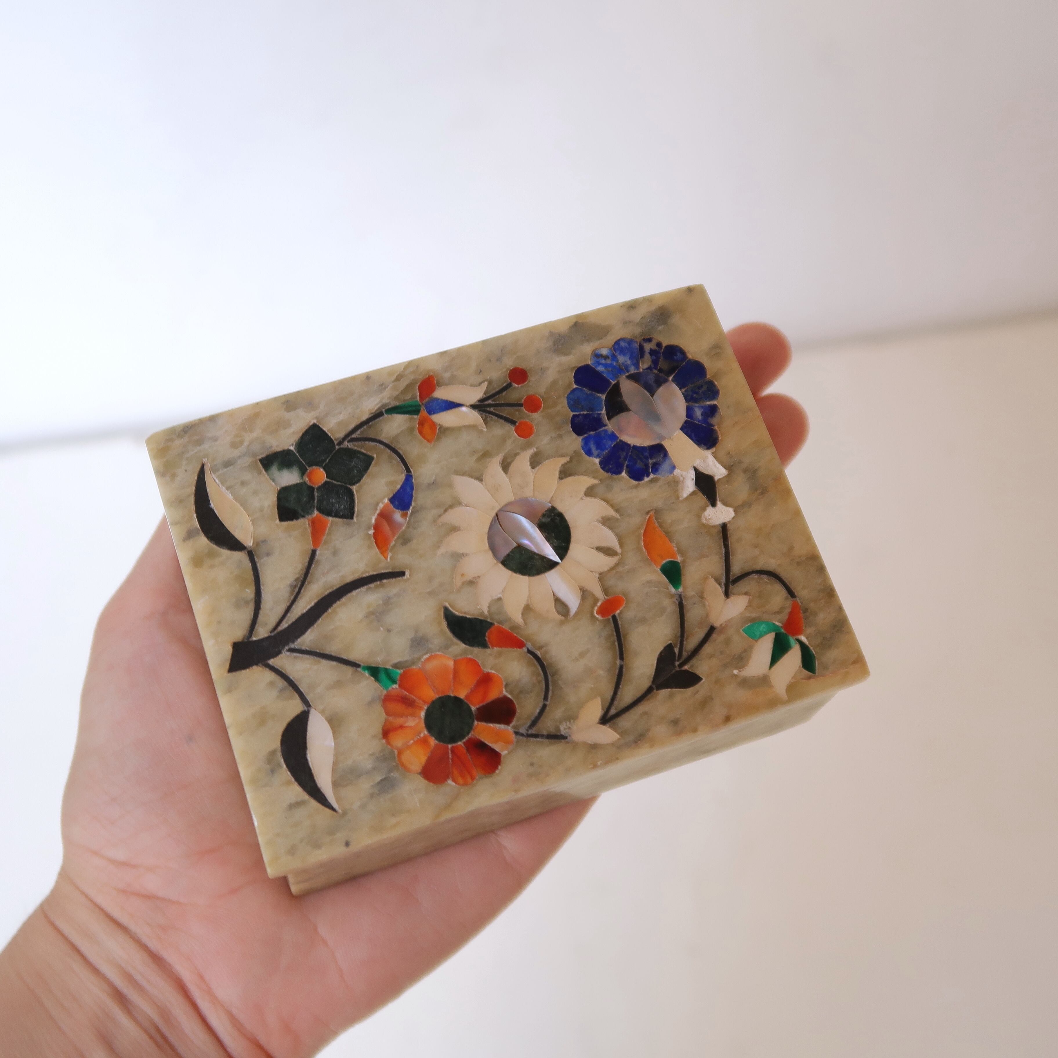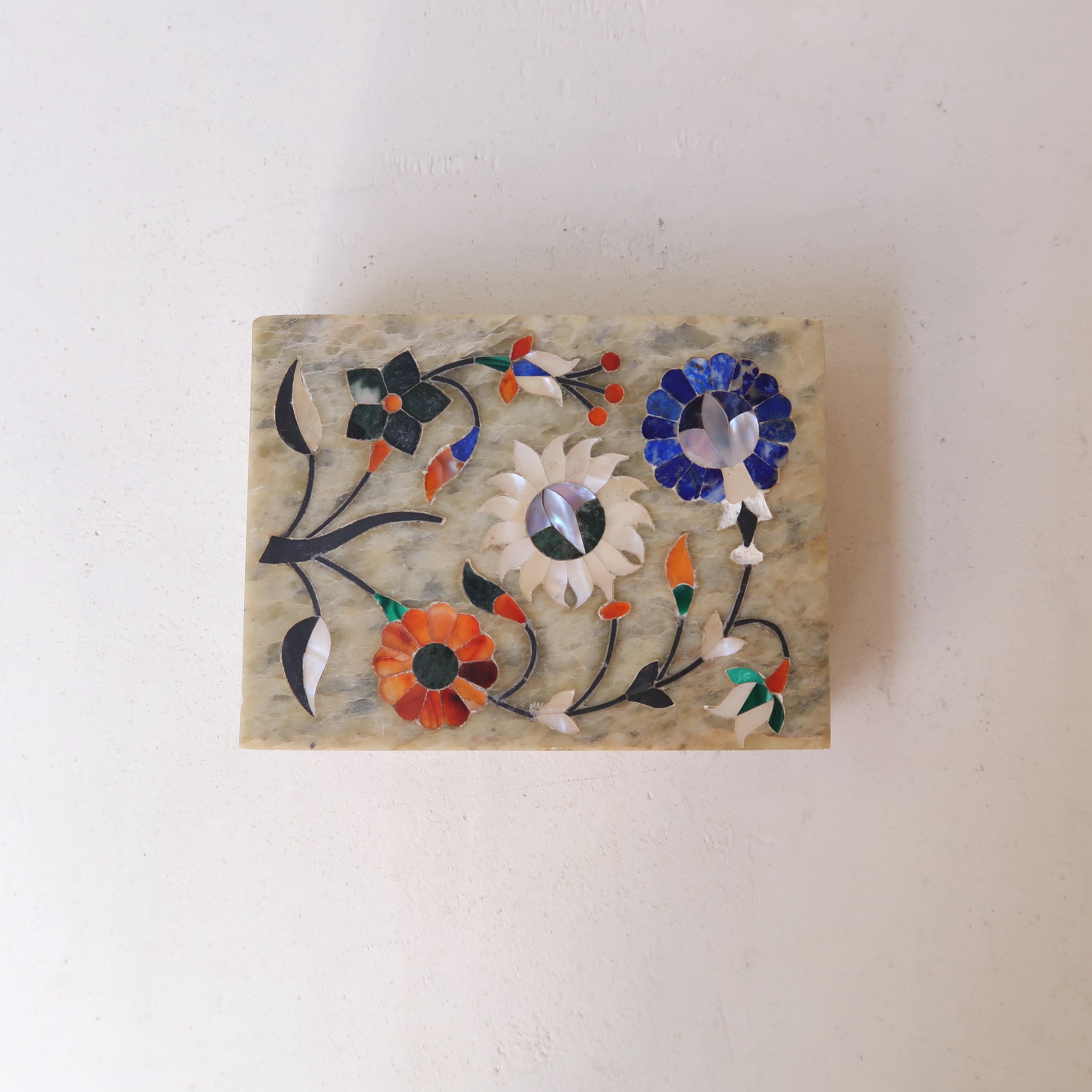 お花の象嵌がほどこされたちいさなジュエリーケース。容器は石、お花は薄くスライスされた貝殻が埋め込まれているインドのアイテムです。
