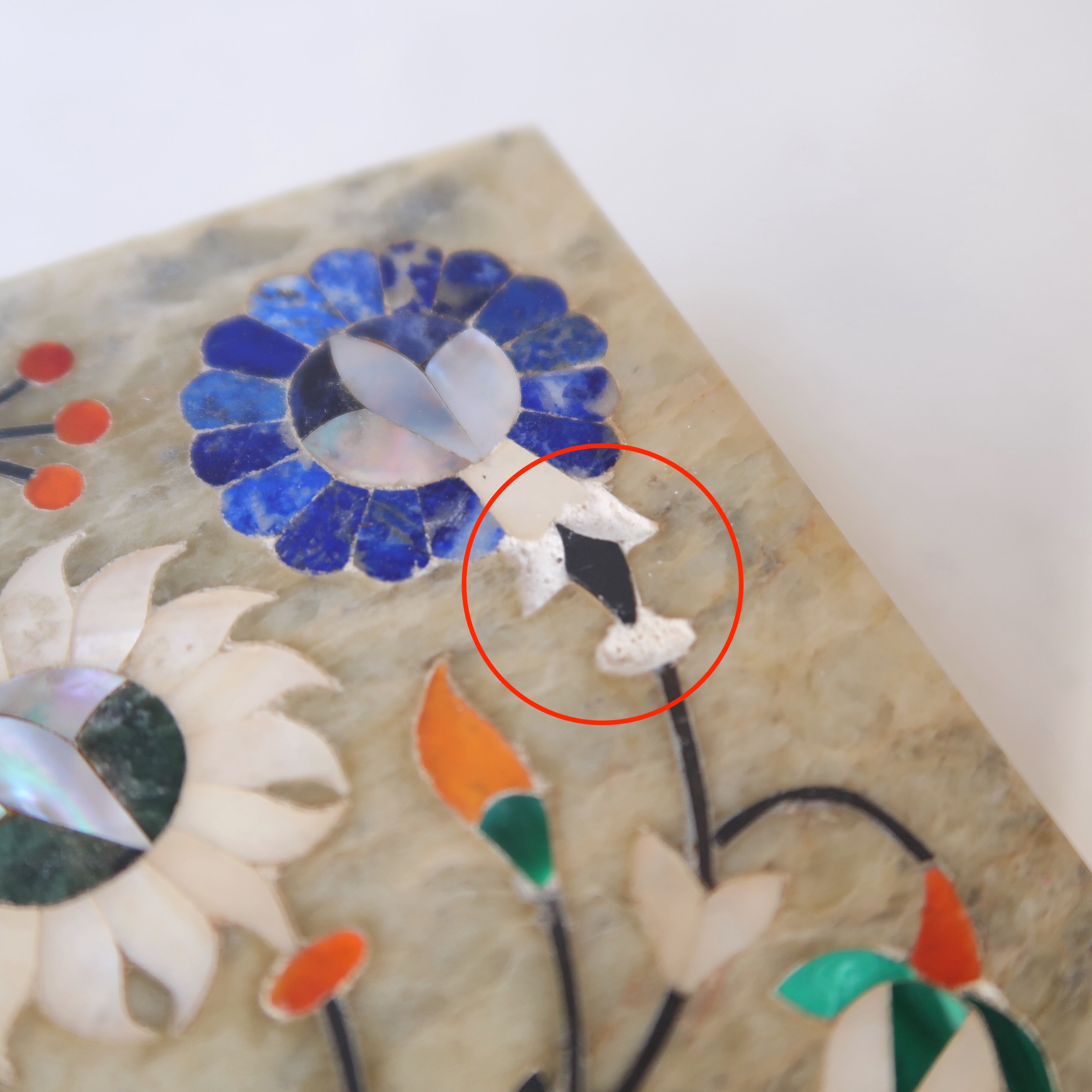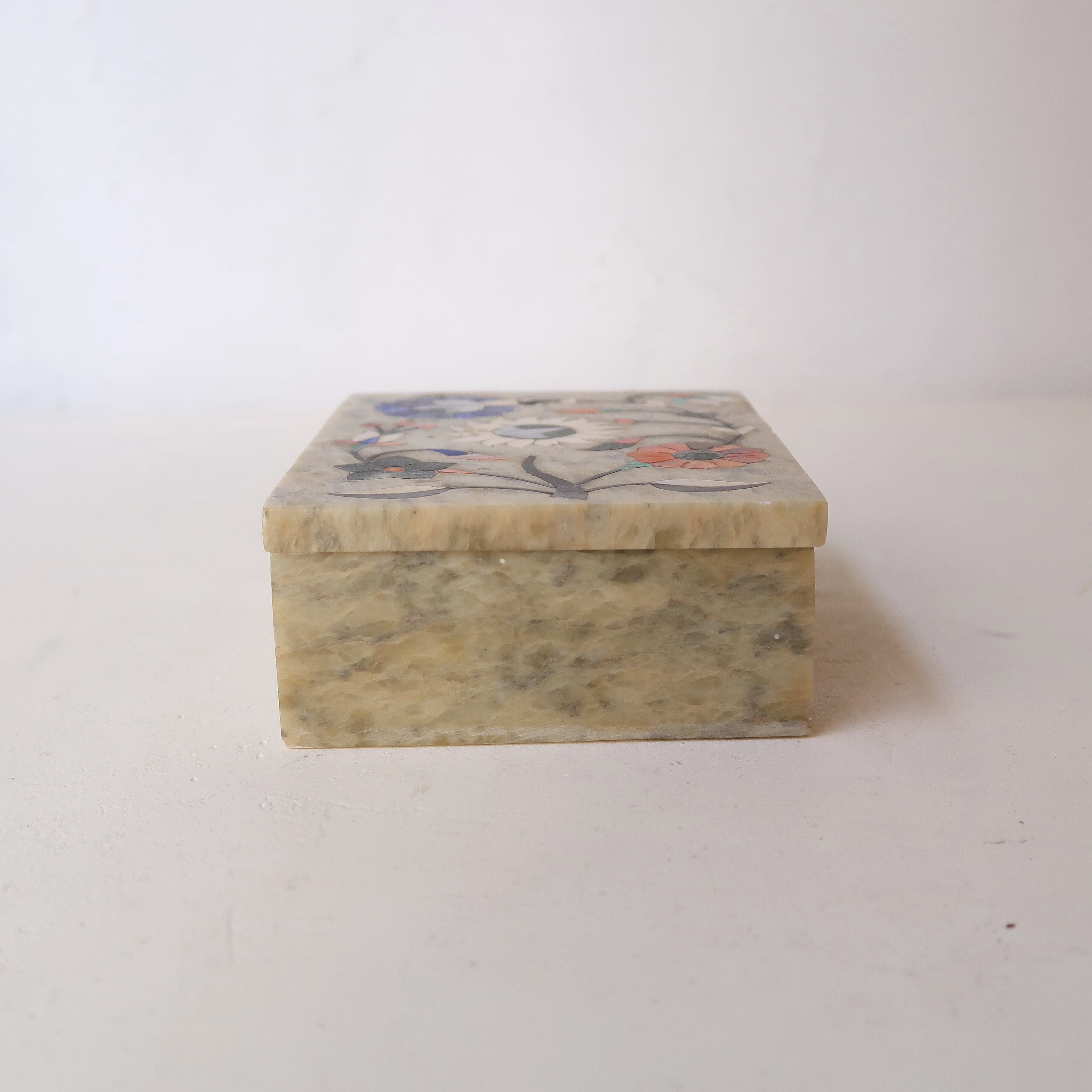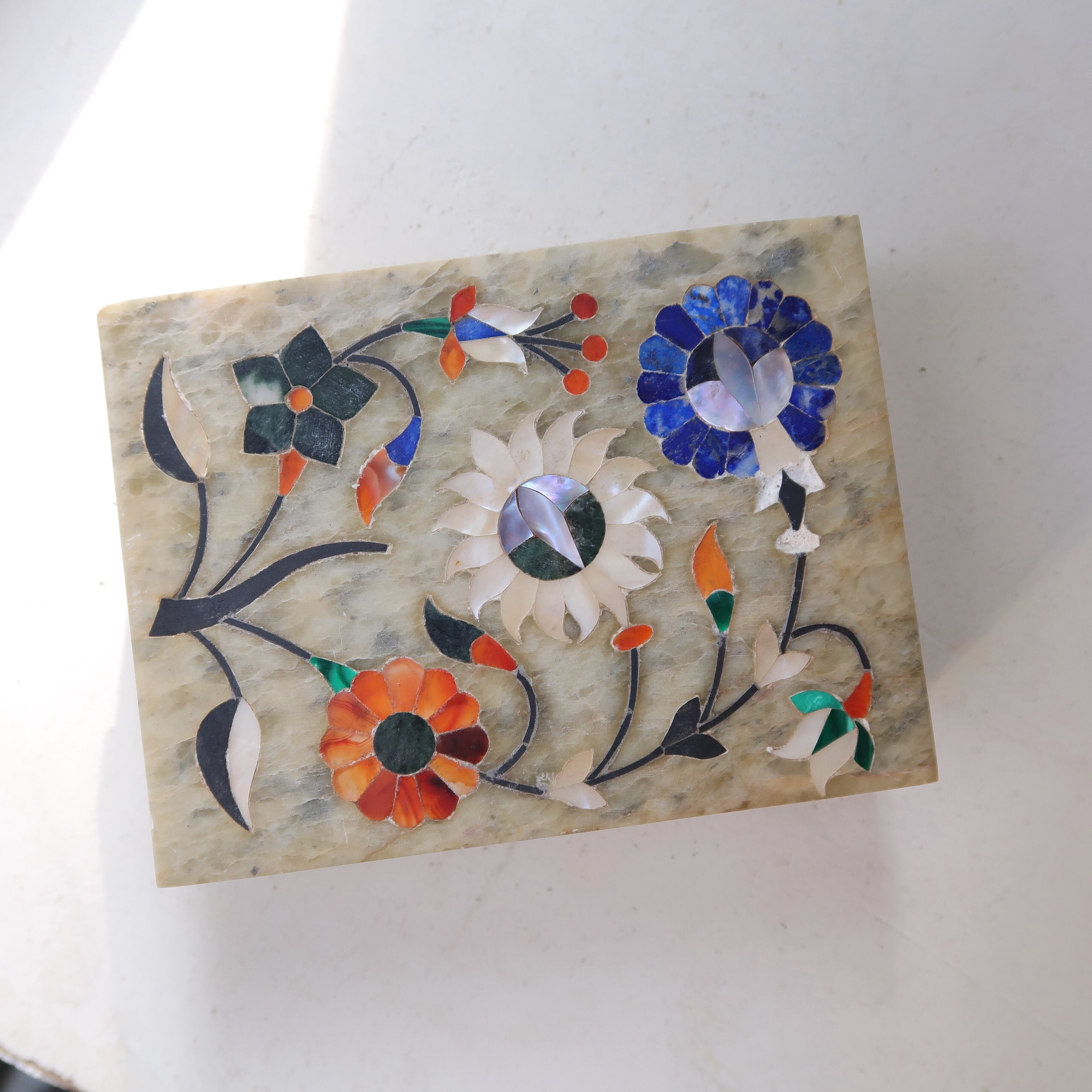 お花の象嵌がほどこされたちいさなジュエリーケース。容器は石、お花は薄くスライスされた貝殻が埋め込まれているインドのアイテムです。