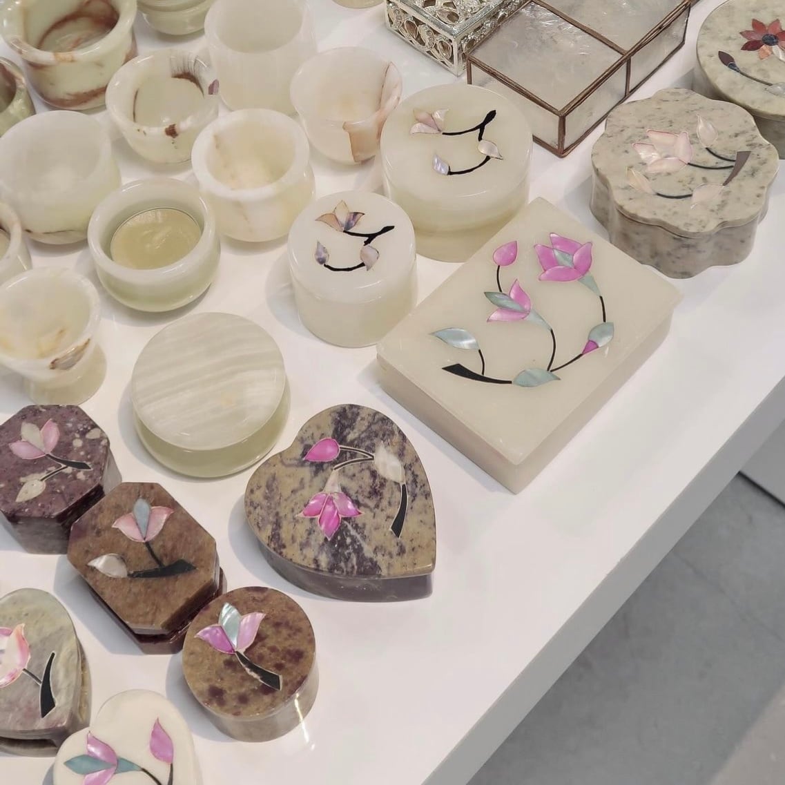 お花の象嵌がほどこされたちいさなジュエリーケース。容器は石、お花は薄くスライスされた貝殻が埋め込まれているインドのアイテムです。