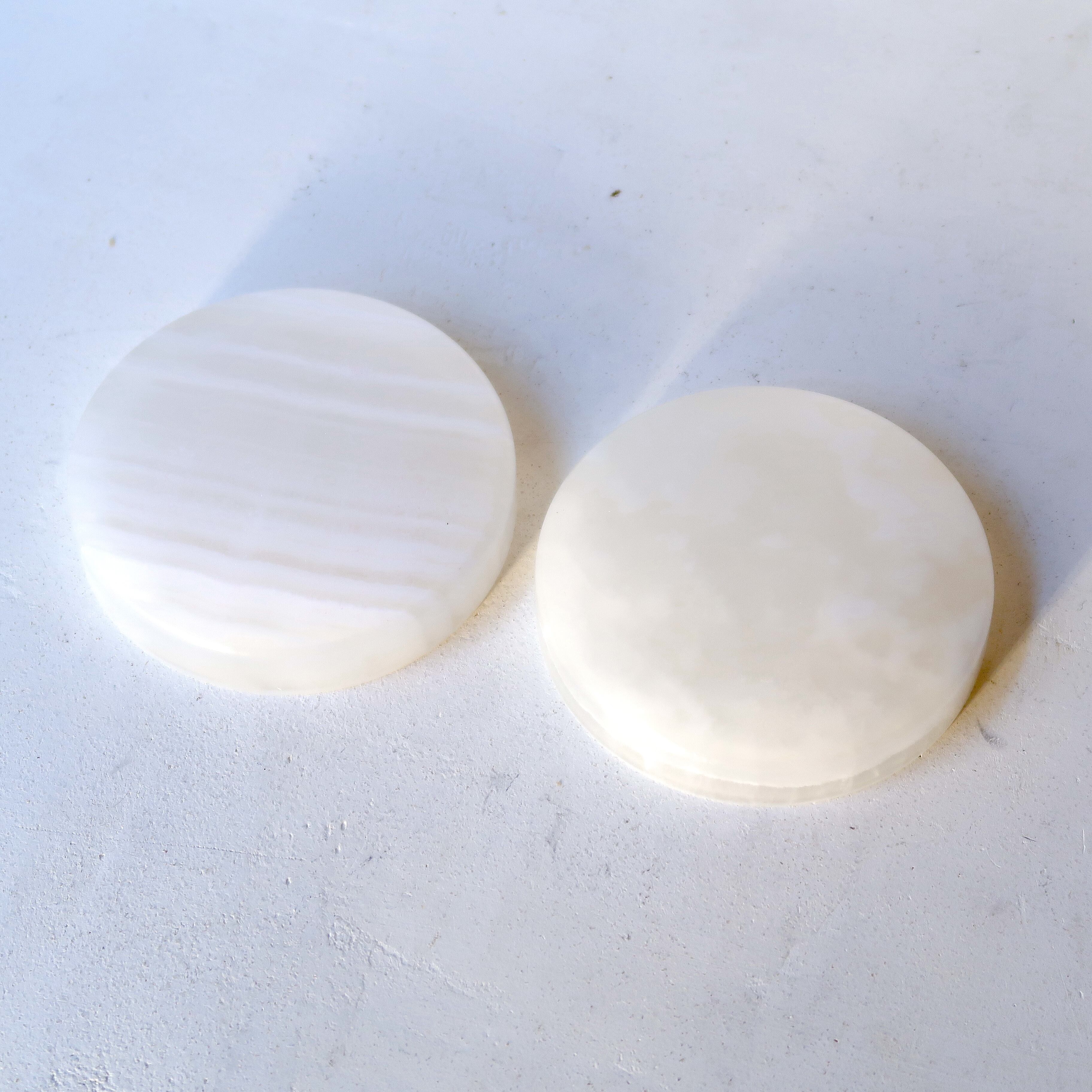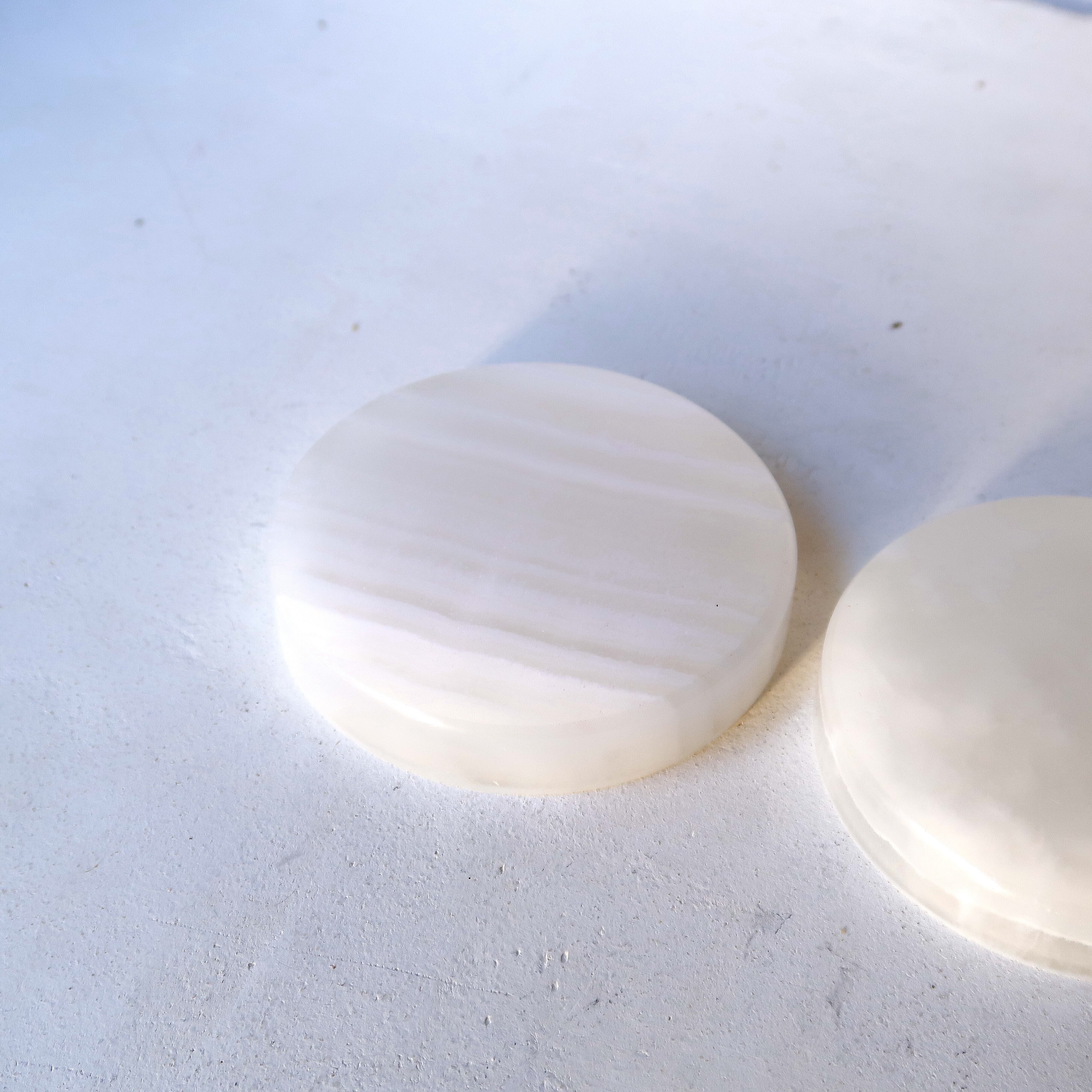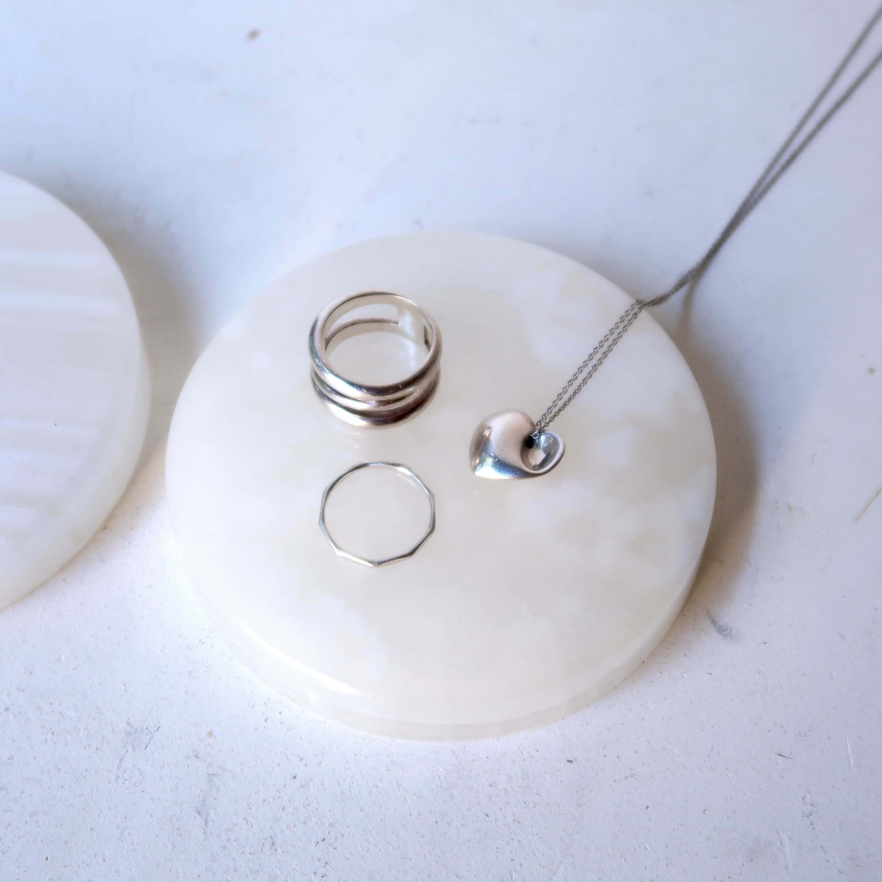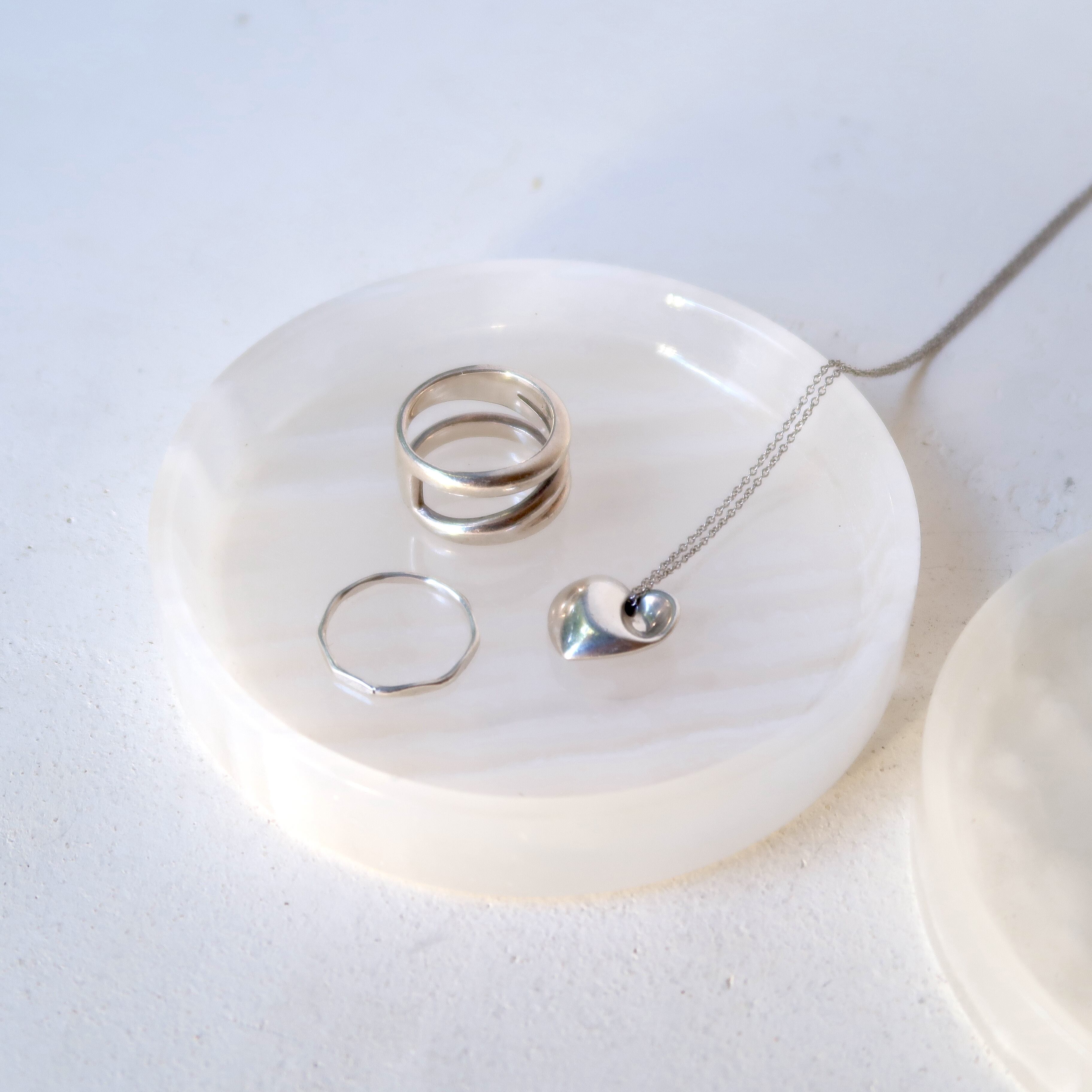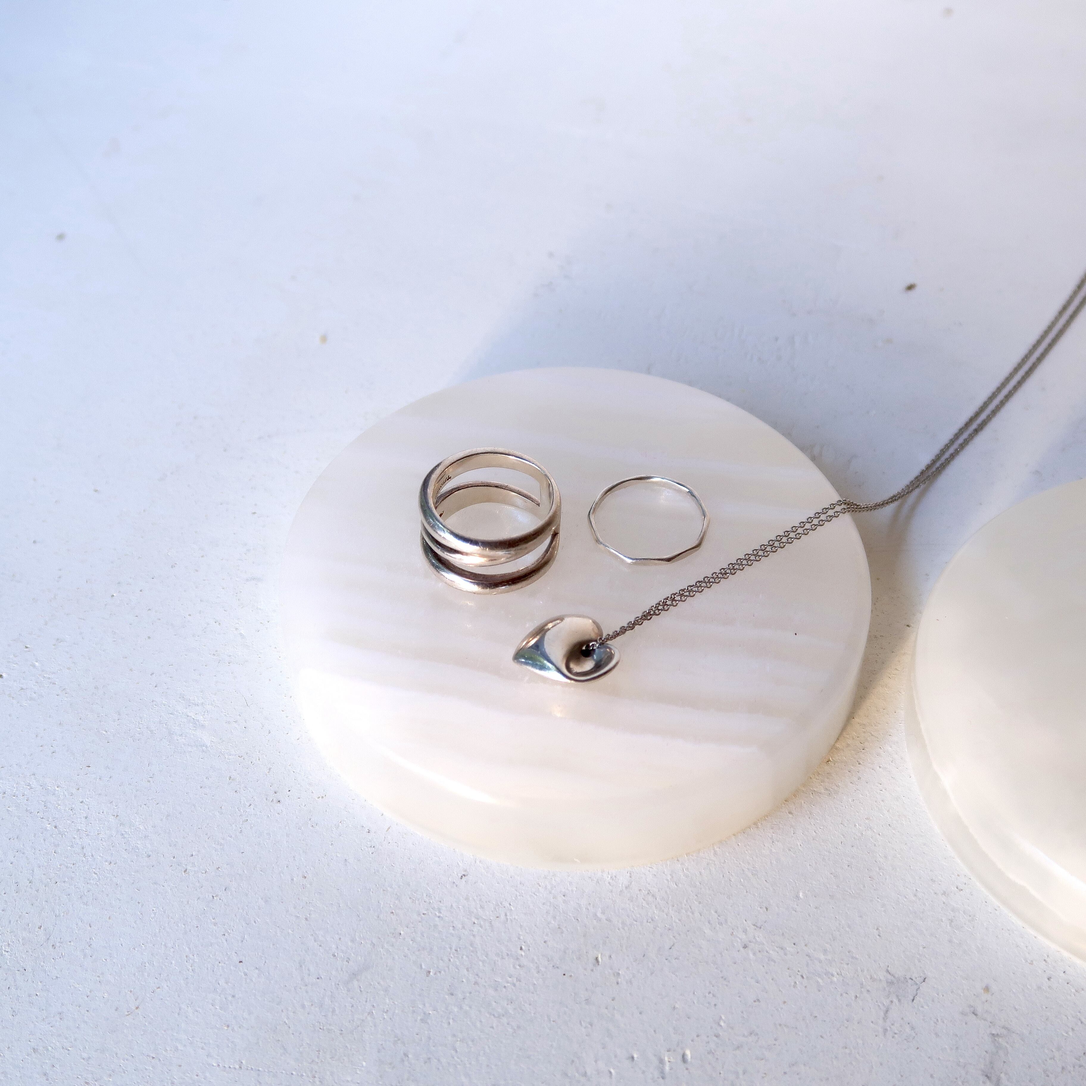 丸いシャーレのようなジュエリートレイ。白いオニキスは、透明感があります。がシンプルな形なので、うつわのように使っても、台のように使っても良さそう。