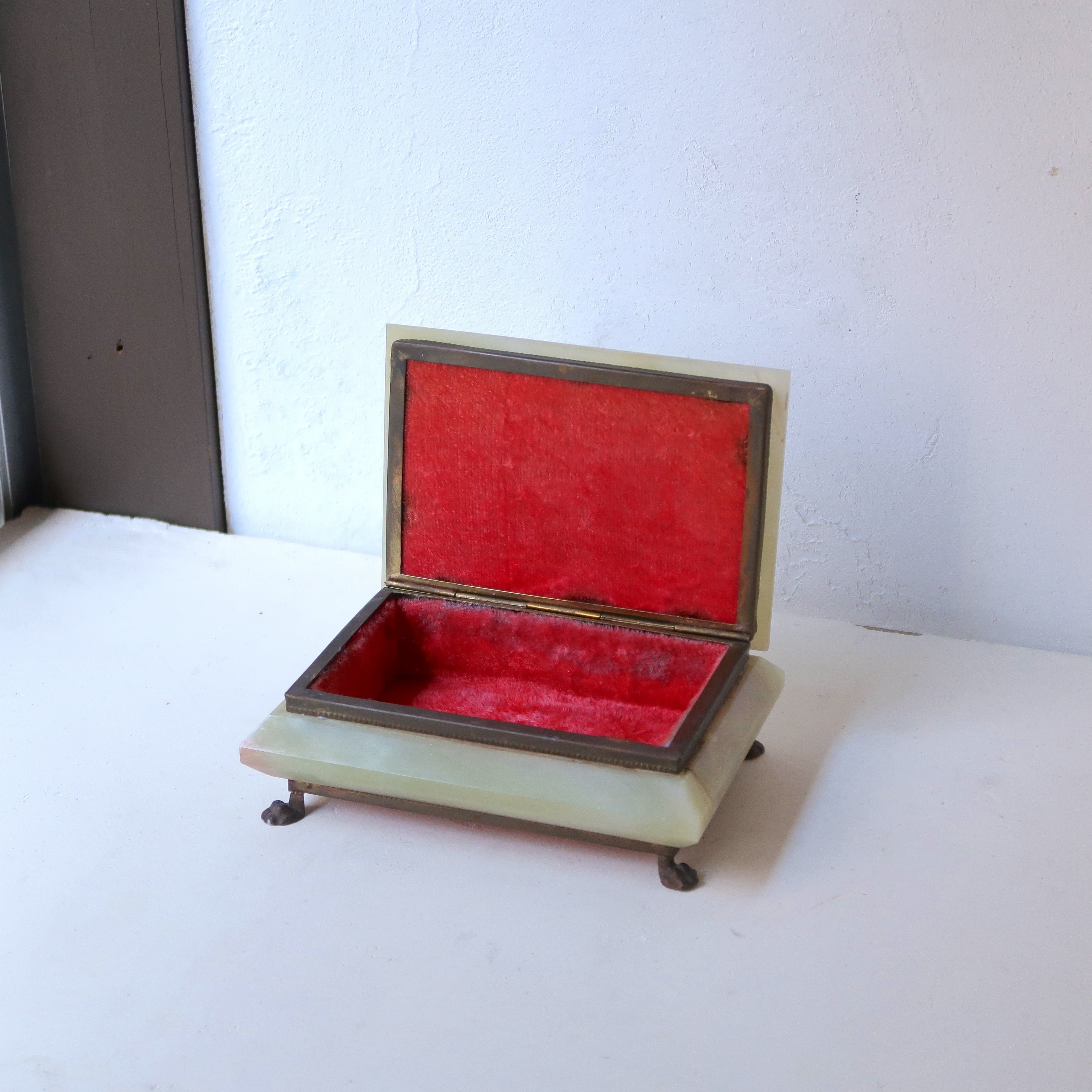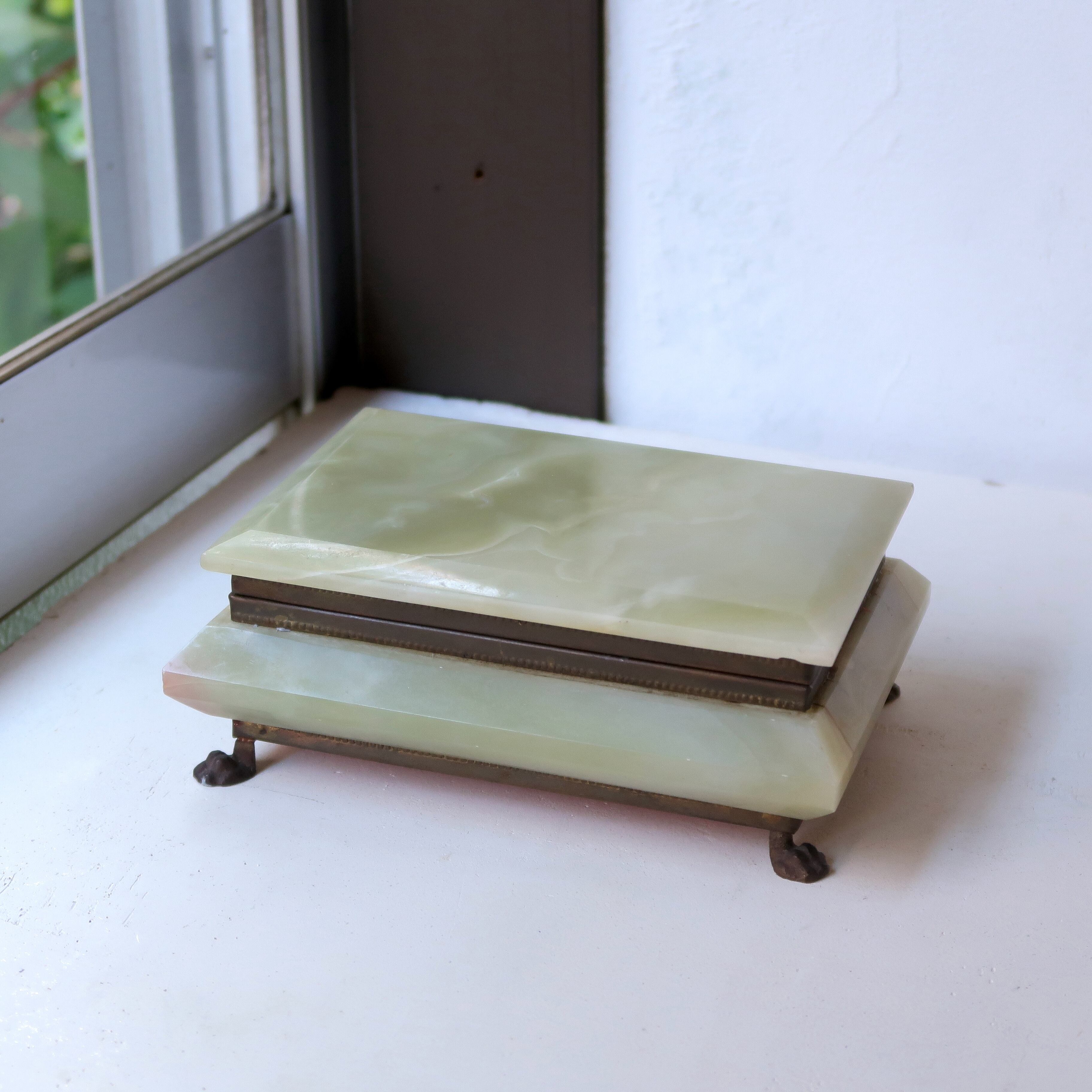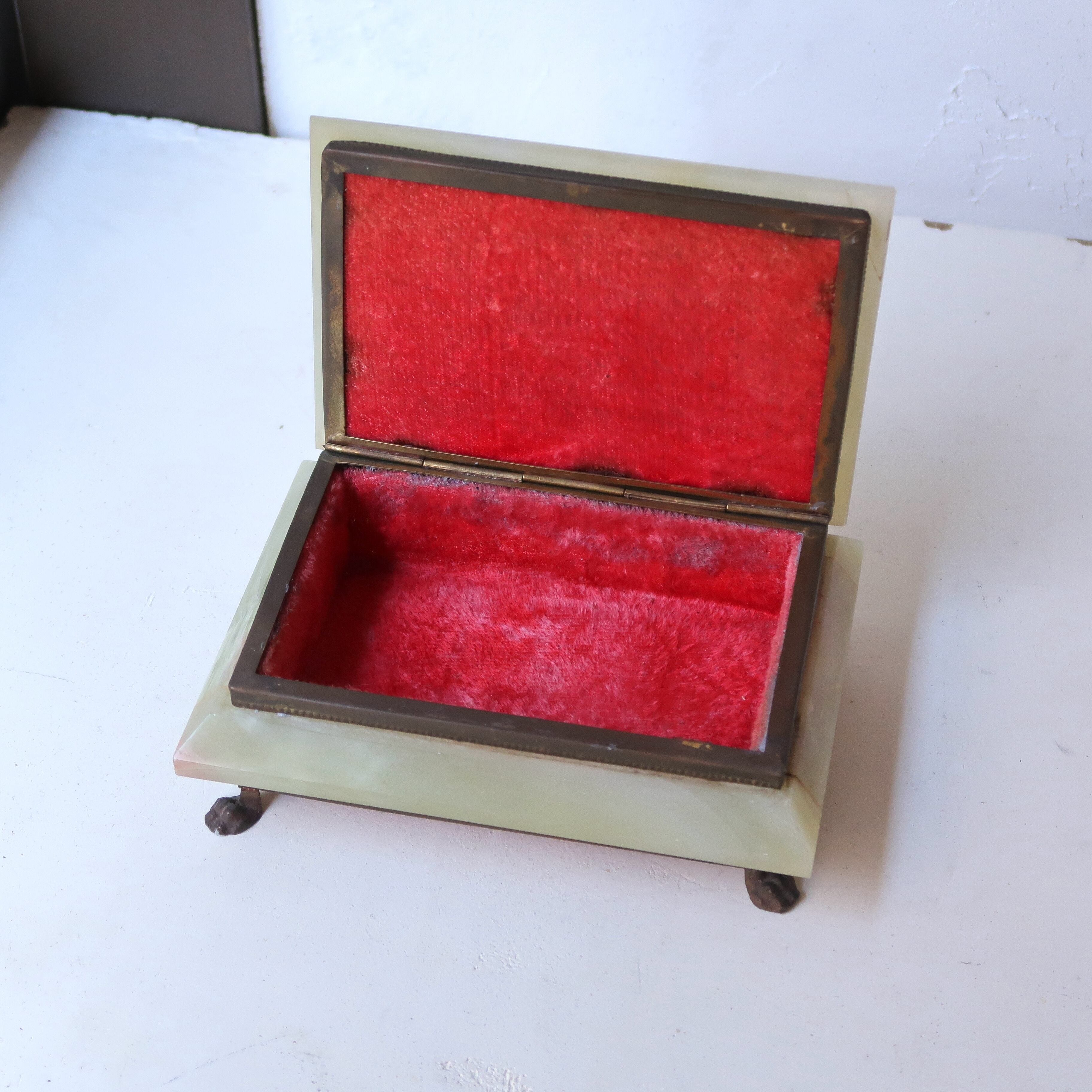 深みのある、もくもくとしたグリーンのオニキスは高貴な印象。厚みも重みもあり、だいじにだいじに、使いたい。内側の布地はレトロ感あふれる赤色。