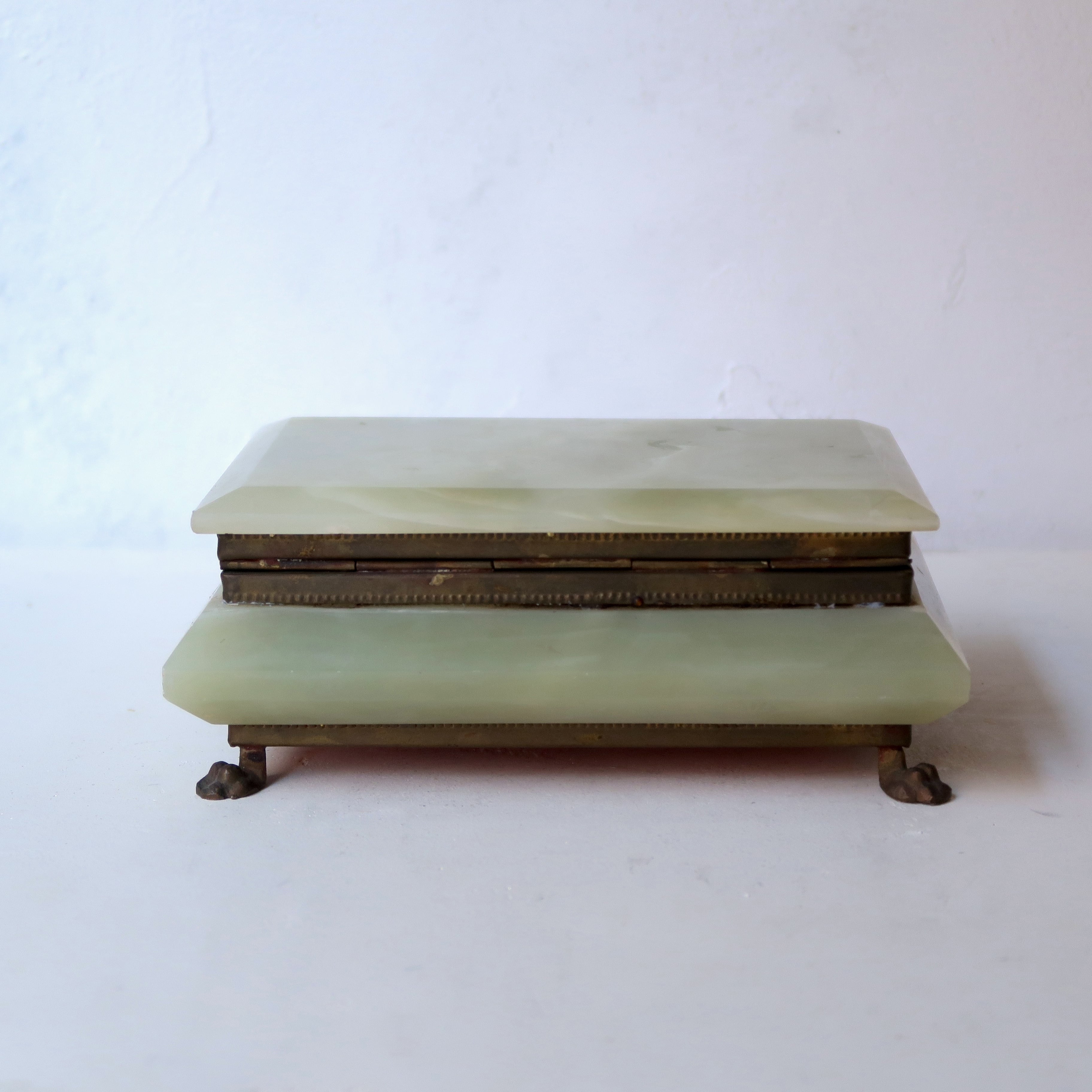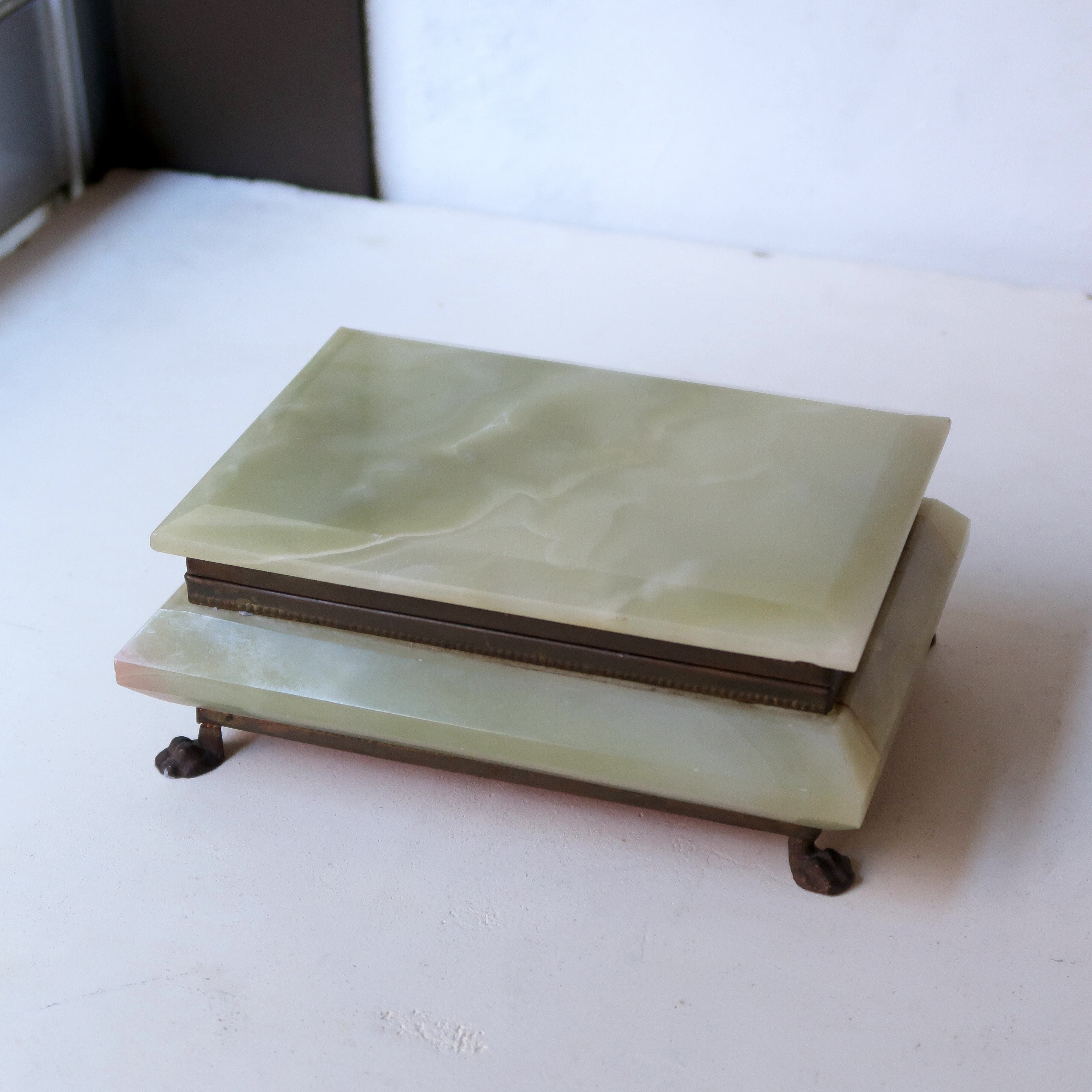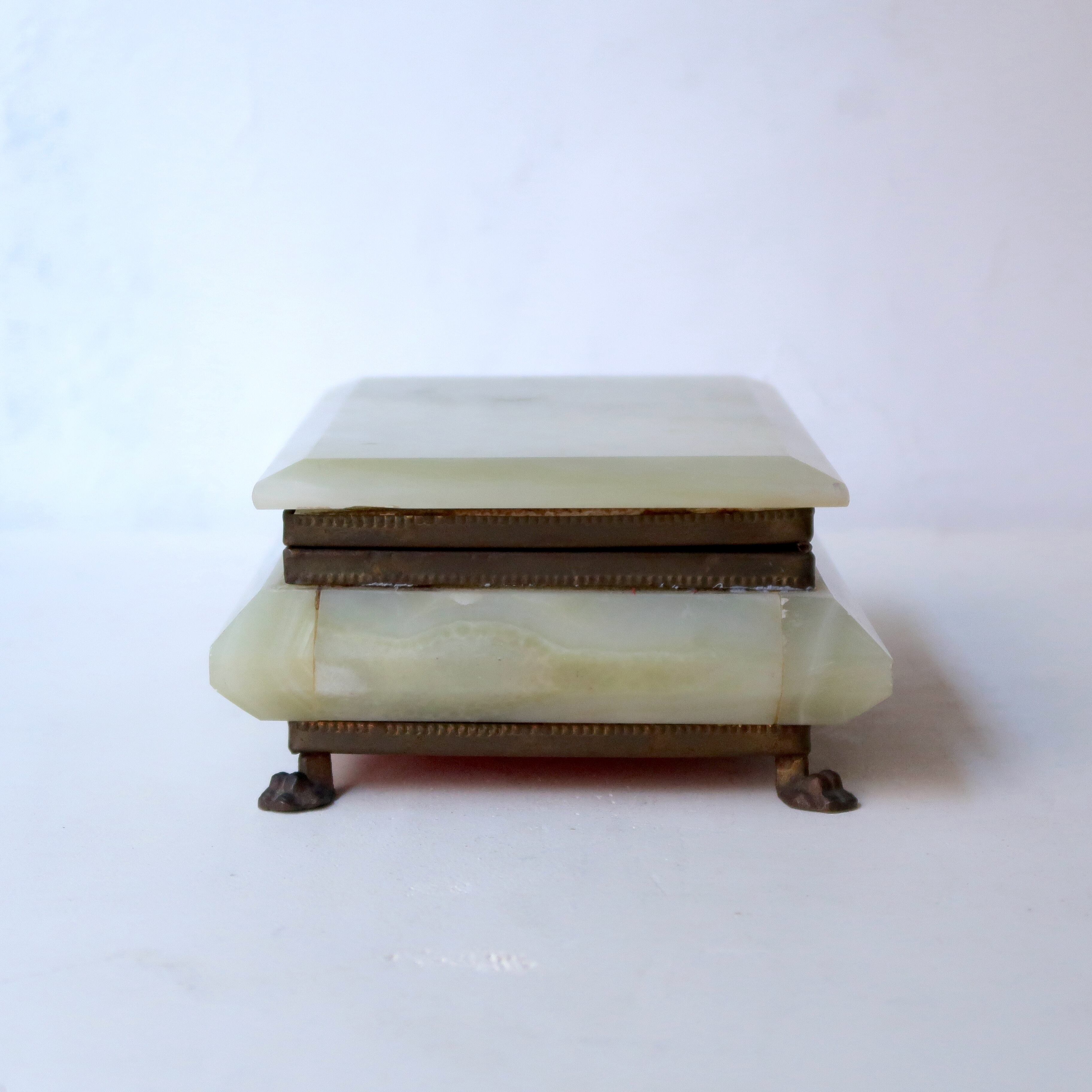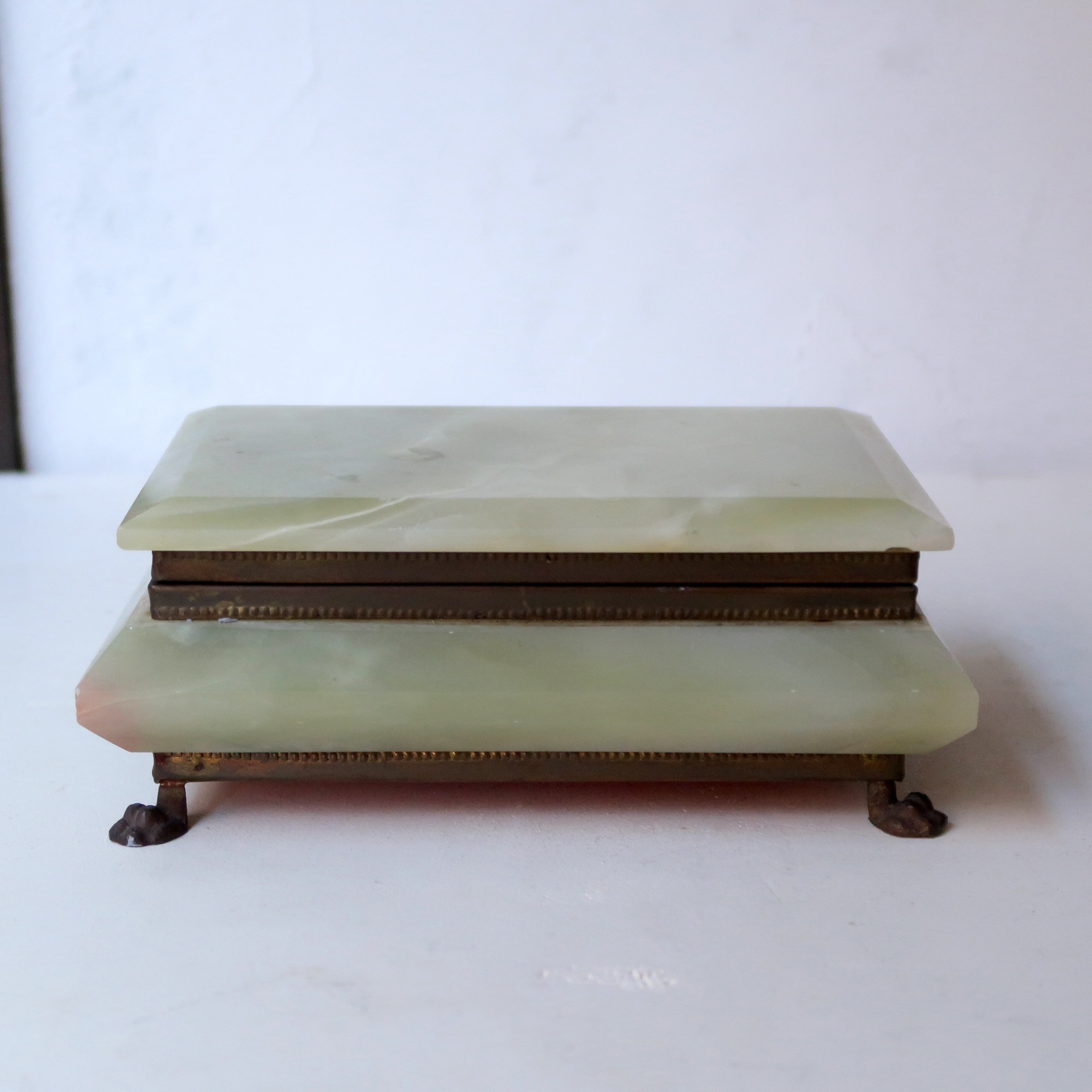 深みのある、もくもくとしたグリーンのオニキスは高貴な印象。厚みも重みもあり、だいじにだいじに、使いたい。内側の布地はレトロ感あふれる赤色。