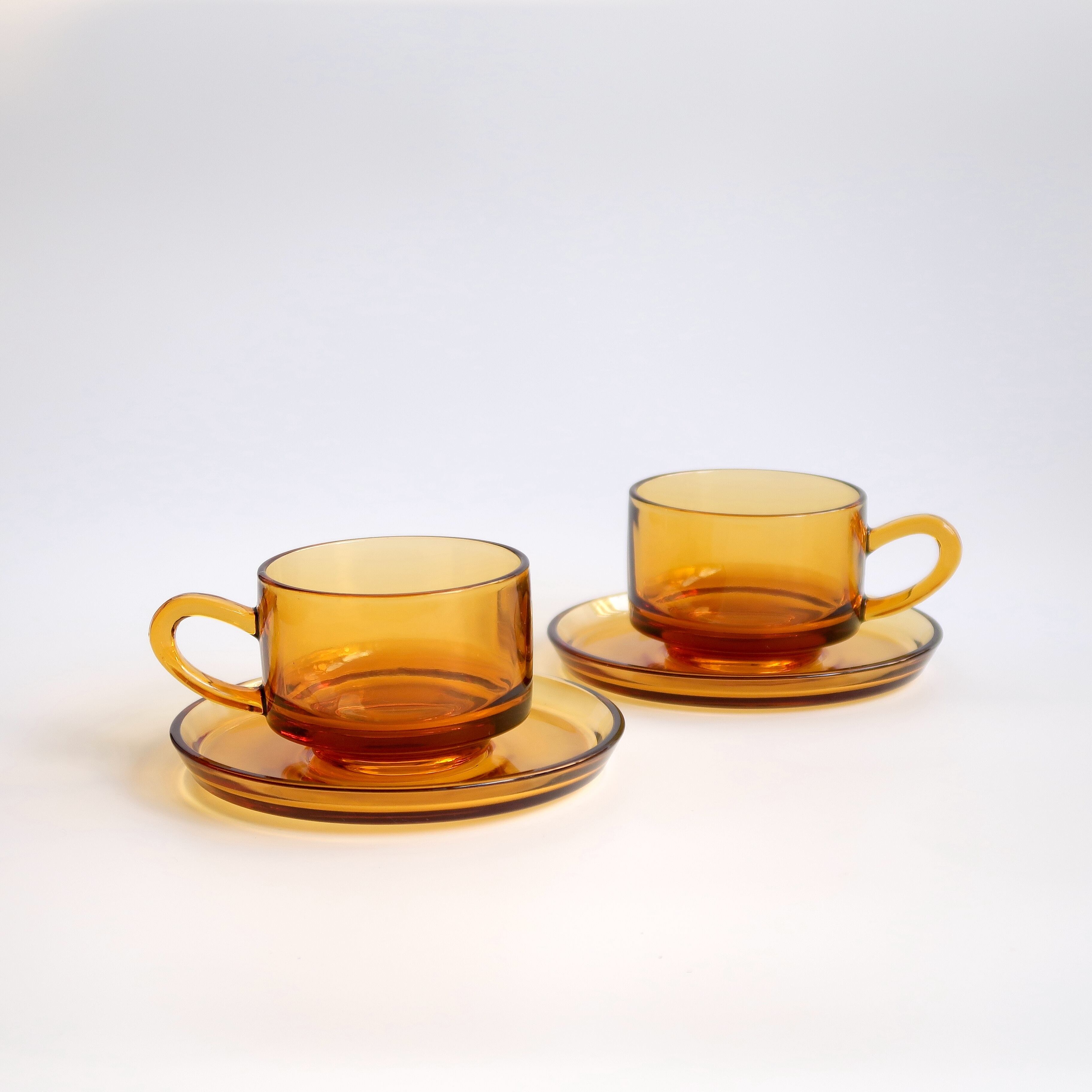 お砂糖を煮詰めて飴色になった、ような色合いのコーヒーカップ&ソーサー。持ち手はとくに、飴細工のようなつやとかがやきがあります。耐熱もOK。あたたかい紅茶やコーヒーを、ぜひどうぞ。